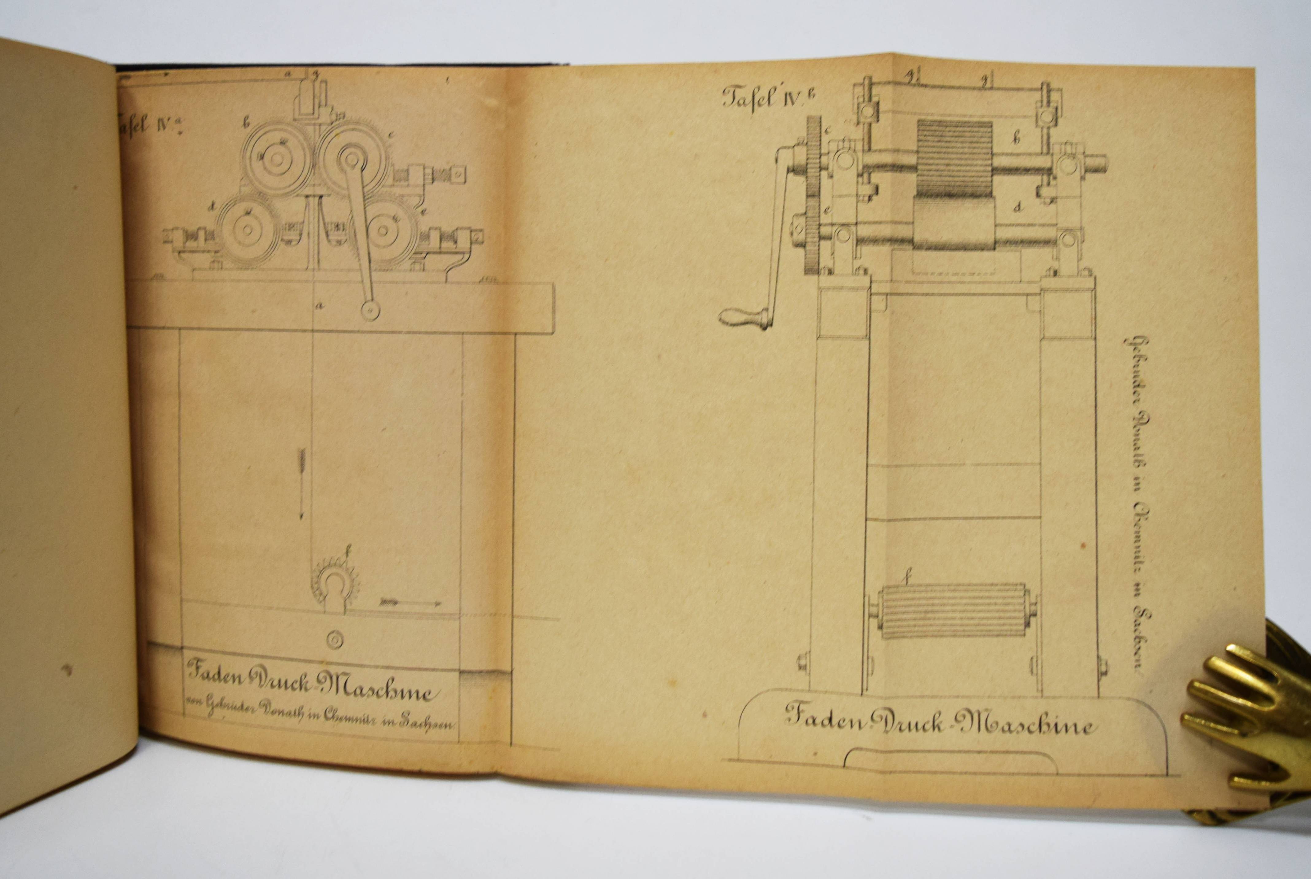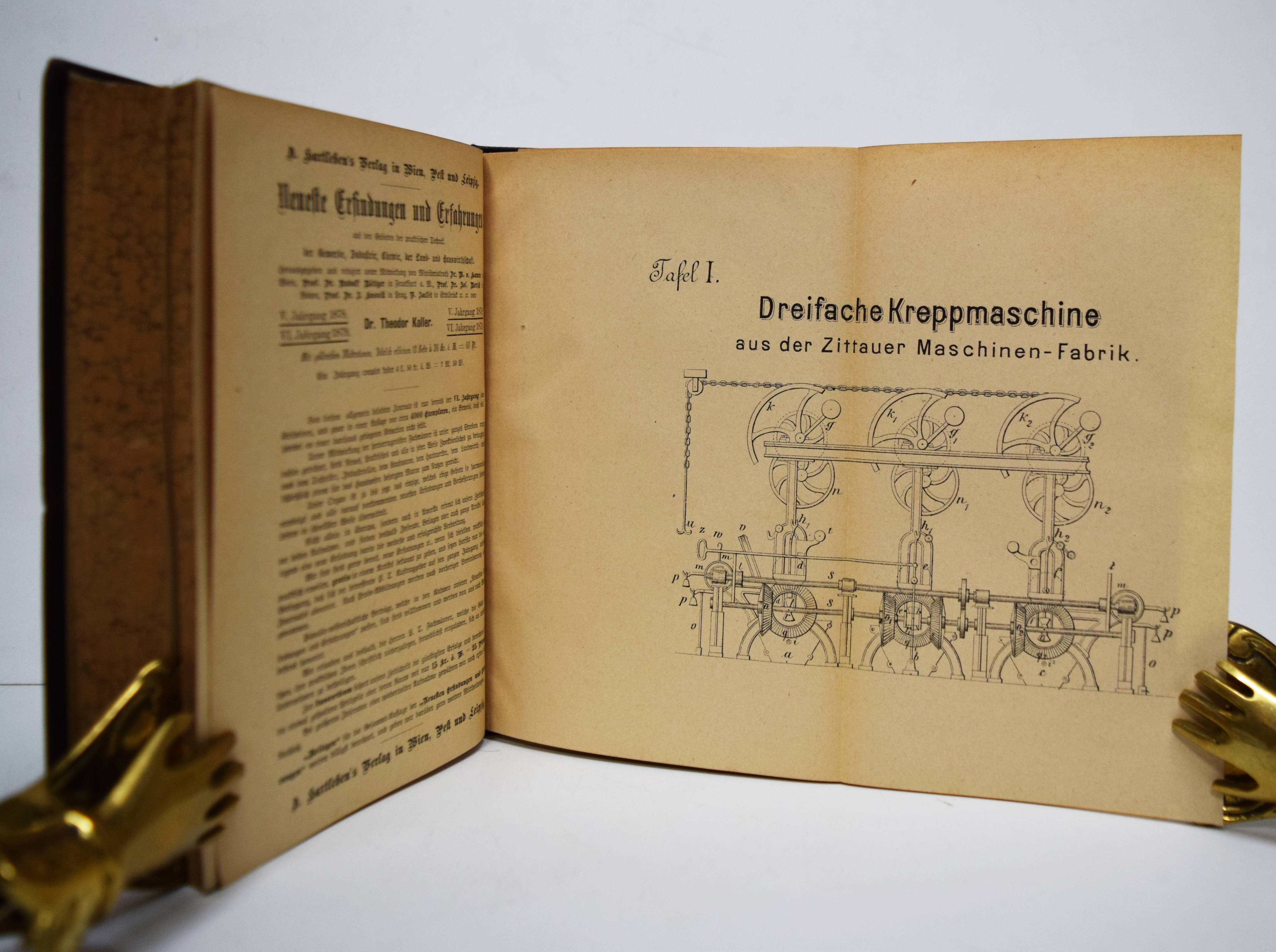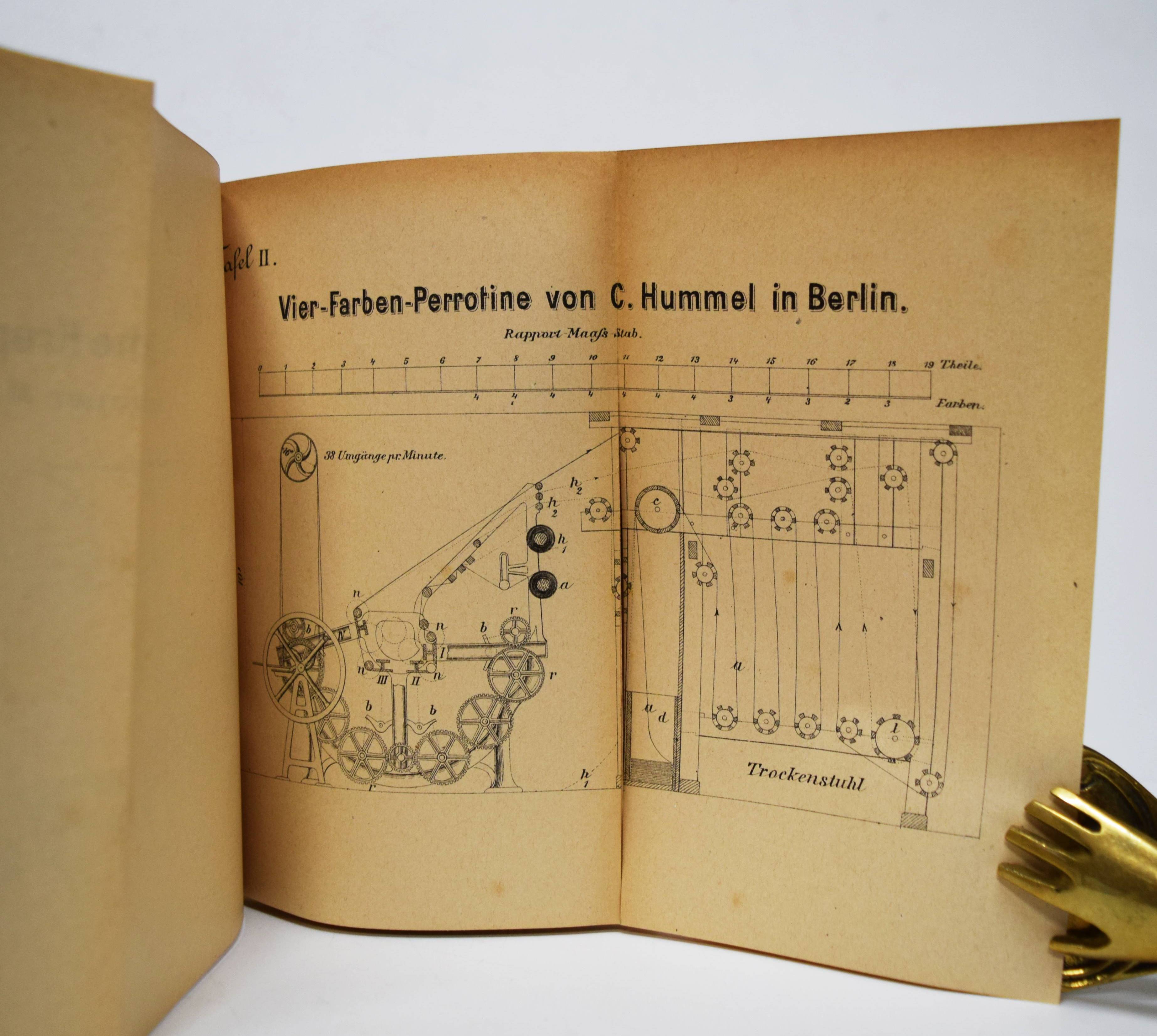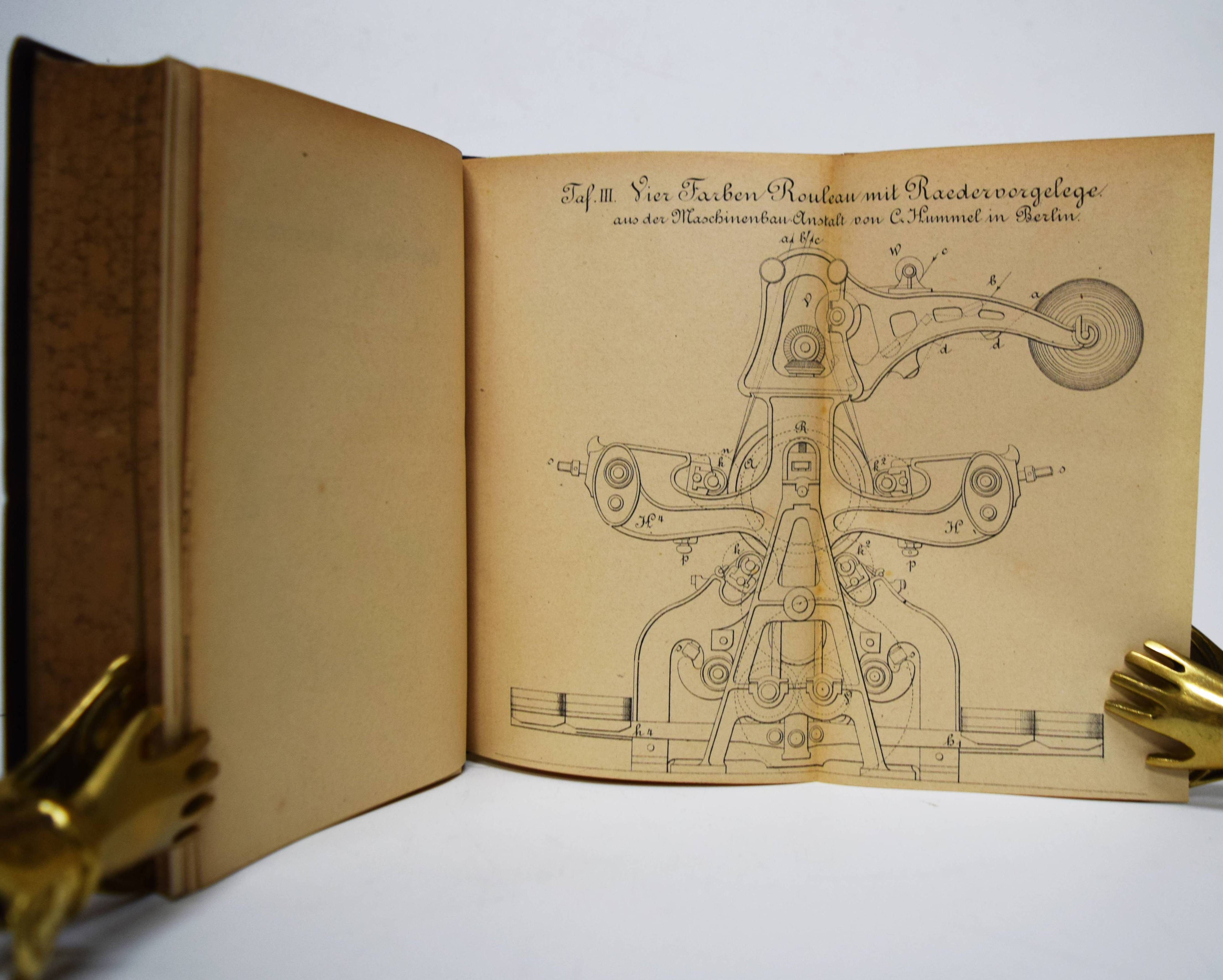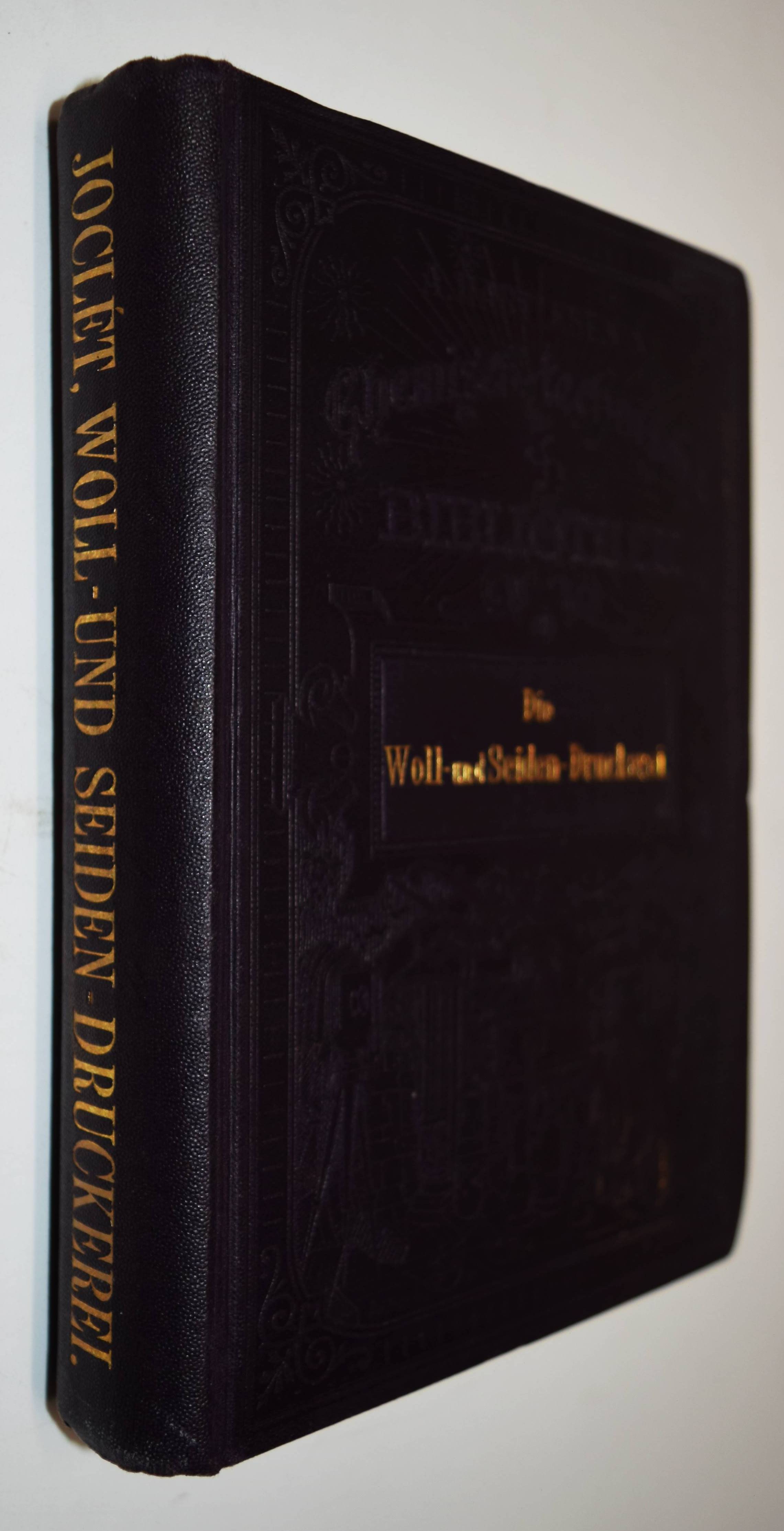Joclét, Victor. Woll- und Seiden-Druckerei in ihrem ganzen Umfange. Ein praktisches Hand- und Lehrbuch für Druck-Fabrikanten, Färber und technische Chemiker enthaltend das Drucken der Wollen-, Halbwollen- und Halbseidenstoffe, der Wollengarne und seidenen Zeuge. Wien/Pest/Leipzig, A. Hartleben o. J. (1879). XVI, 575 S. mit 54 Abbildungen und 4 gefalt. lithogr. Tafeln. Blindgepr. Orig.-Leinenband mit goldgepr. Rücken- und Deckeltitel. (A. Hartlebens chemisch-technische Bibliothek, Band 46). Seltene Originalausgabe. – Von leichten Gebrauchs- und Alterspuren abgesehen sehr gut erhalten.