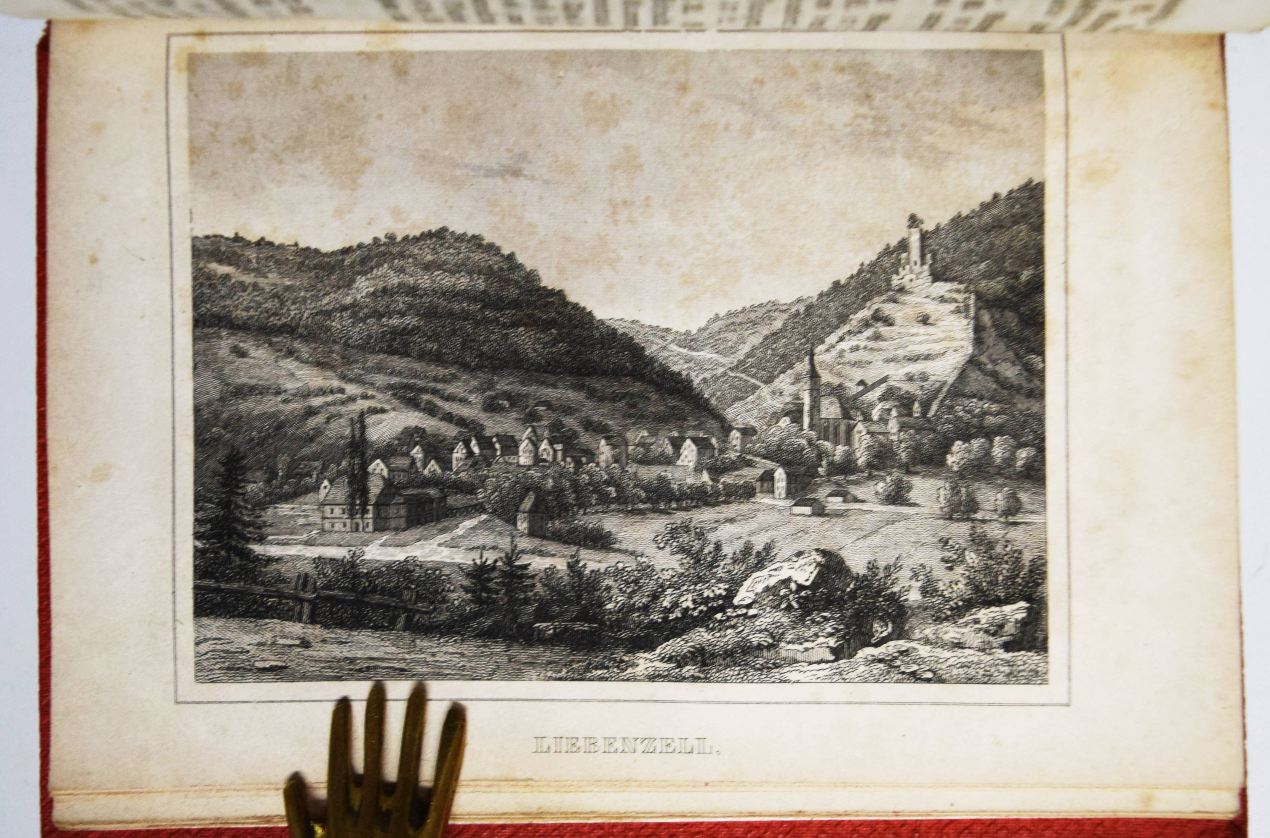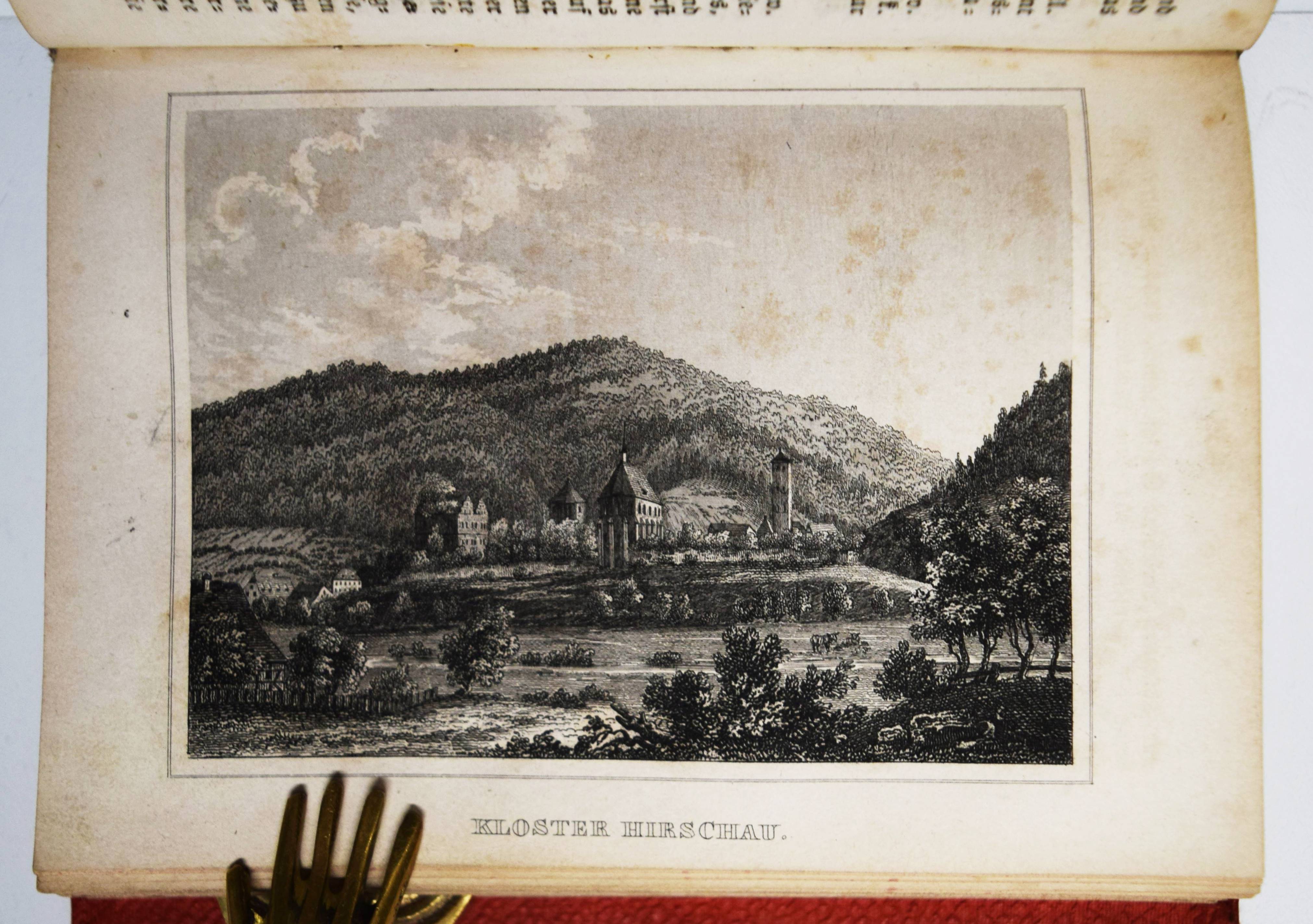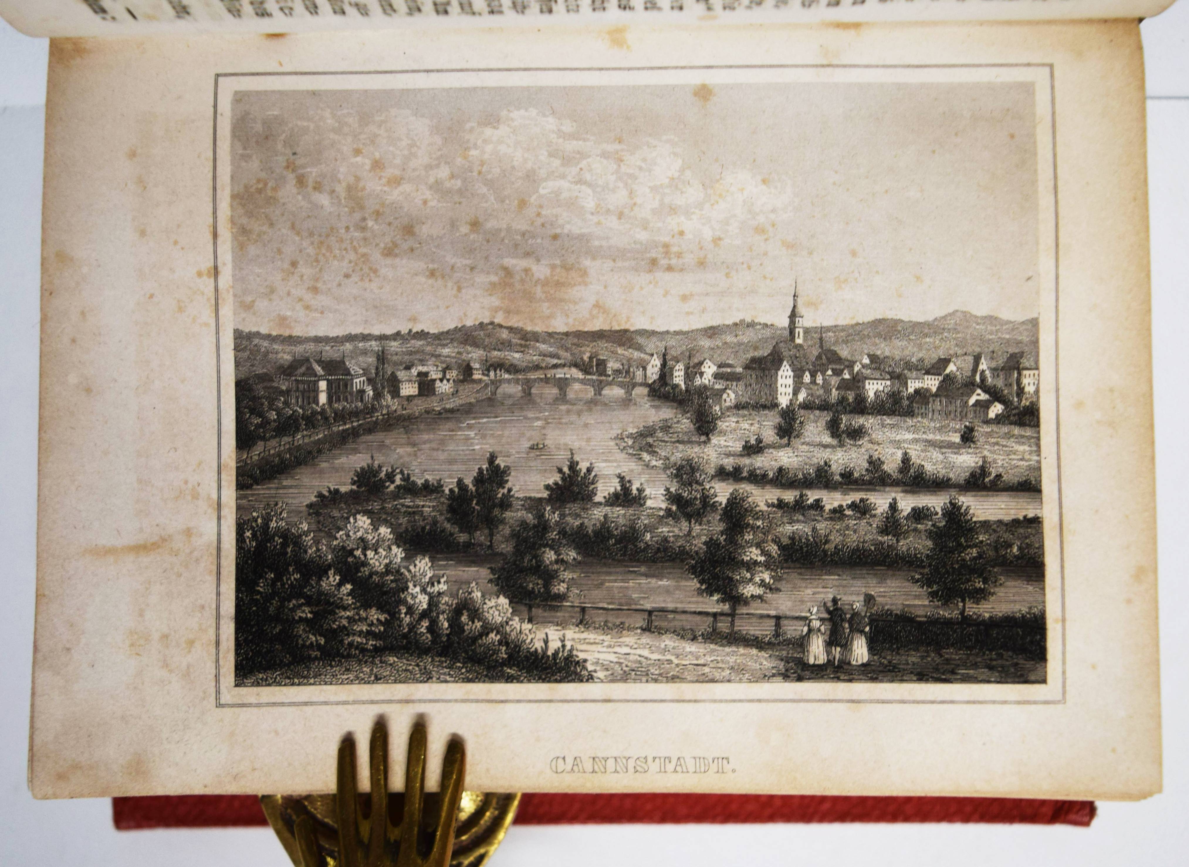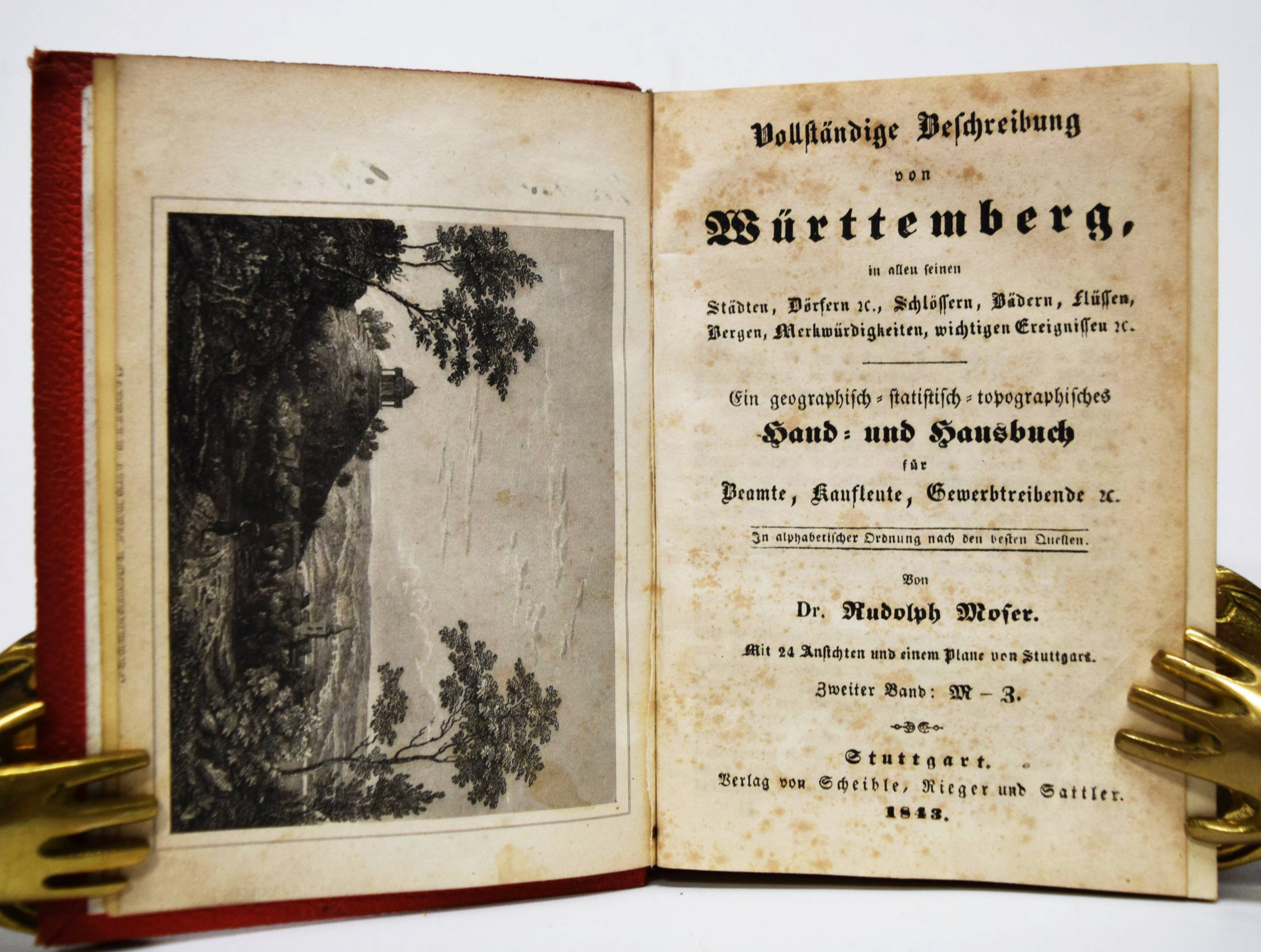 Moser, Rudolph (Friedrich) v. Vollständige Beschreibung von Wüttemberg. Ein geographisch-statistisch-topographisches Hand- und Hausbuch für Beamte, Kaufleute, Gewerbetreibende. In allen seinen Städten, Dörfern, Schlössern, Bädern, Flüssen, Bergen, Merkwürdigkeiten, wichtigen Ereignissen. 2 Bände. Stuttgart, Scheible, Rieger & Sattler 1843. Kl.-8° (14 x 10,5 cm.). IV, 661 S.; Titel, 902 S. mit 24 Stahlstich-Ansichten und 1 gefalt. Stadtplan von Stuttgart. Weinrote Leinenbände der Zeit. Engelmann I, 1053. Heyd I, 215. – Mit Ansichten von Bad Boll, Canstatt, Laufen, Herrenalb, Mergentheim, Tübingen, Weinsberg, Wildbad u. a. – Durchgehend etwas braunfleckig und gebräunt, gutes vollständiges Exemplar.