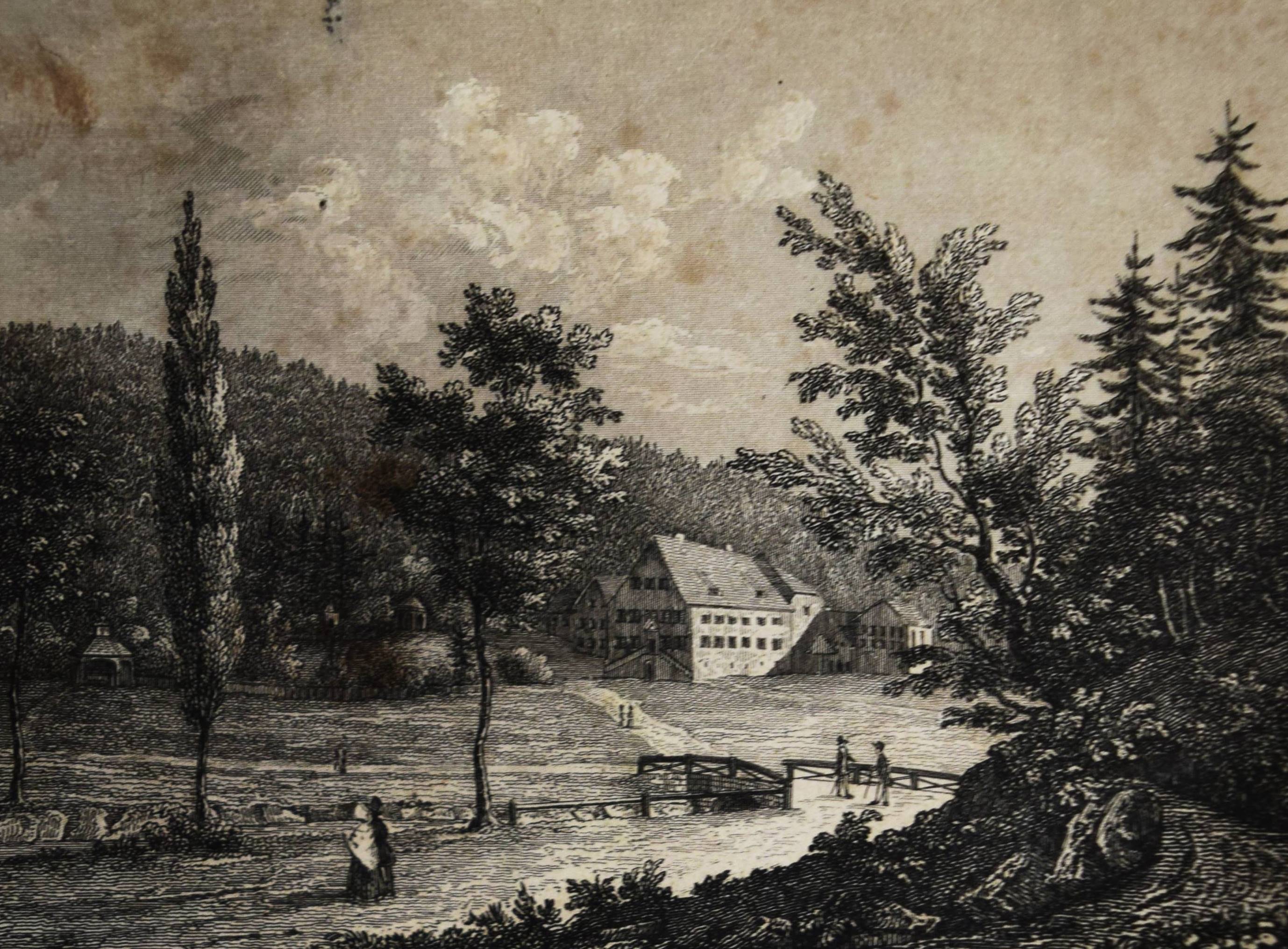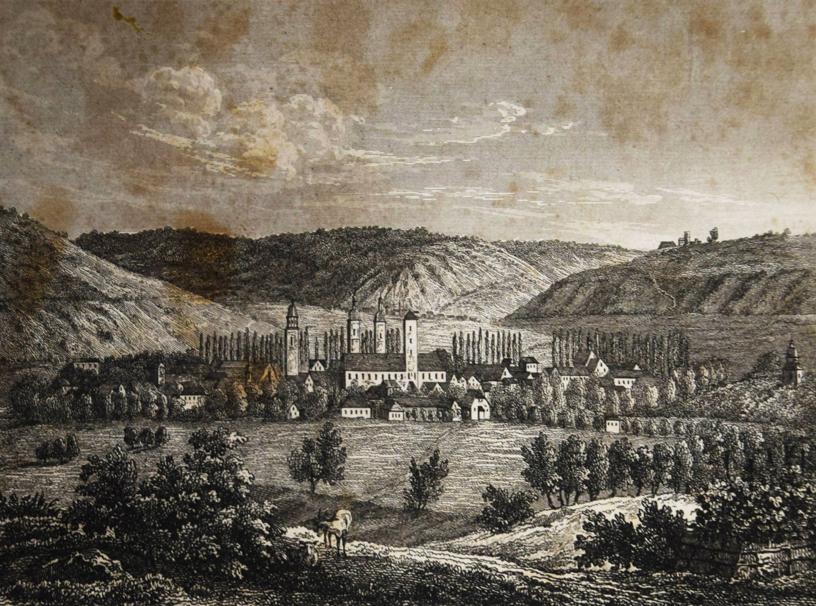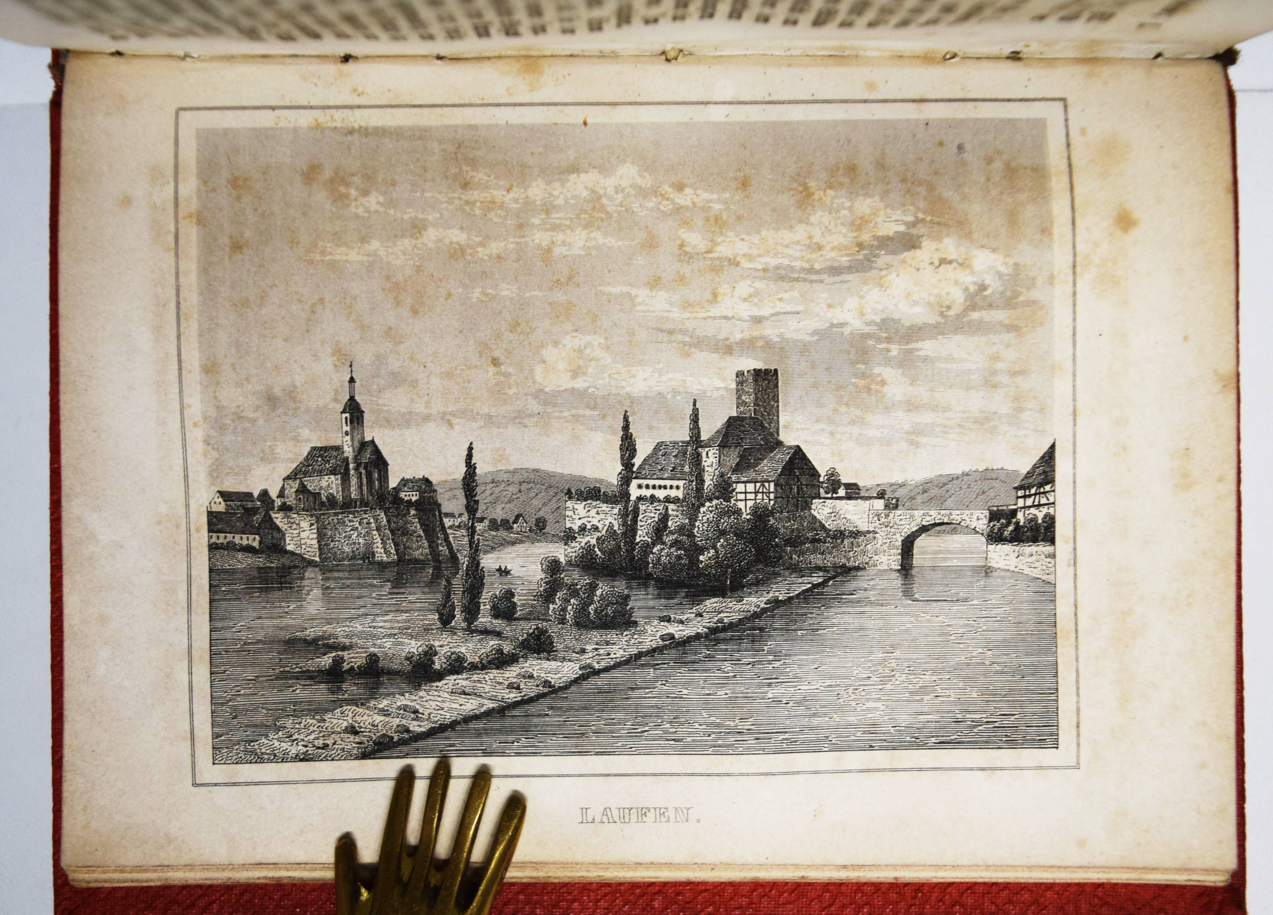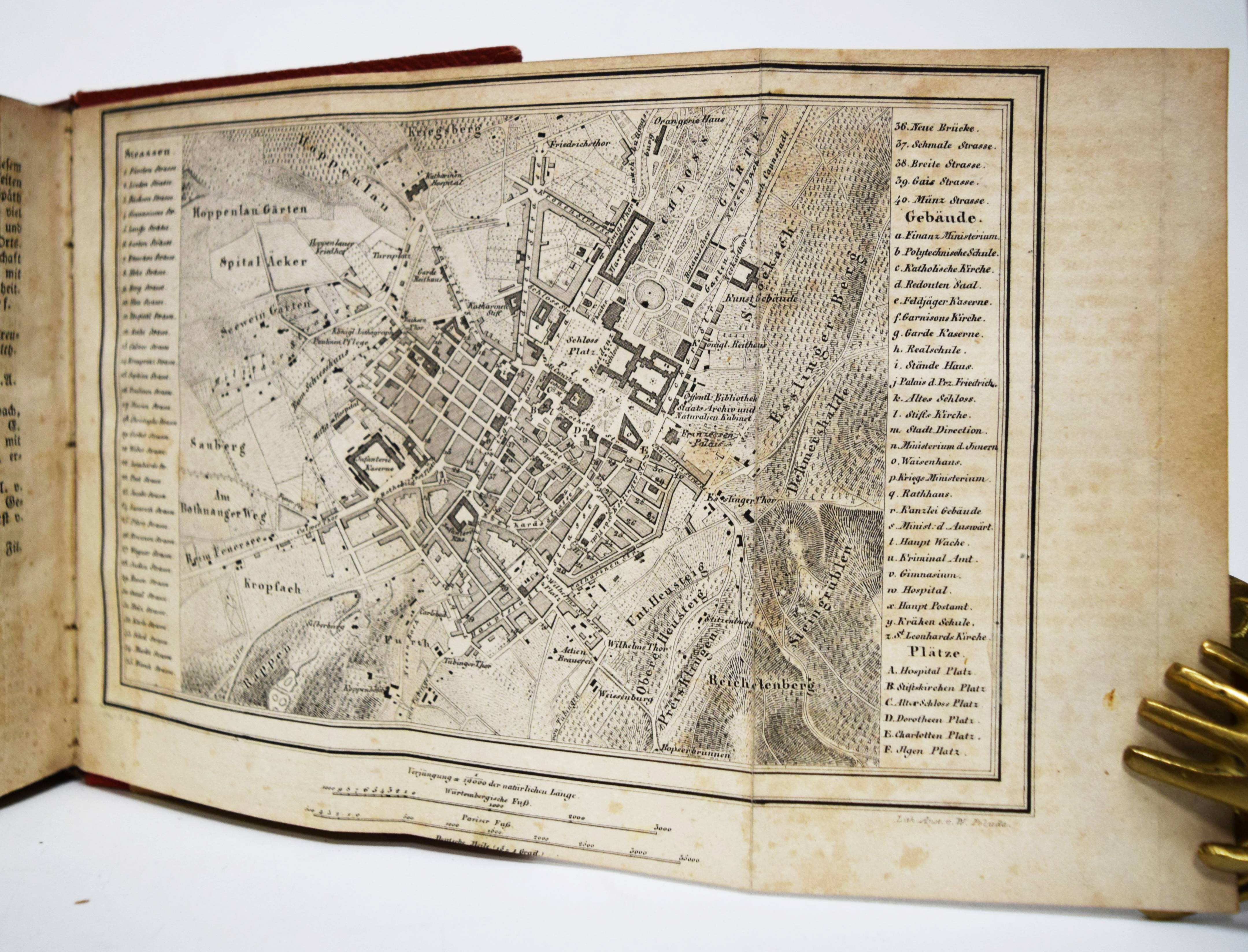 Moser, Rudolph (Friedrich) v. Vollständige Beschreibung von Wüttemberg. Ein geographisch-statistisch-topographisches Hand- und Hausbuch für Beamte, Kaufleute, Gewerbetreibende. In allen seinen Städten, Dörfern, Schlössern, Bädern, Flüssen, Bergen, Merkwürdigkeiten, wichtigen Ereignissen. 2 Bände. Stuttgart, Scheible, Rieger & Sattler 1843. Kl.-8° (14 x 10,5 cm.). IV, 661 S.; Titel, 902 S. mit 24 Stahlstich-Ansichten und 1 gefalt. Stadtplan von Stuttgart. Weinrote Leinenbände der Zeit. Engelmann I, 1053. Heyd I, 215. – Mit Ansichten von Bad Boll, Canstatt, Laufen, Herrenalb, Mergentheim, Tübingen, Weinsberg, Wildbad u. a. – Durchgehend etwas braunfleckig und gebräunt, gutes vollständiges Exemplar.