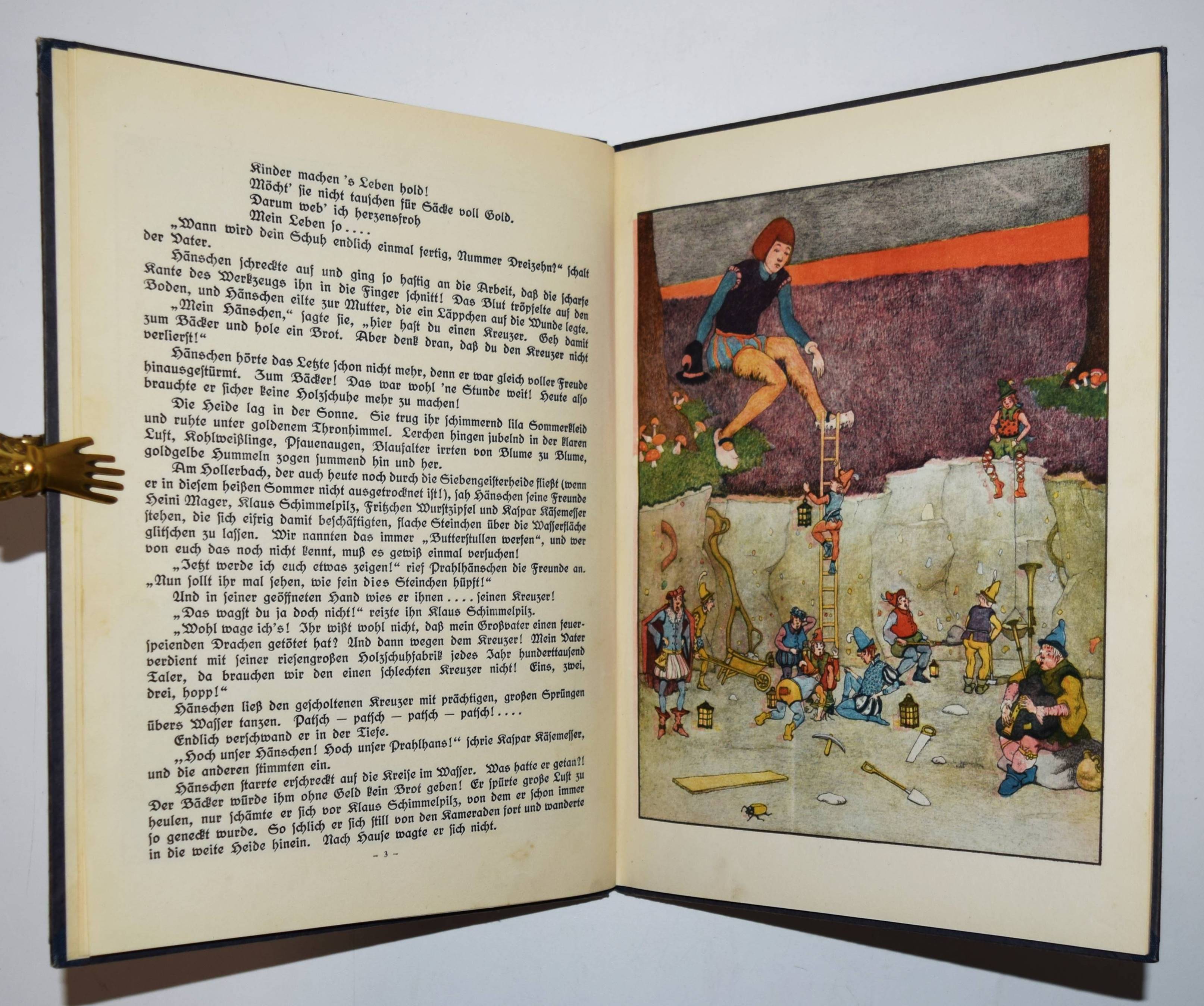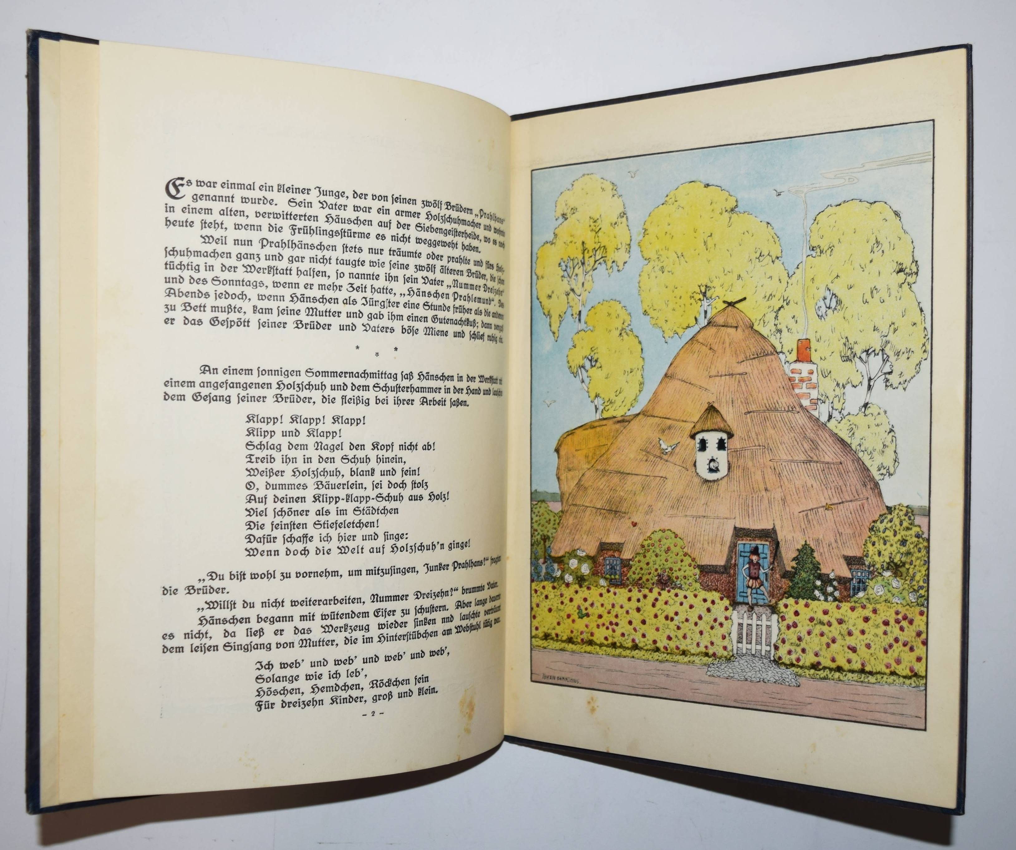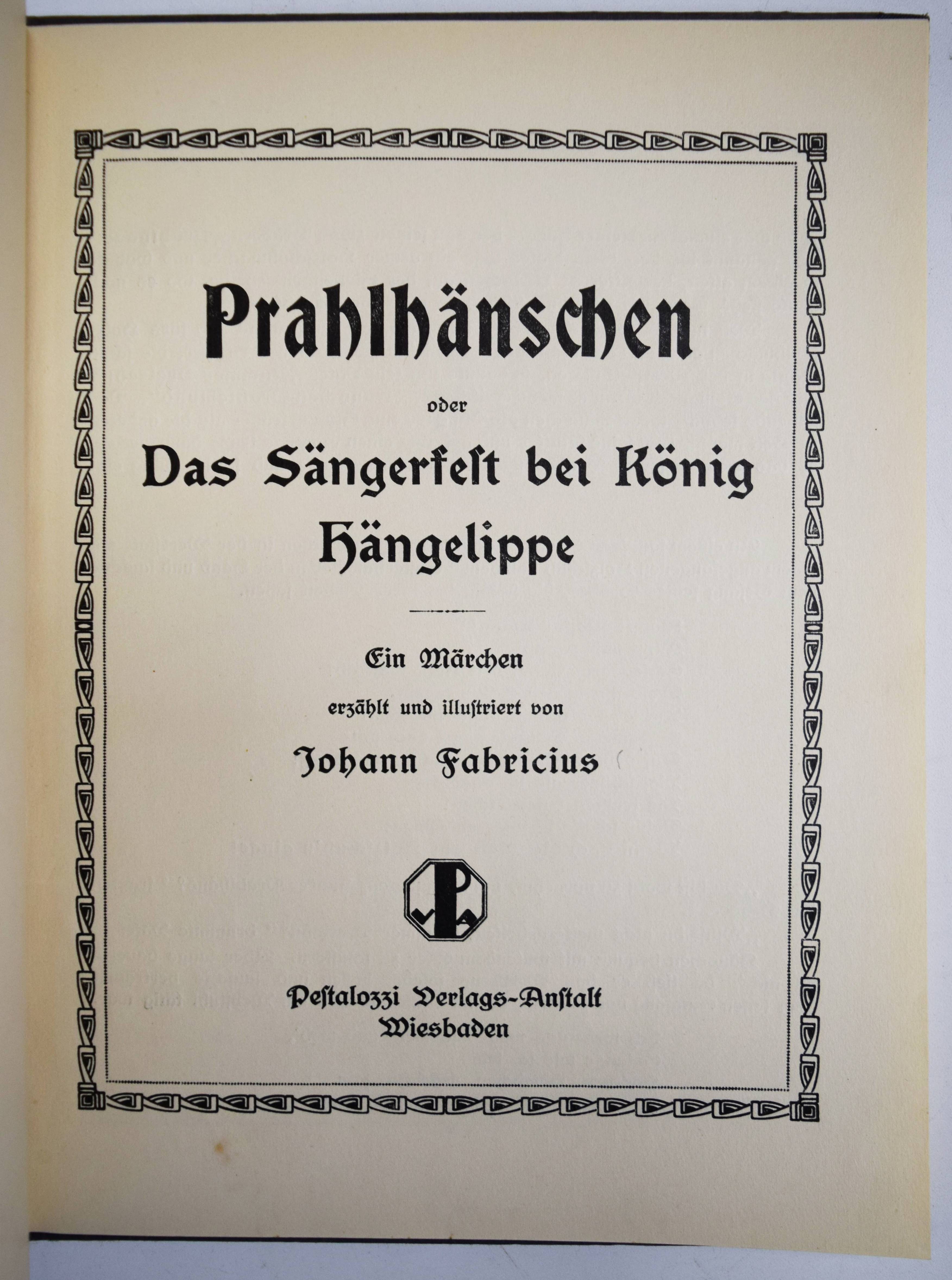 Fabricius, Johann (eig. Johan). Prahlhänschen oder Das Sängerfest bei König Hängelippe. Ein Märchen. Wiesbaden, Pestalozzi Verlags-Anstalt o. J. (1924). 4°. 19, (1) S. mit 10 Farbtafeln und 1 farbigen Vignette von J. Fabricius. Orig.-Halbleinenband mit goldgepr. Deckeltitel und farb. Deckelbild. Klotz 1373/6. – Erste und einzige deutsche Ausgabe des schönen Märchen-Bilderbuchs des niederländischen Illustrators und Schriftstellers Johan Fabricius (1899-1981). – Hänschen, der Sohn eines Holzschuhmachers, gibt sich erfolgreich als Prinz aus, gewinnt einen Sängerstreit und findet nach Hause zurück. – J. Fabricius, geboren in Niederländisch-Ostindien, studierte 1914 an der Königlichen Kunstakademie in Den Haag. Er verfasste über 100 Romane, darunter auch einige Kinderbücher. 1934 wurde mit dem 1927 veröffentlichten Buch „Das Mädchen mit dem blauen Hut“ (Originaltitel „Het meisje met de blauwe hoed“) erstmals eines seiner Werke verfilmt. – Sehr schönes saubers Eyxemplar.