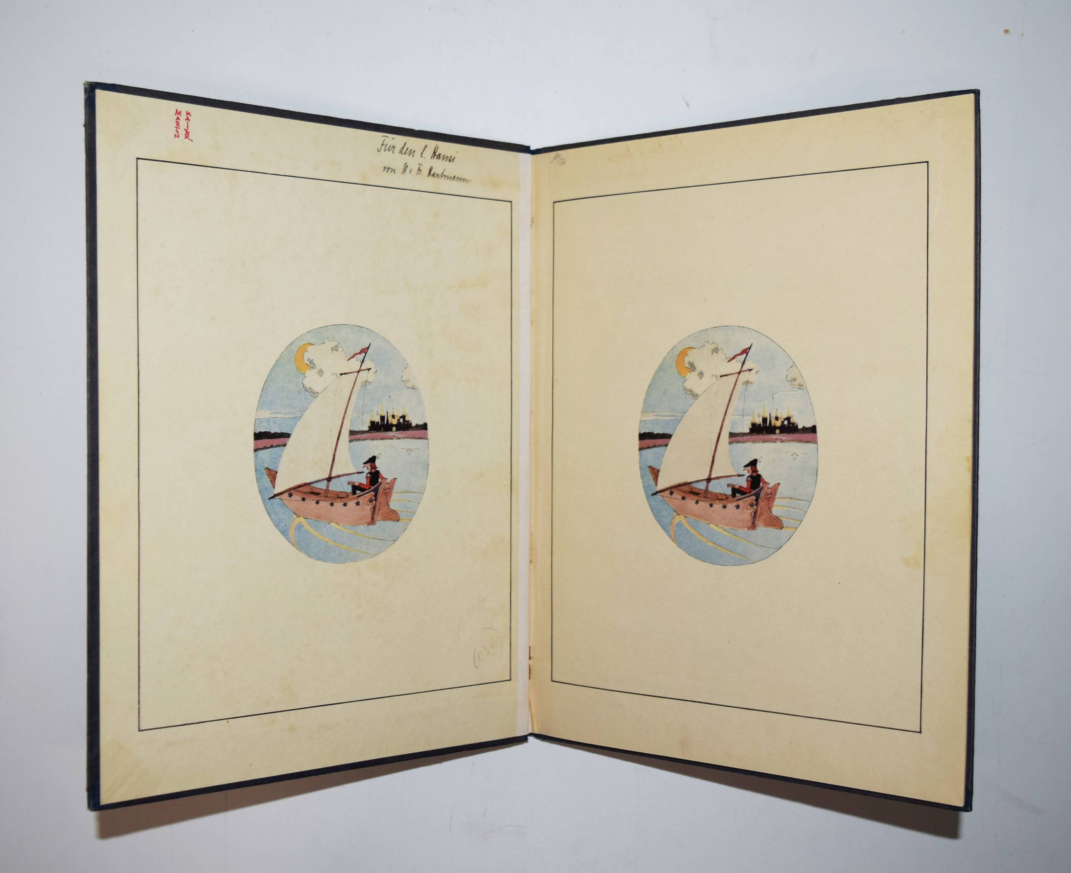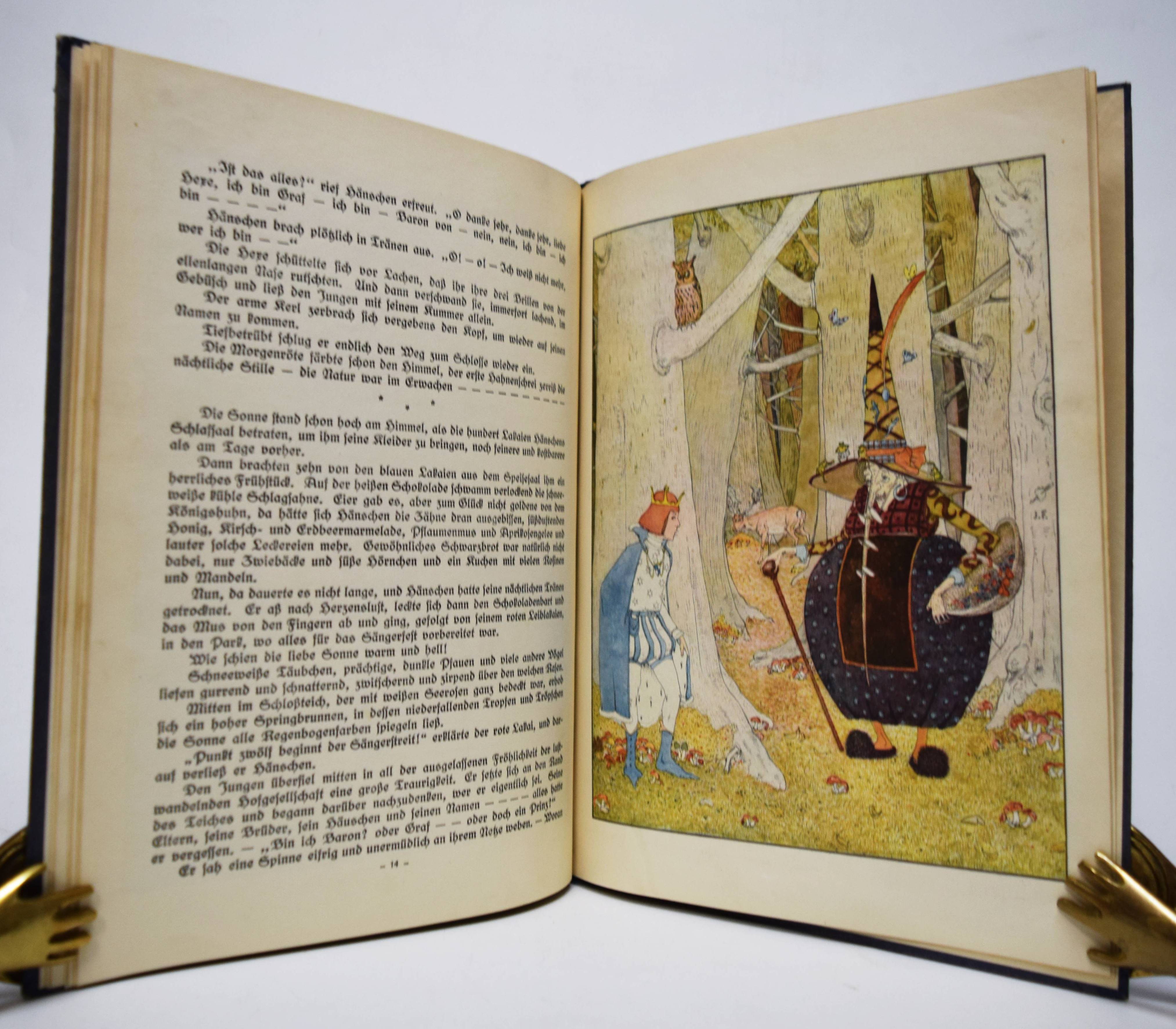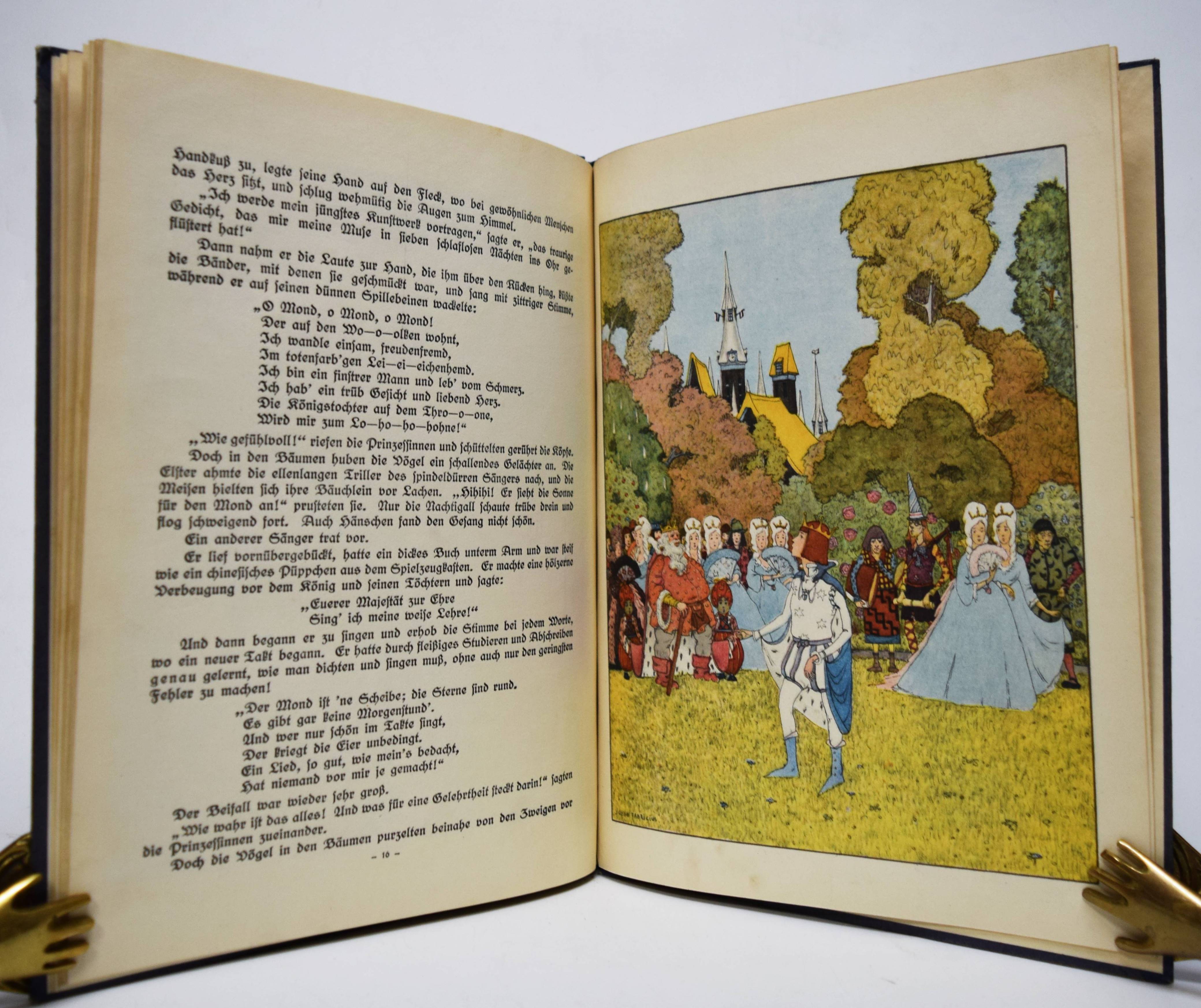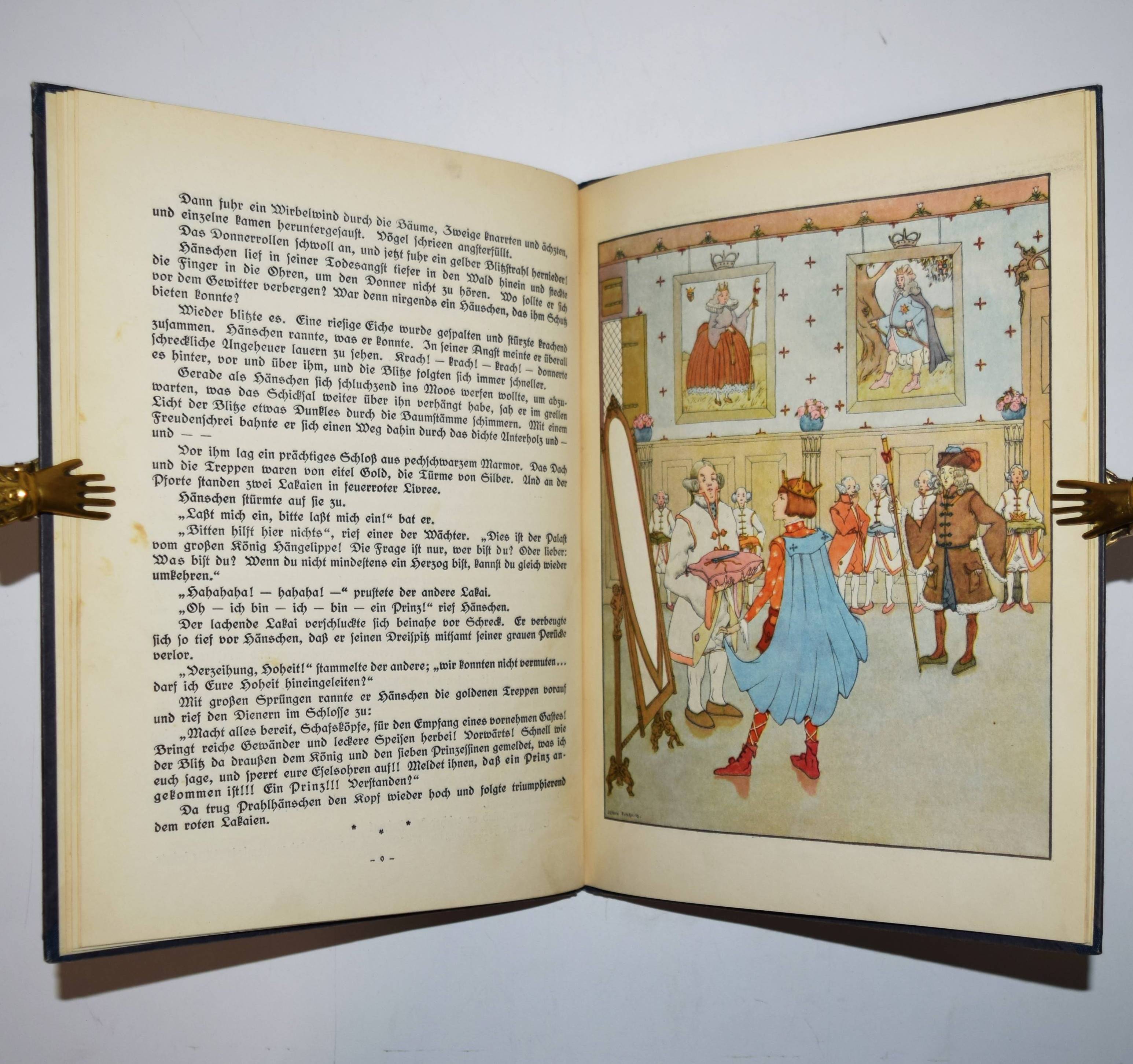 Fabricius, Johann (eig. Johan). Prahlhänschen oder Das Sängerfest bei König Hängelippe. Ein Märchen. Wiesbaden, Pestalozzi Verlags-Anstalt o. J. (1924). 4°. 19, (1) S. mit 10 Farbtafeln und 1 farbigen Vignette von J. Fabricius. Orig.-Halbleinenband mit goldgepr. Deckeltitel und farb. Deckelbild. Klotz 1373/6. – Erste und einzige deutsche Ausgabe des schönen Märchen-Bilderbuchs des niederländischen Illustrators und Schriftstellers Johan Fabricius (1899-1981). – Hänschen, der Sohn eines Holzschuhmachers, gibt sich erfolgreich als Prinz aus, gewinnt einen Sängerstreit und findet nach Hause zurück. – J. Fabricius, geboren in Niederländisch-Ostindien, studierte 1914 an der Königlichen Kunstakademie in Den Haag. Er verfasste über 100 Romane, darunter auch einige Kinderbücher. 1934 wurde mit dem 1927 veröffentlichten Buch „Das Mädchen mit dem blauen Hut“ (Originaltitel „Het meisje met de blauwe hoed“) erstmals eines seiner Werke verfilmt. – Sehr schönes saubers Eyxemplar.