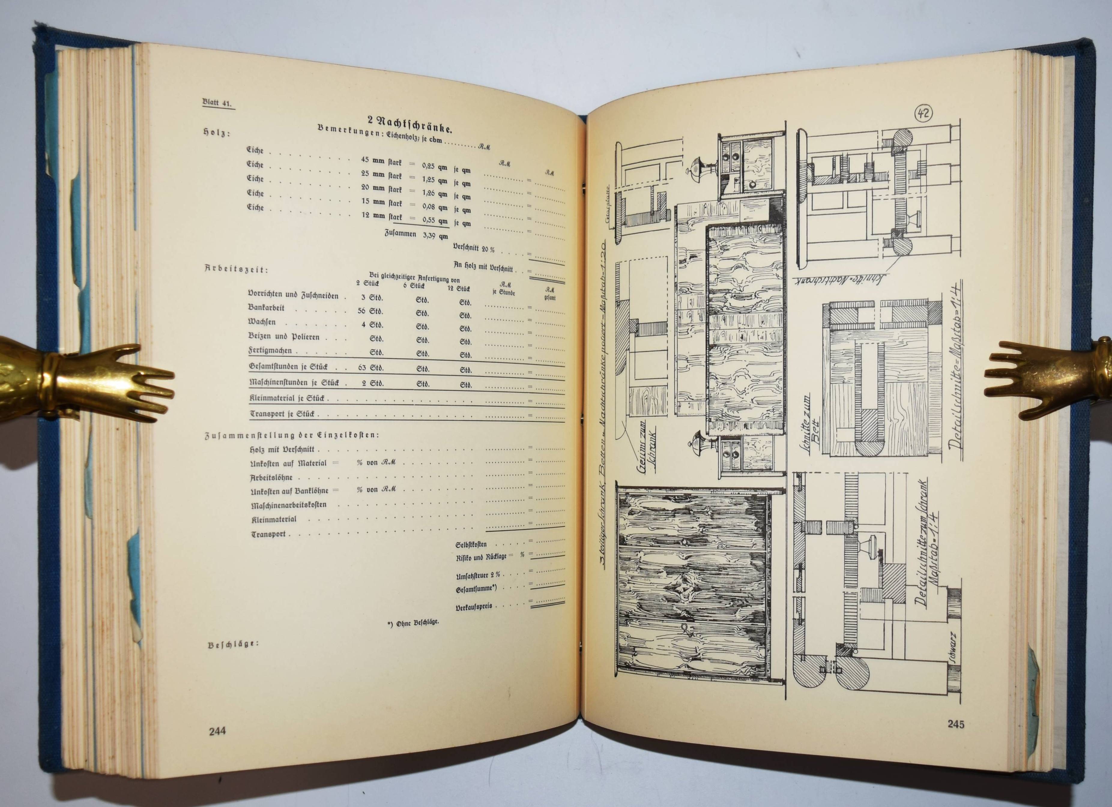 Grau, Georg (Vorwort). Die Grundlagen der fachlichen Schulung des deutschen Tischlerhandwerks. Herausgegeben vom Reichsinnungsverband für das Tischlerhandwerk in Berlin. 2 Teile in 1 Band. Berlin, Osnabrück, Meinders & Elstermann 1935. 4°. 355 S. mit zahlr. Abbildungen nach Zeichnungen. Illustr. Orig.-Leinenband mit Metallschrauben-Heftung. Als Lieferungswerk erschienenes Fachbuch für das Schreinerhandwerk. – Der erste Teil über Kalkulation der Betriebs- und Materialkosten. Der zweite Teil mit Anleitungen zum Fenster- und Möbelbau. – Einband etwas berieben, sonst gut erhalten.