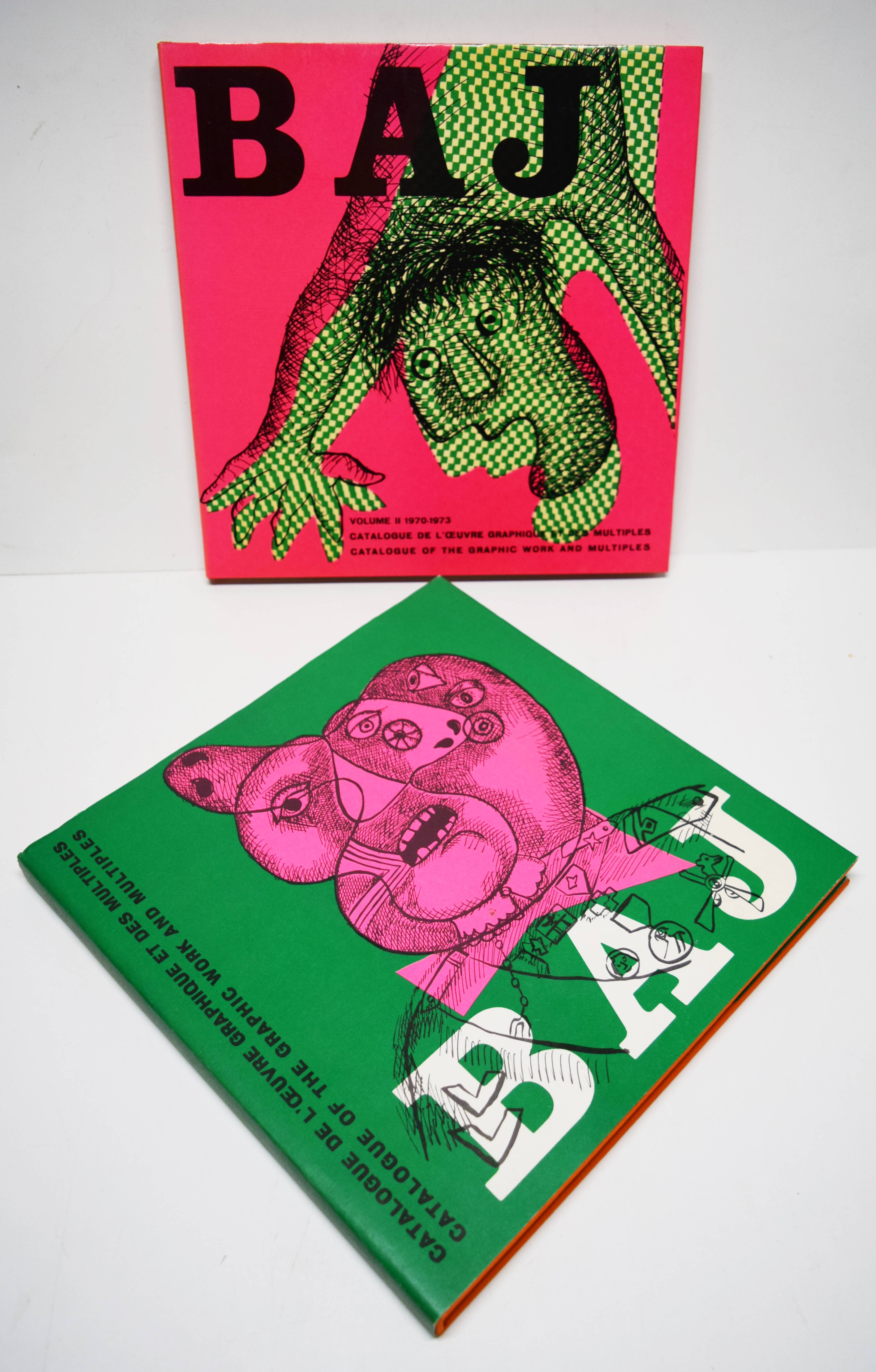 Baj, Enrico. Catalogue de l’oeuvre graphique et des multiples. Catalogue of the graphic work and multiples. Réalise par Jean Petit. I. 1952-1970. – II. 1970-1973. 2 Bände. Genève, Editions Rousseau 1970-1973. 4° (27,7 x 27,5 cm.). [126] p.; [136] p. with numerous illustrations, some in colour. Illustrated original clothbound volumes with colour illustrated dust jackets. (Panoramas forces vives). Near fine copy.