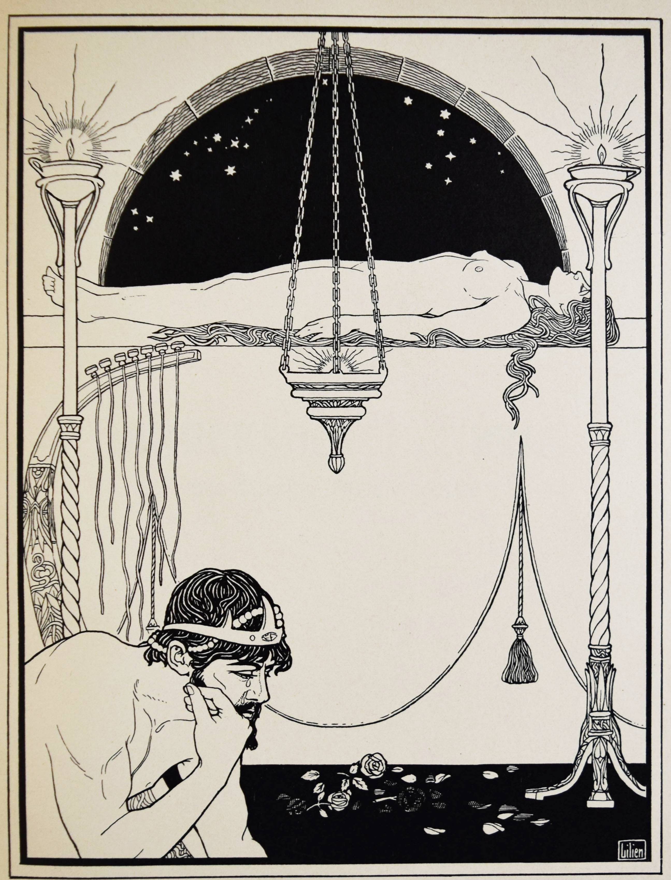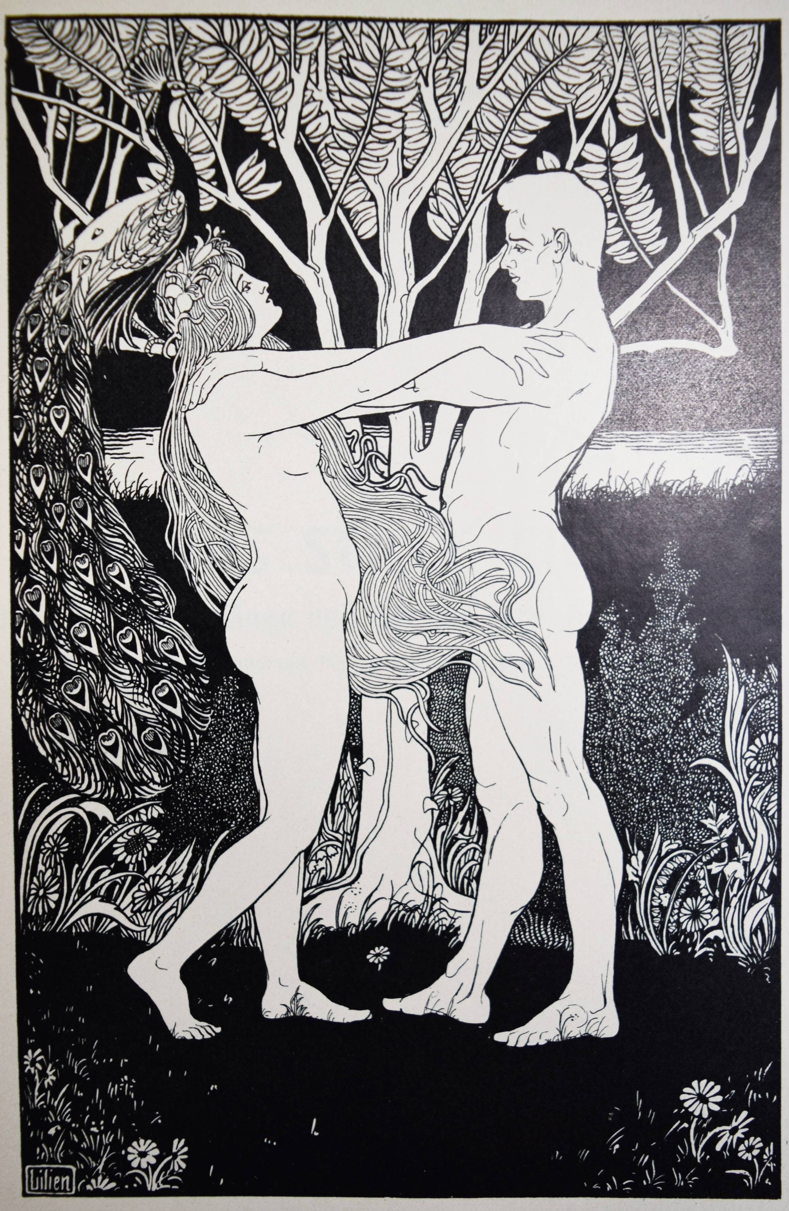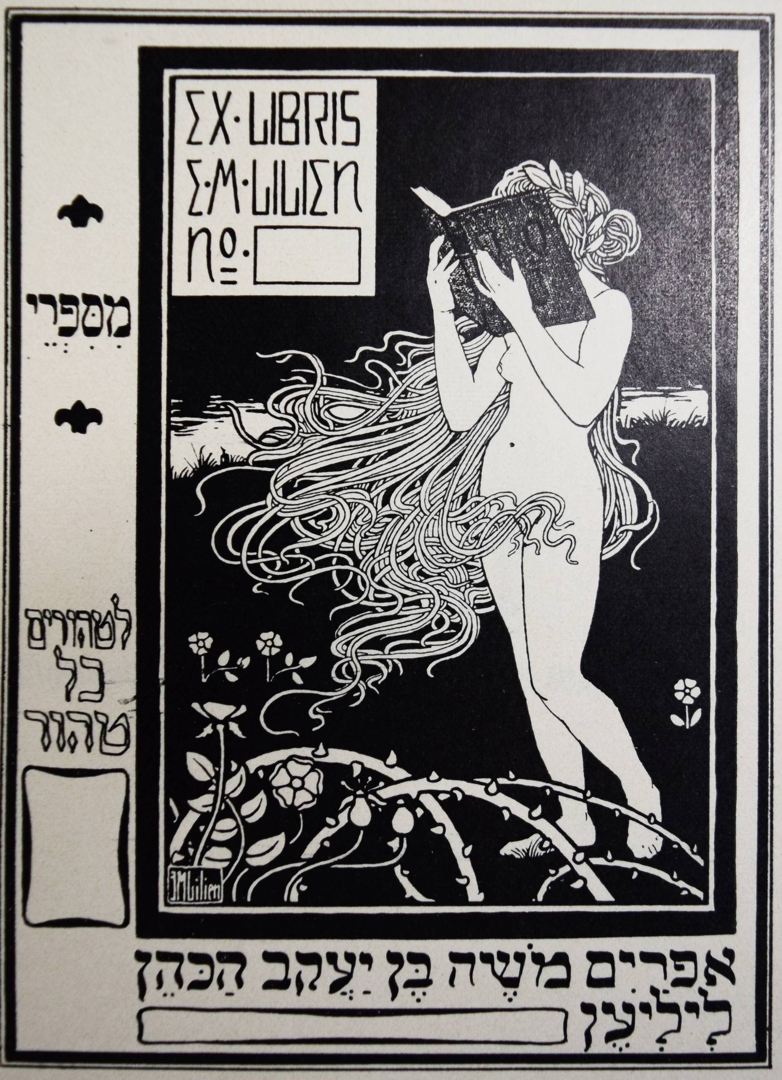 Lilien – Zweig, Stefan (Einleitung). E(phraim) M(ose) Lilien. Sein Werk. Berlin und Leipzig, Schuster & Loeffler 1903. 4° (29,5 x 24 cm.). 347 S., [4] Bl. mit Portrait und zahlr. meist ganzs. Abbildungen. Illustrierter Orig.-Leinenband. NDB XIV, 550 f. und XXVIII, 794 ff. W.-G.² 5 (S. Zweig). – Erste und einzige Ausgabe der in kleiner Auflage erschienenen Monographie über den Jugendstilgraphiker und Illustrator Ephraim Moses Lilien (1874-1925), der mit seinen Arbeiten nachhaltig das Erscheinungsbild der jungen zionistischen Bewegung prägte. – „Stefan Zweig propagierte ihn in einer 1903 erschienenen reich illustrierten Monographie „E. M. Lilien, sein Werk“. L. zählte in Berlin zu den Vertretern der „Jüd. Renaissance“, einer Gruppe um Martin Buber, Berthold Feiwel und Chaim Weizmann, die 1901 den Jüd. Verlag gründete und seit 1902 mit dem Jüd. Almanach hervortrat, dessen künstlerische Leitung L. übernahm. … Mit äußerster Konsequenz verwendet L. in seinem Werk die von Aubrey Beardsley vor der Jahrhundertwende entwickelten Prinzipien einer kontrastreichen Schwarz-Weiß-Zeichenkunst, die auf der Wechselwirkung von geschlossenen Flächen und sensitiver Linienführung beruhen. Dabei findet L. vor allem im Motivischen durch die Konzentration auf jüdische Themen zu einer persönlichen Ausprägung. Er wird damit zum Vertreter des Jugendstils in der jüd. Kunst“ (Hans Ries in NDB). – Einband etwas berieben, Gelenke unauffällig restauriert, stellenweise im Blattrand etwas braunfleckig, gutes Exemplar.