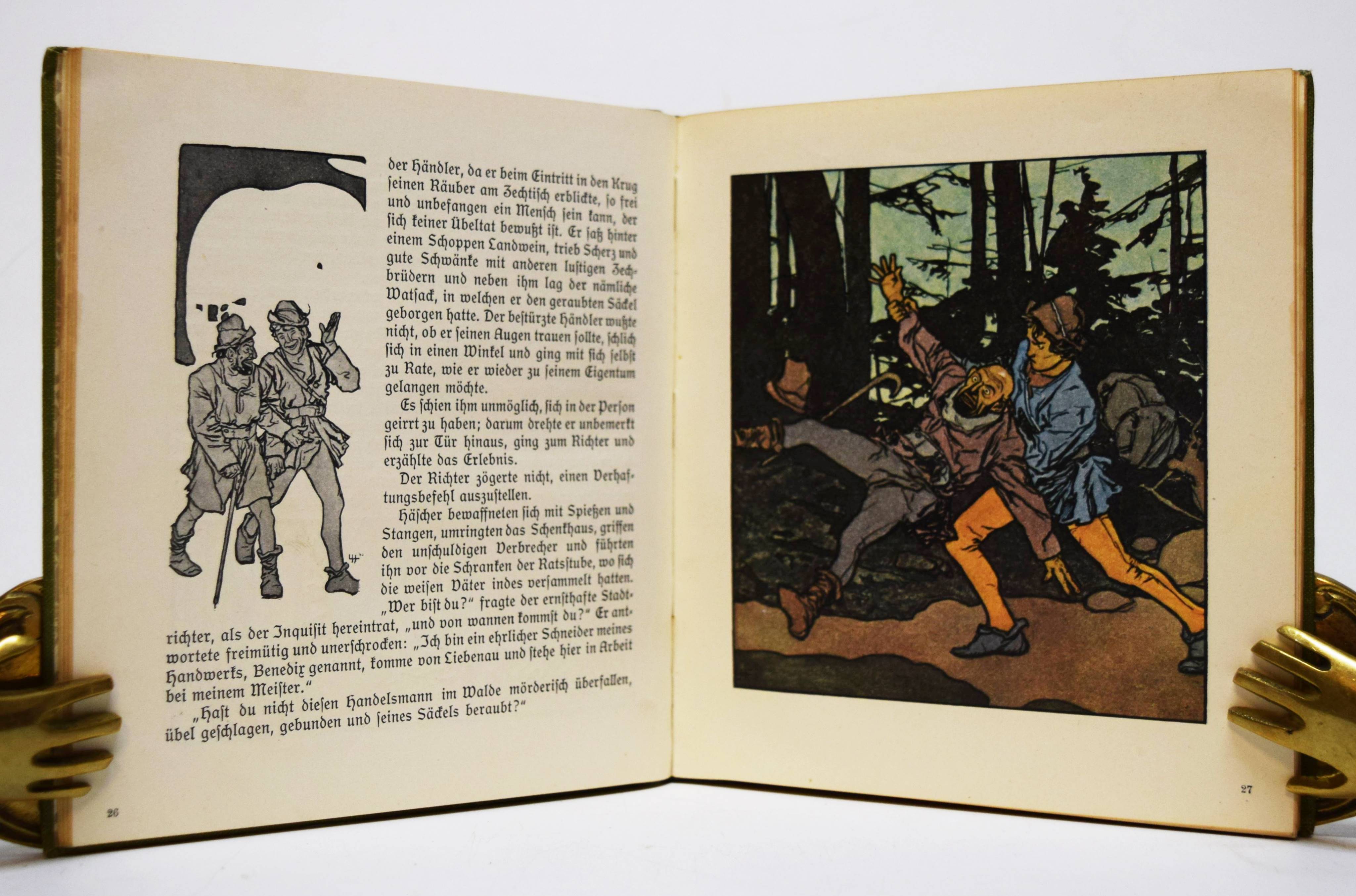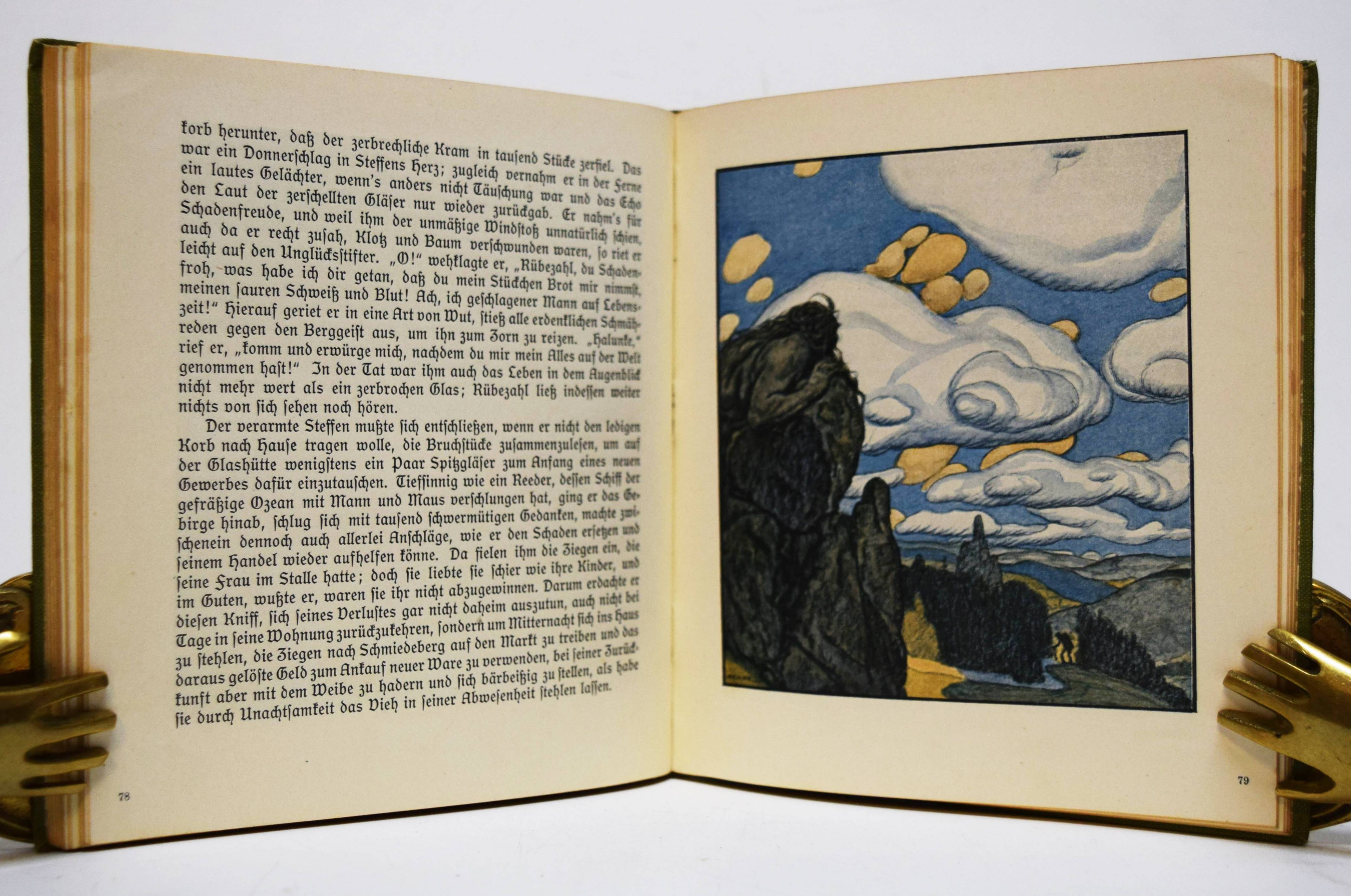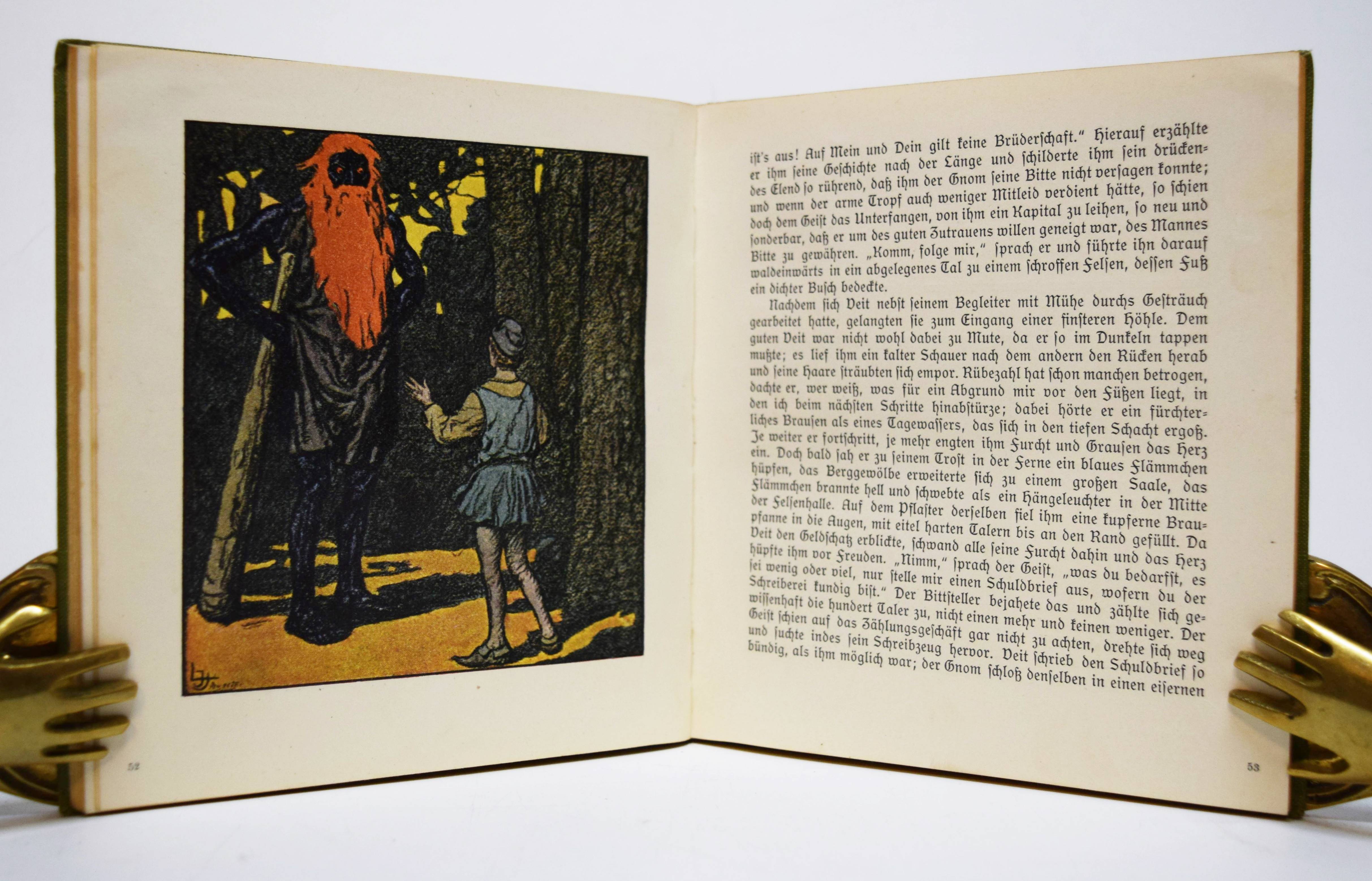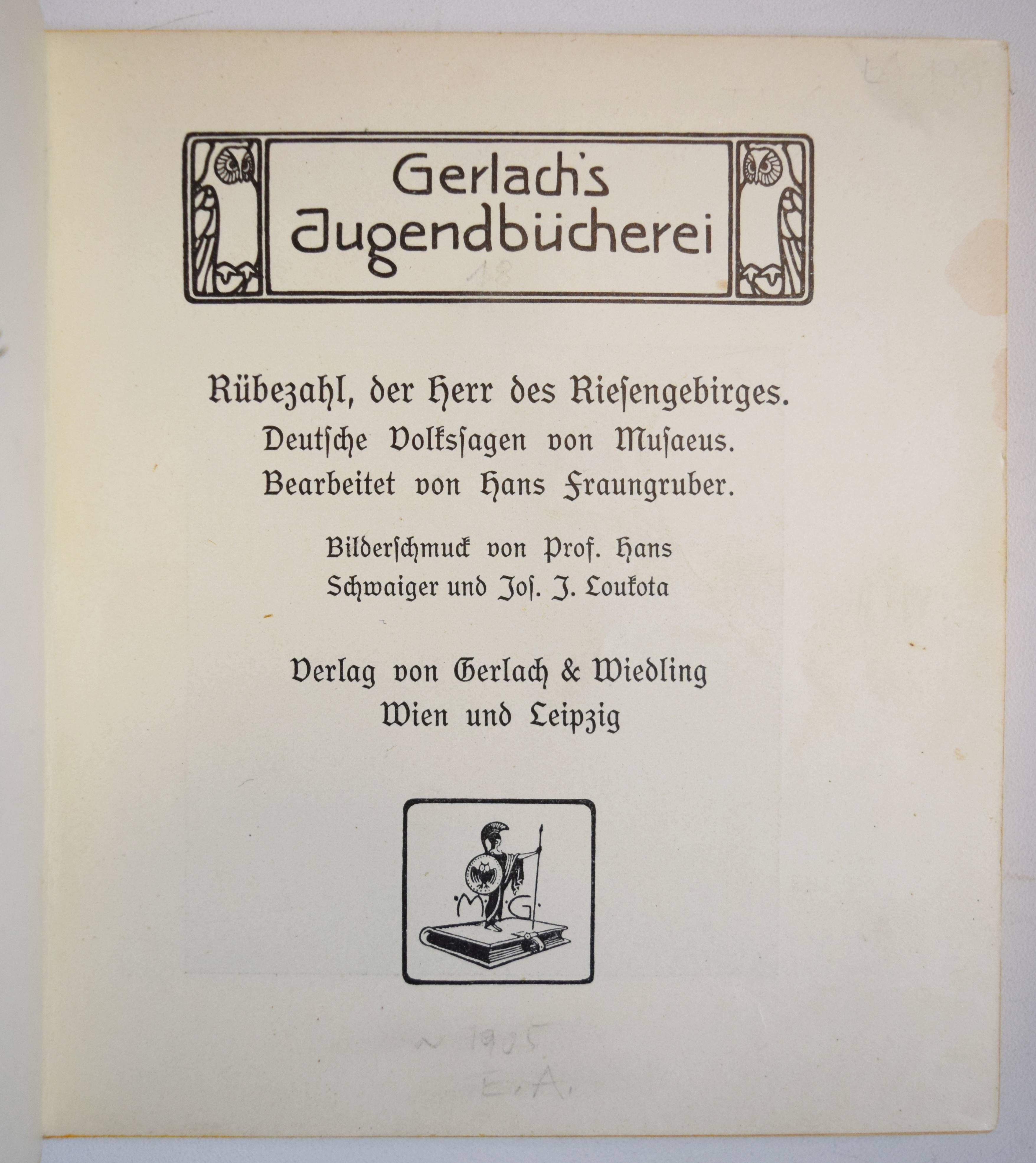 Musäus, (Johann Karl August). Rübezahl, der Herr des Riesengebirges. Deutsche Volkssagen von Musaeus. Bearbeitet von Hans Fraungruber. Bilderschmuck von Hans Schwaiger und Jos(ef) J. Loukota. Wien und Leipzig, Gerlach & Wiedling o. J. (1907). Kl.-8°. 118 S., [1] Bl. mit 82 teils farb. u. ganzs. Illustrationen. Illustr. Orig.-Leinenband. (Gerlach’s Jugendbücherei, Band 18). Heller 18. Nebehay, Gerlach 18. Ries 696, 1 u. 876, 1. – Erste Ausgabe. – Zeitgenöss. Widmung gegenüber dem Titelblatt, sehr gutes sauberes Exemplar.