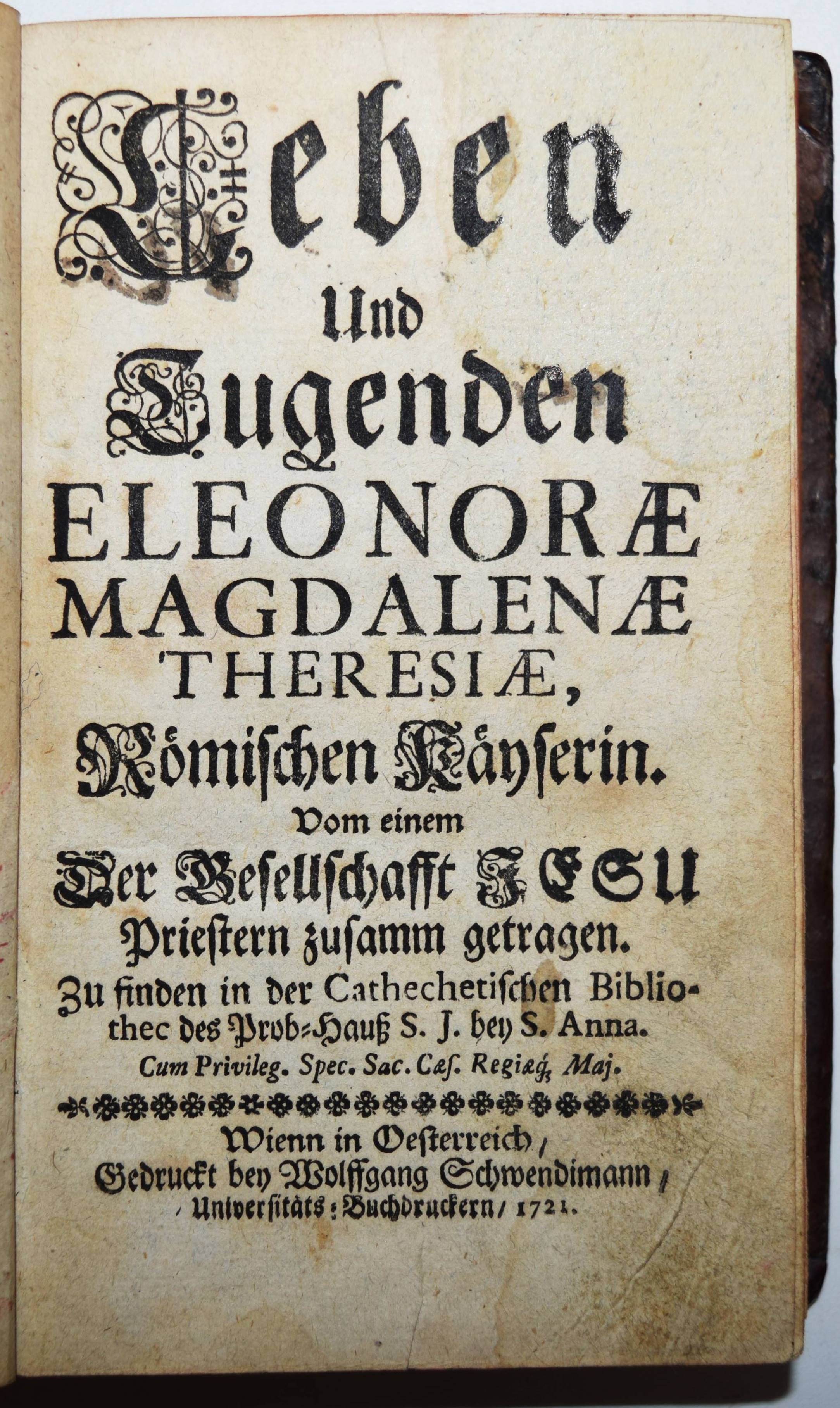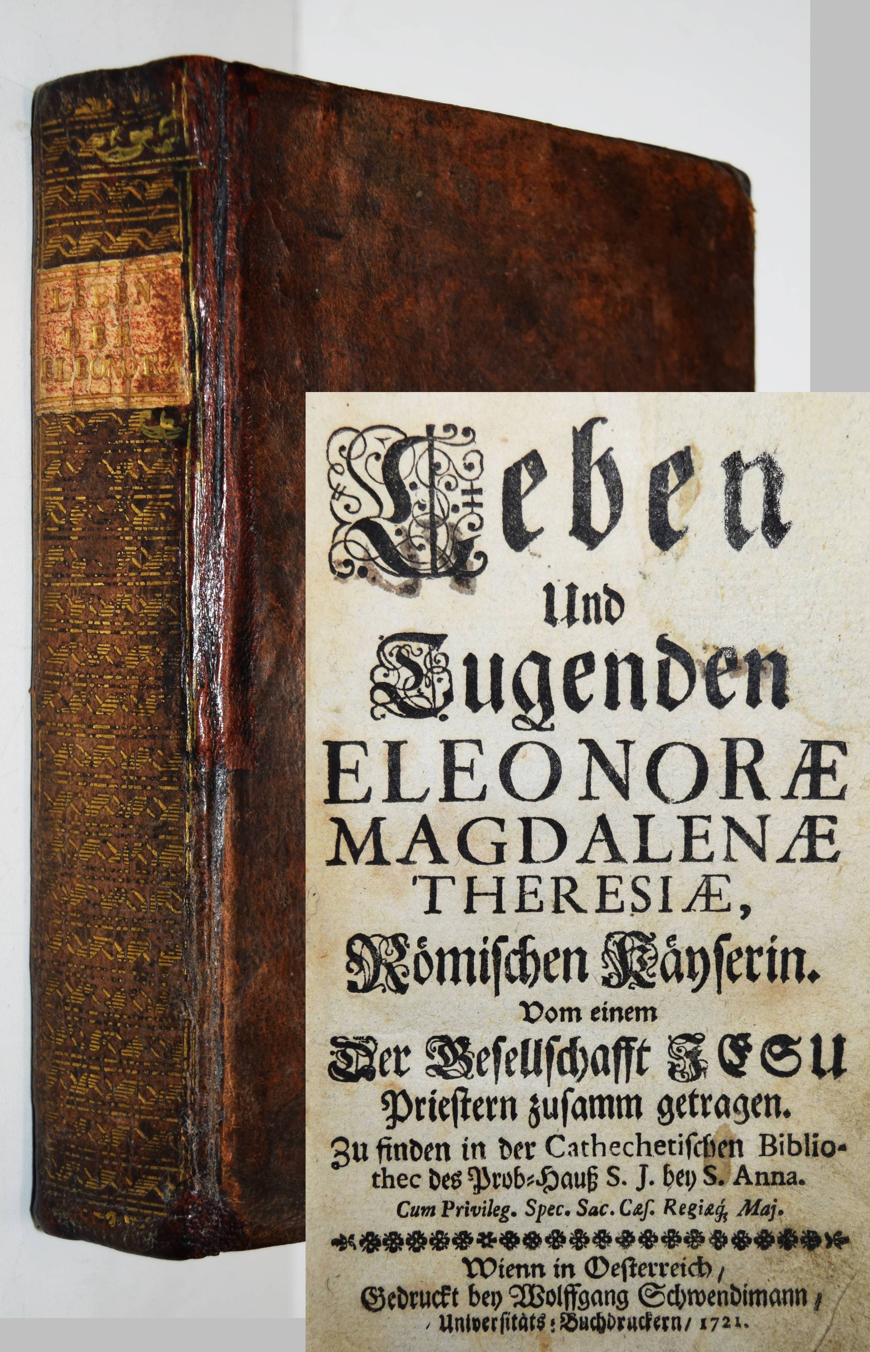 (Wagner, Franz und Bernhard Lanz). Leben und Tugenden Eleonorae Magdalenae Theresiae, Römischen Kayserin. Wien, Wolfgang Schwendimann 1721. Kl.-8° (16,5 x 10,5 cm.). [8] Bl., 367 S. Kalbslederband der Zeit mit goldgepr. Rückenschild und reicher Rückenvergoldung. De Backer-Sommervogel VIII, 10. Holzmann-Bohatta VI, 6349. Oettinger 175. VD18 11395494. – Erste deutsche Ausgabe der 1720 beim gleichen Verleger in Latein erschienenen Biographie der Gattin von Leopold I. – Rücken etwas berieben, Exlibris, gutes Exemplar.