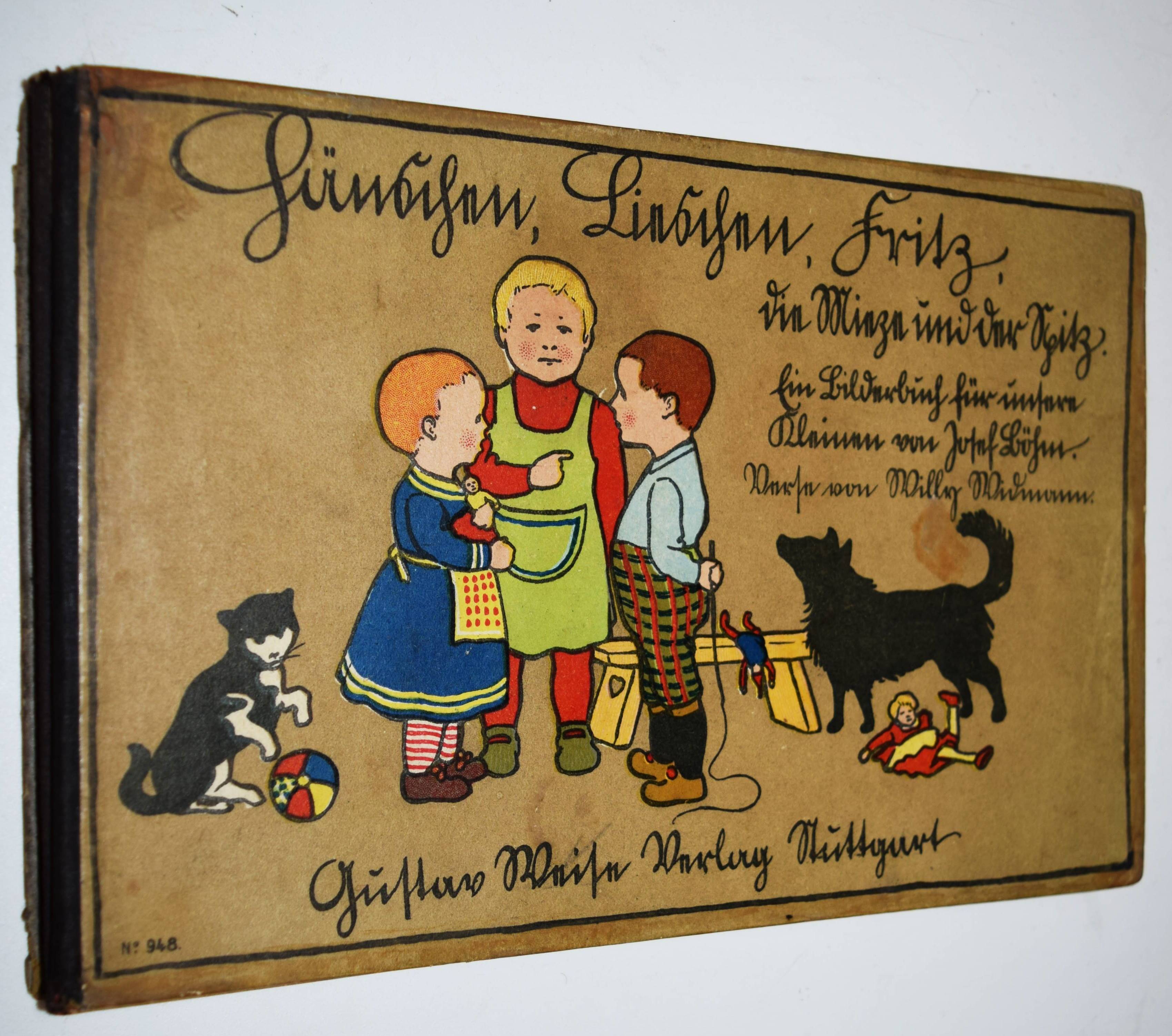 Widmann, Willy. Hänschen, Lieschen, Fritz, die Mieze und der Spitz (Deckeltitel). Ein Bilderbuch für unsere Kleinen. Stuttgart, Gustav Weise o. J. (1911). Quer-8°. Leporello, 14 (statt 16) farblithogr. Tafeln (inkl. Titel) von Josef Böhm auf Karton. Farbig illustr. Orig.-Halbleinenband. (Verlags-Nr. 948). Klotz 8225/3. Ries 441, 3. – Erste Ausgabe. – Seltenes Kleinkinder-Bilderbuch mit zeittypischen Illustrationen im Caspari-Stil auf graubraunem Hintergrund. Titel in deutscher Schreibschrift. – Der böhmische Dekorationsmaler, Illustrator und Kunstgewerbler J. Böhm (geb. 1877) lebte in Stuttgart, später in Wien und seit 1920 in der Tschechoslowakei. – Das innengelenk der letzten Tafel alt mit schwarzem Leinenstreifen restauriert, 2 Tafeln am Schluß fehlen, sonst gut erhalten.