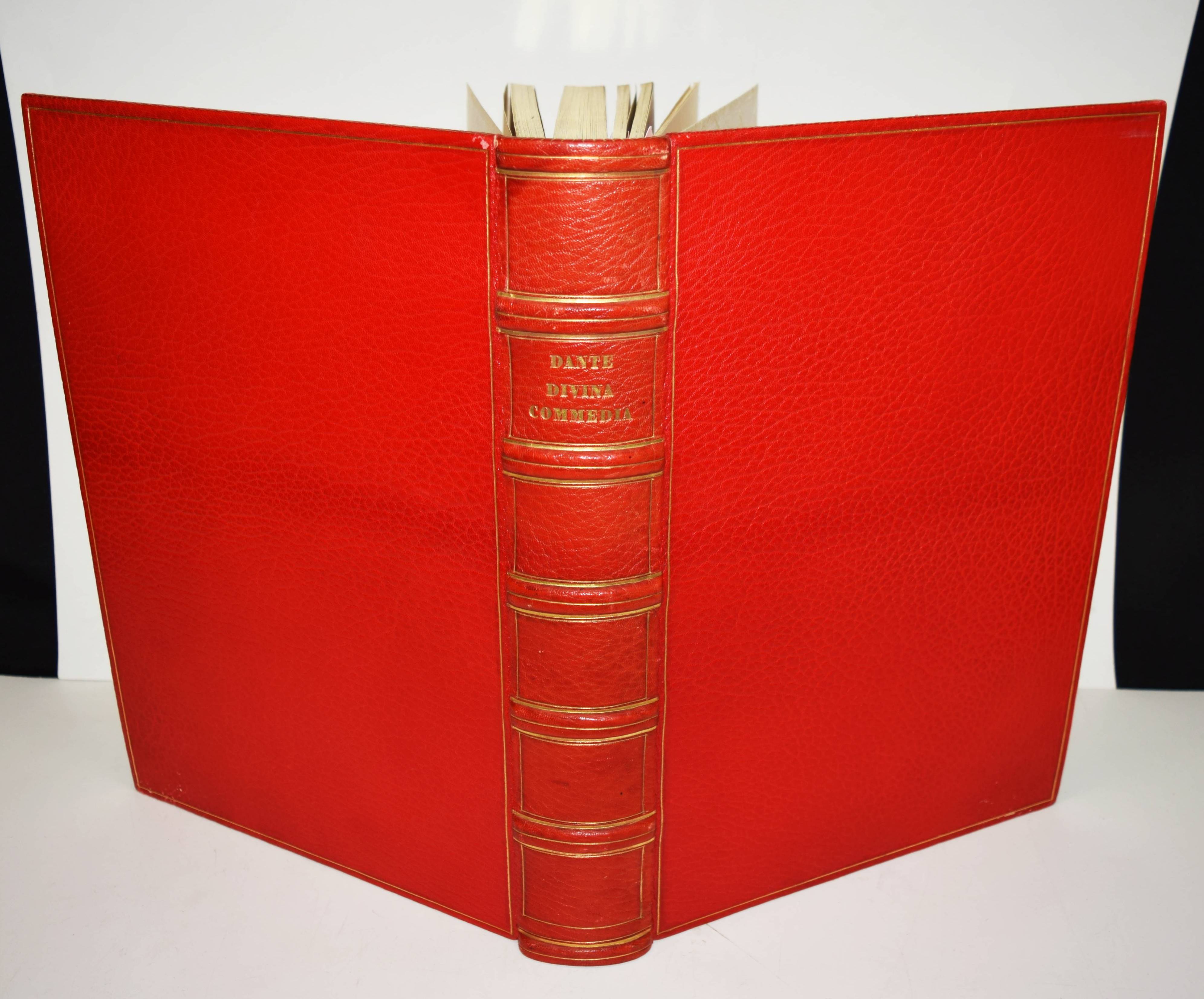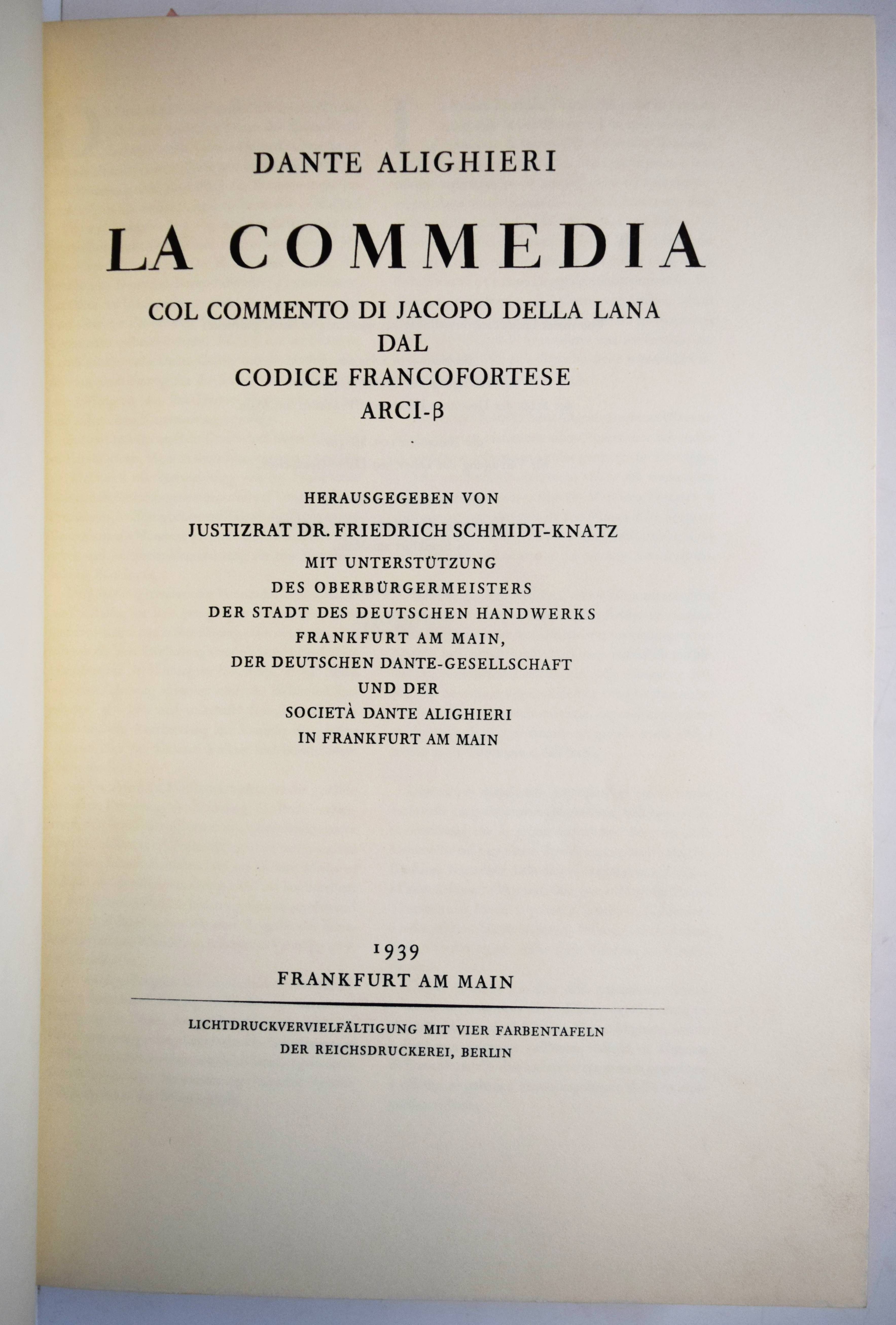Dante, Alighieri. La Commedia. Col commento di Jacopo della Lana dal codice Francofortese Arci-(beta). Herausgegeben von Friedrich Schmidt-Knatz mit Unterstützung des Oberbürgermeisters der Stadt des Deutschen Handwerks Frankfurt am Main, der Deutschen Dante-Gesellschaft und der Società Dante Alighieri in Frankfurt am Main. Frankfurt am Main, Reichsdruckerei Berlin für die Stadt Frankfurt 1939. Folio (36,5 x 26 cm.). 15 S. (Texteinführung und Lesarten), 218 (in der Handschrift paginierte, davon 4 farbige) Blätter im Lichtdruck faksimiliert. Weinroter genarbter Maroquin-Lederband der Zeit mit goldgepr. Rückentitel auf 7 Bünden mit Kassettenvergoldung, Deckel-Filetten, Kanten- und Innenkantenvergoldung in Halbleder-Schuber. Eines von 500 num. Exemplaren. – „Die Handschrift hat ihren besonderen Wert einmal durch ihre – von unvermeidlichen Schreibfehlern abgesehen – ausgezeichnete Textüberlieferung, zum anderen durch den ihr angefügten Kommentar des Jacopo della Lana und zum dritten als eine der sogenannten reichen Handschriften durch ihren künstlerisch wertvollen Miniaturenschmuck, der hoch über dem der gleichzeitigen Commedia-Handschriften steht; hierzu kommt, daß sie wegen ihrer schönen Schrift leicht lesbar ist. … Technik, Farben und Formen der Miniaturen sind, wie eine Betrachtung der zahlreichen in Bologna entstandenene, datierten Miniaturhandschriften ergibt, typisch für die Bologneser Miniaturenschule der beiden ersten Drittel des 14. Jahrhunderts, so daß eine Entstehung der Handschrift in Bologna durchaus im Bereich der Möglichkeit und Wahrscheinlichkeit liegt“ (Einleitung des Herausgebers in Deutsch und Italienisch). – Sehr schönes Exemplar in einem prachtvollen Handeinband. Provenienz: Christian Scheffler, ehemaliger Leiter des Klingspor-Museums, Offenbach.