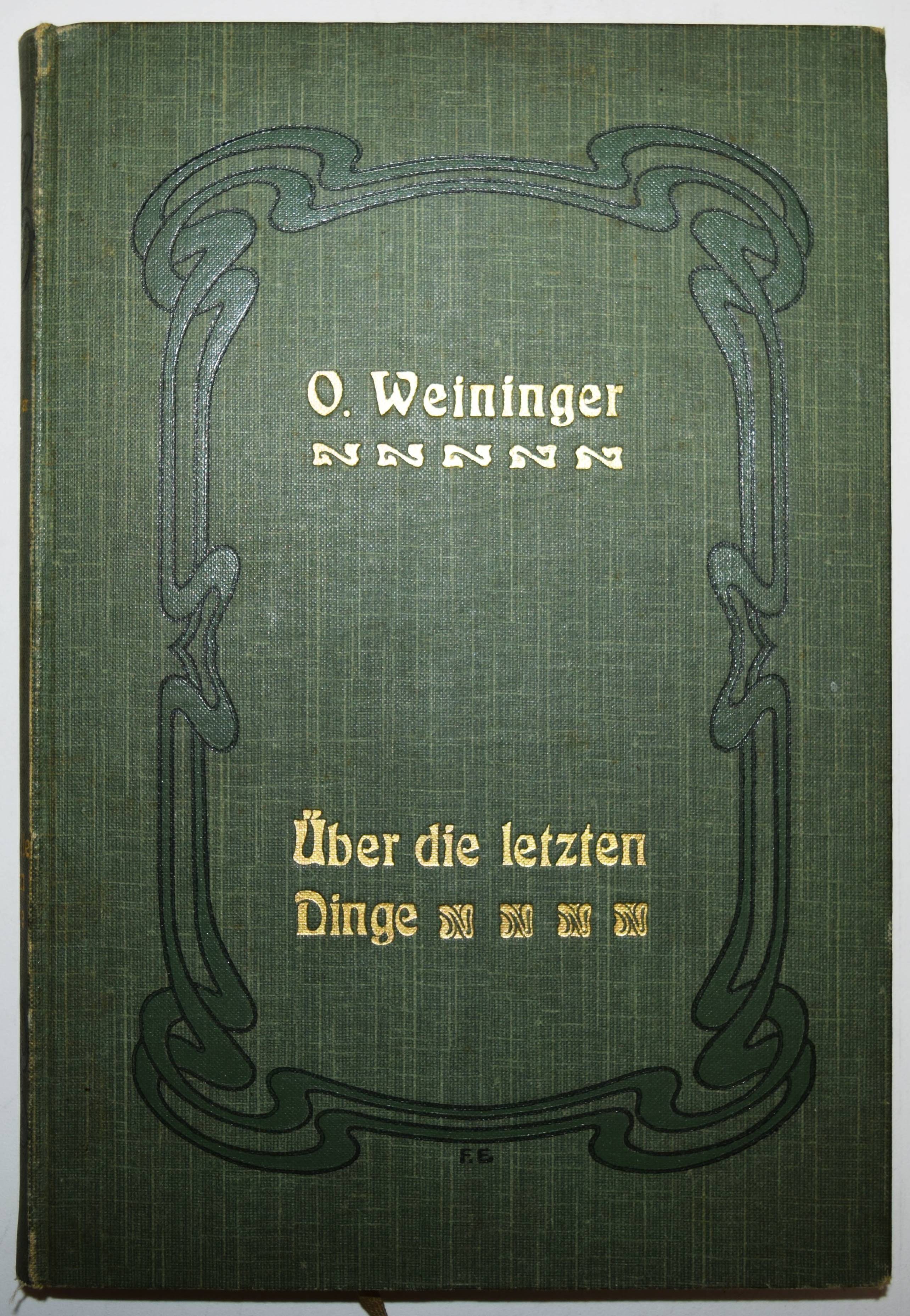Weininger, Otto. Über die letzten Dinge. Mit einem biografischen Vorwort von Moritz Rappaport. 2. veränderte Auflage. Wien, Wilhelm Braumüller 1907. 8°. XXIII, [1] Bl., 178 S. Orig.-Leinenband mit goldgepr. Rücken- und Deckeltitel und Jugendstil-Ornamentik. Ziegenfuss II, 847. – Zweite veränderte Auflage des posthum veröffentlichten Werks; die erste Ausgabe erschien 1904, im Jahr nach Weiningers Freitod. – Der Wiener Philosoph O. Weininger (1880-1903), der besonders durch sein Hauptwerk „Geschlecht und Charakter“ berühmt wurde und zahlreiche andere Denker seiner Zeit beeinflusste, „entwickelte die Theorie von der psychisch-physischen Bisexualität des Menschen. Neben der Pschologie und Metaphysik der Geschlechter beschäftigt ihn die Psychologie des Genies“ (W. Ziegenfuss). – Weiningers Philosophie war stark von Immanuel Kant geprägt, wies aber auch starke antisemitische und misogyne Züge auf. Im Jahre 1903, im Alter von 23 Jahren, nahm sich Otto Weininger in Beethovens Sterbehaus in Wien das Leben. – Sehr schönes Exemplar im dekorativen Jugendstil-Einband.