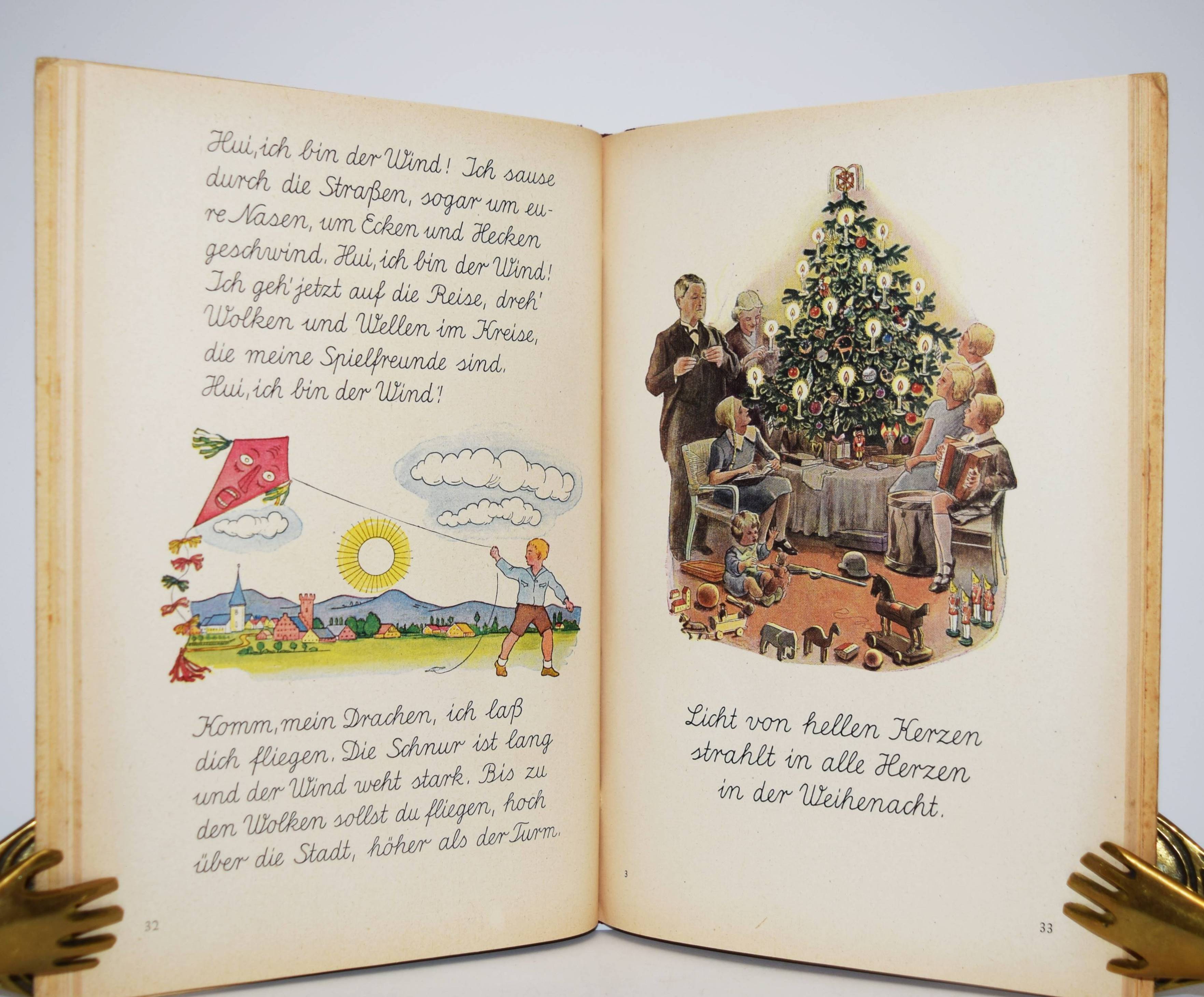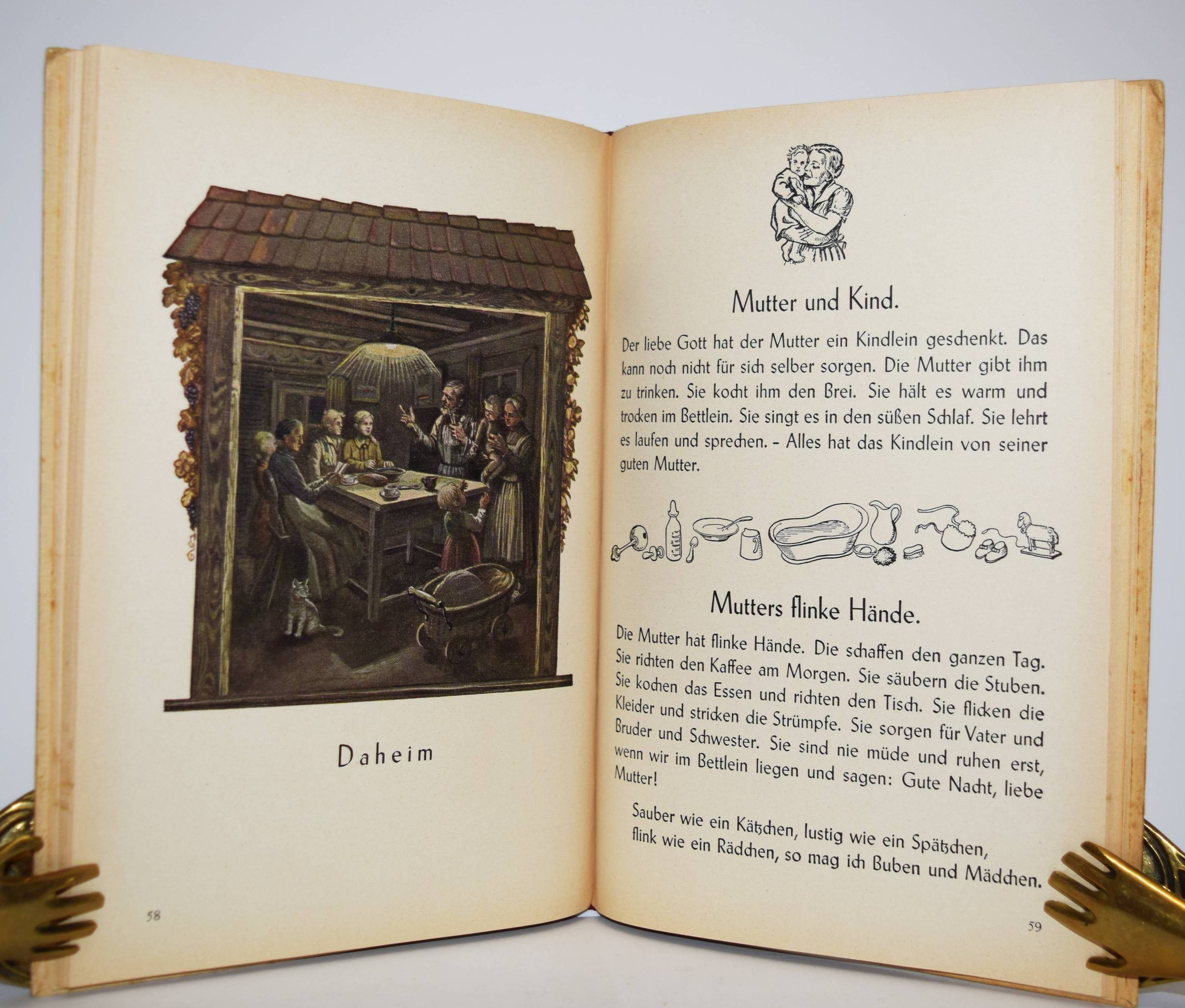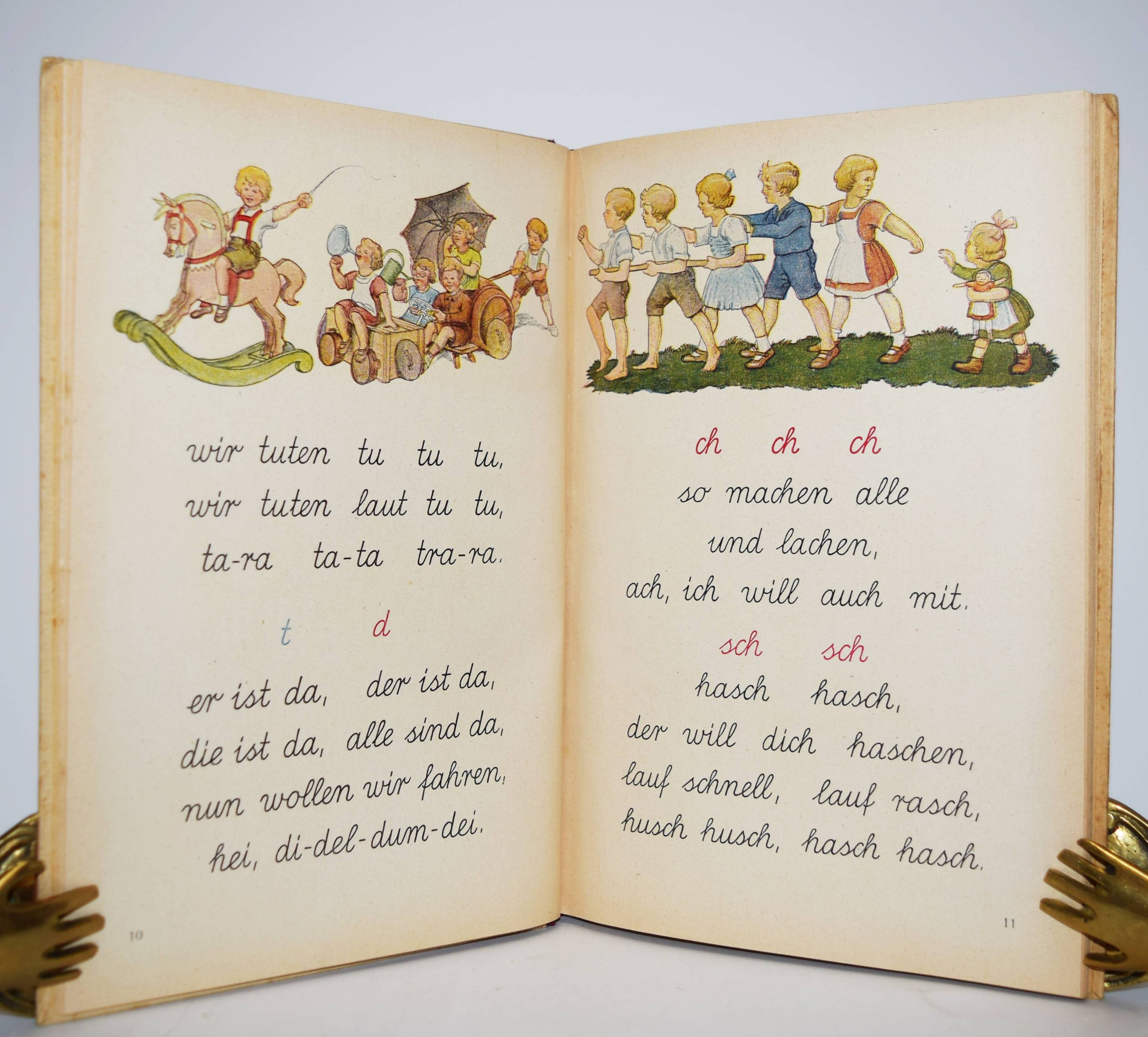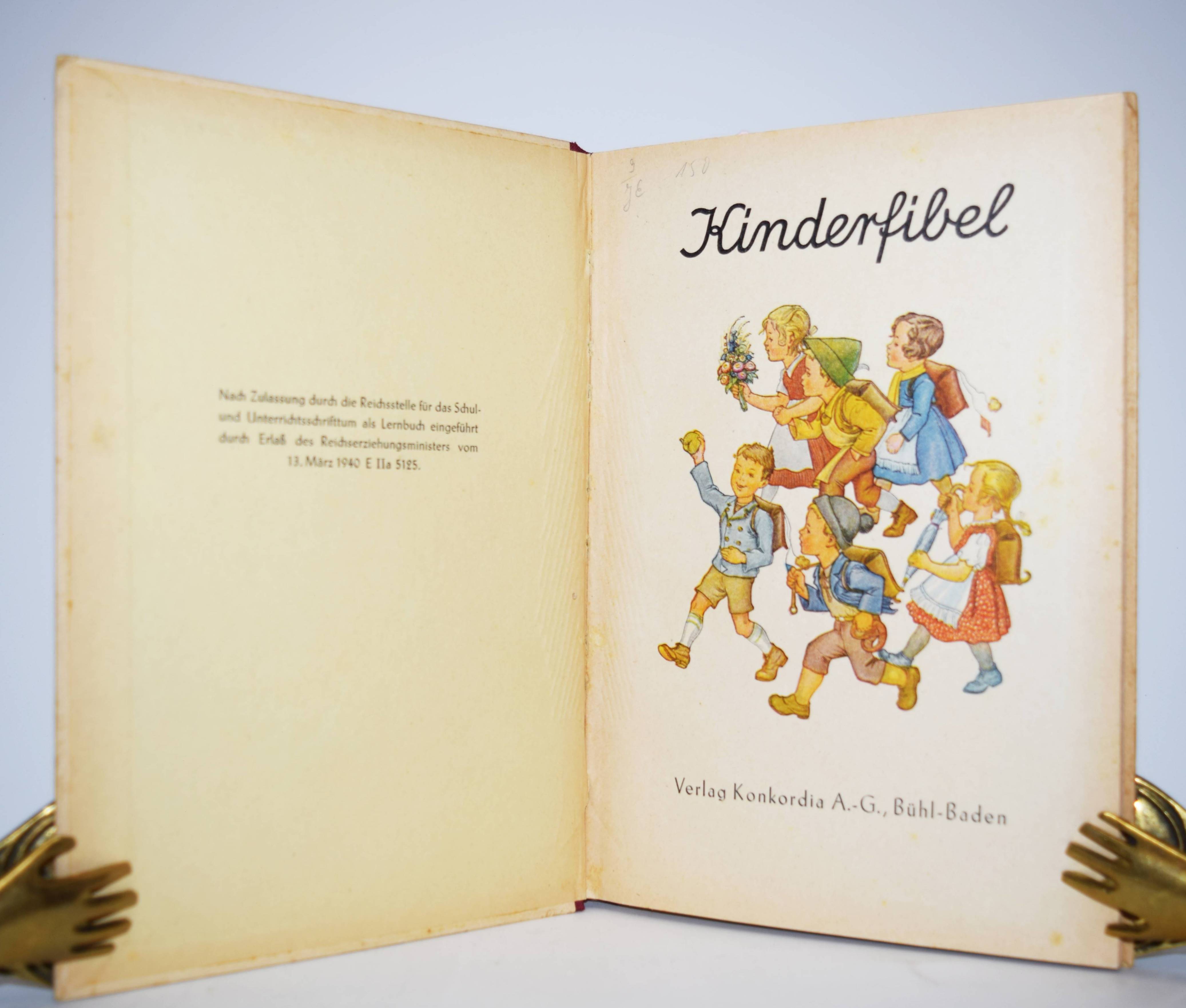 Fibel – Gärtner, Emil und Eduard Gerweck (Hrsg.). Kinderfibel. Bühl, Konkordia (1943). Gr.-8°. 96 S. mit 73 farbigen Illustrationen von Karl Geitz. Illustr. Orig.-Halbleinenband. May-Schweitzer 137. Vgl. Waldschmidt 117 (Ausg. von 1942 mit Abb.). – Erschien zuerst 1935. – „Die Leselernmethode dieser Fibel ist eine Mischung aus analytisch-synthetischer Methode und Ganzheitsmethode… Politisch zählt diese Fibel zu den weniger militanten Erstleseschriften. Zwar tragen alle Jungs die braunen Hemden der Hitlerjugend, aber auf allzu starke Propaganda hat man verzichtet. Textlich basiert die Fibel zum großen Teil auf Kinderliedern und Reimen, die fast alle traditionelles Fibelgut sind“ (May/Schweitzer). – Einband leicht braunfleckig, papierbedingt etwas gebräunt, sehr gutes Exemplar.