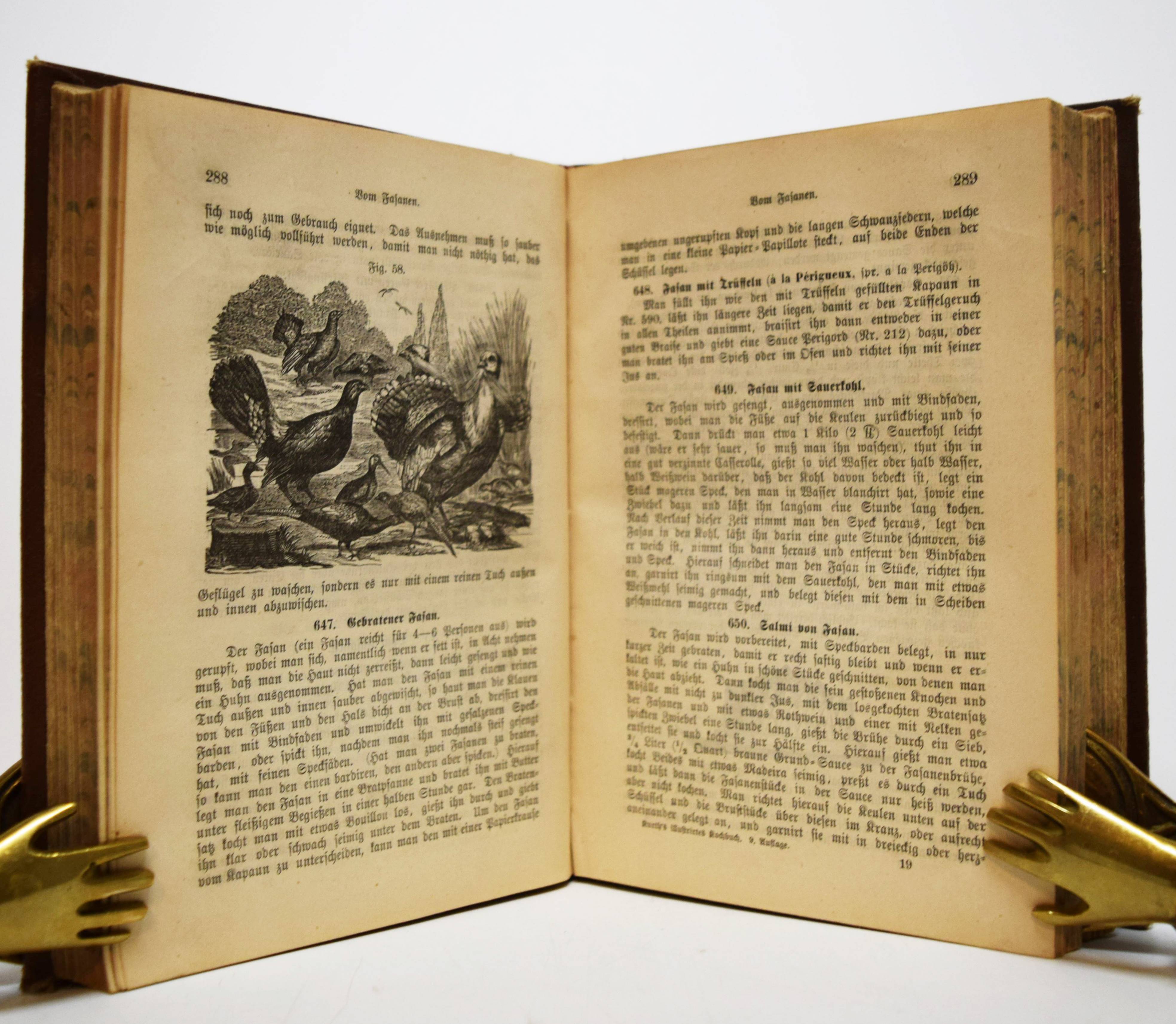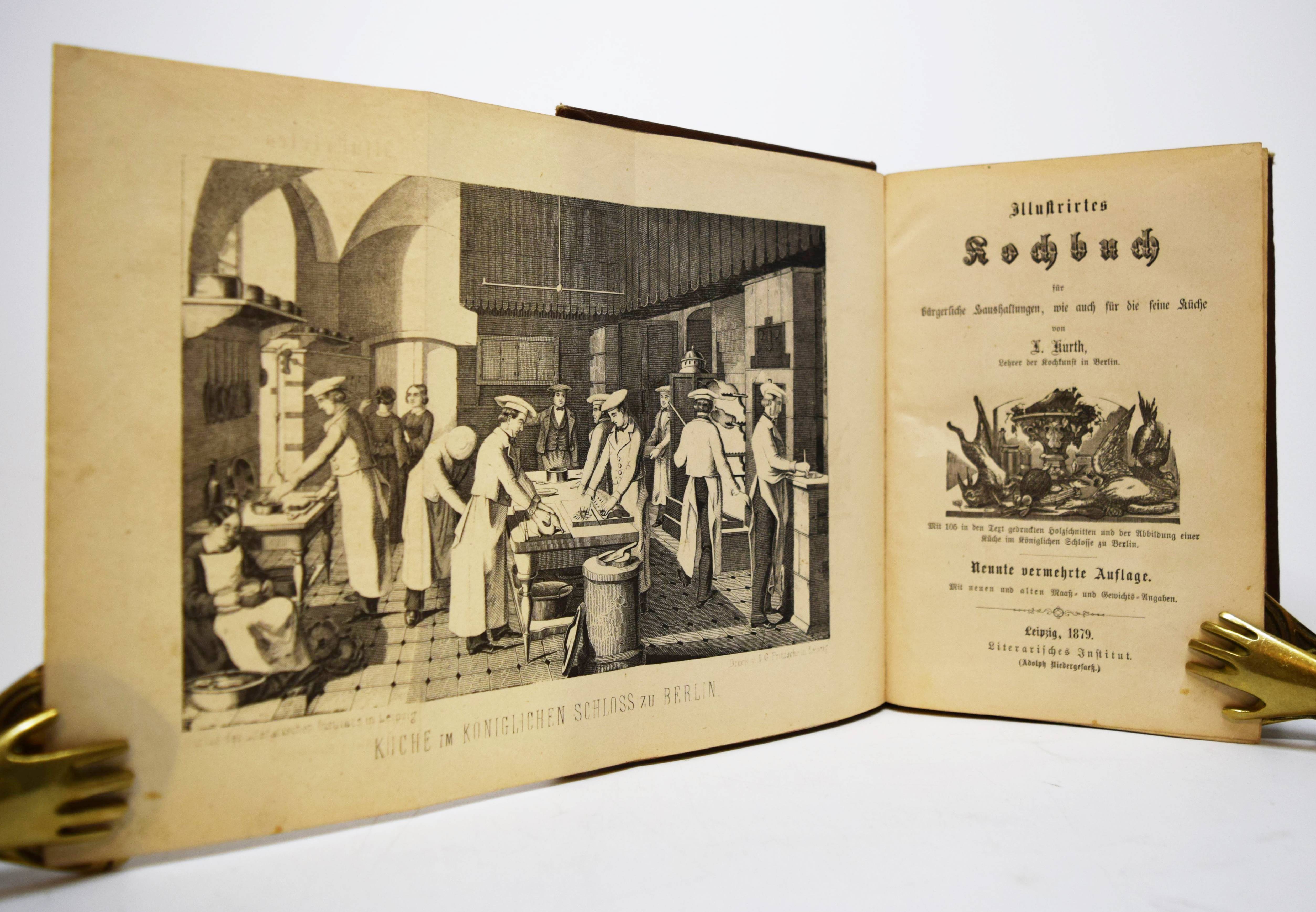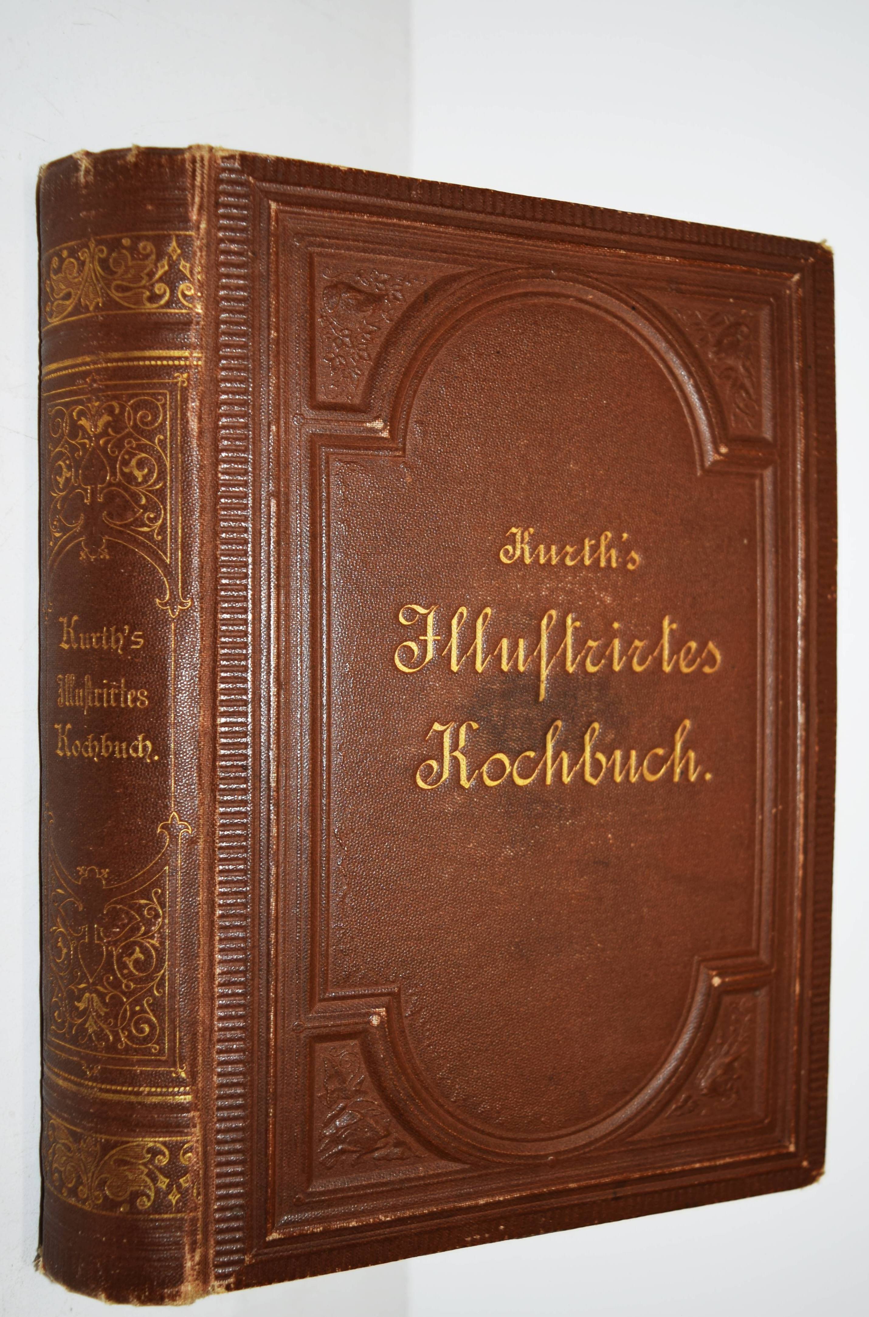 Kurth, L(udwig). Illustrirtes Kochbuch für bürgerlichen Haushaltungen, wie auch für die feine Küche. 9. vermehrte Auflage. Leipzig, Literarisches Institut (Adolph Niedergesaeß) 1879. 8°. XXIV, 760 S. mit gefalt. lithogr. Frontispiz, Titelvignette und 102 Holzstich-Illustrationen. Blindgepr. Orig.-Leinenband mit goldgepr. Rücken- und Deckeltitel. Bitting 266. Weiss 2185. – Zuerst 1858 erschienenes Kochbuch. L. Kurth war Hofkoch des Fürsten zu Putbus und später Leiter einer Kochschule in Berlin. Das schöne Frontispiz zeigt die „Küche im Königlichen Schloss zu Berlin“. – Kanten leicht berieben, zeitgenöss. Besitzvermerk, sehr gutes Exemplar.