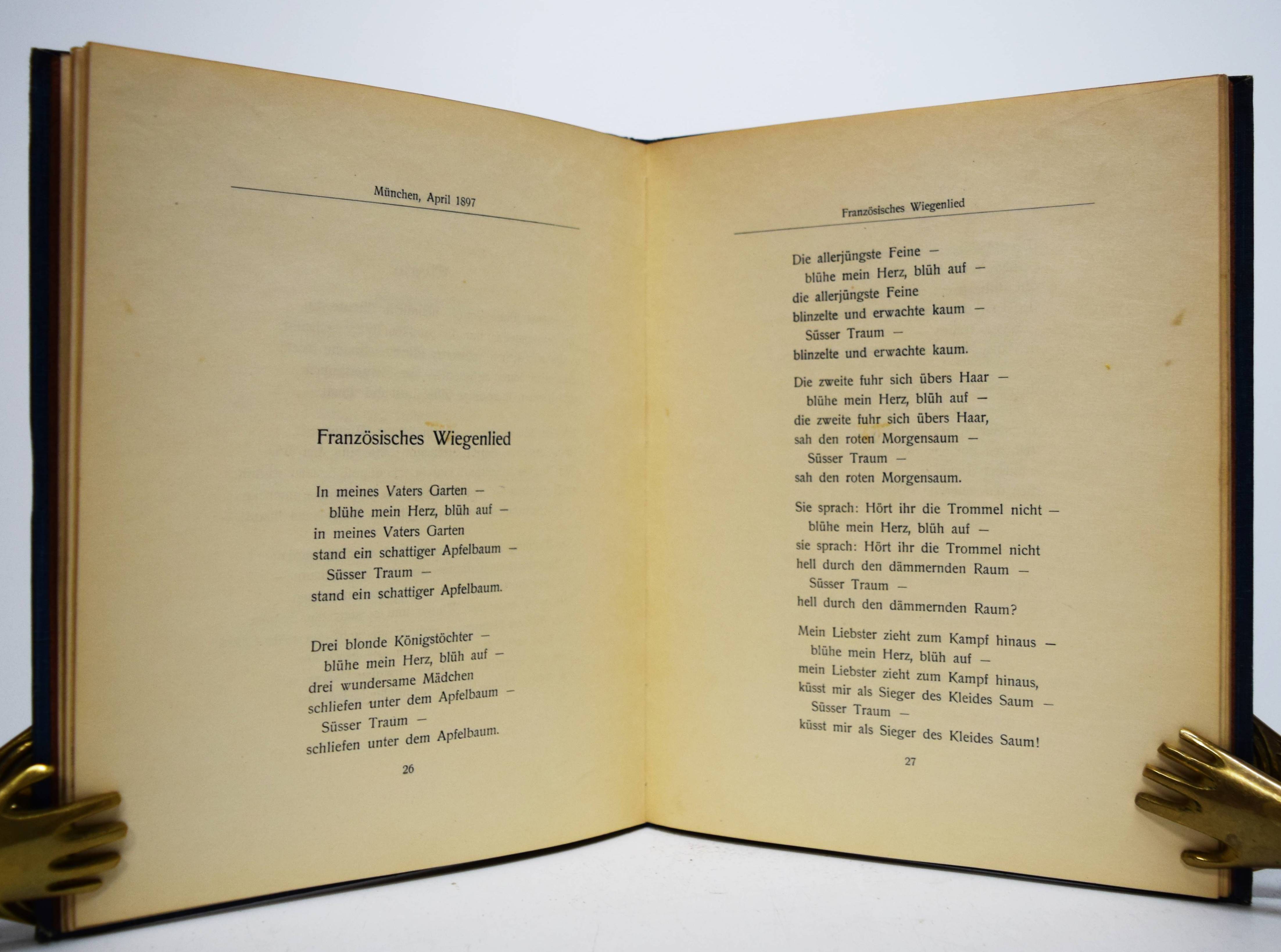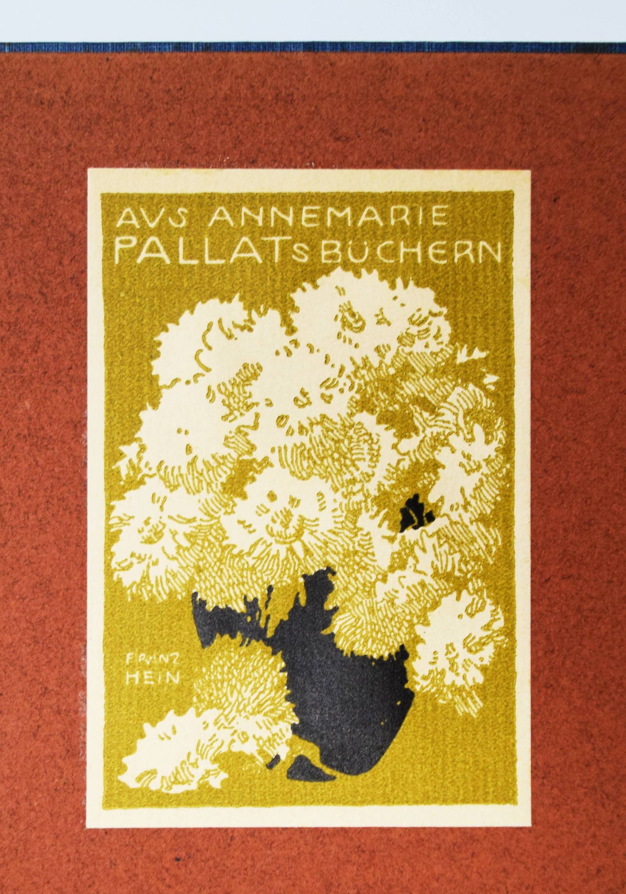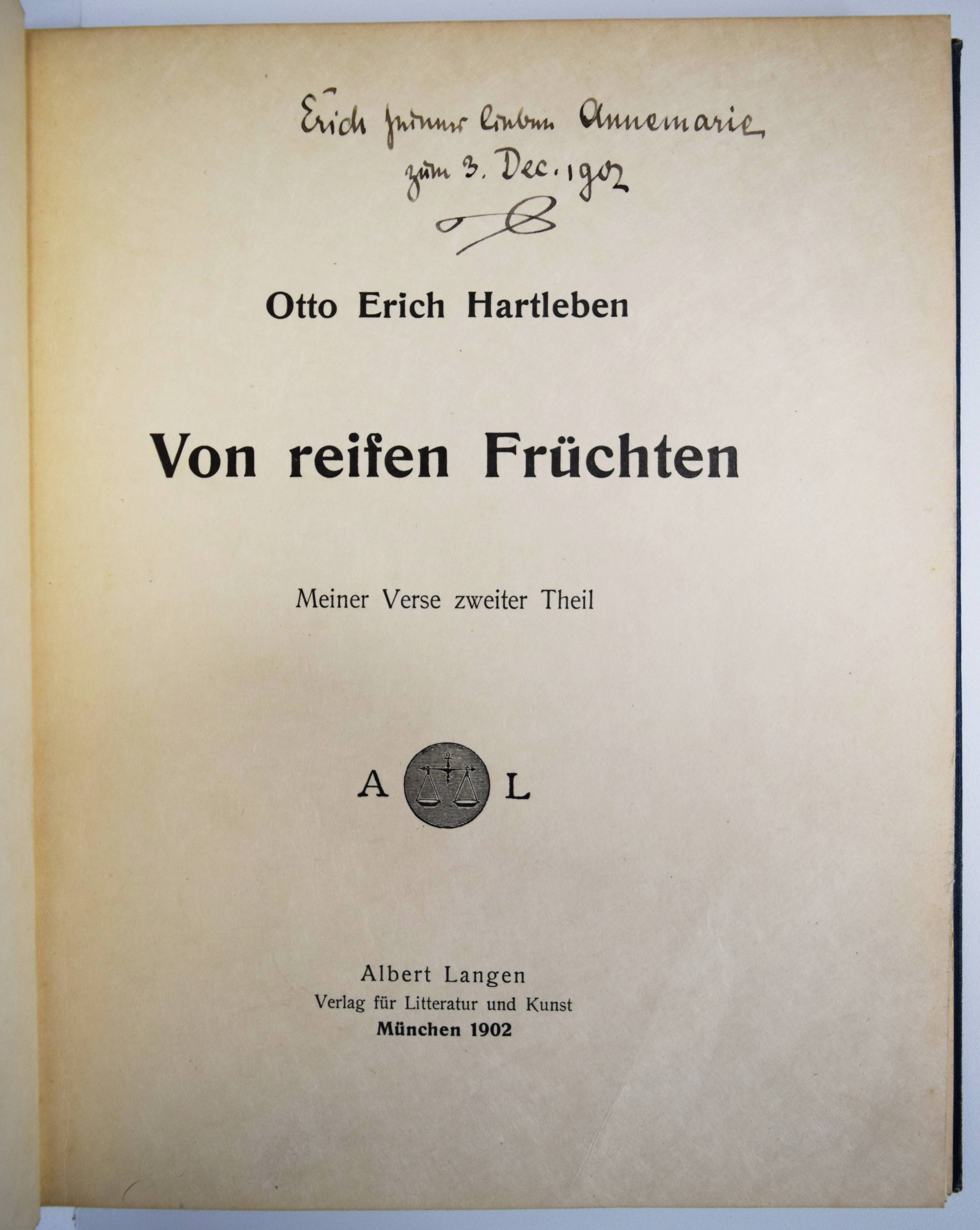 Hartleben, Otto Erich. Von reifen Früchten. Meiner Verse zweiter Theil. München, Albert Langen 1902. Gr.-8°. 49, (1) S. Orig.-Leinenband mit goldgepr. Deckeltitel und Deckelillustration (Entwurf: Emil Orlik). NDB VII, 720 f. W.-G.² 22. – Erste Ausgabe. – Nummer 6 von 30 (?) vom Verfasser nummerierten Exemplaren der Vorzugsausgabe auf Japan-Papier; mit eigenhändiger Widmung von O. E. Hartleben für seine Schwester, die Malerin Annemarie Pallat (1875-1972) mit deren Jugendstil-Exlibris (von Franz Hein). Die Sammlung mit 30 Gedichten enthält auf S. 48 das im Juli 1901 in Rom entstandene Gedicht „Annemarie“. – Die Gedichte entstanden von 1895 bis 1902 in Berlin, Bozen, Florenz, Kaltenleutgeben, Rom und in Salò am Gardasee in Hartlebens Villa Halkyone. – Sehr gut erhalten.