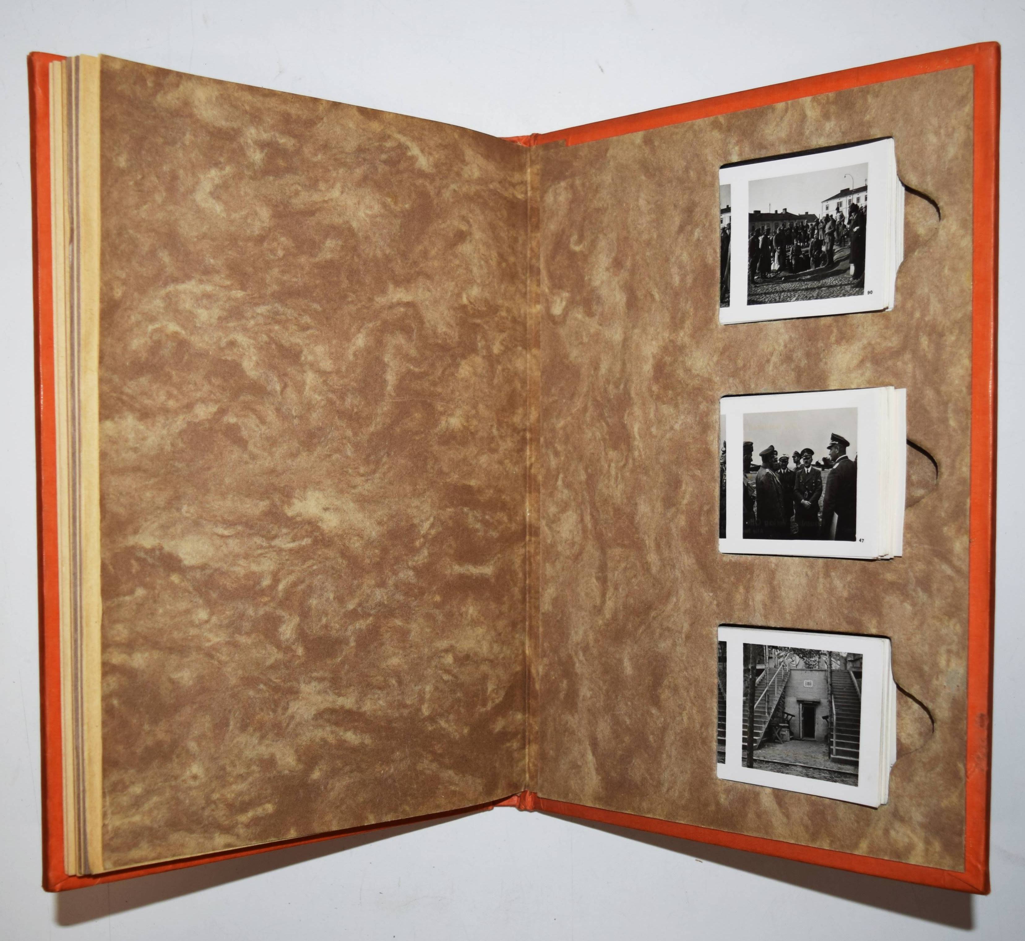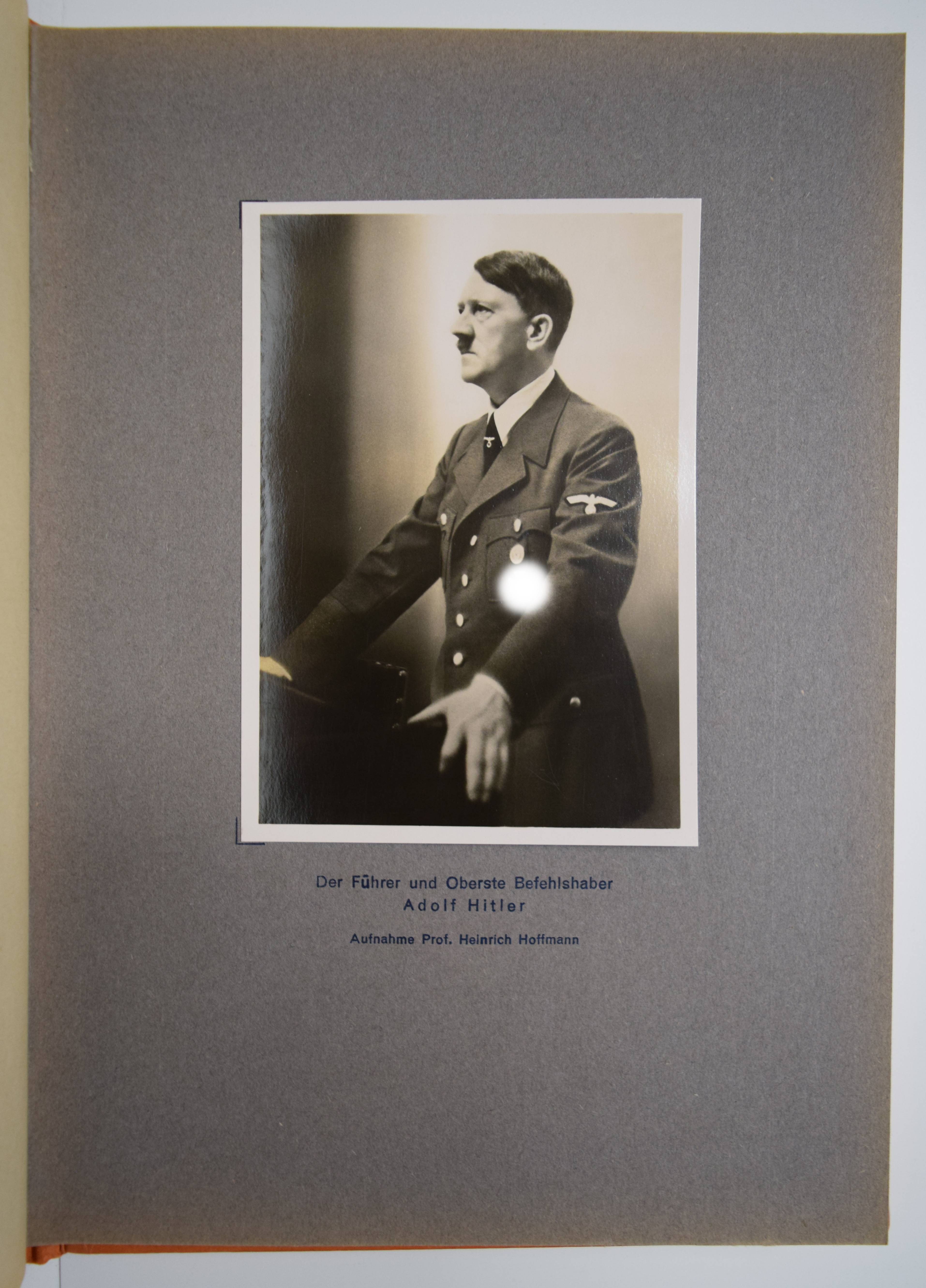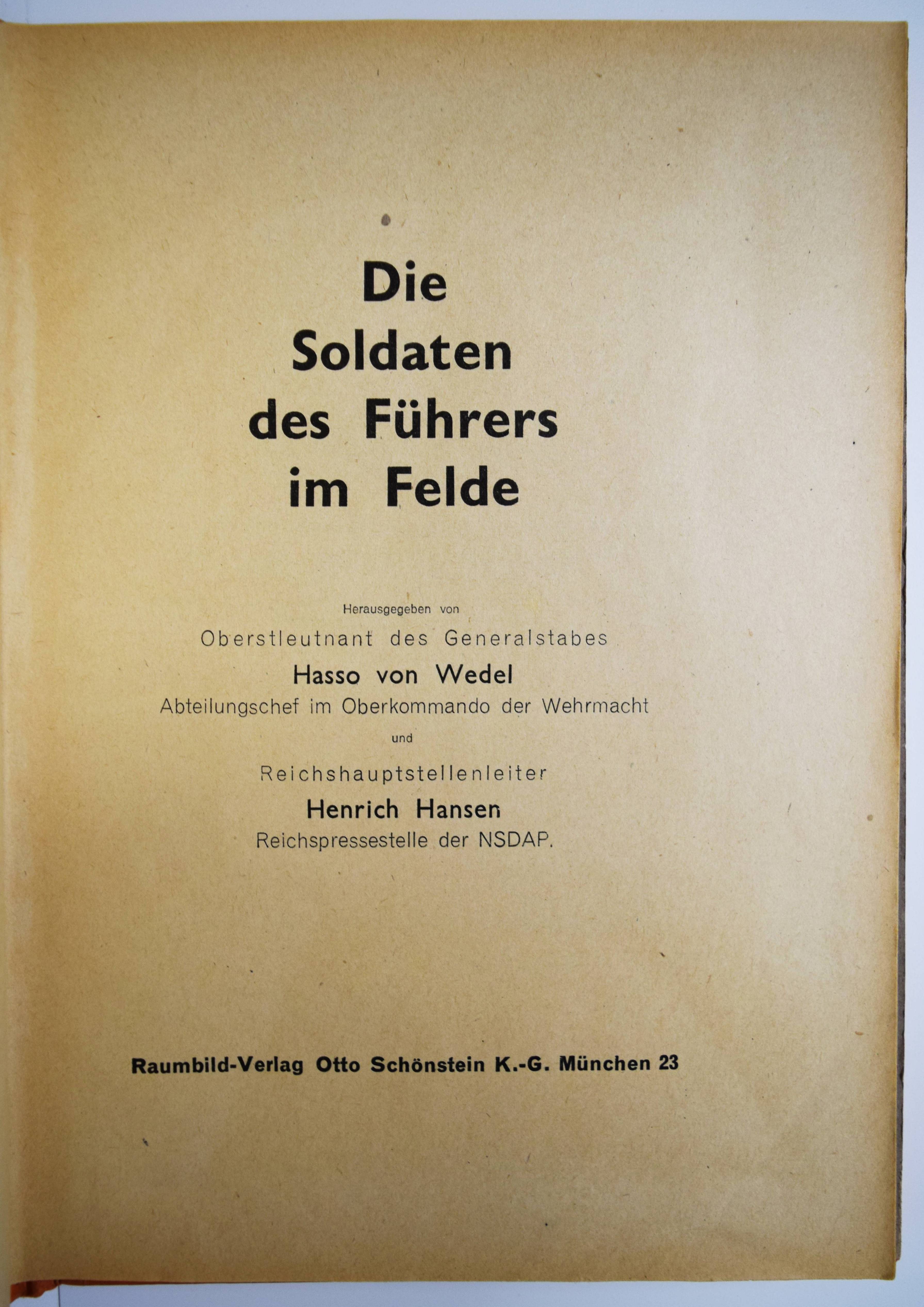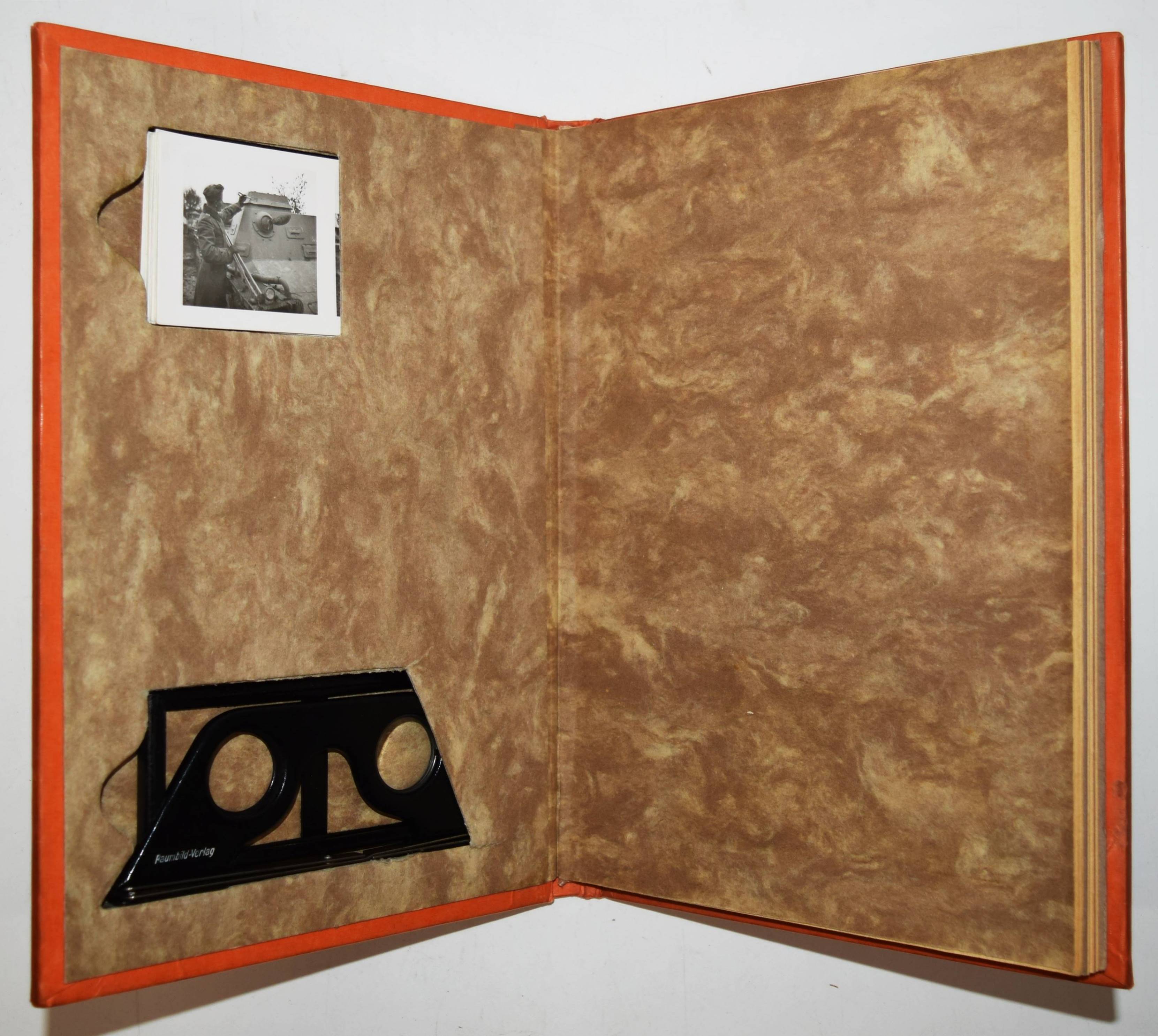 Stereo-Photographie – Wedel, Hasso v. und Henrich Hansen. Die Soldaten des Führers im Felde. München, Raumbild-Verlag Otto Schönstein (1940). 4°. 61 S., [1] Bl. mit 7 montierten Tafeln, 100 Stereo-Photographien von Heinrich Hoffmann, aufklappbarer Stereobetrachter aus Metall u. 1 Bl. (Anleitung). Orangefarbiger Orig-Leinenband über Holzdeckeln. Heiting/Jaeger I, 467 (mit Abb.). – Erste Ausgabe. – Einband leicht fingerfleckig, gutes Exemplar.