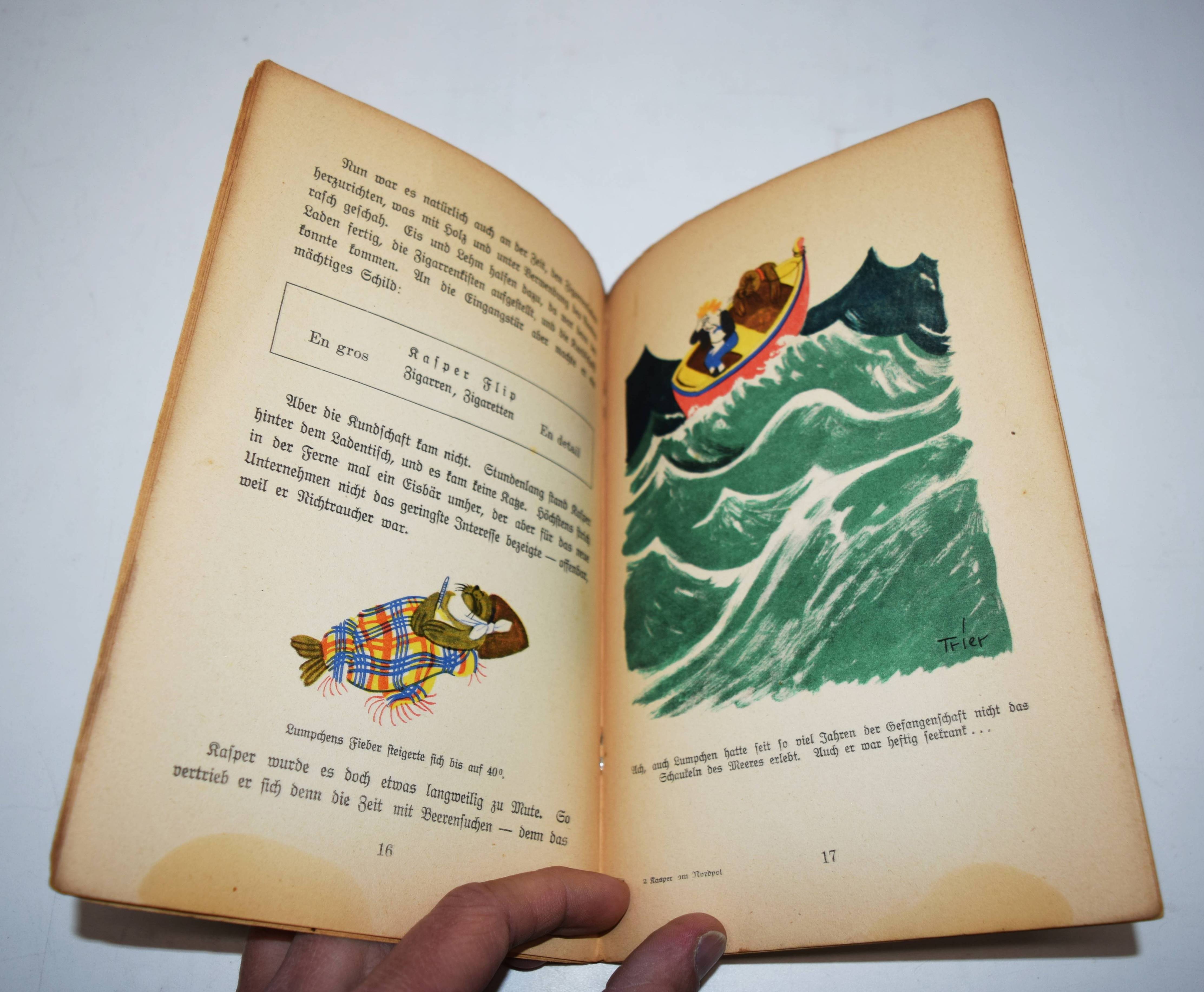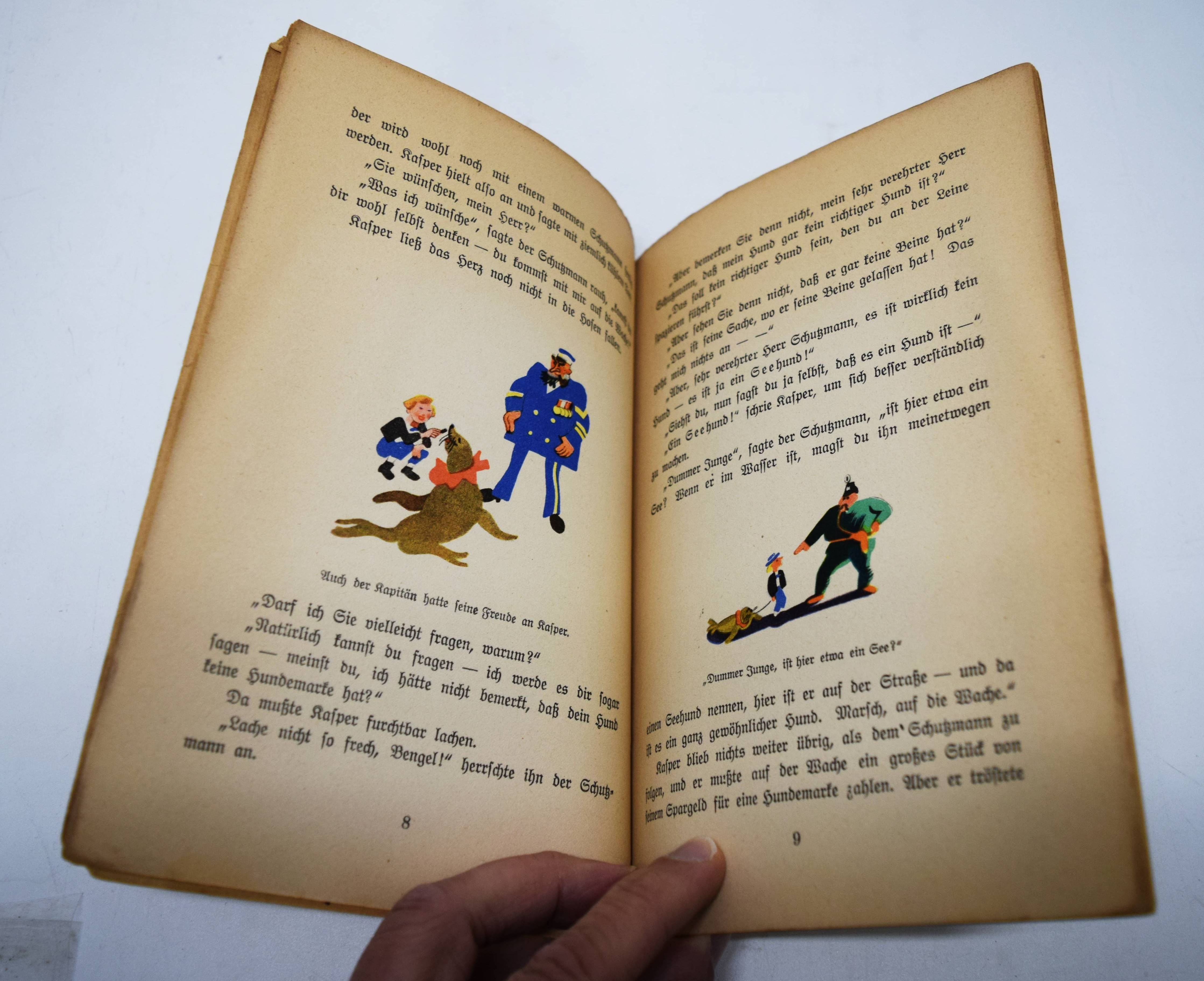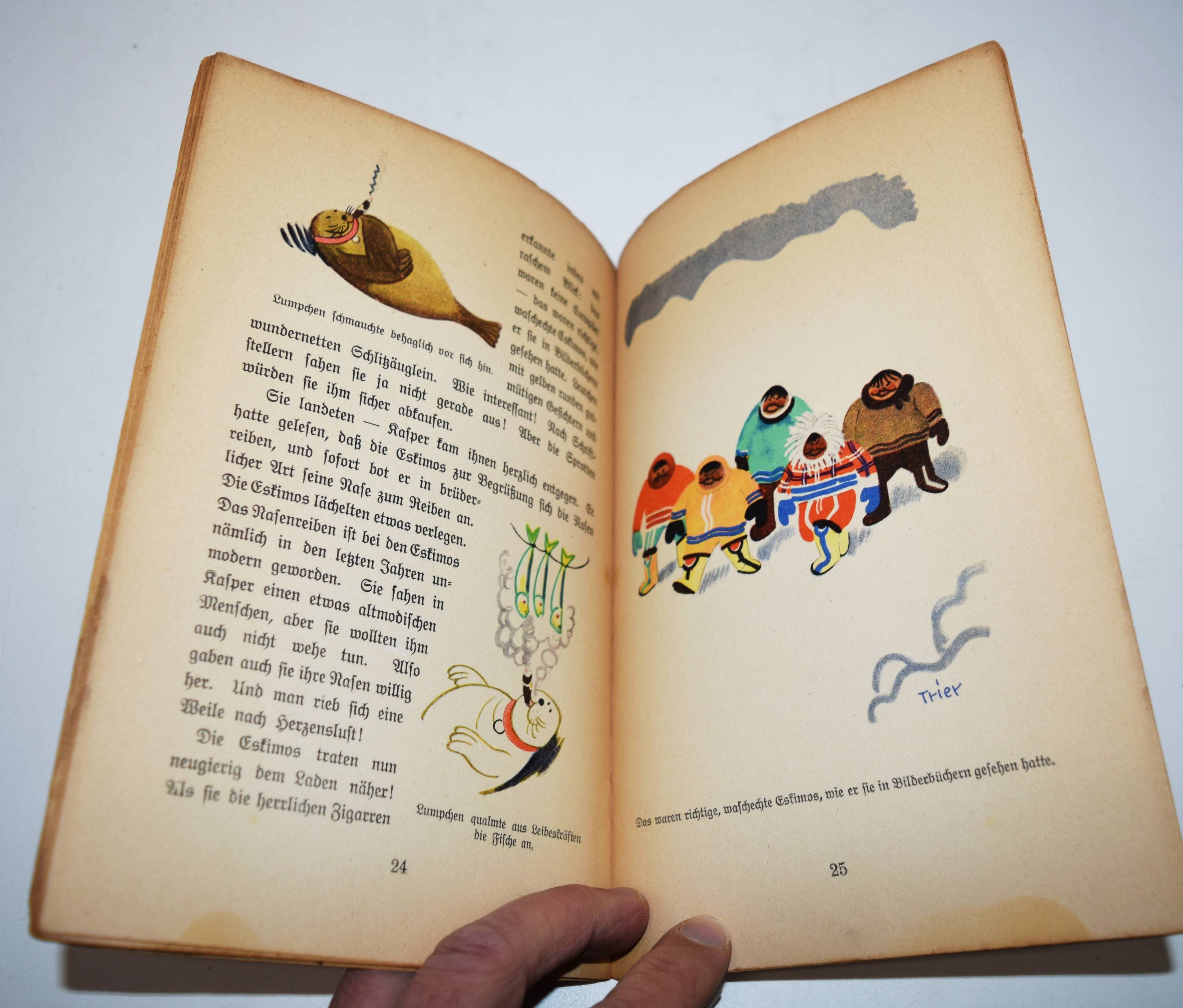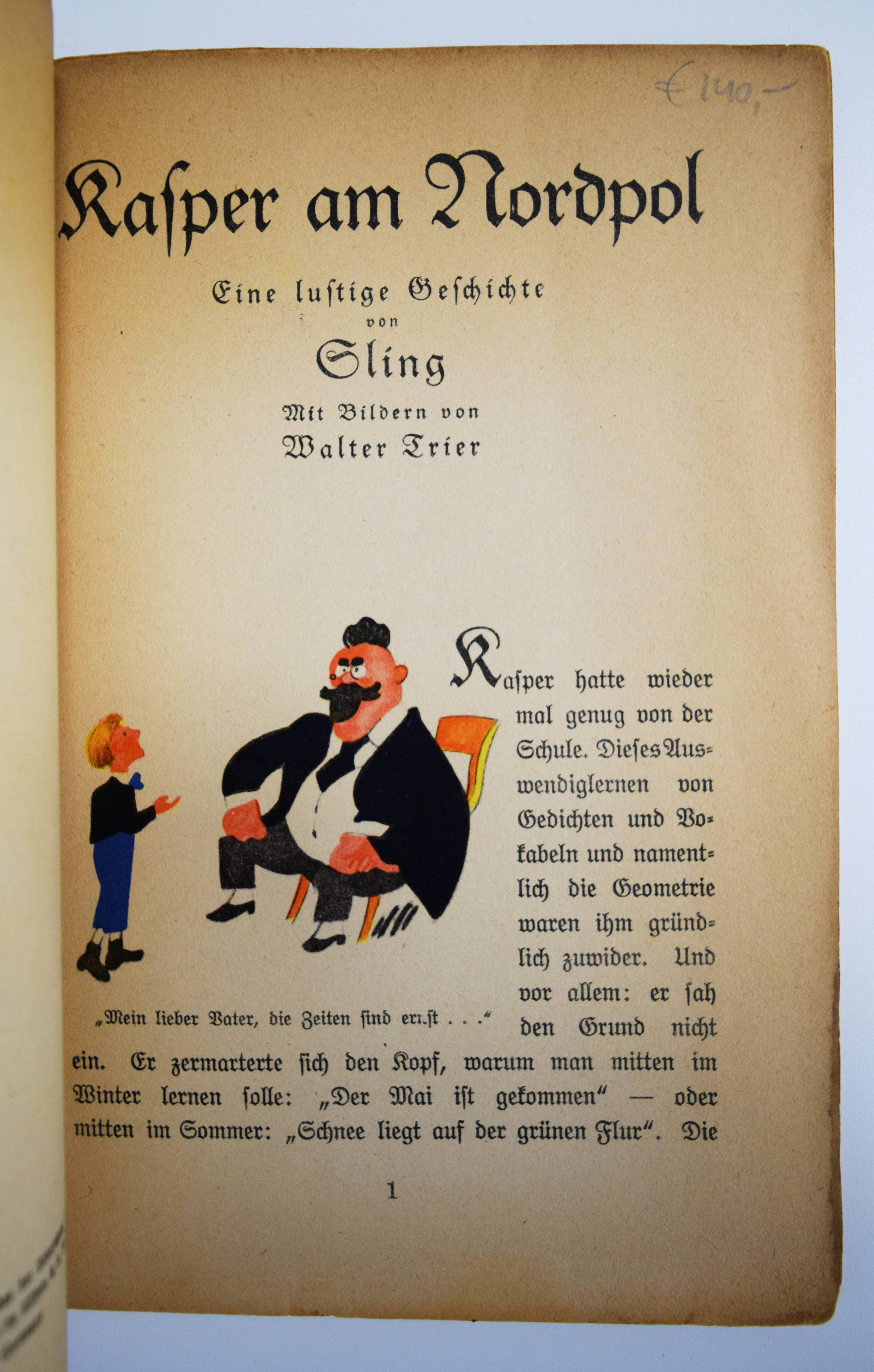 Sling (d. i. Paul Schlesinger). Kasper am Nordpol. Eine lustige Geschichte mit Bildern von Walter Trier. Berlin, Verlag Ullstein 1923. 8°. 31, (1) S. mit 18 farb. (1 ganzs.) Illustrationen. Farbig illustr. Orig.-Kartonumschlag. (Die Kasper-Bücher, 1. Band). Hatry 104. Klotz 6866/1. LKJ III, 562. – Erste Ausgabe, selten. – Insgesamt sind im selben Jahr vier „Kasper-Bücher“ von Paul Schlesinger (1878-1928) mit Bildern von Trier erschienen. – Umschlkag teils stärker angestaubt und fleckig, papierbedingt wie immer gebräunt, sonst gut erhalten.