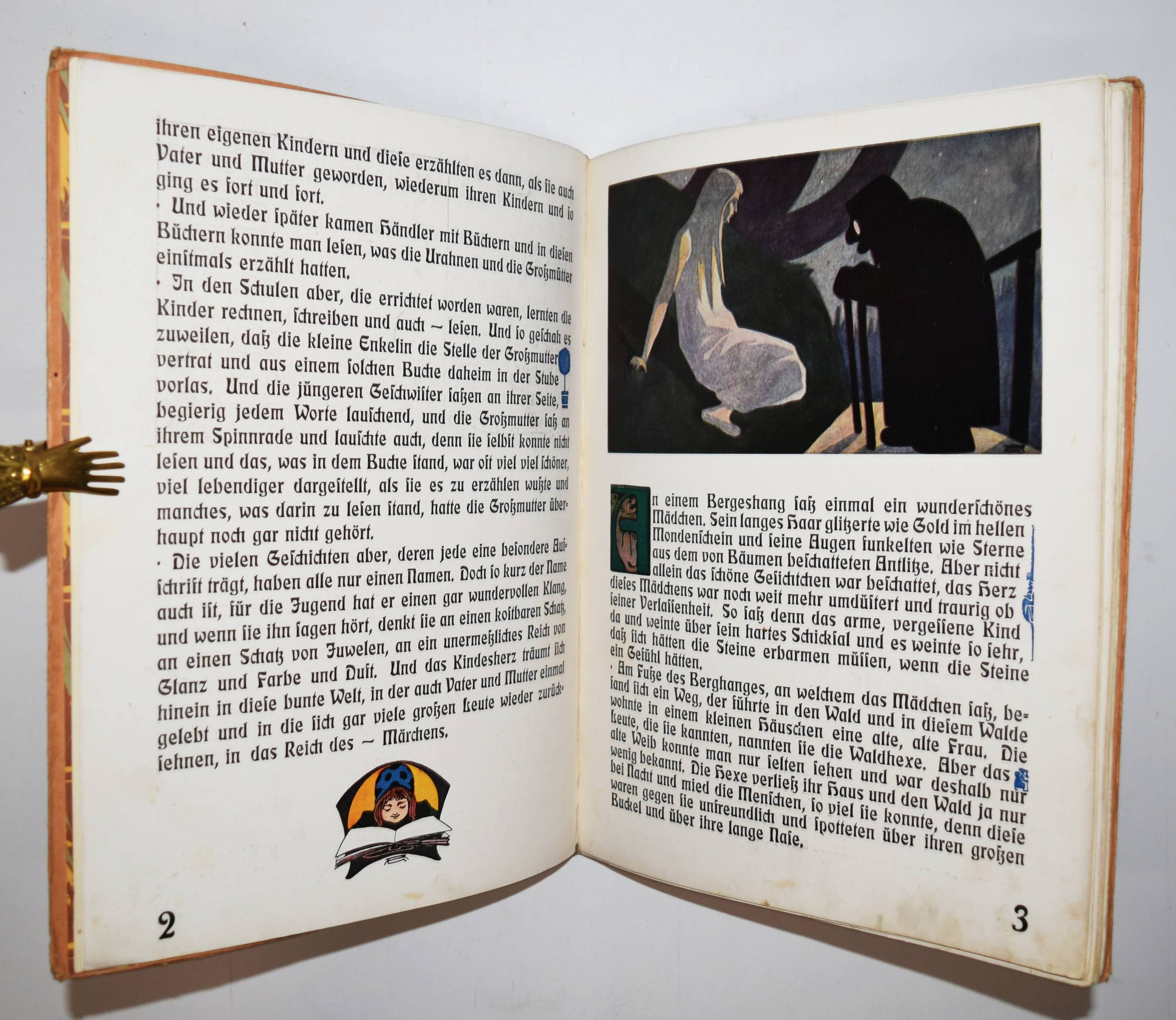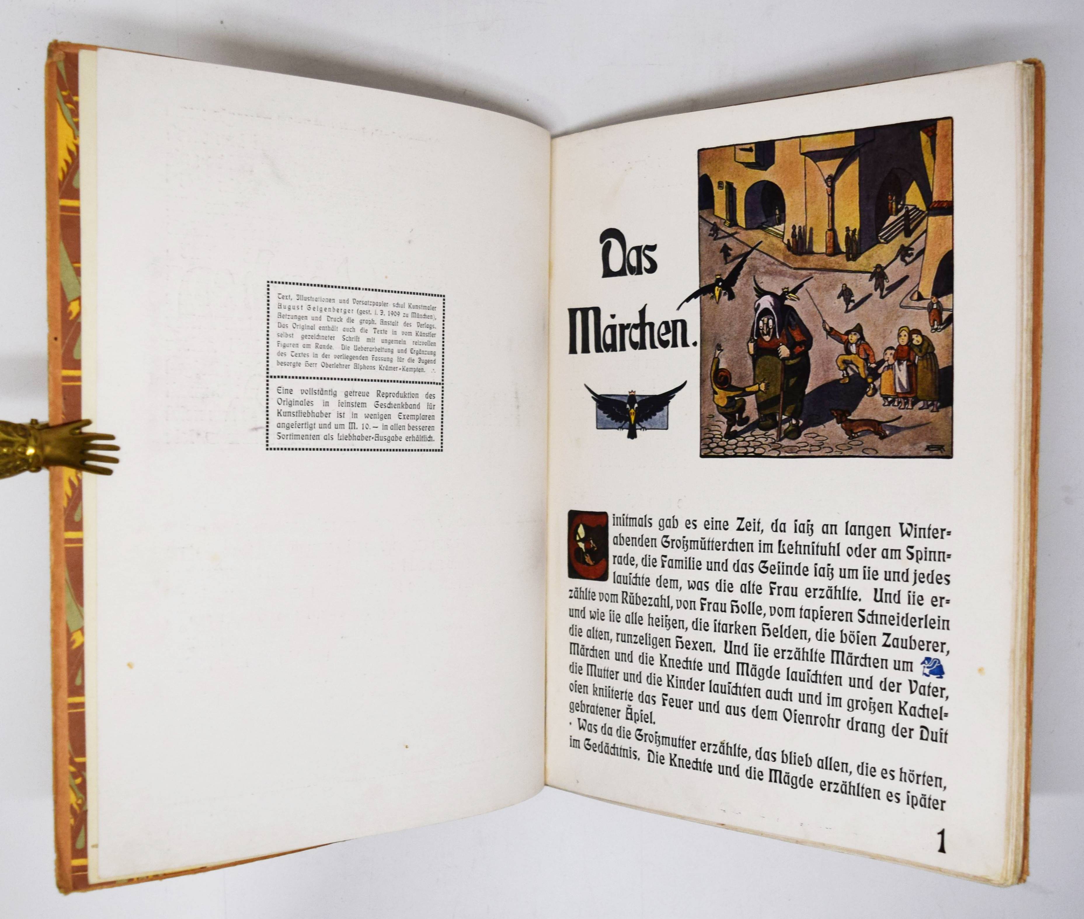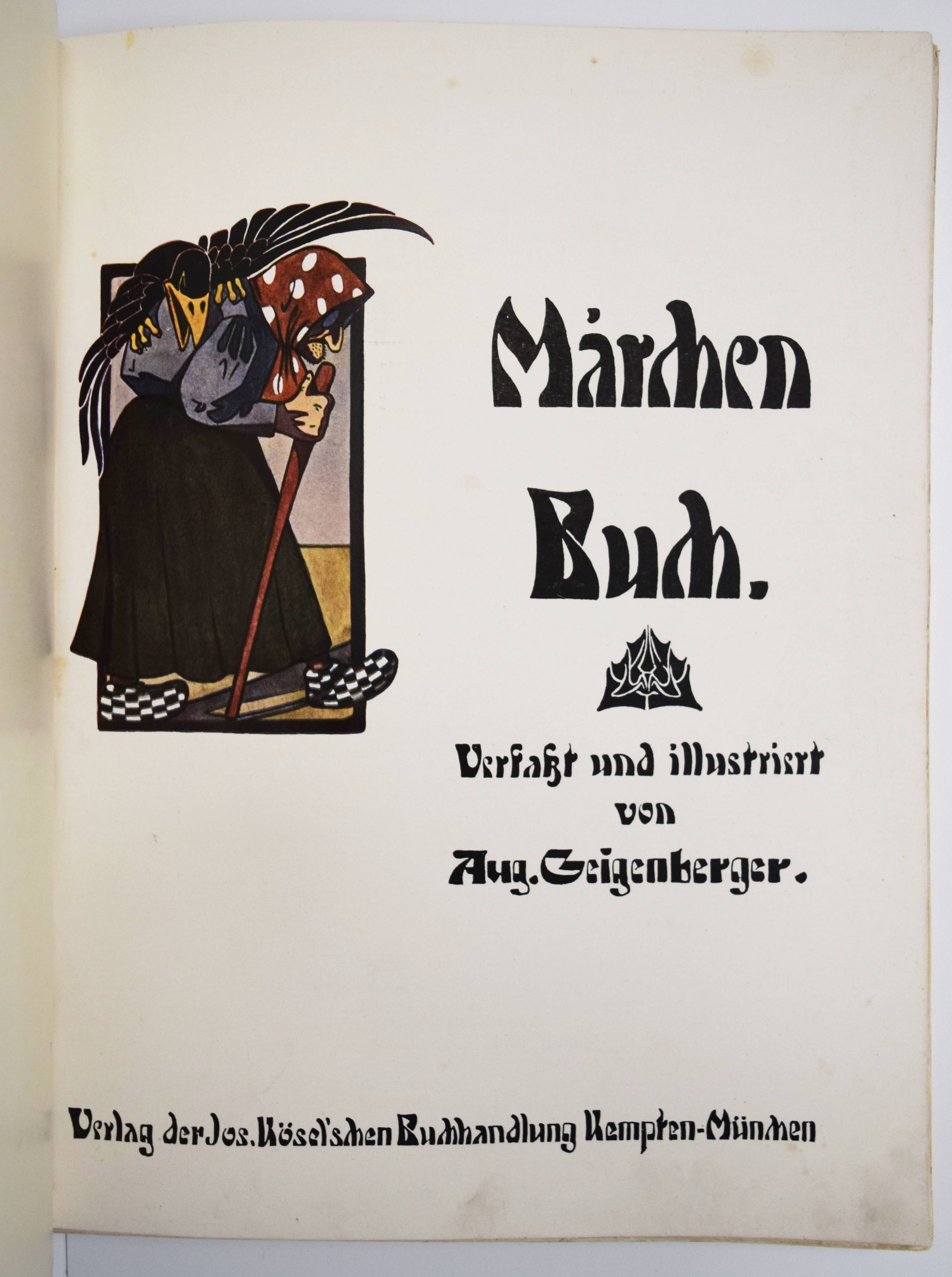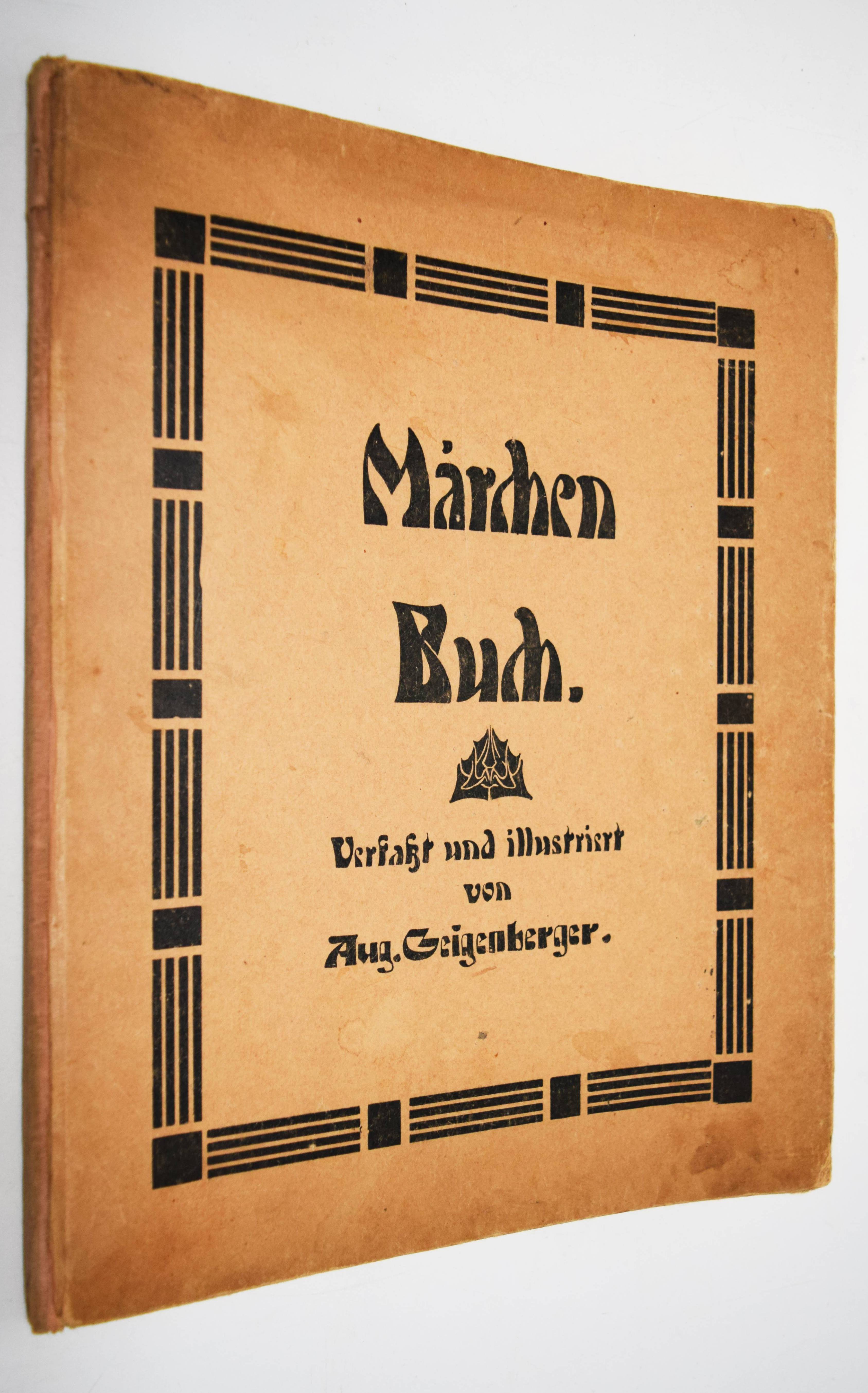 Geigenberger, Aug(ust). Märchen-Buch. (Die Ueberarbeitung und Ergänzung des Textes in der vorliegenden Fassung für die Jugend besorgte Alphons Krämer-Kempten). Kempten, München, Jos(eph) Kösel o. J. (1910). Gr.-4° (32 x 24,5 cm.). 35 S. mit farbigen Illustrationen und Buchschmuck von A. Geigenberger. Typogr. Orig.-Pappband. Bilderwelt 528. Ries 546, 2. Stuck Villa I, 357 und II, 192. – Erste und einzige Ausgabe des hervorragend typographisch gestalteten Jugendstil-Bilderbuchs. – „Trotz vorzüglicher neuer Schriftentwürfe blieb es für den illustrierenden Künstler um 1900 ein Anliegen, der Verwandtschaft von Bild und Text durch eine individuelle und flexible handschriftliche Gestaltung anstelle der Drucktype Rechnung zu tragen. August Geigenberger (1875-1909) belebt bei desem Verfahren die Ränder mit zeilenfüllenden Grotesken“ (Hans Ries in Bilderwelt). – Einband angestaubt und leicht fleckig, Rücken unauffällig restauriert, im Blattrand teils etwas fingerfleckig, sonst gut erhalten.