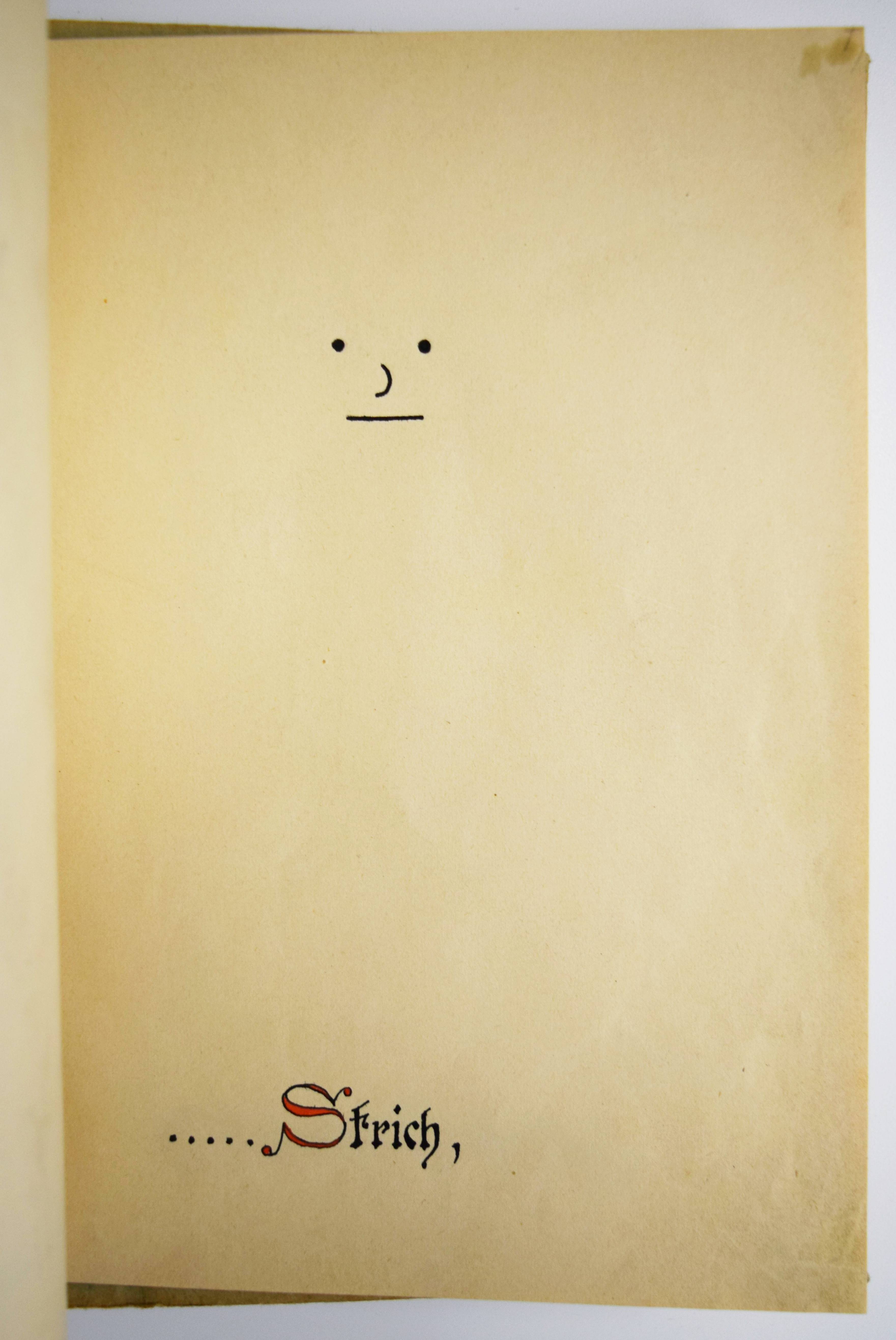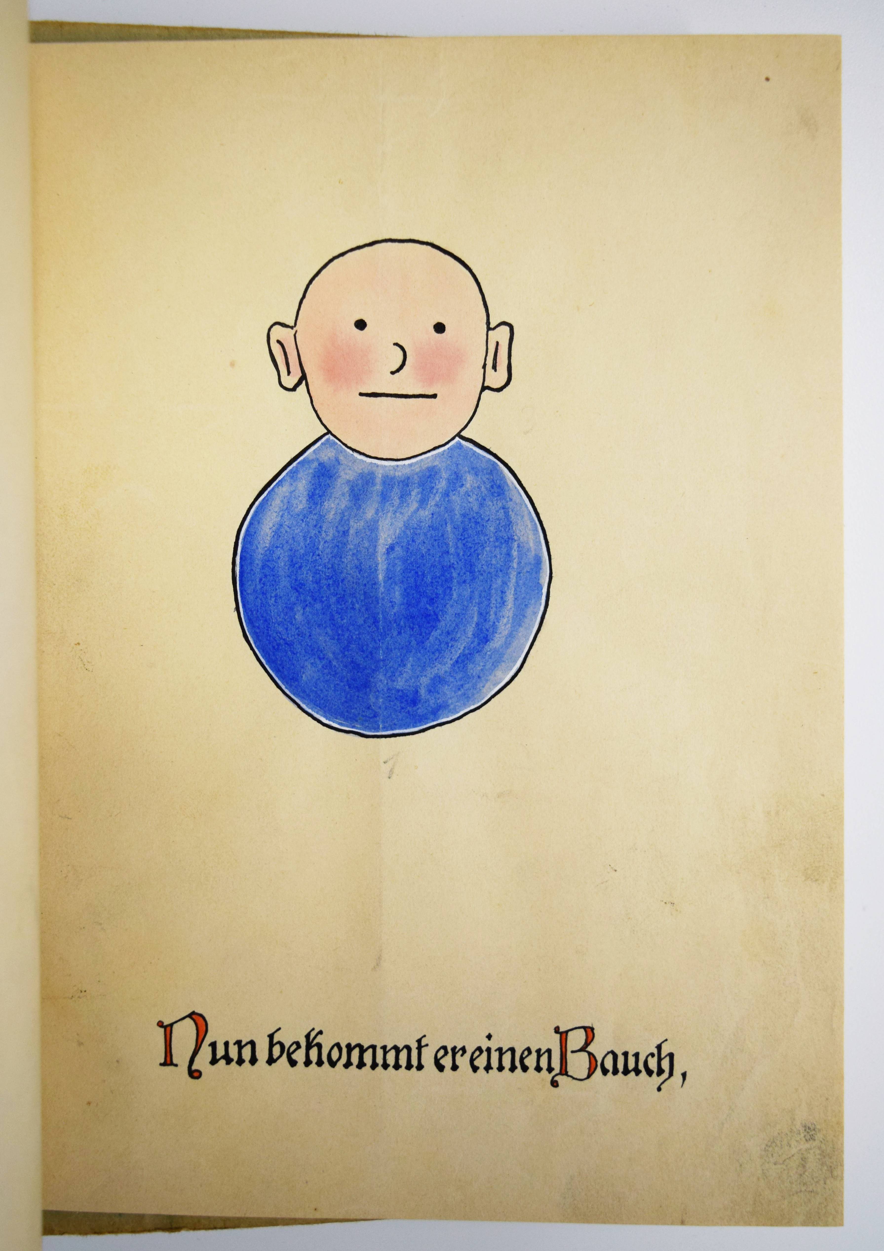 (Solms-Hohensolms-Lich), E(mma Fürstin zu). Wie Pumpelmann entstanden ist. Deutsche Handschrift auf Papier. (Lich) 11. Juni 1927. Gr.-8° (22 x 17,5 cm.). [18] Bl. mit eigenhändiger Widmung und 16 (12 aquarellierte) Tuschezeichnungen mit kalligraphischen Versen in Rot und Schwarz. Orig.-Pappband mit farbigem Deckelschild. Originalmanuskript zu dem im selben Jahr bei Kindt in Giessen gedruckten Bilderbuch (Exemplar liegt bei). – Mit der Widmung auf dem Vorsatz „Für meinen lieben Enkel Philipp zu seinem dreijährigen Geburtstag am IIten Juli 1927 von seiner Großmama „E.“ – „Angeregt durch mancherlei Beschäftigung mit meinem dreijährigen Enkel, kam ich auf den Gedanken, den bekannten Kinderreim: „Punkt, Punkt, Komma, Strich, Fertig ist der Pampelmann“, weiter auszubauen und aus dem ersten Punkt einen ganzen „Pampelmann“ entstehen zu lassen. Die Zahl meiner Enkel hat sich seitdem beträchtlich vermehrt und alle Haben viel Spaß daran, das so entstandene Buch „Pumpelmann“ anzusehen und, während sie die unter der Zeichnung stehenden Worte hersagen, auch die betreffenden Striche dazu zu machen. Groß ist das Vergnügen, wenn dann am Schluß des Buches ein selber hergestellter Pumpelmann entstanden ist. Um auch anderen Kindern diese lustige Beschäftigung zu verschaffen, will ich das Buch nun in die Welt hinausschicken“ (E. zu Solms-Hohensolms-Lich im Vorwort zur gedruckten Ausgabe). – Emma Fürstin zu Solms-Hohensolms-Lich, Prinzessin zu Stolberg-Wernigerode (1875-1956) war die Gattin von Carl Fürst zu Solms-Hohensolms-Lich (1866-1920) und die Tochter von Otto zu Stolberg-Wernigerode (1837-1896), der Vizekanzler unter Otto von Bismarck war. – Rücken der gedruckten Ausgabe am Fuß mit kl. Fehlstelle, sonst beide Bände von Gebrauchs- und Altersspuren abgesehen gut erhalten.