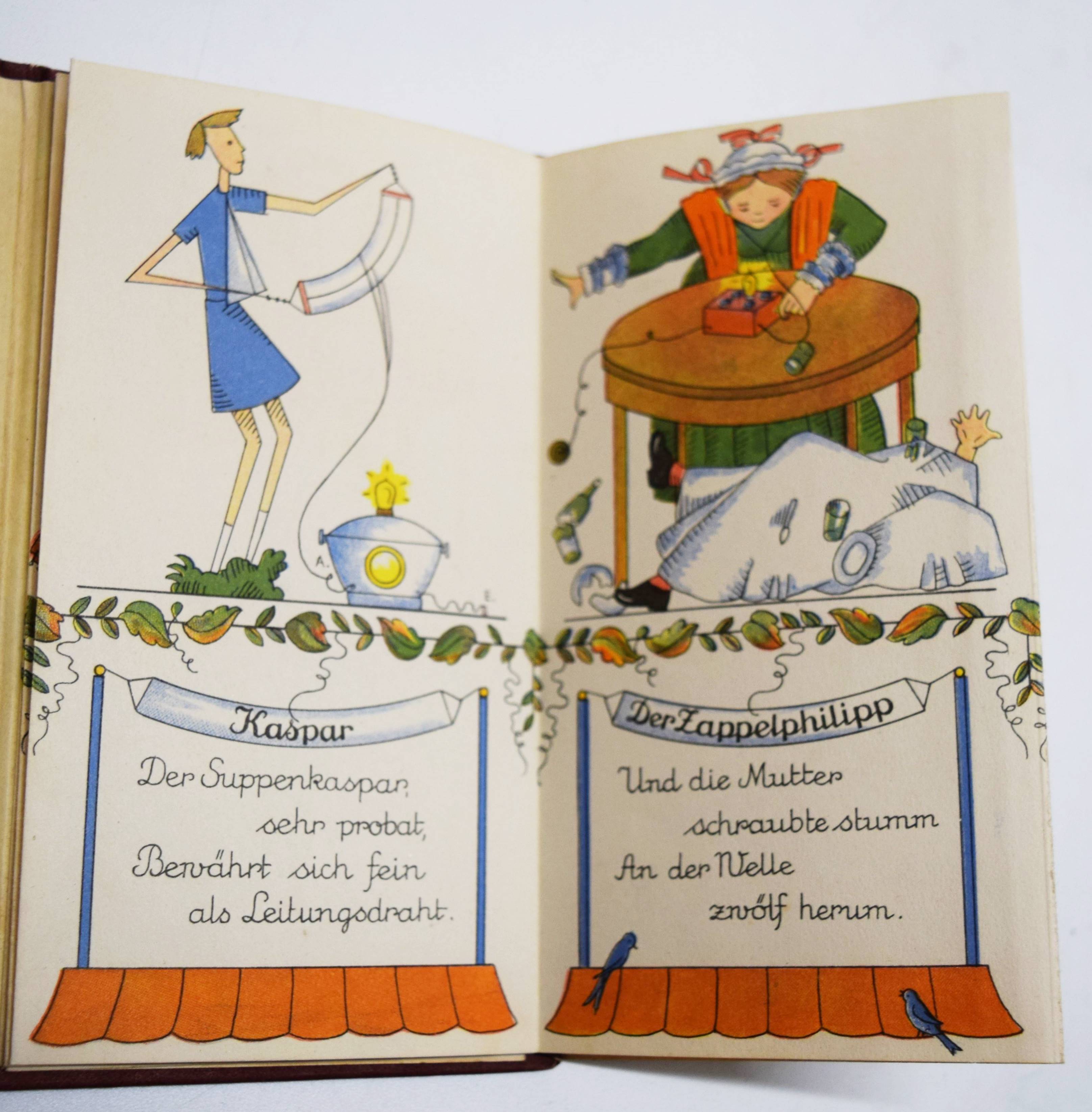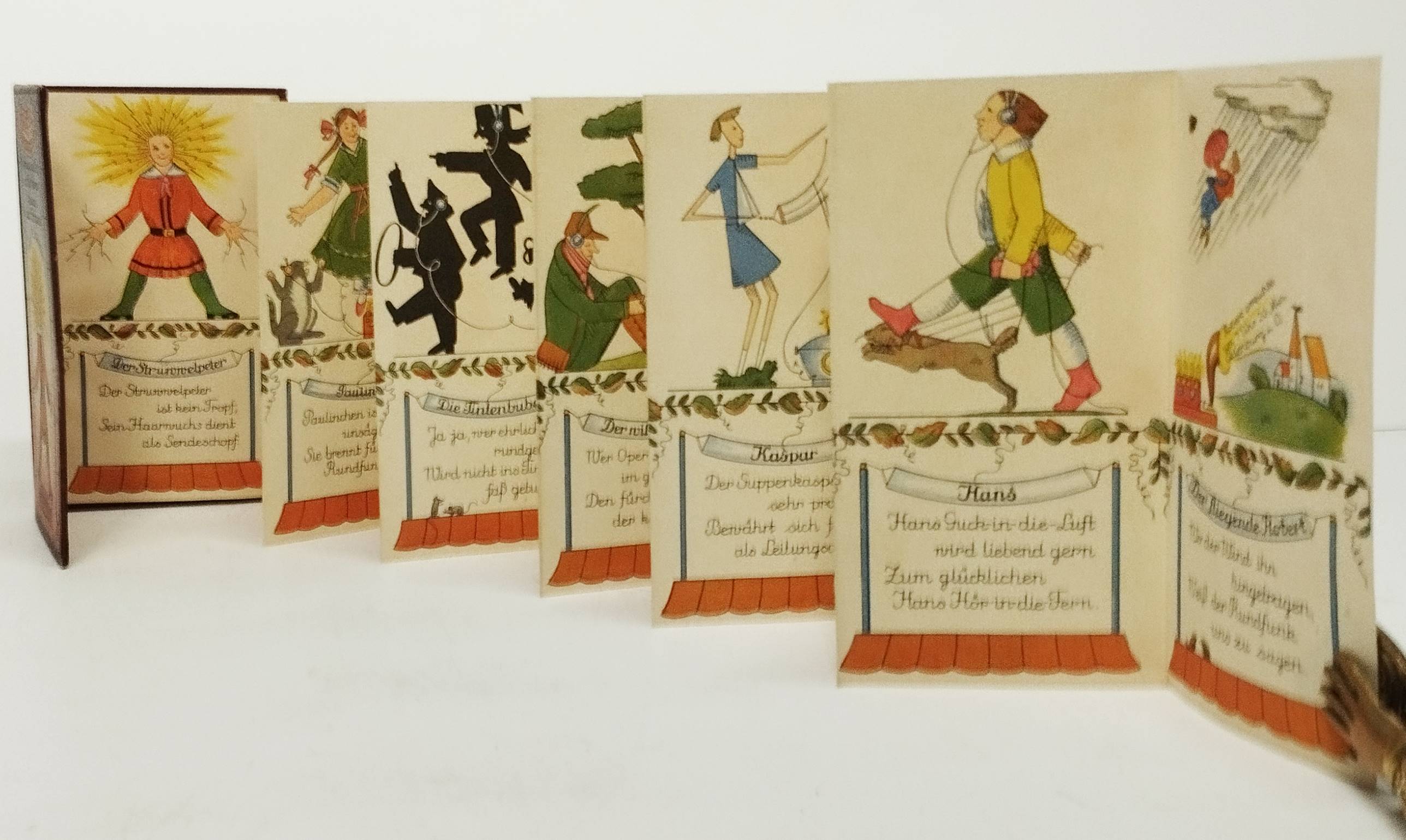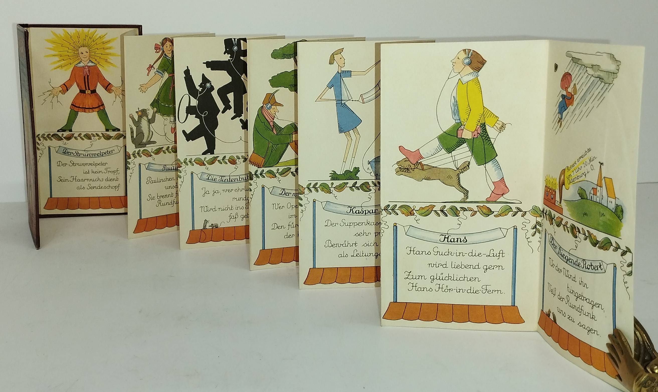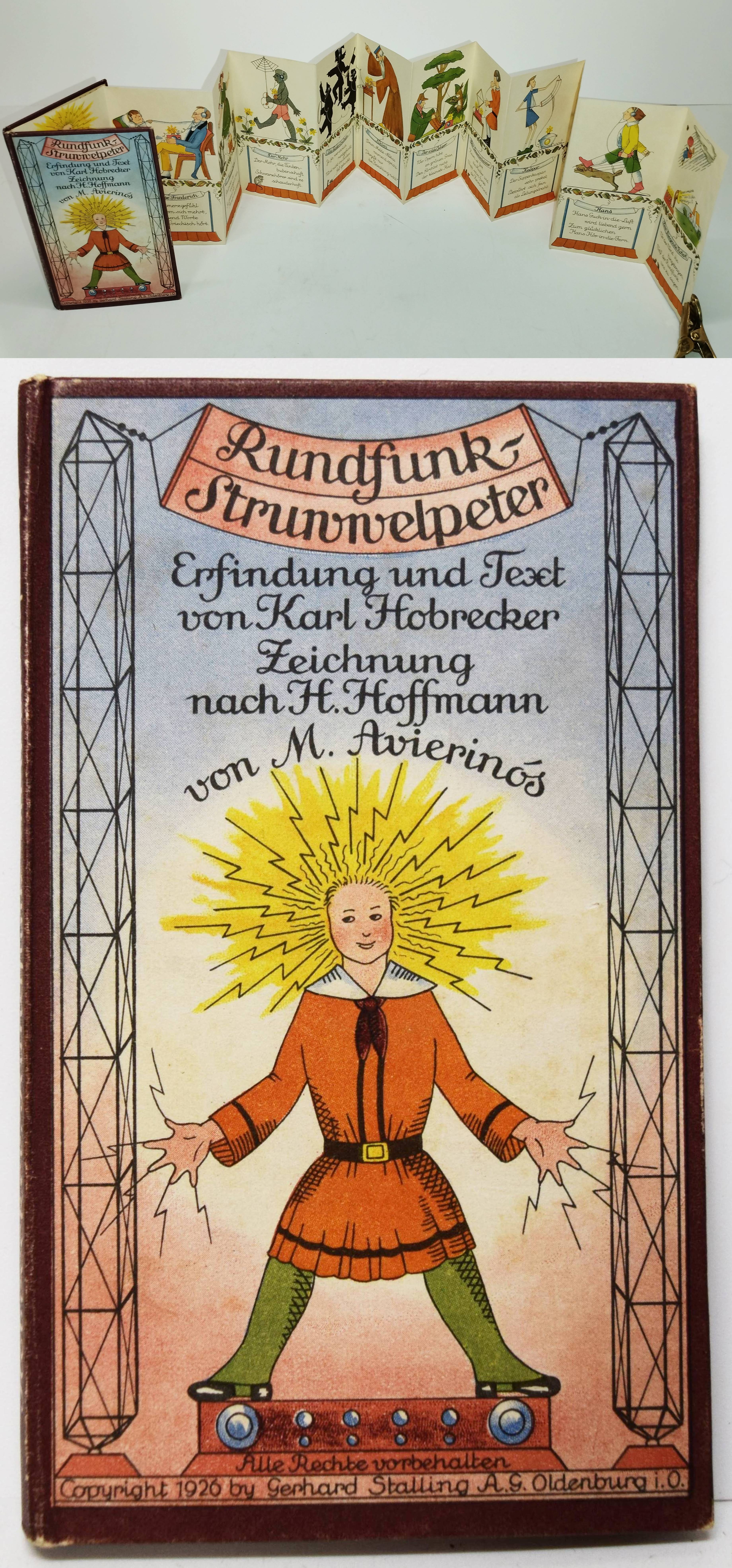 Struwwelpeteriade – Hobrecker, Karl (Max Stephan). Rundfunk-Struwwelpeter. Erfindung und Text von Karl Hobrecker. Zeichnung nach H(einrich) Hoffmann von M(aria ?) Aveirinós. Oldenburg i. O., Gerhard Stalling 1926. Kl.-8° (15,5 x 9 cm.). Leporello, [12] einseitig bedruckte Bl. mit farbigen Illustrationen. Farbig illustr. Orig.-Pappband. (Nürnberger Bilderbücher, Band 48). Baumgartner III, 14. Evers, Von Struwwelhitler bis Punkerpeter 8 f. Hobrecker, Braunschweig 3375. Hobrecker, Frankfurt 126. Klotz 2716/23. Liebert, Stalling 48. Oldenburg/Künstler 204. Pressler S. 204 (Abb. 132). Rühle I, 1186. Stuck-Villa II, 216. – Sehr seltene Struwwelpeter-Parodie auf die damals aufkommende Rundfunktechnik. – Mit Bildern und vierzeiligen Versen: Der Struwwelpeter; Der böse Friederich; Paulinchen; Der Mohr; Die Tintenbuben; Niklas; Der wilde Jäger; Der Daumenlutscher; Kaspar; Der Zappelphilipp; Hans (Guck-in-die-Luft) und Der fliegende Robert. – „Bei Hobreckers Struwwelpeter-Bilderbuch handelt es sich um die Verstrickung der bekannten Hoffmannschen Figuren in die Errungenschaften der Rundfunktechnik. Dabei geht es dem Autor nicht um eine durchgängige Handlung, die Figuren dienen vielmehr als Aufhänger für die verschiedenen, voneinander unabhängigen Vierzeiler. Die Zeichnungen Avierinos nehmen die Hoffmannschen Originale zur Grundlage, um sie dann durch die Ausstattung mit rundfunk-technischen Gerätschaften zu verfremden. Dort, wo dem Original-Struwwelpeter aufs unbändigste Haare und Fingernägel sprießen, zucken beim Rundfunk-Struwwelpeter grelle Blitze. Hobreckers durchweg positive Darstellung des neuen Mediums gipfelt in ‚Drum Melde-Niklas / warnend spricht: / Vergeßt nur die Bezahlung nicht!‘ (und) ‚Ja, ja, wer ehrlich / rundfunkt, / Wird nicht ins Tintenfaß getunkt‘ (und) ‚Der Mohr, die Tinten- / bubenschaft / Schwarzhörer sind es schauderhaft‘.“ (Oldenburg-Künstler). 1924/1925 erschien ein Vorabdruck mit 9 Illustrationen in „Die Arche Noah“, Jugendbeilage der Zeitschrift „Daheim“ (vgl. Rühle II, 1186 c). – Sehr gutes Exemplar.