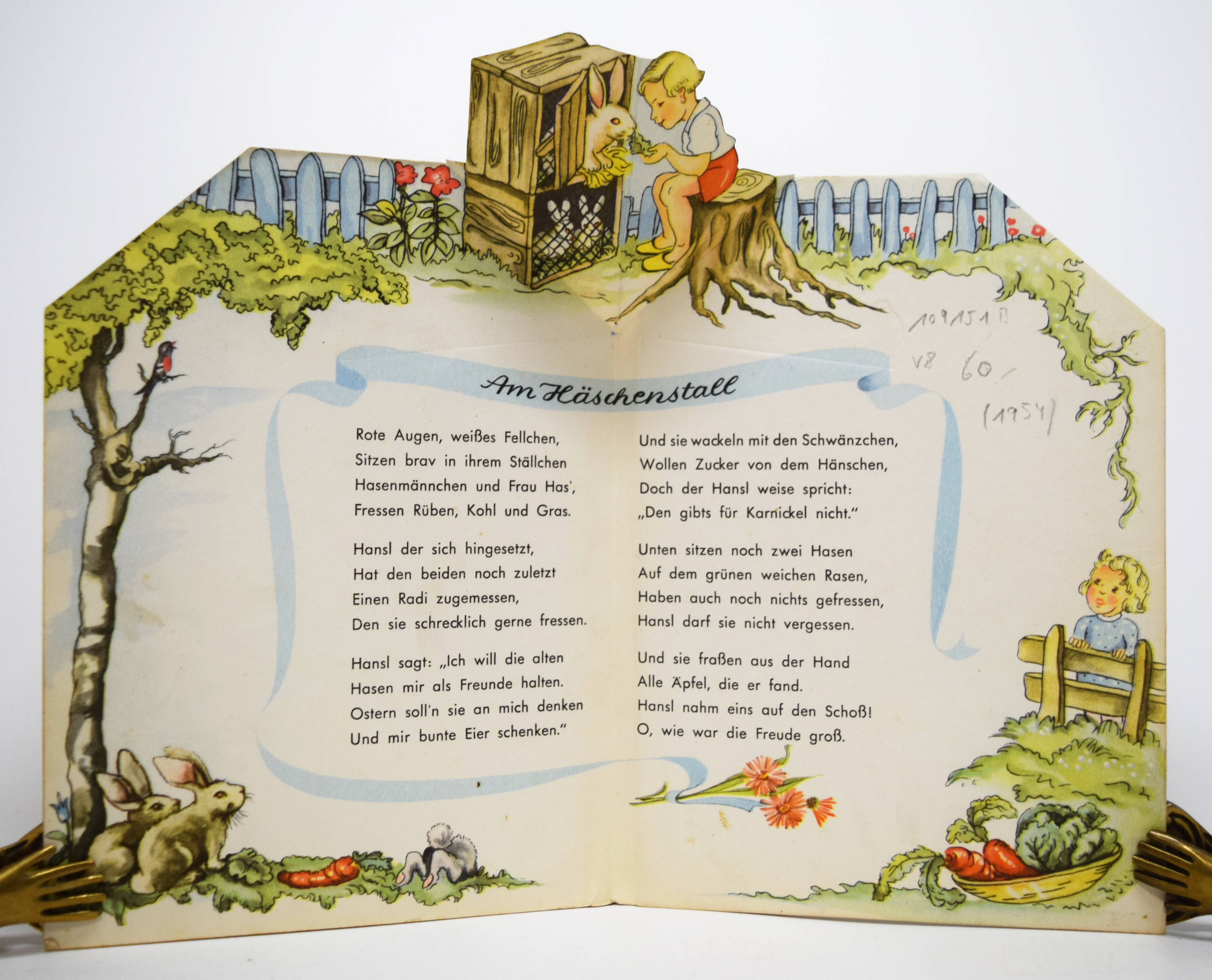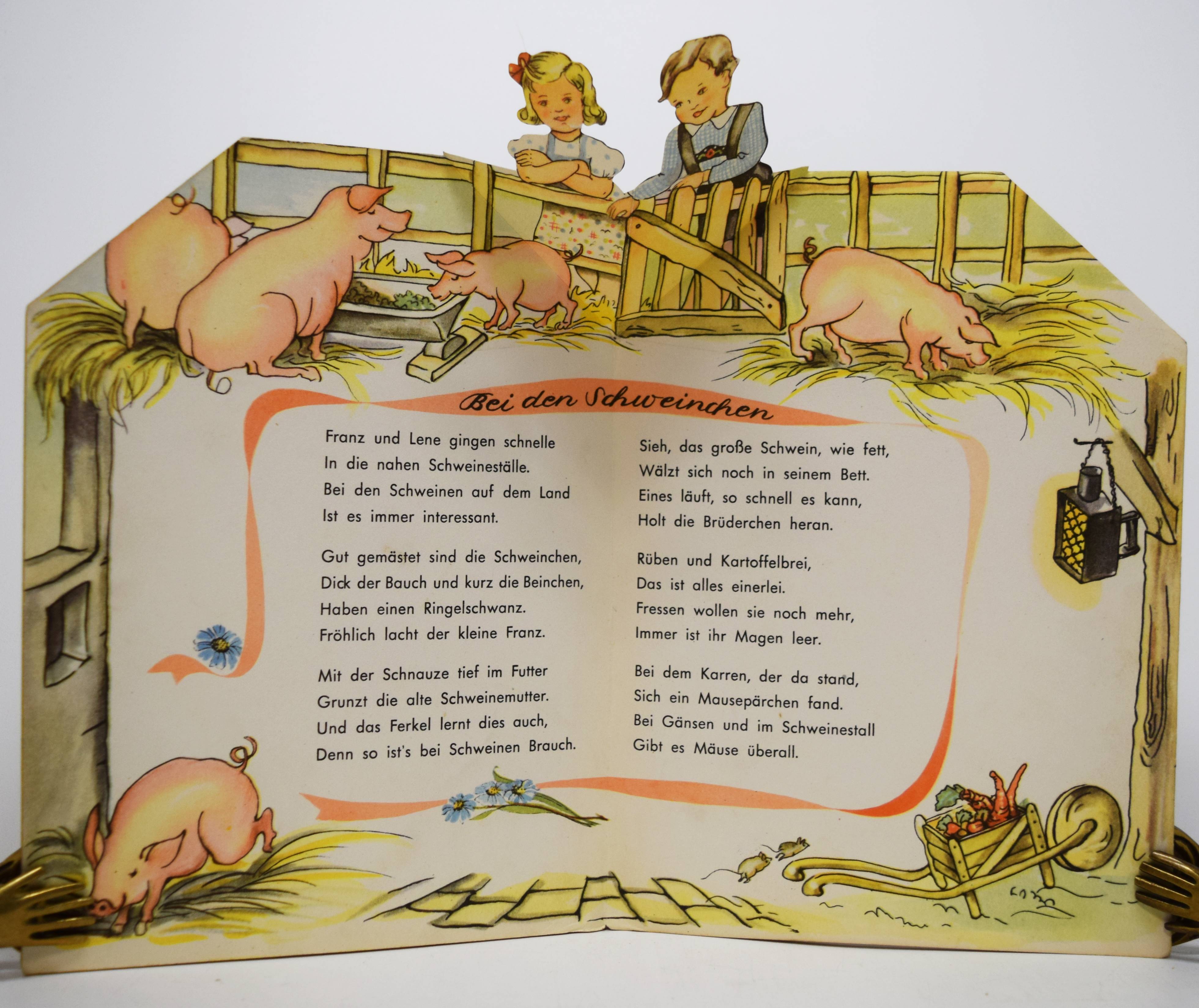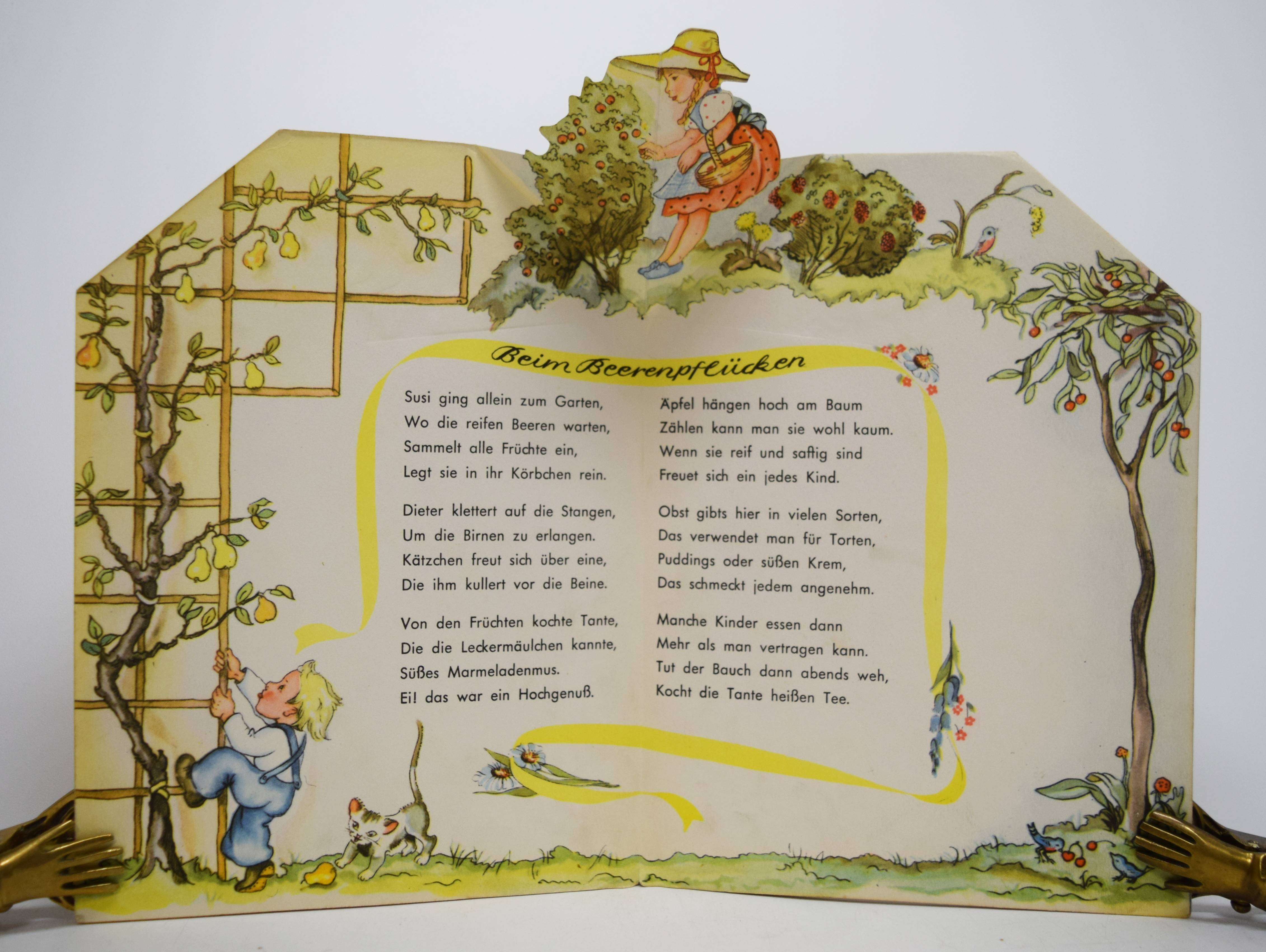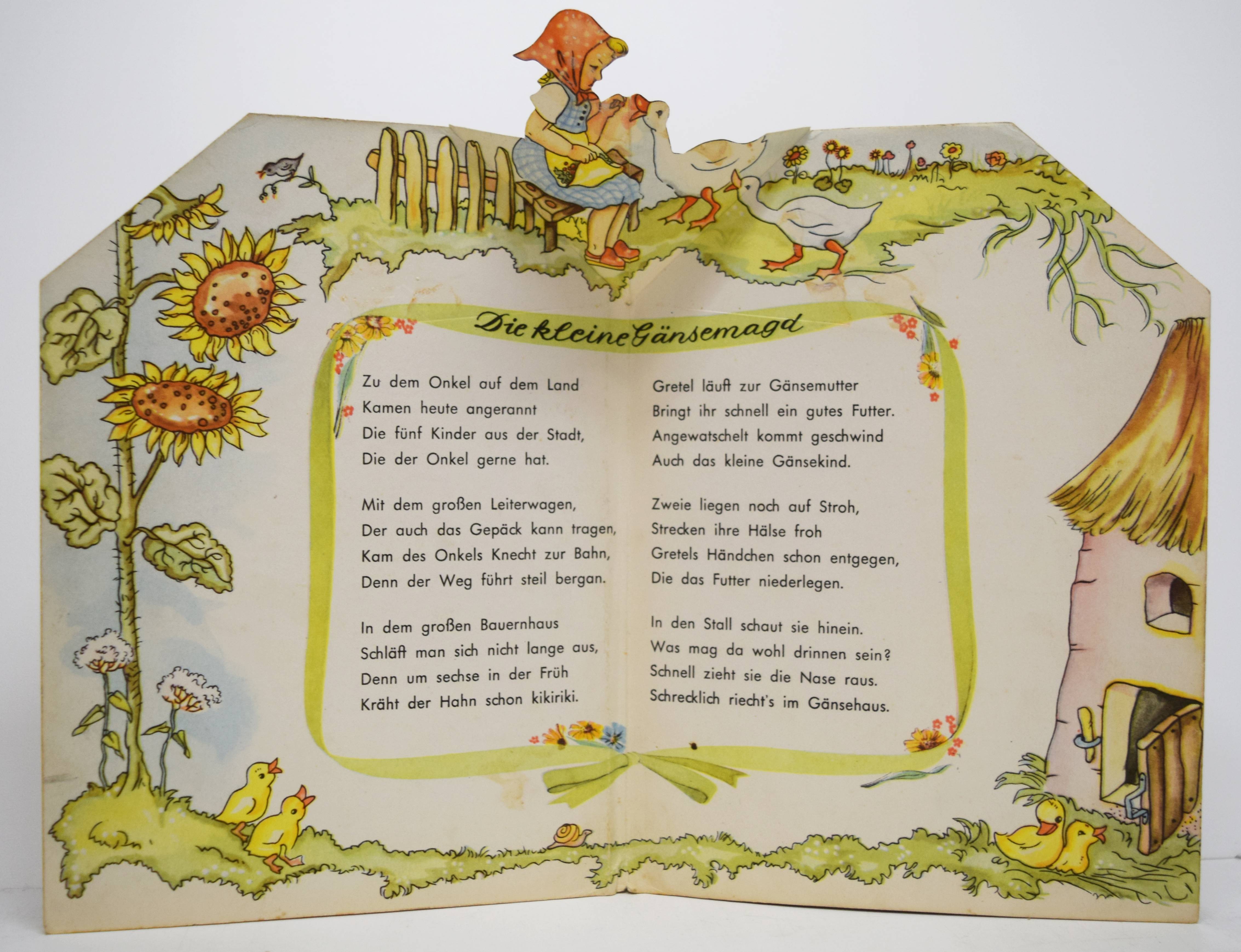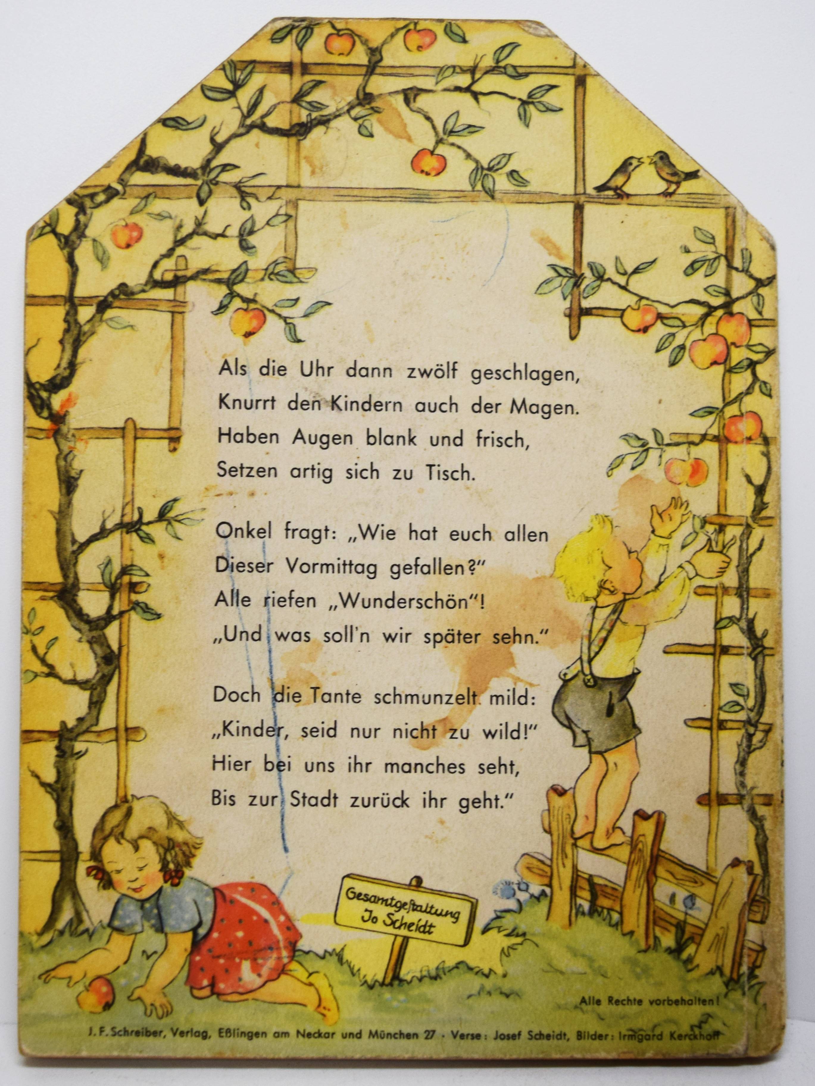 Scheidt, Josef. Ferien fern der Stadt. (Bilder von Irmgard Kerckhoff). Eßlingen a.N., München, F. J. Schreiber o. J. (1954). 8°. [8] S. mit farbigen Illustrationen und 4 Aufstell-Bildern. Farbig illustr. Orig.-Pappband (in Form eines Fachwerkhauses ausgestanzt). (Schreibers Stehauf-Bilderbuch, Verlags-Nr. 0167). Muck II, 1388. Nicht in Slg. Breitscheidt. – Erste und einzige Ausgabe des seltenen Spiel-Bilderbuchs. – I. Kerckhoff hat von 1935 bis 1955 einige Kinderbücher und Spiele sowie Adventskalender für verschiedene Verlage illustriert. Für die Reihe „Stehauf-Bilderbücher“ des Schreiber-Verlags illustrierte sie auch das Buch „Märchenland-Wunderland“ (1949). – Rücken leicht berieben, Deckel leicht braunfleckig, sonst sehr gut erhalten.