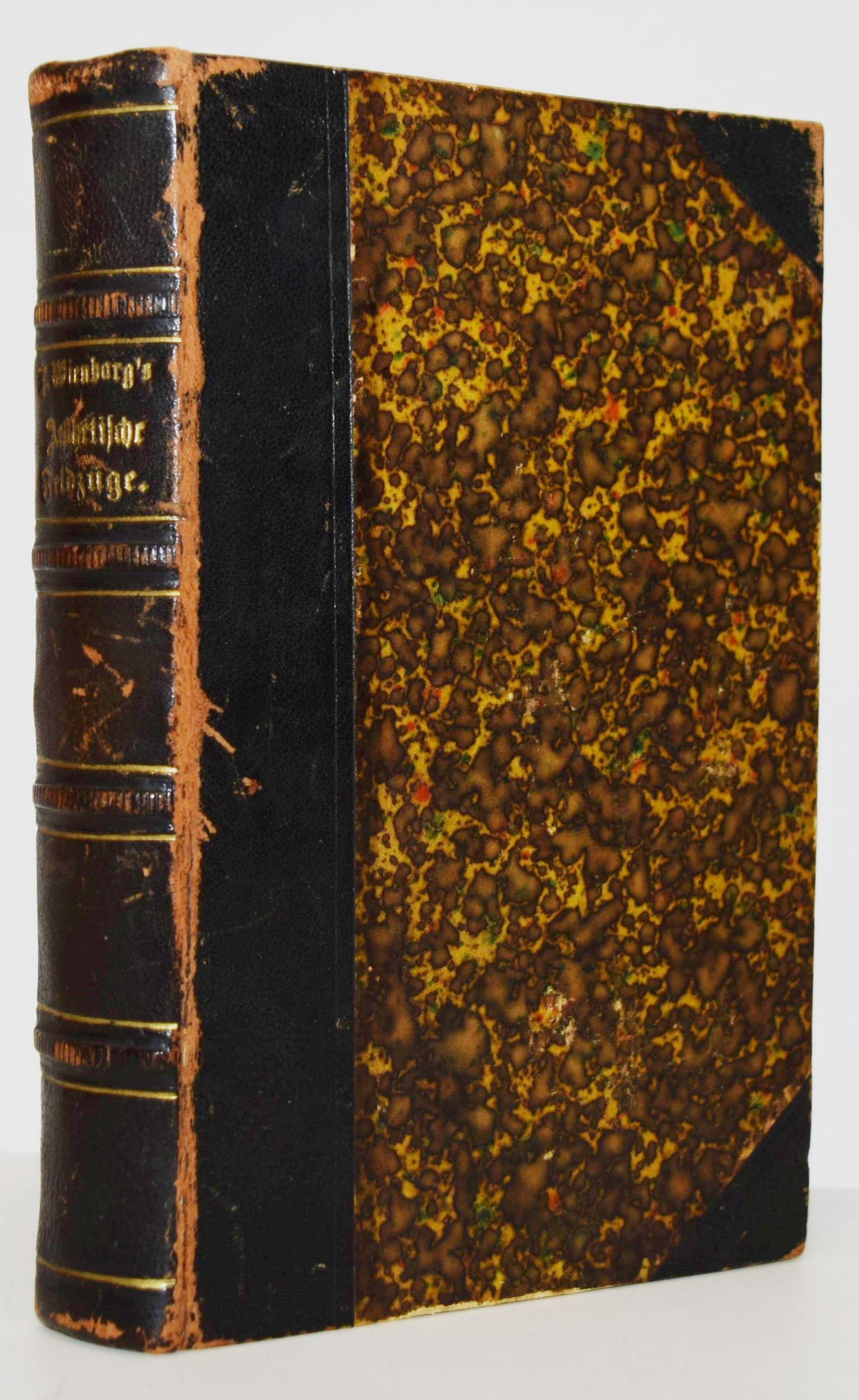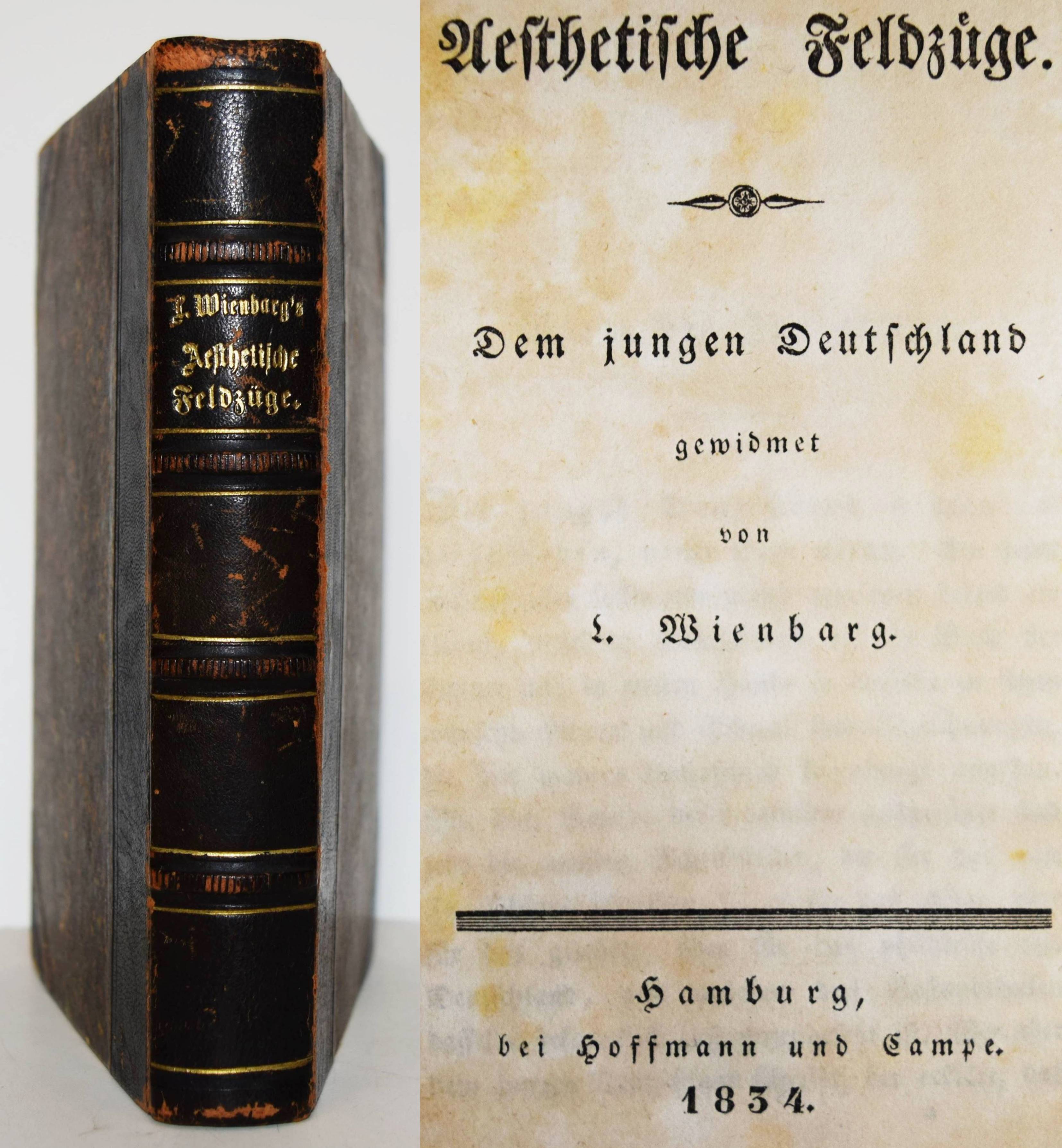 Wienbarg, L(udolf Christian). Aesthetische Feldzüge. Dem jungen Deutschland gewidmet. Hamburg, Hoffmann und Campe 1834. 8°. Halblederband um 1900 mit goldgepr. Rückentitel und Linienvergoldung. ADB XLII, 419 f. Slg. Borst 1740. Hamburger Schriftstellerlexikon VIII, 26. Houben I, 605 ff. Kayser, Hamburger Bücher 110. – Sehr seltene erste Ausgabe der Vorlesungen des Altonaer Philosophen, Philologen und Journalist, welche er 1833 als Privatdozent an der Kieler Universität hielt. Wienbargs Hauptwerk, die wichtigste theoretische und zugleich programmatische Schrift des „Jungen Deutschland“. Das Werk prägte den Namen einer ganzen Epoche, mit seiner Einleitung hat Wienbarg ganz wesentlich zur Verbreitung des Begriffs beigetragen. – 1835 gründete L. C. Wienbarg (1802-1872) in Frankfurt am Main zusammen mit Karl „Gutzkow die Zeitschrift „Deutsche Revue“, die jedoch bald staatlich unterdrückt ward. Seine Schriften wurden vom Bundestag verboten und er aus Frankfurt polizeilich ausgewiesen. Nachdem er sich nun eine Zeit lang in den Rheinlanden aufgehalten, kehrte er nach Hamburg zurück, wo er bei der Redaction der Börsenhalle betheiligt war und namentlich von 1842 bis 1846 die Hamburger litterarischen und kritischen Blätter redigirte. Hier beschäftigte ihn schon stark die schleswig-holsteinische Sache und 1848 machte er den schleswig-holsteinischen Krieg als Freiwilliger mit. Nach diesem Kriege lebte er wieder in Altona und Hamburg vielfach schriftstellerisch beschäftigt“ (E. C. Carstens in ADB). – Gelenke und Kanten berieben, stellenweise braunfleckig und im unteren Blattrand wasserrandig, sonst gut erhaltenes Exemplar aus der Bibliothek des bekannten Schriftstellers Otto Erich Hartleben (1864-1905) mit dessen eigenhändigem Besitzvermerk vom Juni 1883.