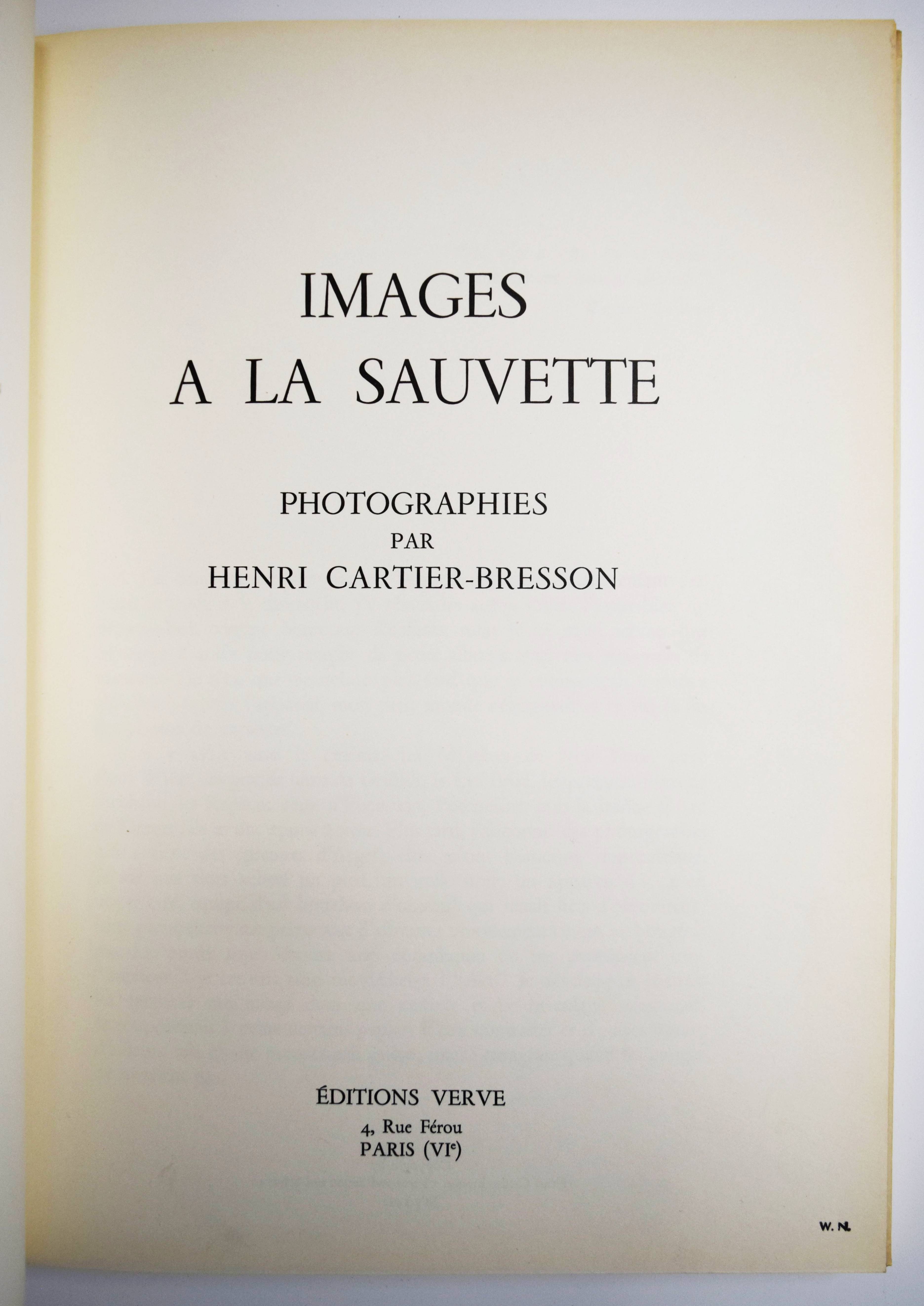 Cartier-Bresson, Henri. Images à la sauvette. Photographies. Paris, Éditions Verve (1952). Folio (37 x 28 cm.). [148] S. mit 126 Duotone-Tafeln. Farbig illustr. Orig.-Pappband (von Henri Matisse) und Japan-Papierschutzumschlag. Auer 343. Koetzle, Fotografen A-Z 66 f. Roth, The book of 101 books 134. Sinibaldi/Couturier 99. Vgl. Parr/Badger I, 207 f. und Roth, The Open Book 154 f. (beide parallel erschienene amerikanische Ausgabe „The Decisive Moment“, „because their publication in the United States made Cartier-Bresson an international superstar“). – Erste Ausgabe. – Mit eigenhändiger Widmung von H. Cartier-Bresson „à Monsieur Hans Saebens avec mon trés cordial souvenir Henri Cartier-Bresson, Hamburg 1952“ und 2 Orig.-Portraitphotographien von H. Cartier-Bresson. – Der Bremer Maler, Grafiker und Fotograf Hans Saebens (1895-1969) lebte im Künstlerdorf Worpswede bei Bremen und begann bereits 1932 mit der Leica zu fotografieren. – „Seit Oskar Barnacks Erfindung der Leica, jener Kleinbildkamera, die durch ihre reduzierte Größe den Fotografen mitten ins Geschehen rückte und ihm ermöglichte, direkt unter seinen Motiven zu arbeiten, war die moderne Bildreportage geboren. Der Fotograf wurde nun flexibel, die Kamera ermöglichte es ihm, aus dem Geschehen heraus seine Bilder zu schießen und ohne zu auffällig zu werden, den Decisive Moment, den entscheidenden Moment, auszunutzen. Henri Cartier-Bresson, den Saebens 1953 in Hamburg traf, hatte im Jahr zuvor die Theorie des Decisive Moment aufgestellt. „Für mich besteht das Wesen der Fotografie in der Fähigkeit, in Bruchteilen einer Sekunde Bedeutung und Gewicht eines Ereignisses zu erfassen und gleichzeitig in eine Form zu bannen, die das Wesen dieses Geschehens gültig ausdrückt“, schreibt Cartier-Bresson (In: Leica-Fotografie 1953, Heft 1, S. 4). Und damit nutzte er – im Gegensatz zu Saebens – die Möglichkeiten aus, die die Leica dem Fotografen bietet“ (Wikipedia). – „Strictly speaking … a monograph of Cartier-Bresson’s best work, but it has overriding unifying factors that elevate it into … one of the greatest of all photobooks …“ (Parr/Badger). – Henri Cartier-Bresson (1908–2004) gilt als der Wegbereiter des modernen Fotojournalismus. Gemeinsam mit Robert Capa und David »Chim« Seymour gründete er 1947 die Fotografenkooperative und -Agentur „Magnum“. Sein Blick für das Skurrile im Alltag war legendär. Er fotografierte unter anderem in Spanien, Kamerun, Italien, Indien, Pakistan, China, Mexiko und den USA. – Sehr gutes Exemplar mit bedeutender Provienz.