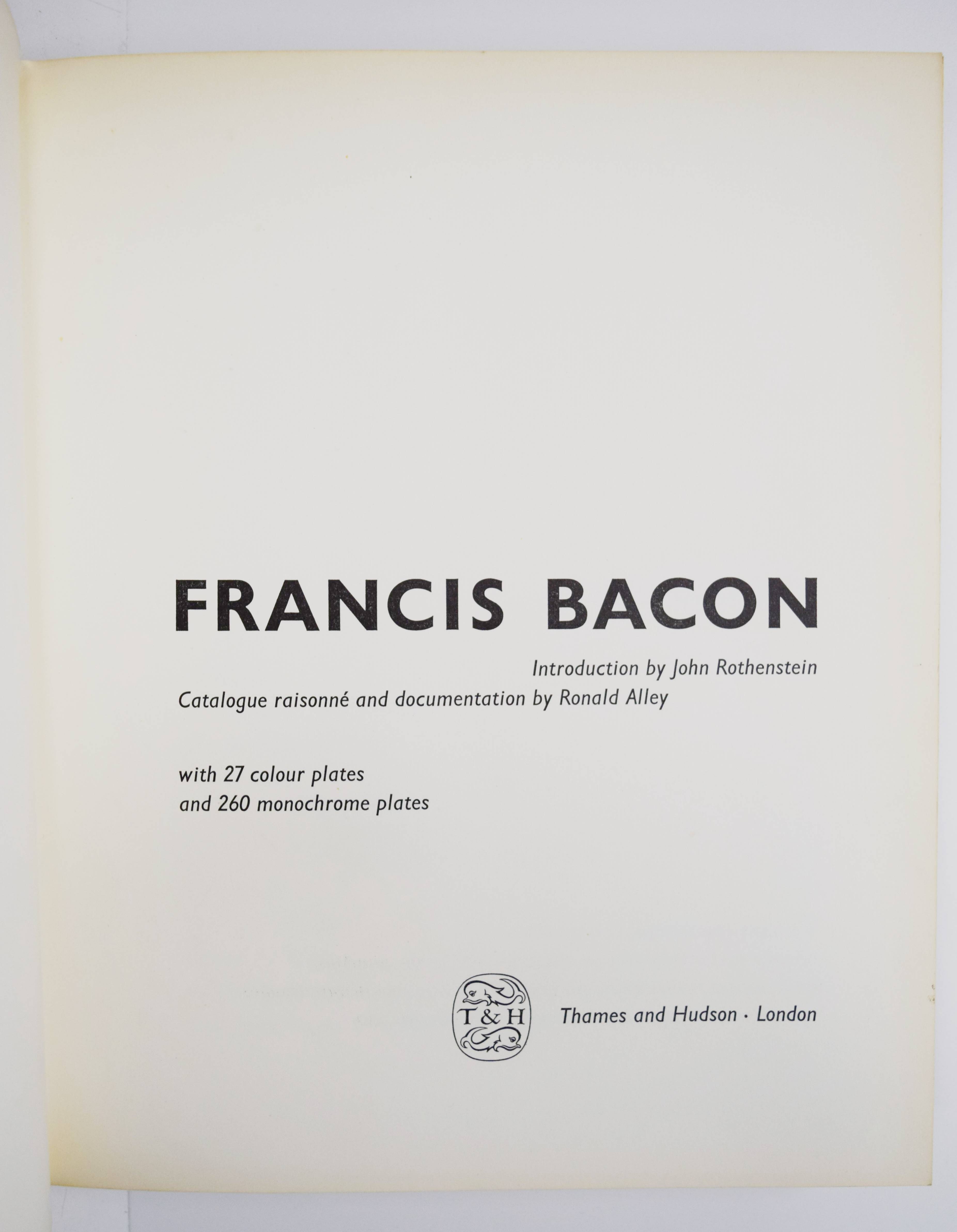 Bacon – Alley, Ronald. Francis Bacon. Catalogue Raisonne and documentation by Ronald Alley. Introduction by John Rothenstein. London, Thames & Hudson (1964). 4°. 292 S. mit 287 (27 farbigen und montierten) Tafeln. Orig.-Leinenband mit farbig illustr. Schutzumschlag und Japanpapier-Schutzumschlag. Sehr gutes Exemplar. – Fine copy with very good dust jacket and halftransparent paper dust wrapper.