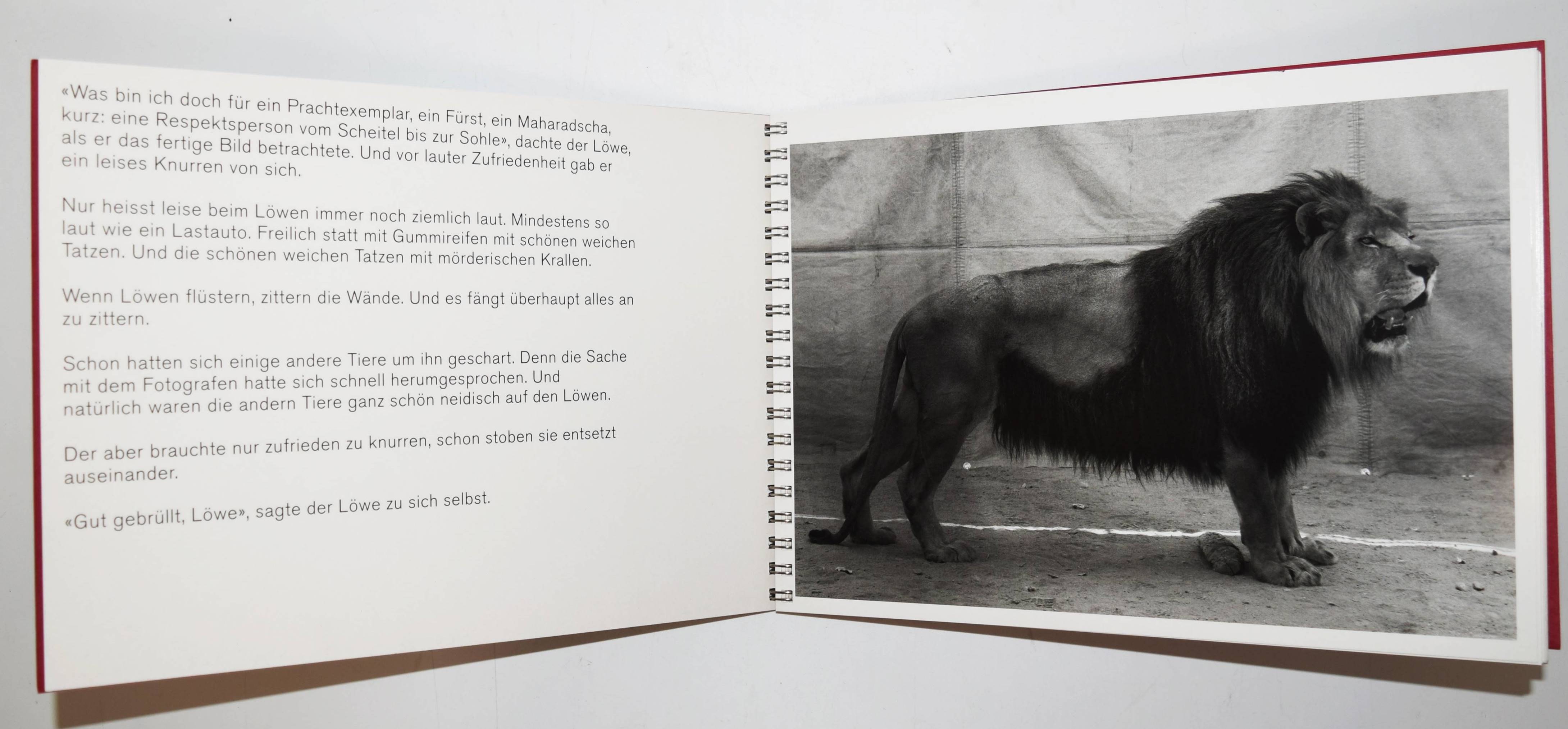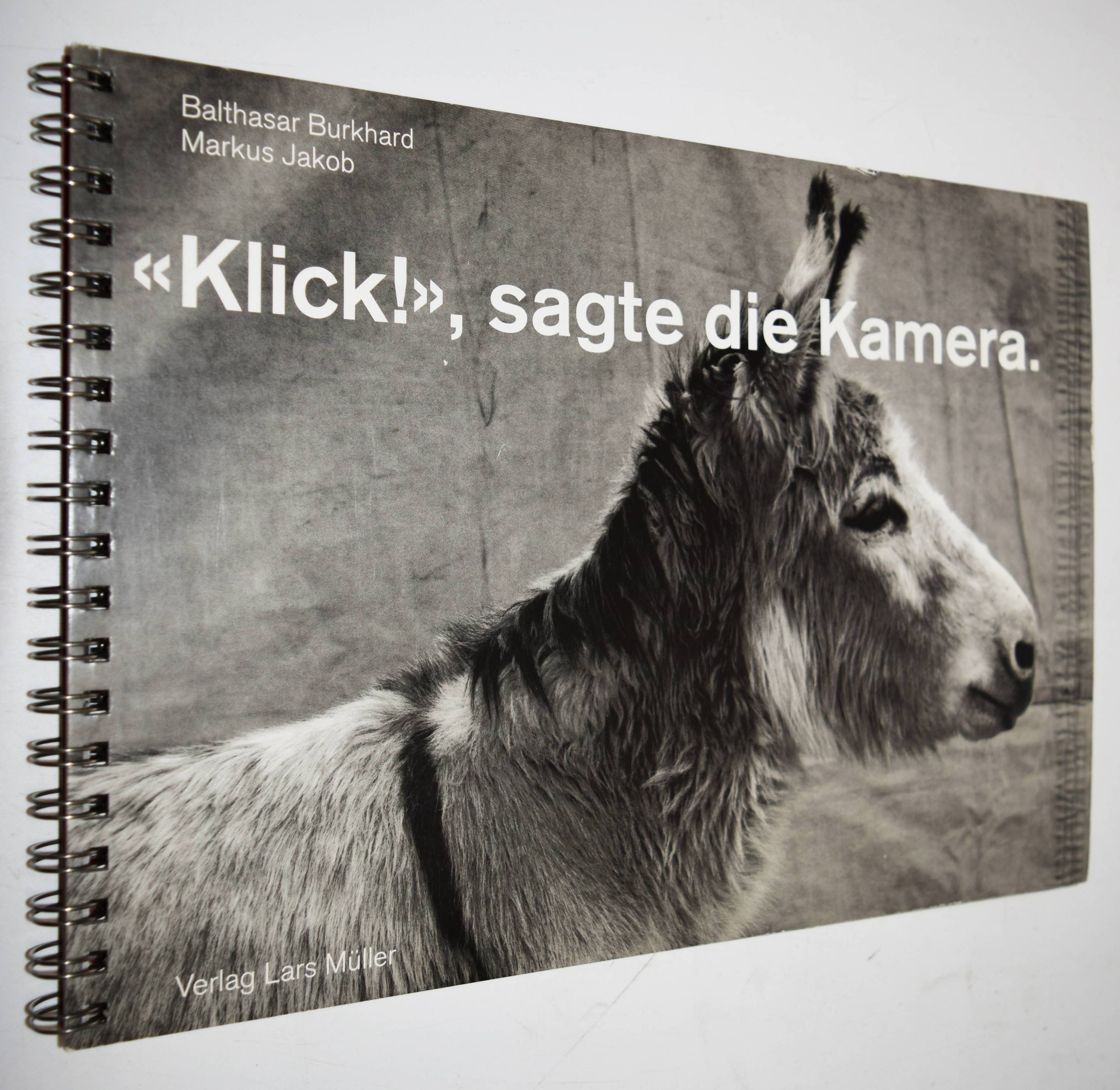 Burkhard, Balthasar und Markus Jakob. „Klick!“ sagte die Kamera. Baden, Lars Müller (1997). Quer-4° (24 x 35 cm.). 21 Duotone-Tafeln auf dünnem Karton mit rückseitigem Text von M. Jakob. Illustr. Orig.-Pappband mit Metall-Ringheftung. Schweizer Fotobücher 454 ff. – Erste Ausgabe. – „Zwanzig Tiere treffen sich zum Schönheitswettbewerb beim Fotografen. Auf Balthasar Burkhards Porträts sind alle Tiere gleichermassen schön. Die Protagonistin der Geschichte ist eine scheue Eselin, die dem fröhlichen Treiben zusieht. Liebevoll und mit viel Humor beschreibt Markus Jakob das illustre Stelldichein“ (Lars Müller). – B. Burkhard, Lehrling von Kurt Blum in Bern, „arbeitete zunächst als Dokumentarfotograf der Kunsthalle Bern, bevor er im Jahr 1969 seine Künstlerlaufbahn begann. Seine Arbeiten wurden vor allem im Zusammenhang mit zeitgenössischer Kunst ausgestellt, in der Fotografieszene tauchte sein Name nur selten auf. Dabei brachte er durchaus seine Fähigkeit als klassischer Fotograf zur Geltung – mit Werken in Schwarzweiss und im Grossformat. Das Buch „Klick!, sagte die Kamera“ kann denn auch als eine Hommage an die Geschichte der Fotografie gedeutet werden. Burkhard ist in die Rolle eines Studiofotografen geschlüpft. Indem er die Zirkustiere vor einem Laken posieren lässt, schliesst er alles Exotische aus. Bei seinen Bildern denkt man an Porträts des 19. Jahrhunderts, als Fotografen ihr Studio auf den Jahrmärkten aufbauten. Die serielle Vorgehensweise verweist aber auch auf eine wegweisende Arbeit des 20. Jahrhunderts, die Urformen der Kunst von Karl Blossfeldt. Das 1928 erschienene Fotobuch führte ein, was später zu einem Merkmal der deutschen Fotografie werden sollte: die Beschäftigung mit „Typologien“. Die seriellen Aufnahmen erlaubten es, die individuellen Merkmale einer Kategorie herauszuarbeiten. August Sander ging bei seiner Bestandsaufnahme gesellschaftlicher Typen ähnlich vor. Ein spätes Echo auf diese Arbeiten der 1920er-Jahre. Mit seinem Ansatz beugt er, genau wie die Fotografen der Neuen Sachlichkeit, jedwedem subjektiven Ausdruck vor. Diese stringente und ungekünstelte Vorgehensweise findet sich auch bei anderen Künstlern seiner Generation wieder, so etwa bei Bernd und Hilla Becher. Das Subjekt, das seinem Kontext enthoben ist, wird zum Motiv“ (N. Herschdorfer in Schweizer Fotobücher S. 457). – Sehr gutes Exemplar.