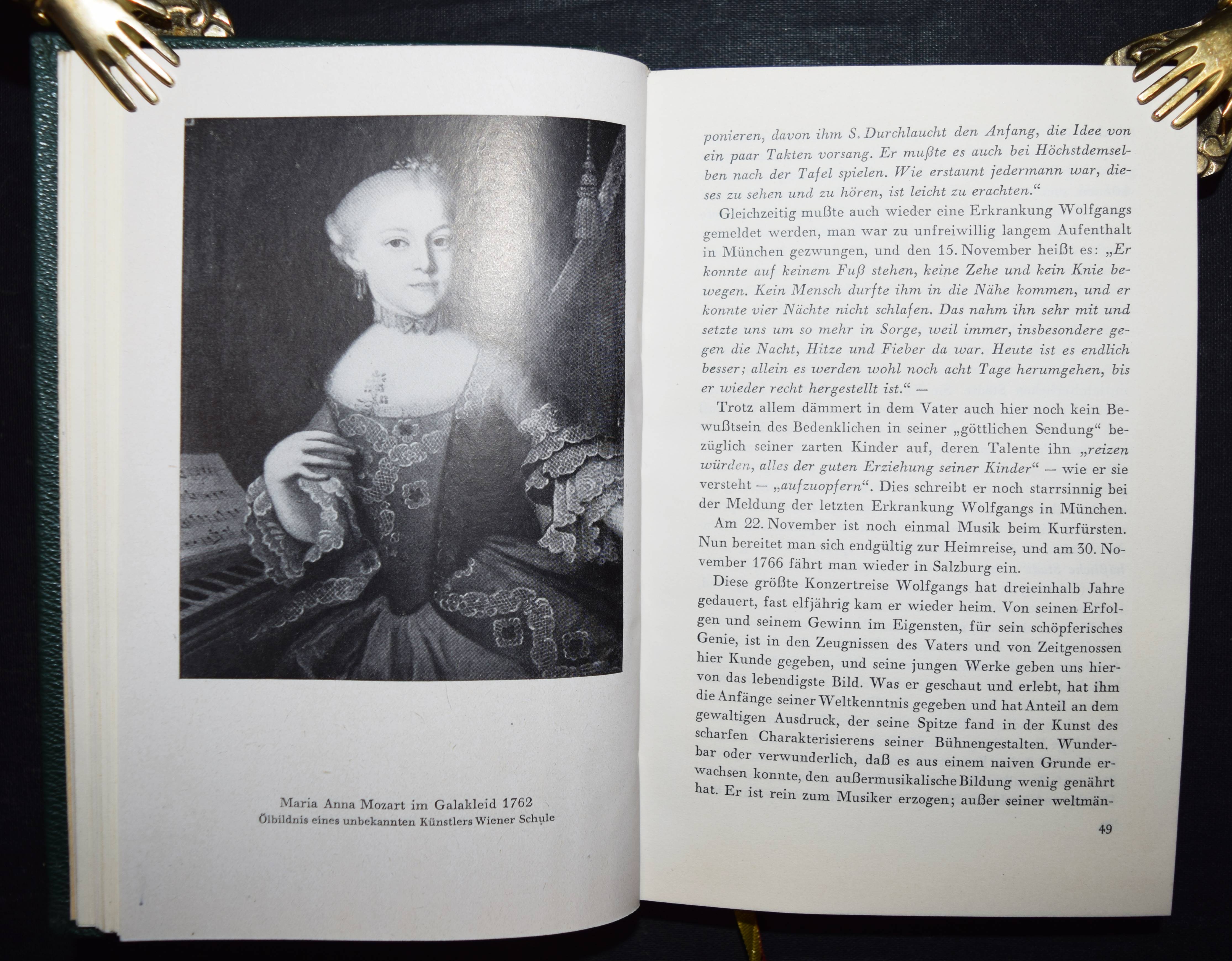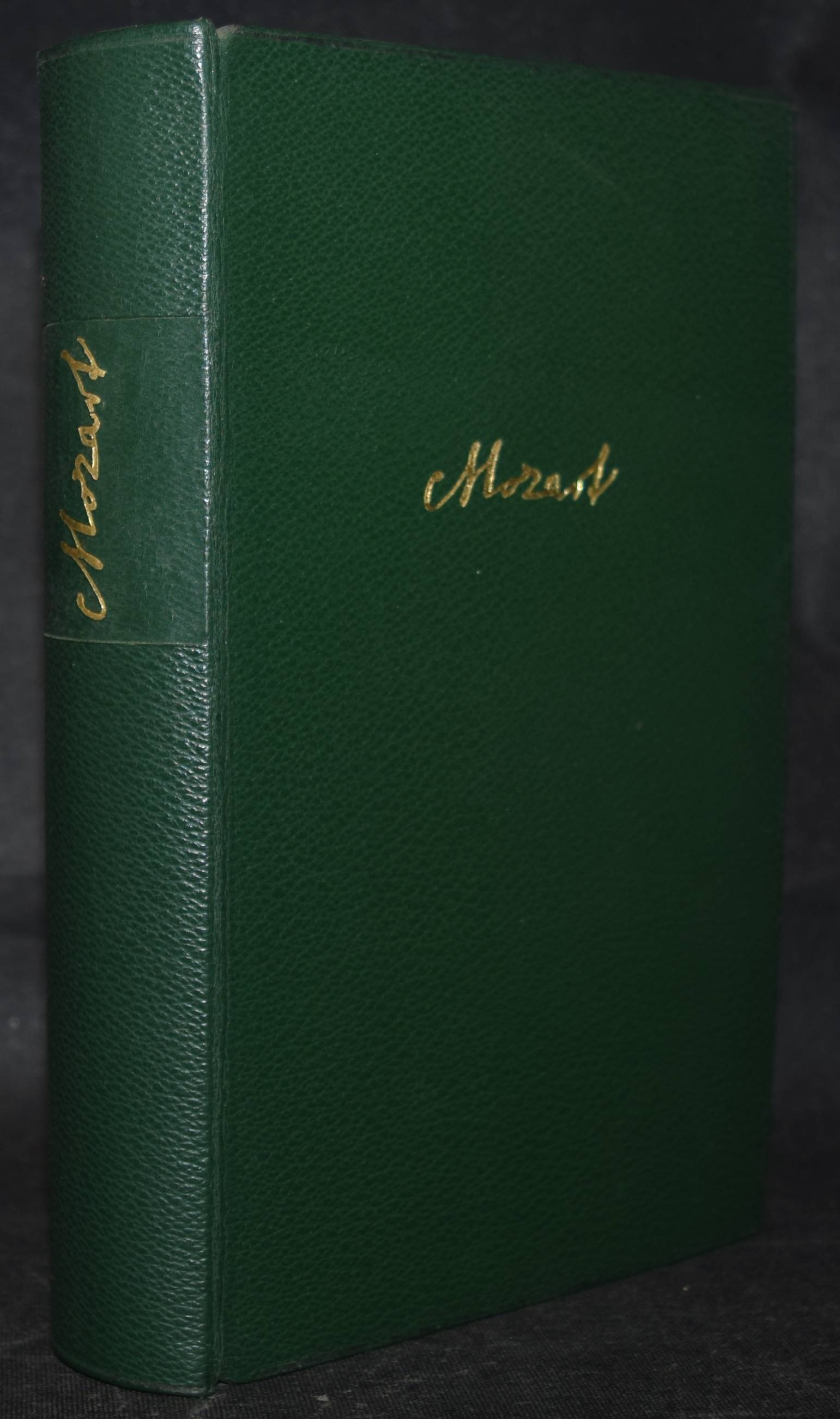 Mozart – Spohr, Wilhelm. Mozart. Leben und Werk. Briefe, Zeitberichte, Dokumente, Bilder. 1. – 10. Tsd. Berlin, Verlag der Nation 1951. 8°. 457 S. mit 17 Tafeln u. 1 gefalt. Stammtafel. Grüner OLdr. mit goldgepr. Rücken- u. Deckelsignatur sowie Kopfgoldschnitt. (Nation und Welt). Erschien zuerst 1941. – Sehr gutes Exemplar der schönen Ganzlederausgabe.
