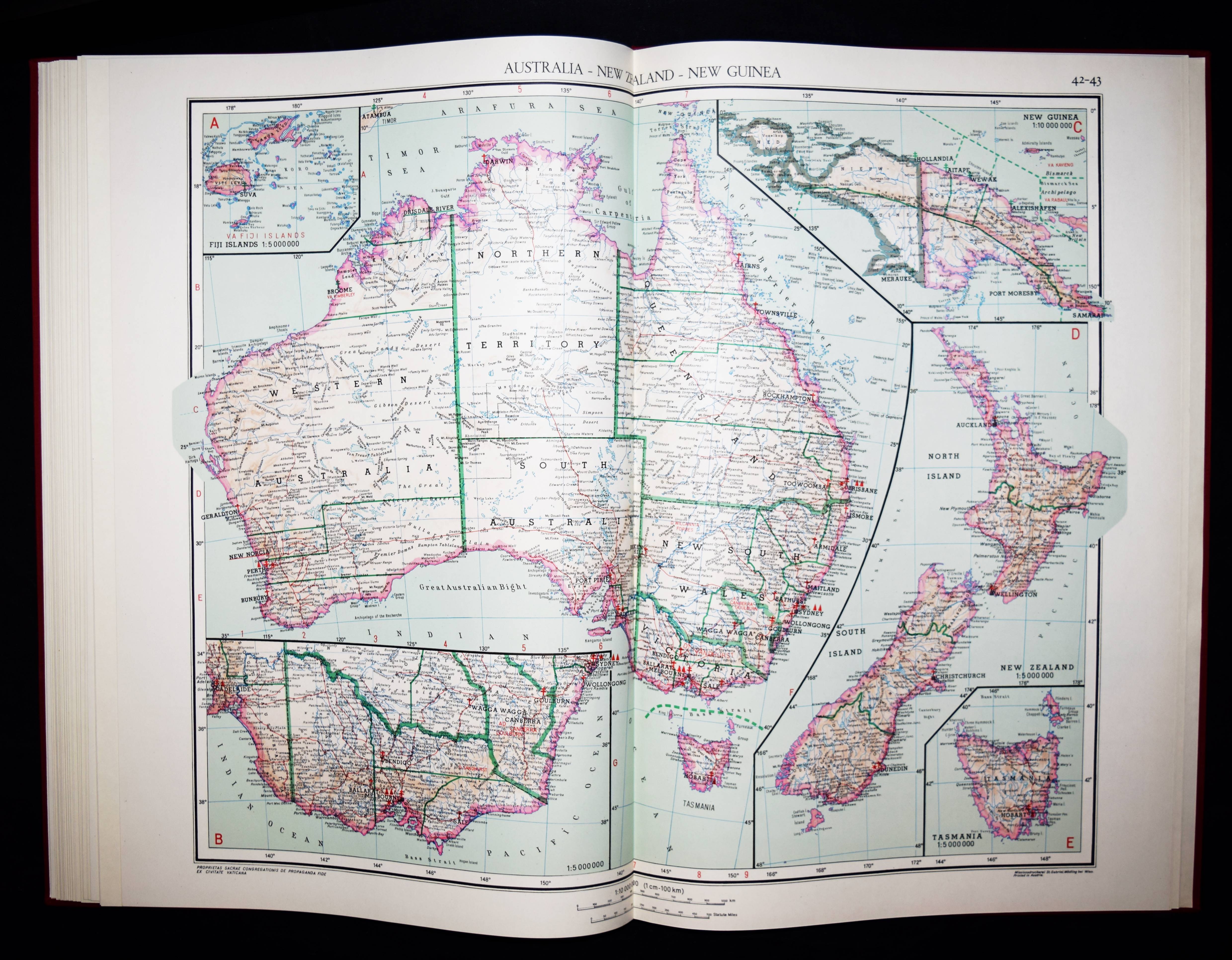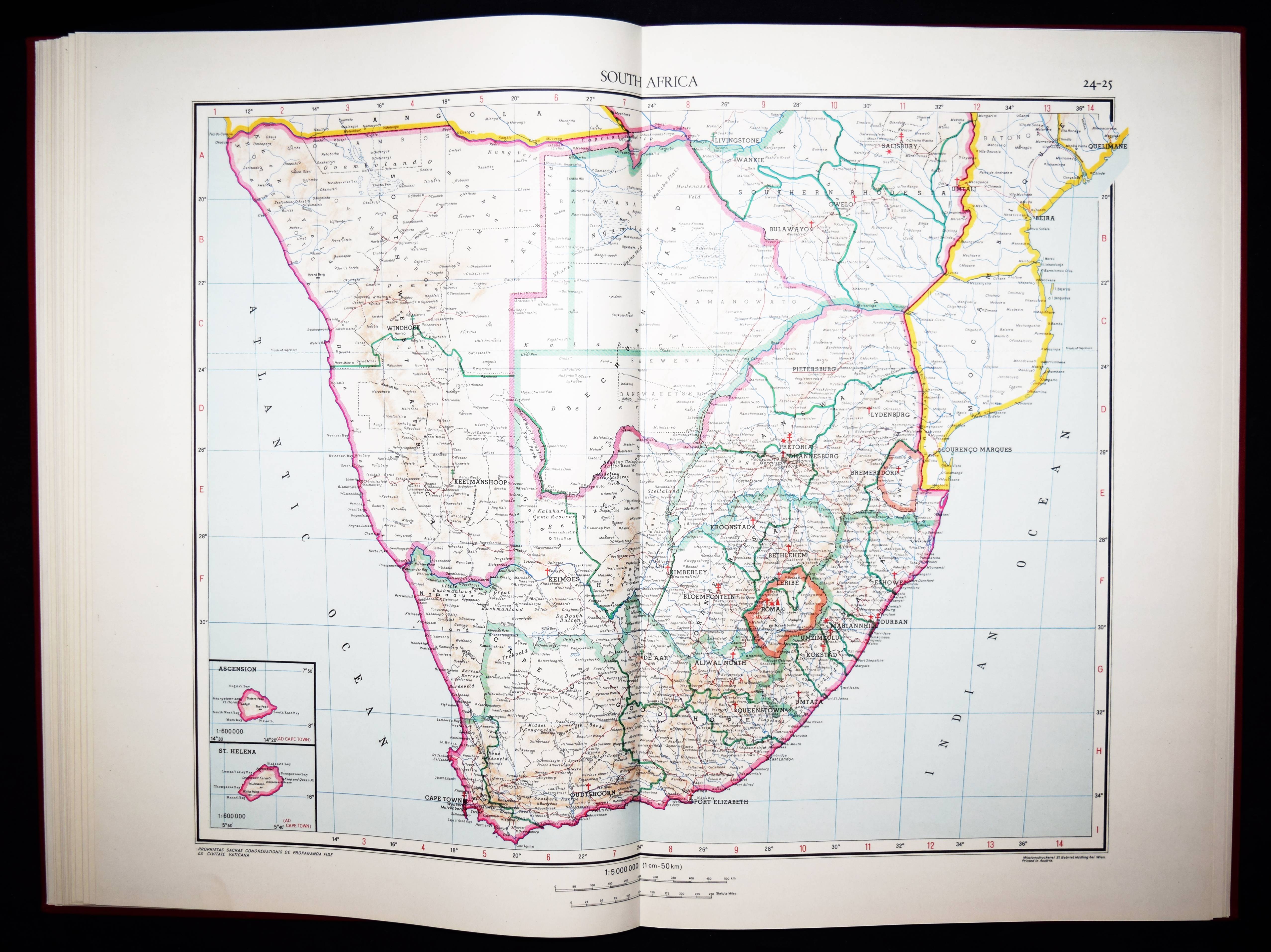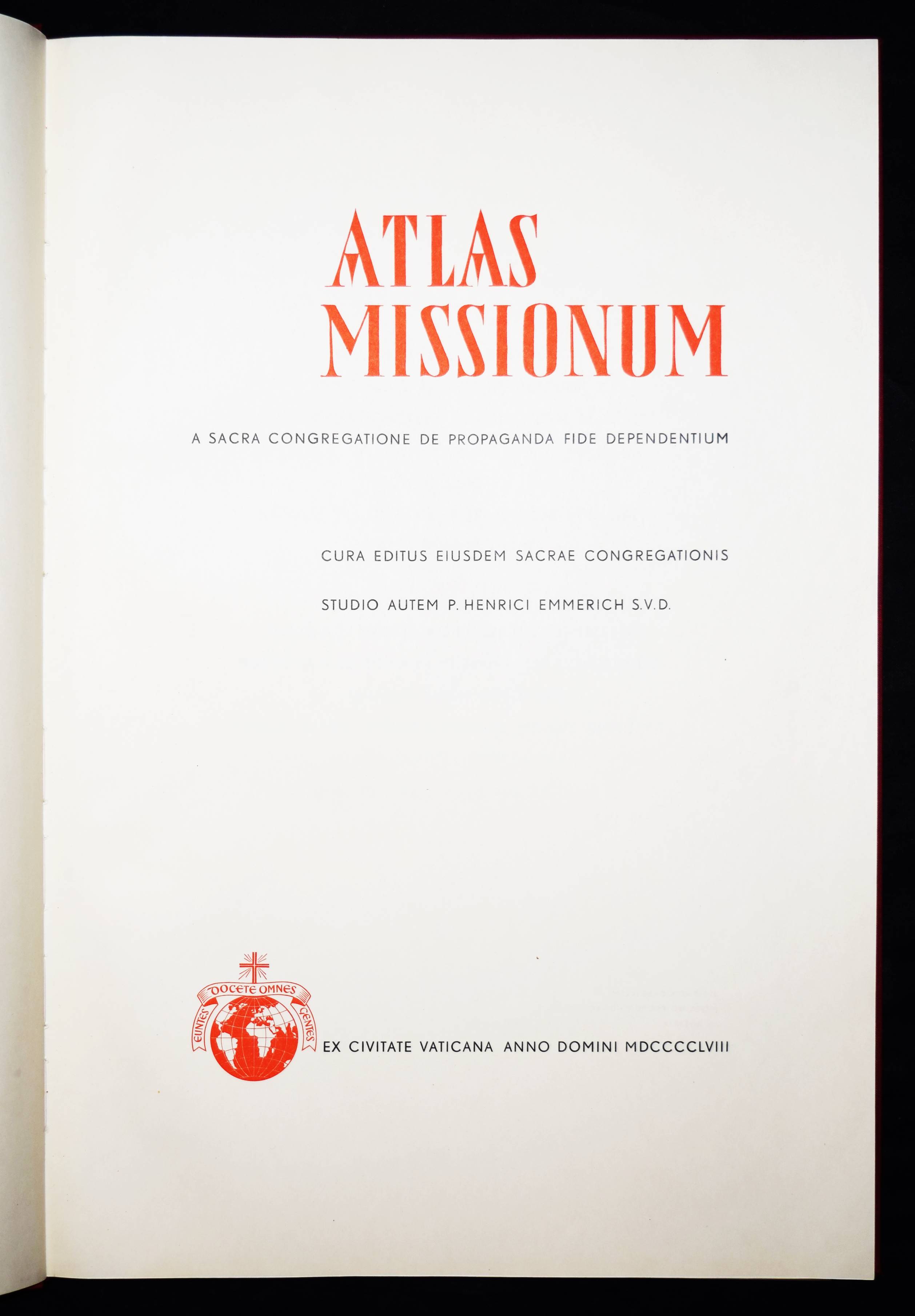 Schorer, Lujo (Hrsg.). Atlas missionum a Sacra Congregatione de propaganda fide dependentium. Civitas Vaticana 1958. Folio. [44] Bl., 8 S. mit teils doppelblattgr. farb. Karte u. Beiheft (Data statistica circumscriptionum ecclesiasticarum, 27 S.). OLn. mit goldgepr. Deckeltitel. Gutes Exemplar.