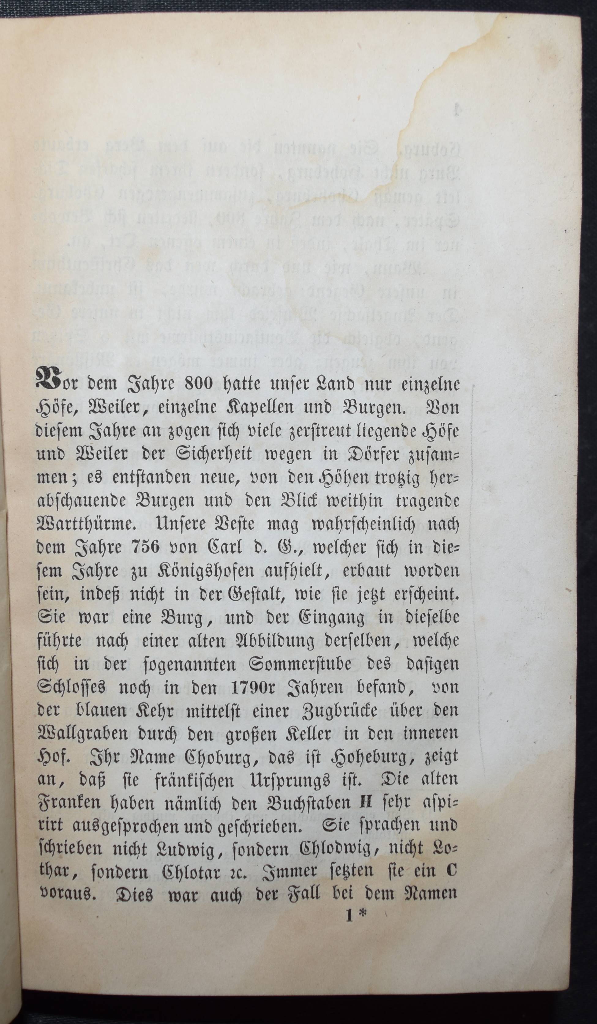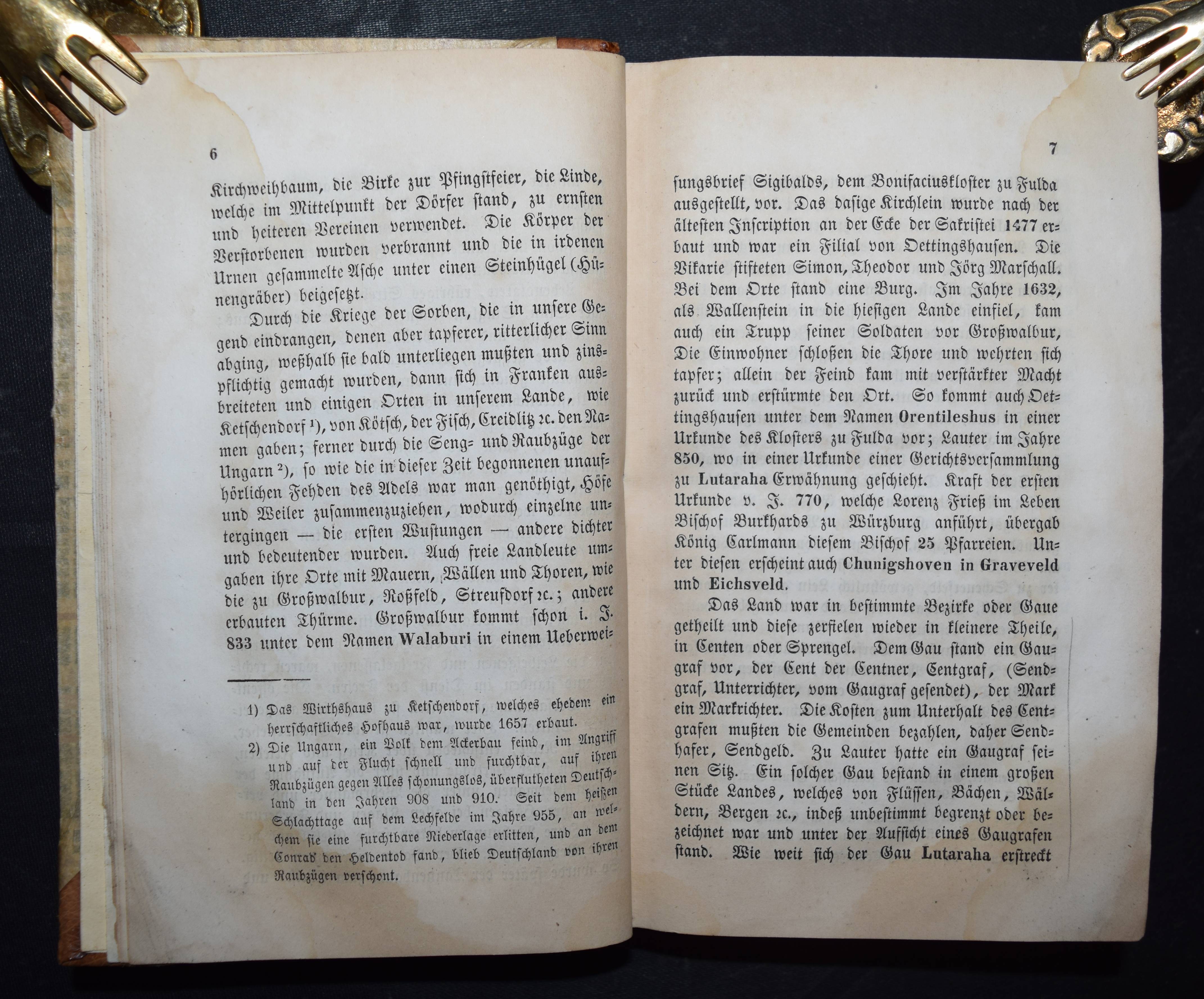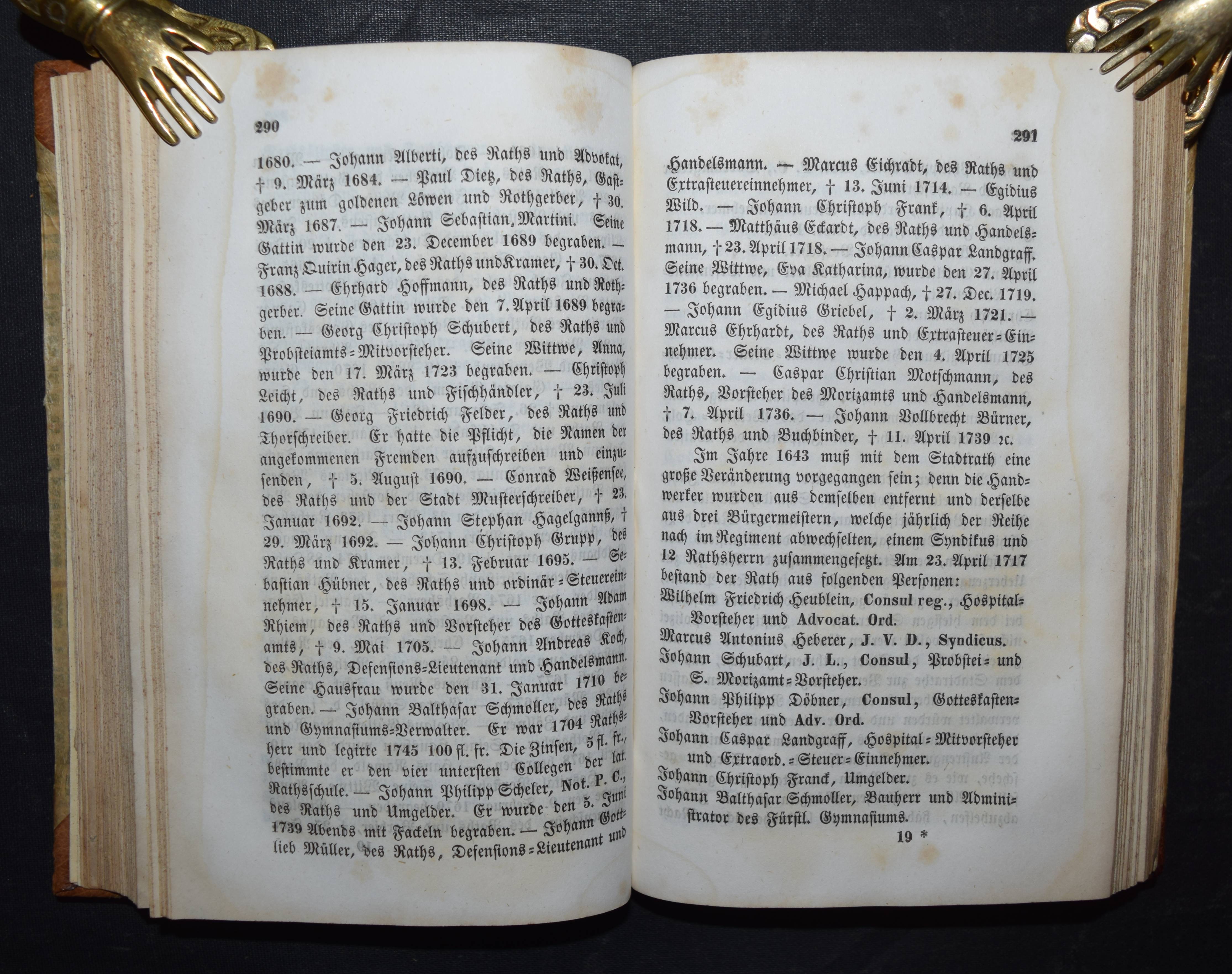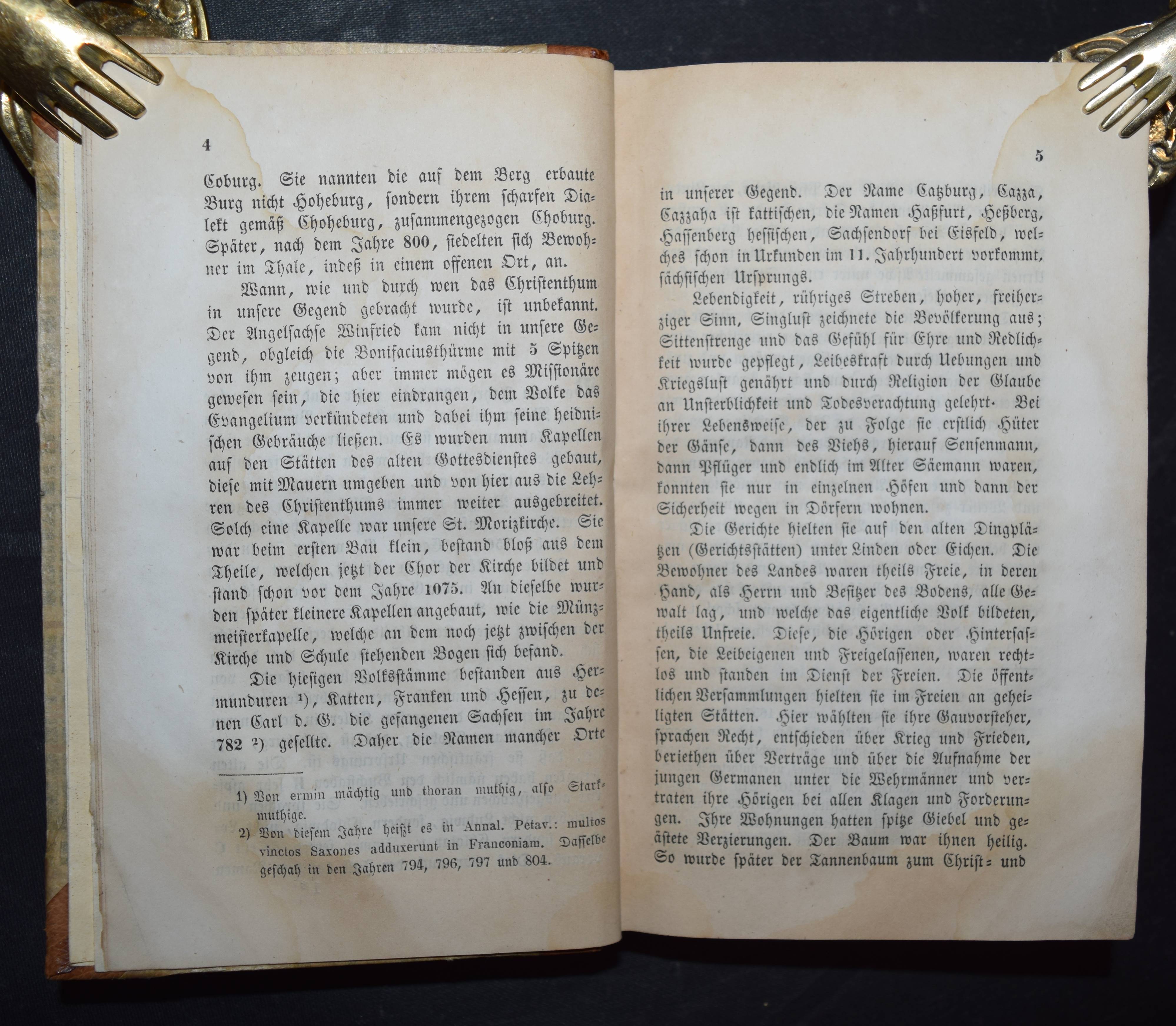 Coburg – Karche, Philipp Carl Gotthard. Jahrbücher der Herzogl. Sächs. Residenzstadt Coburg. Coburg, Riemann 1853. 8º. VI, 554 S. Hldr. um 1900. Pfeiffer 9214. – Dritter und letzter Jahrgang des seit 1825 erschienenen Jahrbuchs. – Titelbl. stärker angestaubt u. aufgezogen, stellenweise braun- u. wasserfleckig.