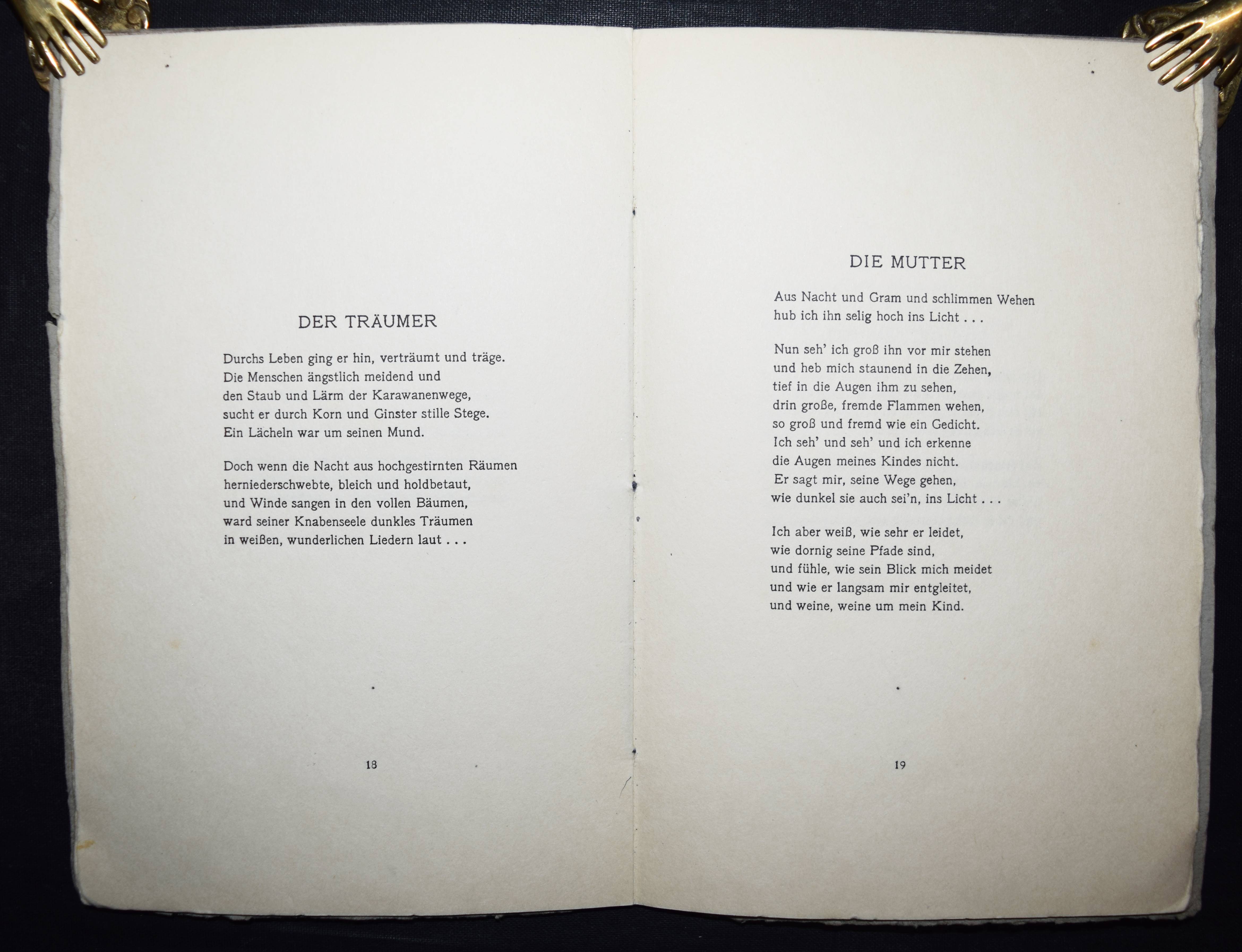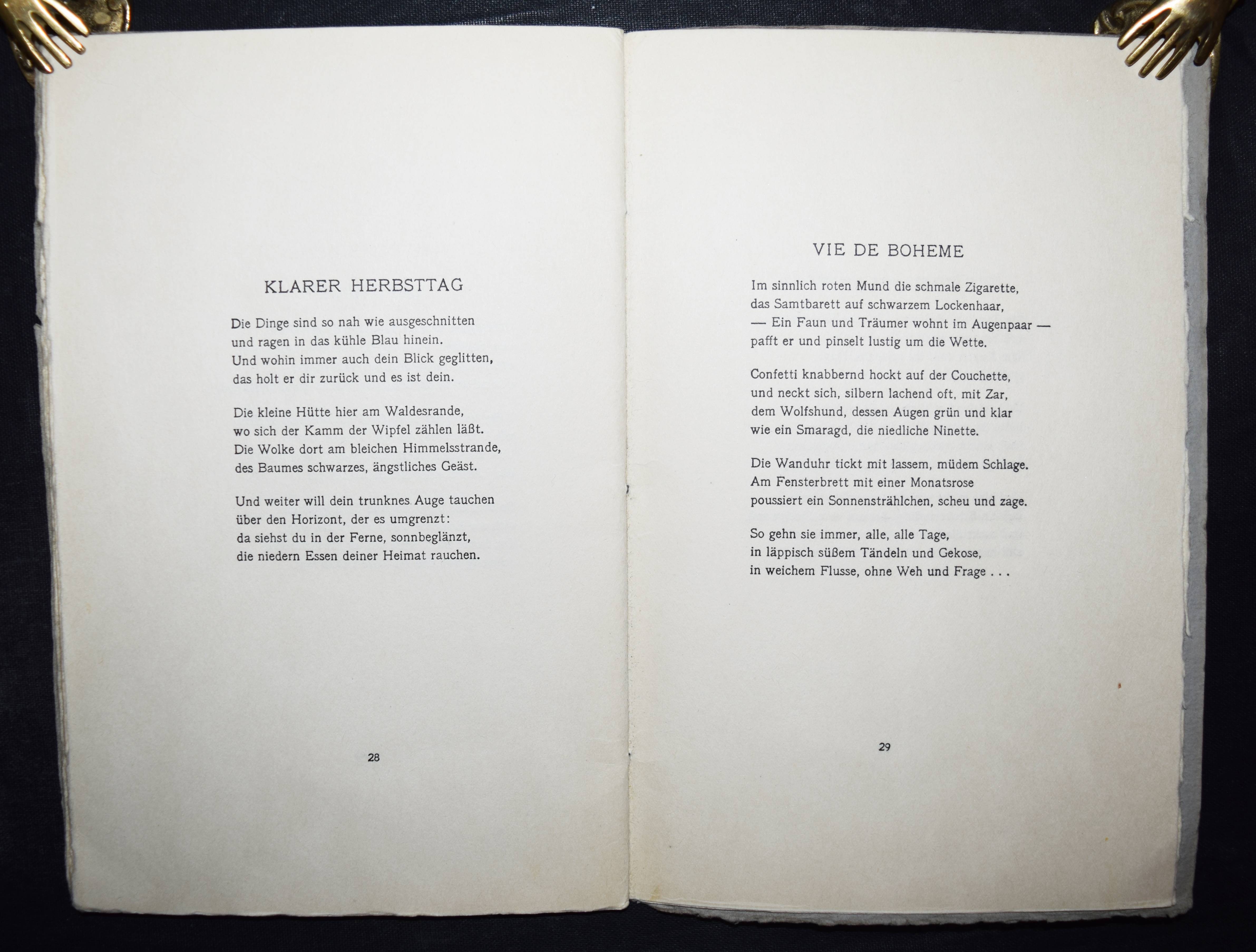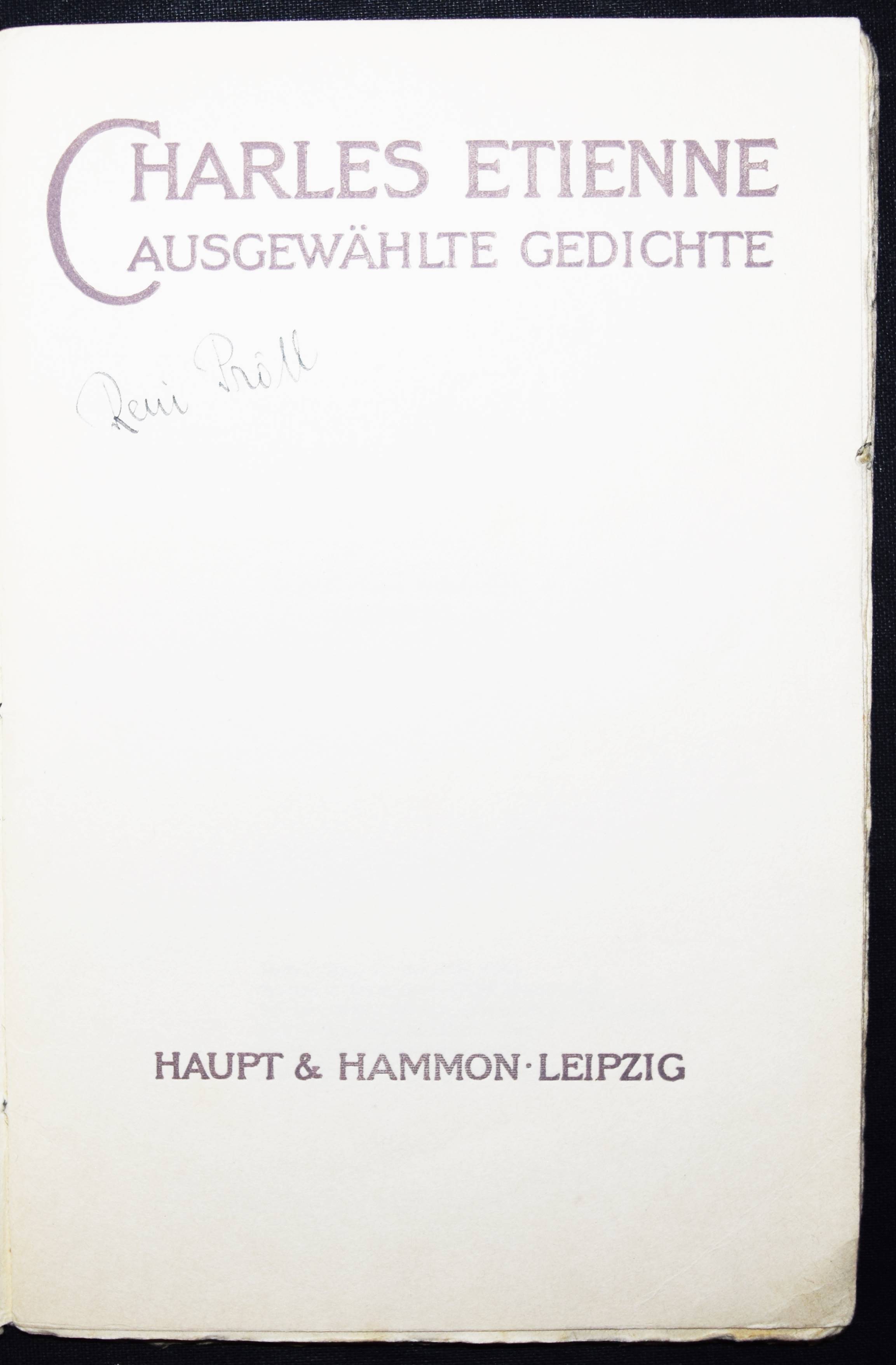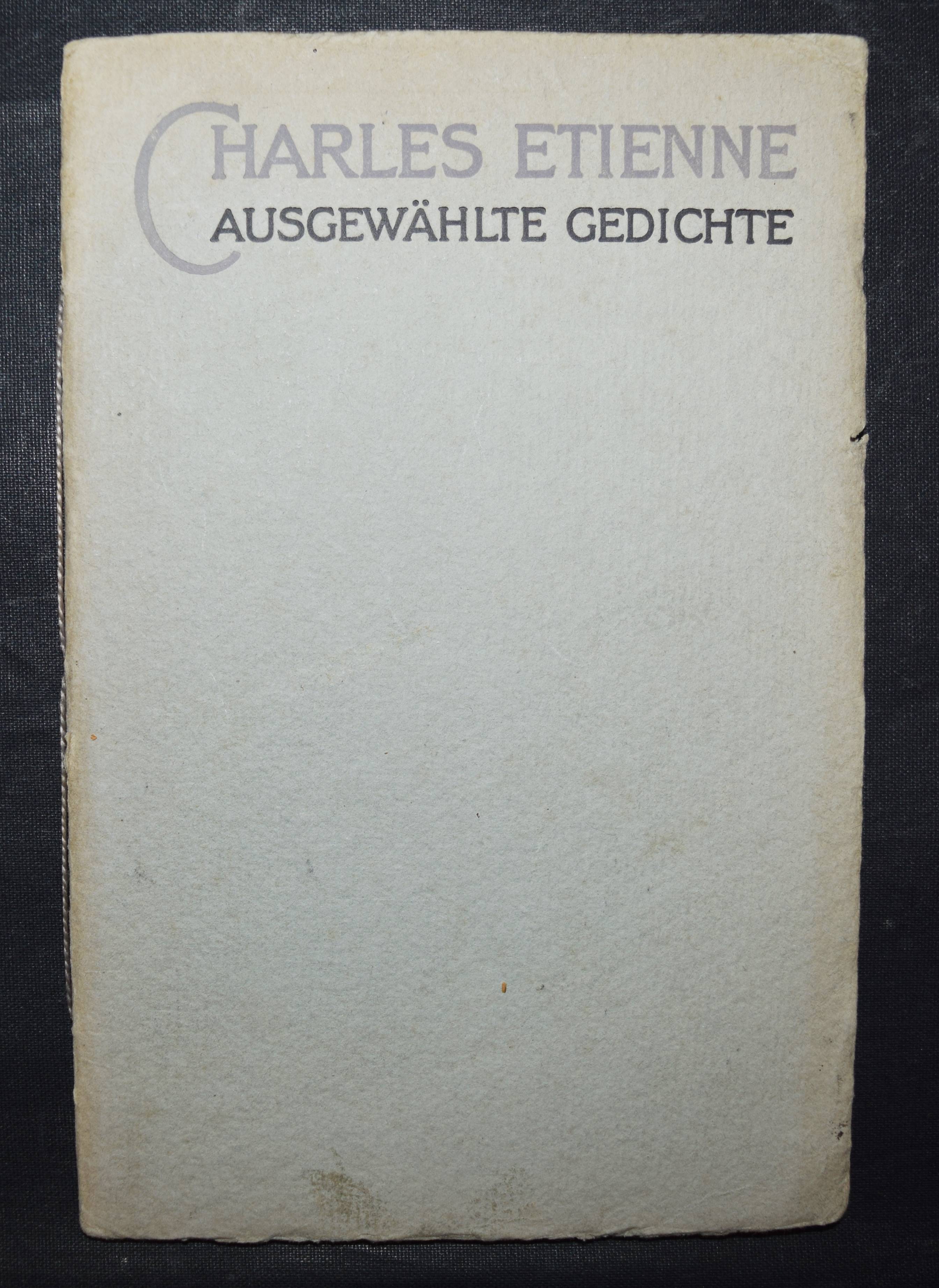 Etienne, Charles. Ausgewählte Gedichte. Leipzig, Haupt & Hammon o. J. (1919). 8°. 31, (1) S. OKart. Erste Ausgabe. – Mit eigenhändiger Widmung von C. Etienne. – Sehr selten, wir können weltweit nur ein Exemplar in der Princeton University Library nachweisen (lt. KVK). – Umschlag leicht gebräunt, N.a.T., gutes auf kräftiges Büttenpapier gedrucktes Exemplar.