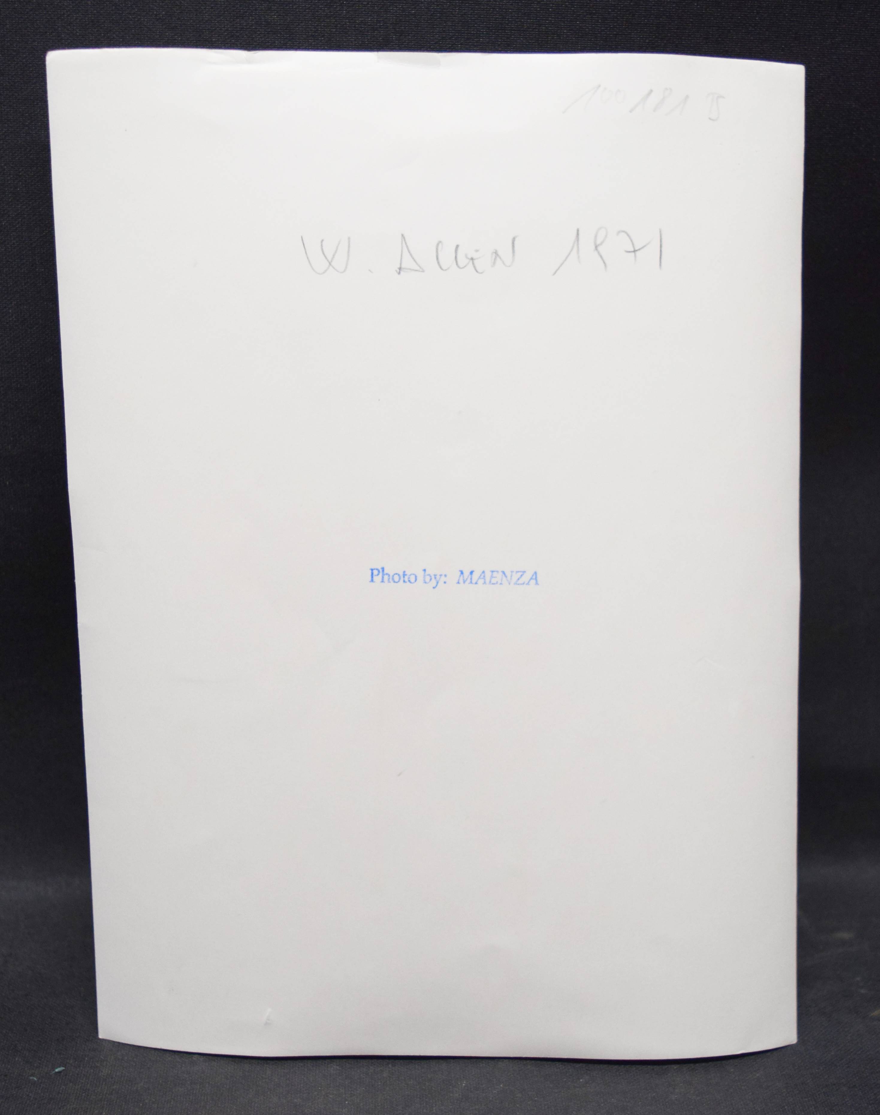 Allen, Heywood „Woody“ (eig. Allan Stewart Konigsberg, geb. 1935, US-amerikanischer Filmregisseur, Autor, Schauspieler, Komiker und passionierter Jazzmusiker). Orig.-Photographie von (David J.) Maenza (1933-2013). New York (1971). Format 24 x 18 cm. Allen ist einer der produktivsten Filmregisseure der Gegenwart. Er war Drehbuchautor und Regisseur von über 50 Filmen und schrieb zahlreiche Erzählungen, Theaterstücke und Kolumnen. 24-mal war er für einen Oscar nominiert und erhielt die Auszeichnung viermal: 1978 für Der Stadtneurotiker in den Kategorien Bester Regisseur und Bestes Drehbuch, 1986 mit Hannah und ihre Schwestern und 2012 mit Midnight in Paris, jeweils für das beste Drehbuch. – Rückseitig mit Stempel des amerik. Photographen D. J. Maenza, der vorwiegend für die Chicago Tribune arbeitete, oberer Rand mit geringf. Knickspuren, vintage.