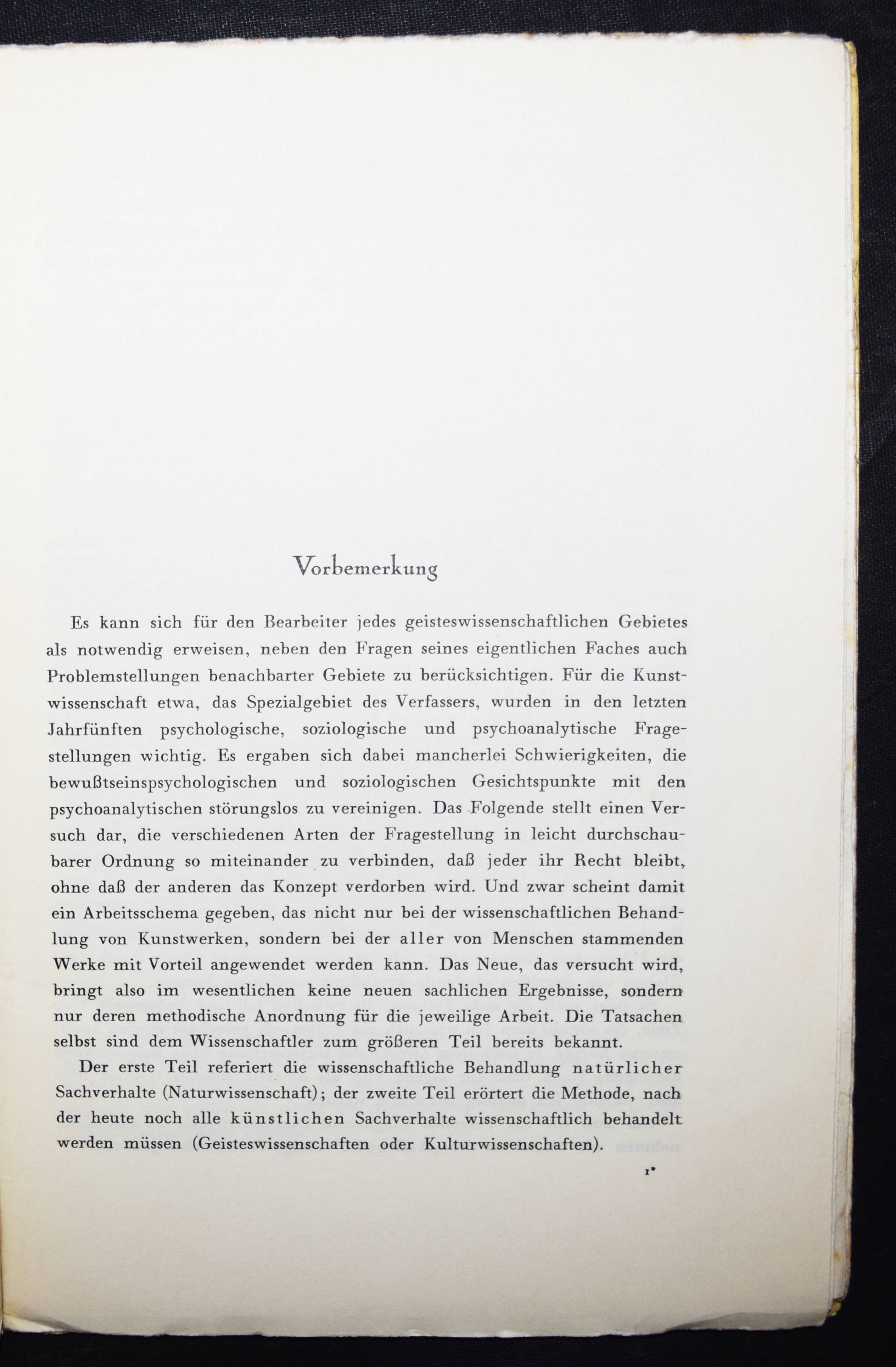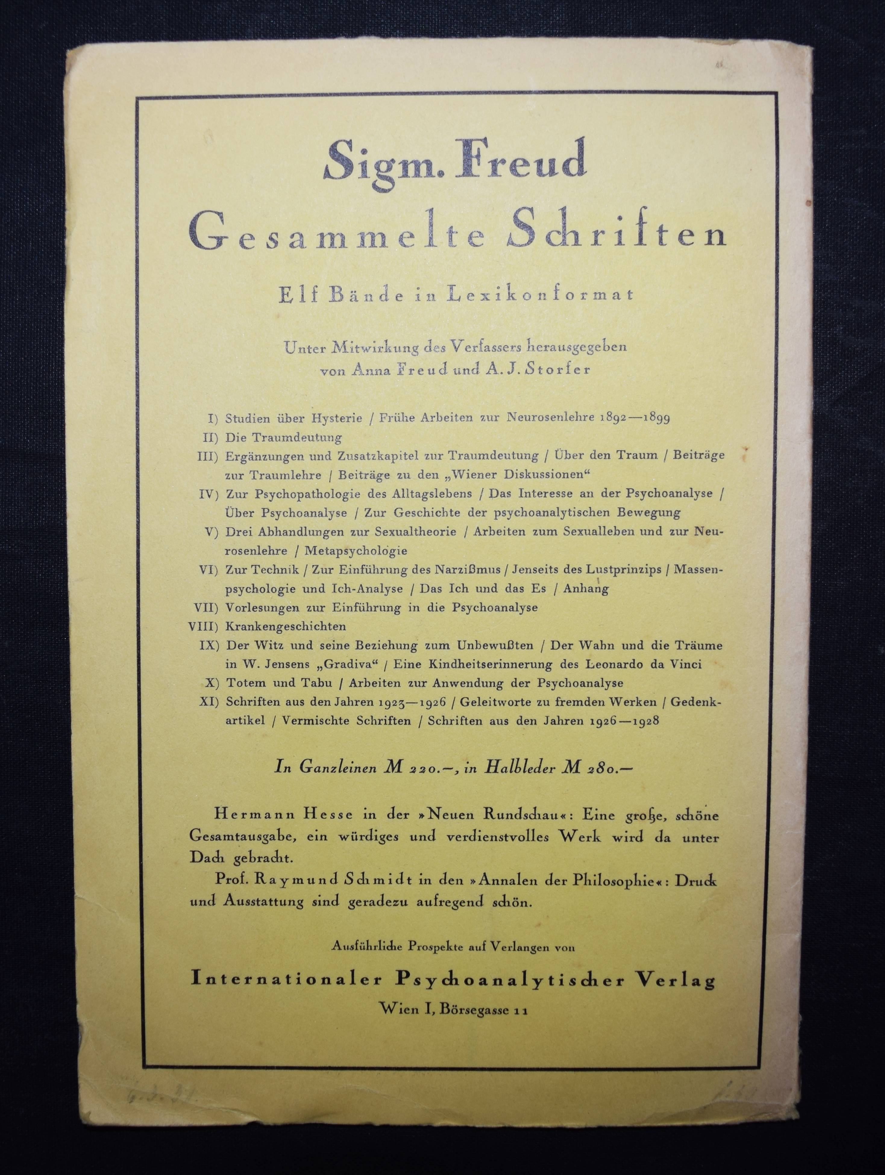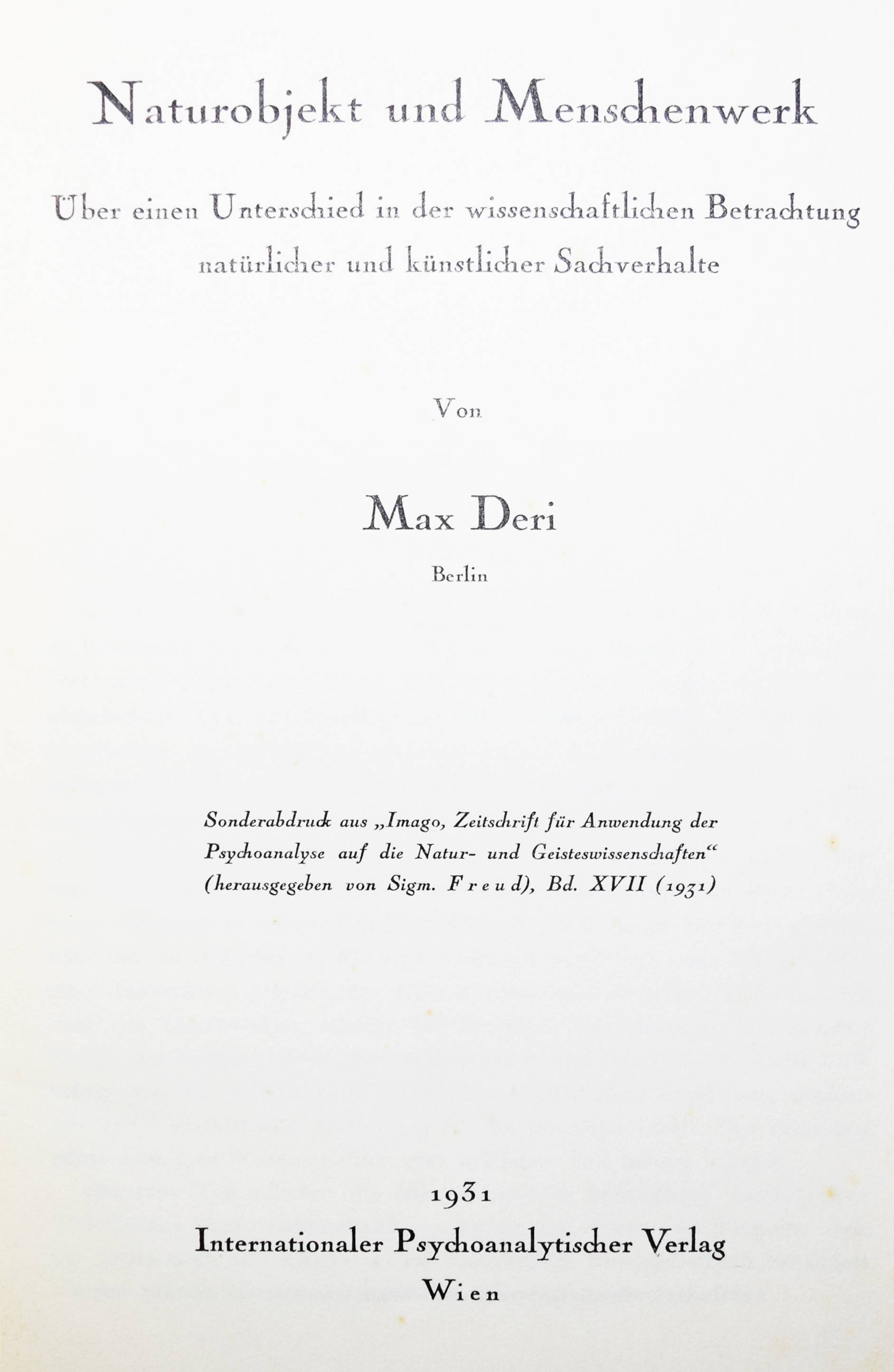 Deri, Max. Naturobjekt und Menschenwerk. Über einen Unterschied in der wissenschaftlichen Betrachtung natürlicher und künstlicher Sachverhalte. Wien, Internationaler Psychoanalytischer Verlag 1931. 8°. 38 S. OKart. Grinstein I, 6629. – Erste Einzelausgabe. – Umschlag geringf. angestaubt und am Fuß leicht beschädigt.