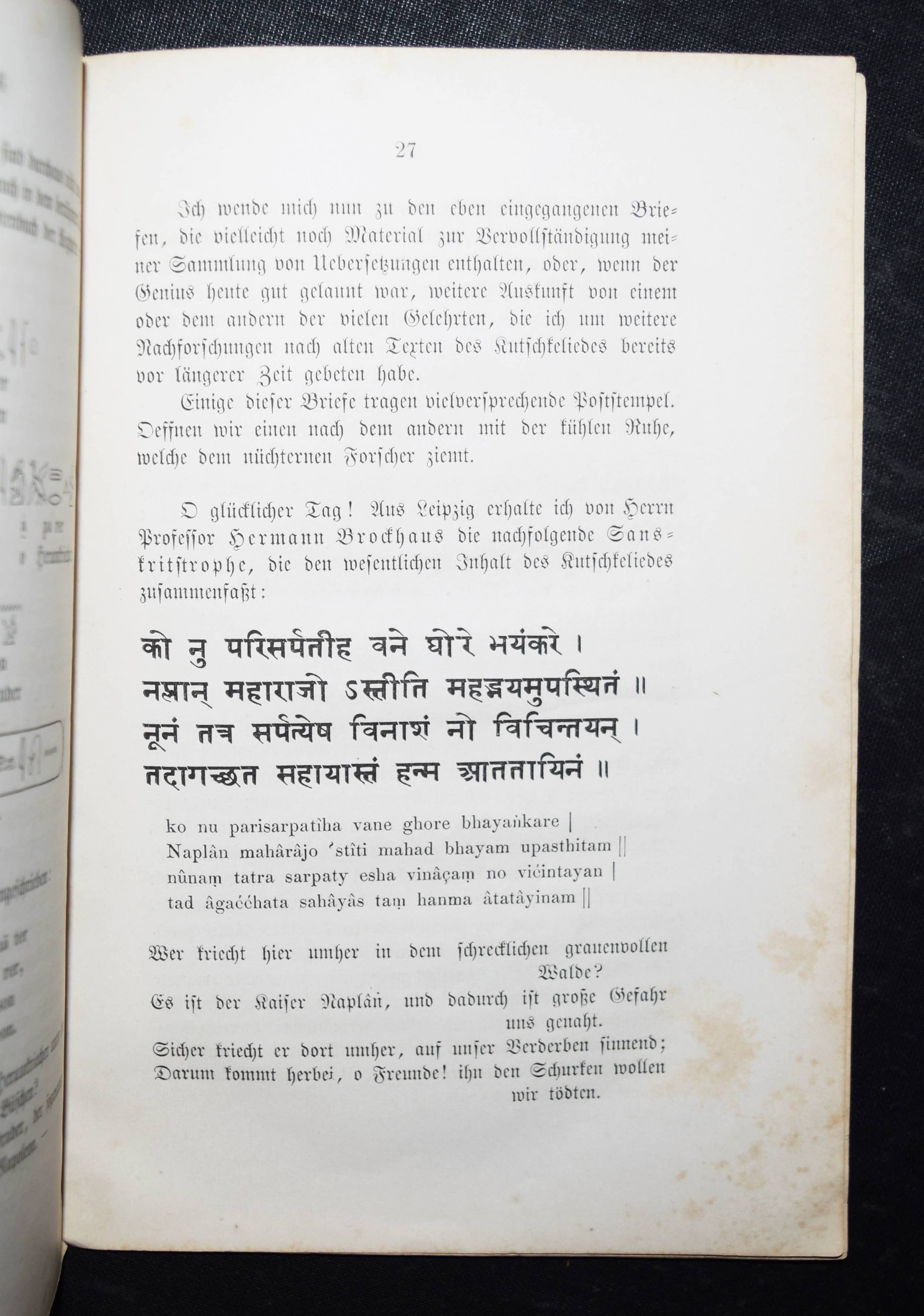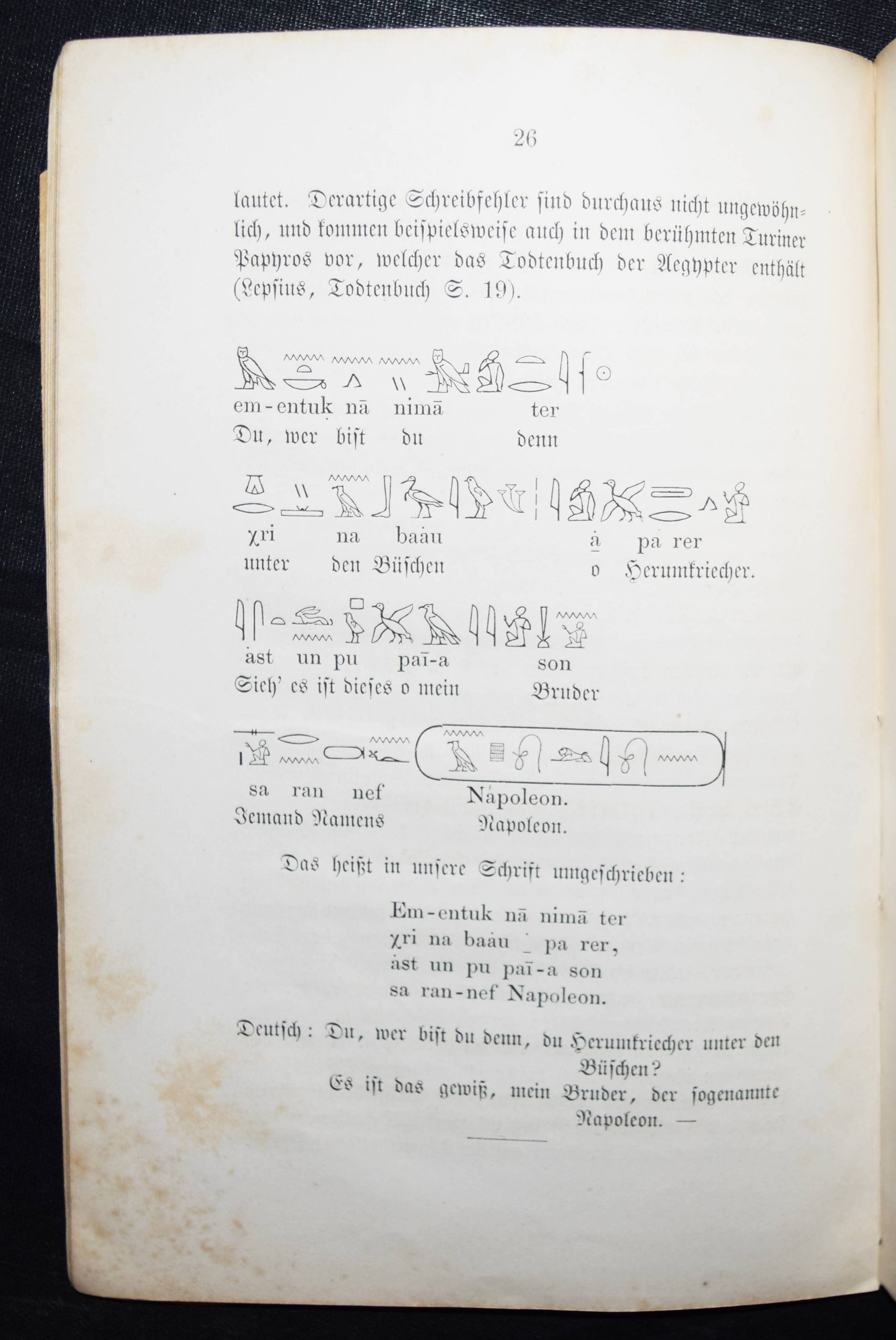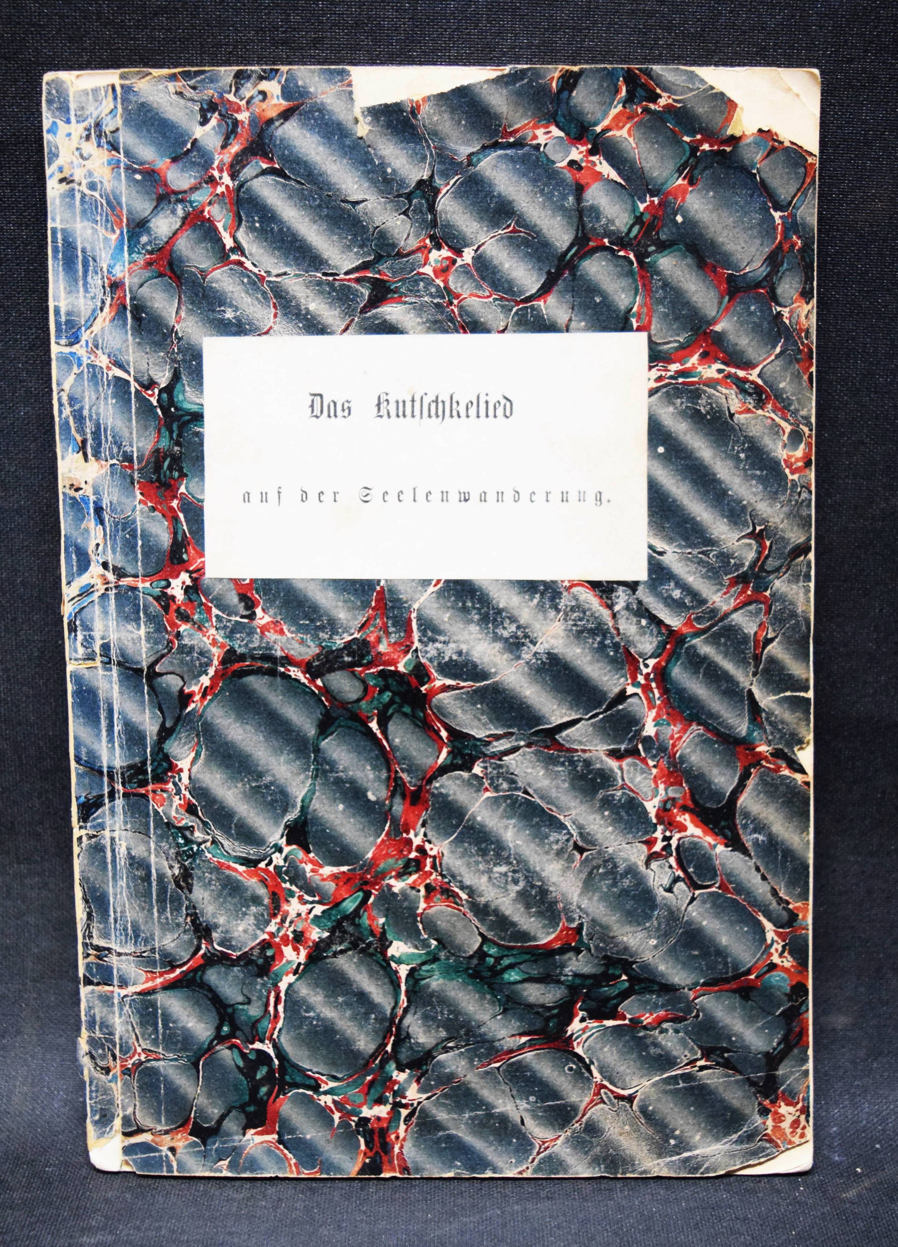 May – Ehrenthal, Wilhelm. Das Kutschkelied auf der Seelenwanderung. Forschungen über die Quellen des Kutschkeliedes im grauen Altertume nebst alten Texten und Übersetzungen in neuen Sprachen. Mit einer Hieroglyphentafel. 2., unveränd. Aufl. Leipzig, Brockhaus 1871. 8°. 48 S. mit 1 doppelblattgr. lithogr. Tafel. Marm. OKart. mit Deckelschild. „Im Orientroman (von Karl May) singt Hamsad al Dscherbaja das Kutschke-Lied, (er) behauptet, Liedtext und Melodie selbst gemacht zu haben, und wird von Kara Ben Nemsi, der das Lied kennt, als Lügner entlarvt und als Preuße erkannt“ (KMG, Quellen Karl Mays). Vgl. hierzu auch H. Havlicek, Füsilier trifft Weltreisenden: Kutschke und Karl May. In: Wiener Karl-May-Brief, Heft 3/2007, S. 7. – Das aus dem Deutsch-Französischen Krieg von 1870/71 überlieferte „Kutschkelied“ erschien zuerst in den Mecklenburgischen Nachrichten vom 22. August 1870 und am 6. September 1870 in der Kölnischen Zeitung. Der Name geht auf den angeblichen Verfasser einen „Füsilier Kutschke“ zurück. Ein Redakteur der Kölnischen Zeitung stellte aber endgültig fest, dass der tatsächliche Urheber der Erstfassung Hermann Alexander Pistorius (1811–1877), Feldprediger im Deutsch-Französischen Krieg, war.Die vorliegende humoristische Abhandlung von W. Ehrenthal enthält angebliche Belege für die Entstehung und Verbreitung des Lieds seit der Antike und bringt am Ende Übersetzungen des Lieds in Holländisch, Dänisch, Englisch, Russisch, Polninsch, Litthauisch, Oberwendisch, Italienisch, Spanisch und Latein. Die Tafel zeigt ein antikes Fragment mit Hieroglyphen-Zeichen. – Rücken etwas eingerissen u. berieben, Umschlag mit Randläsuren, stellenweise leicht braunfleckig.