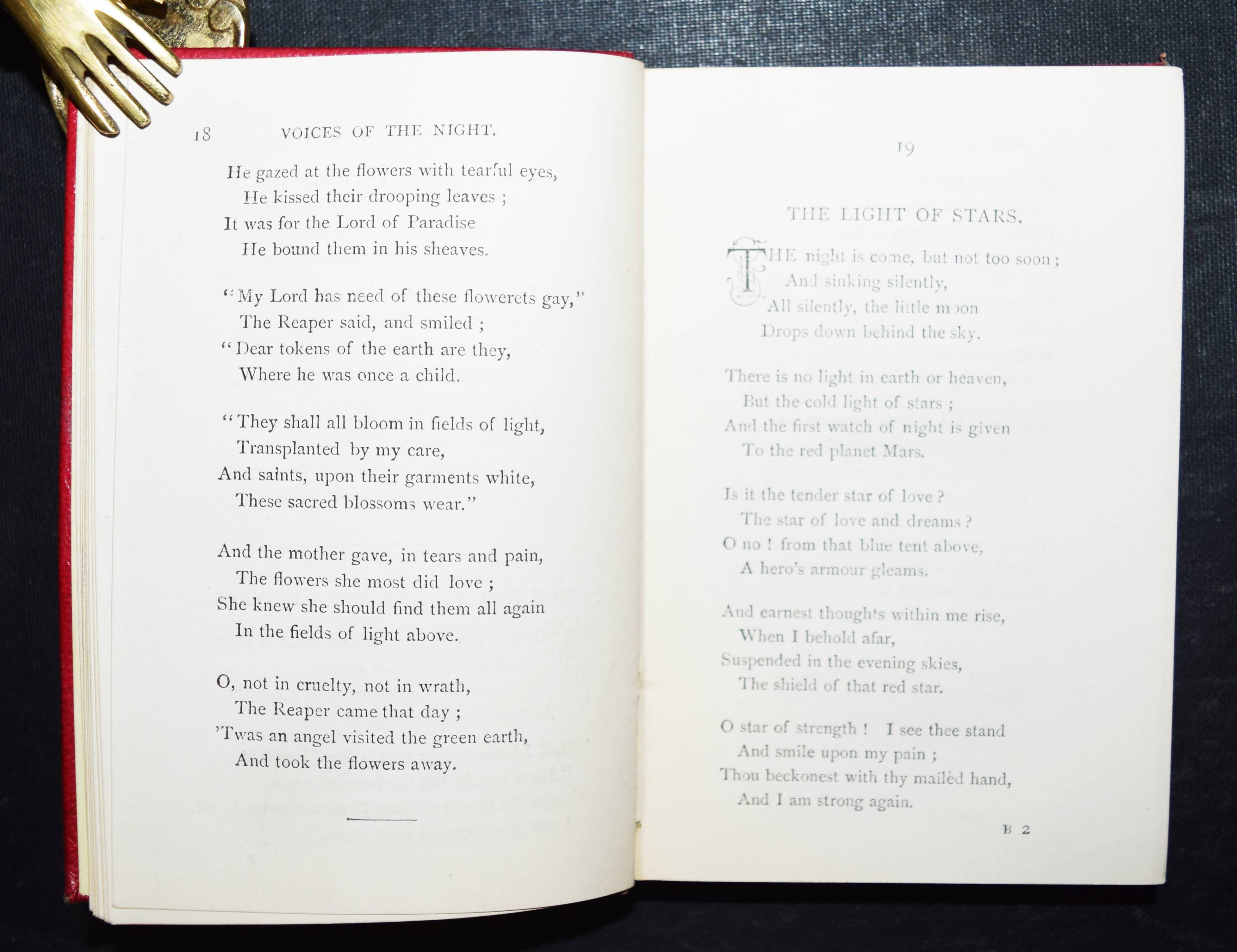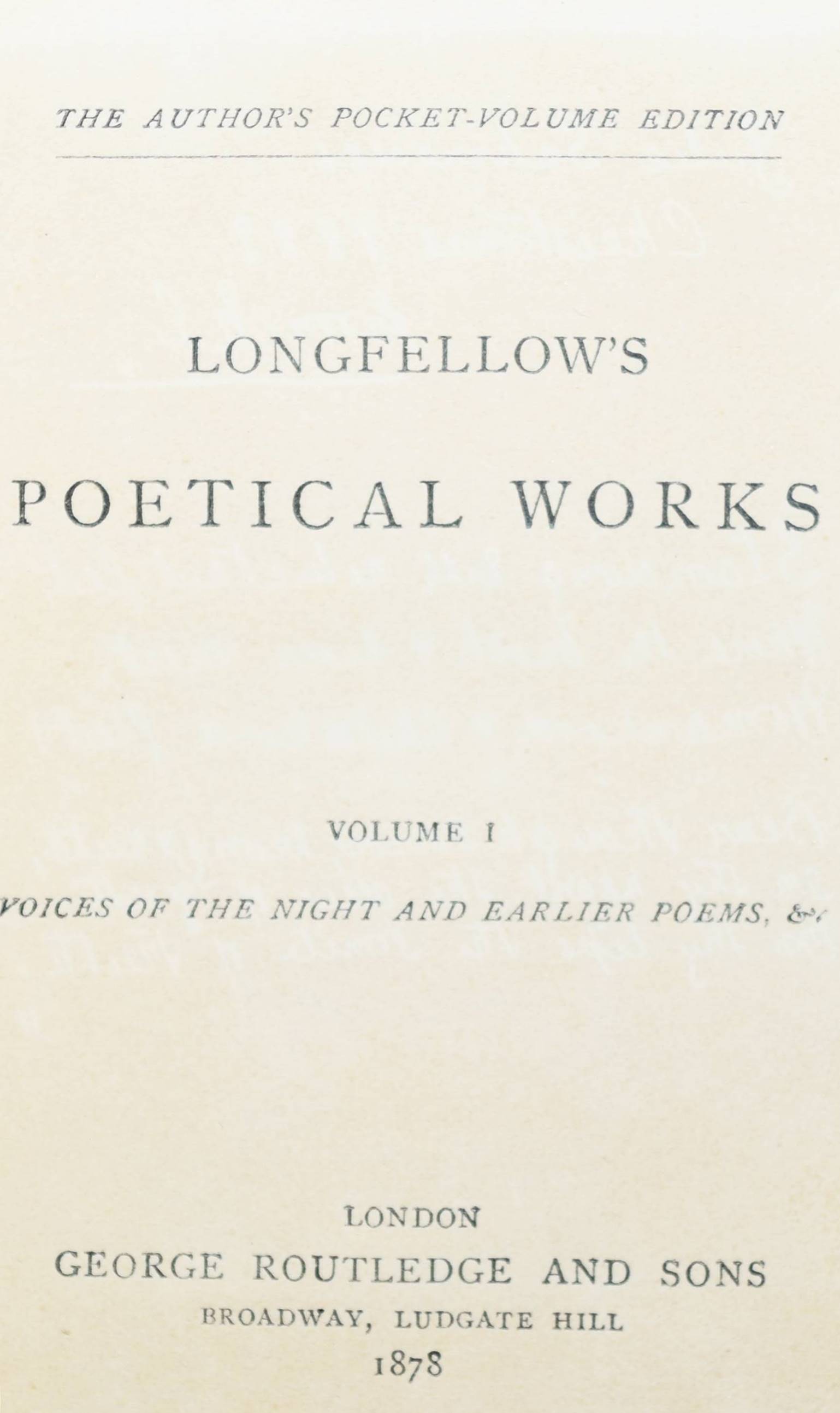 Longfellow, (Henry Wadsworth). Poetical works. 11 Bände. London, Routledge and sons 1878. 12° (12,8 x 8,5 cm.). Weinrote OLdr. mit goldgepr. Rückentiteln u. Goldschnitt. (The author’s pocket-volume edition). Exlibris in allen Bänden und priv. zeitgenöss. Widm. in Band I, Einbände etwas berieben, sonst gutes Exemplar der komplett seltenen Taschenausgabe.