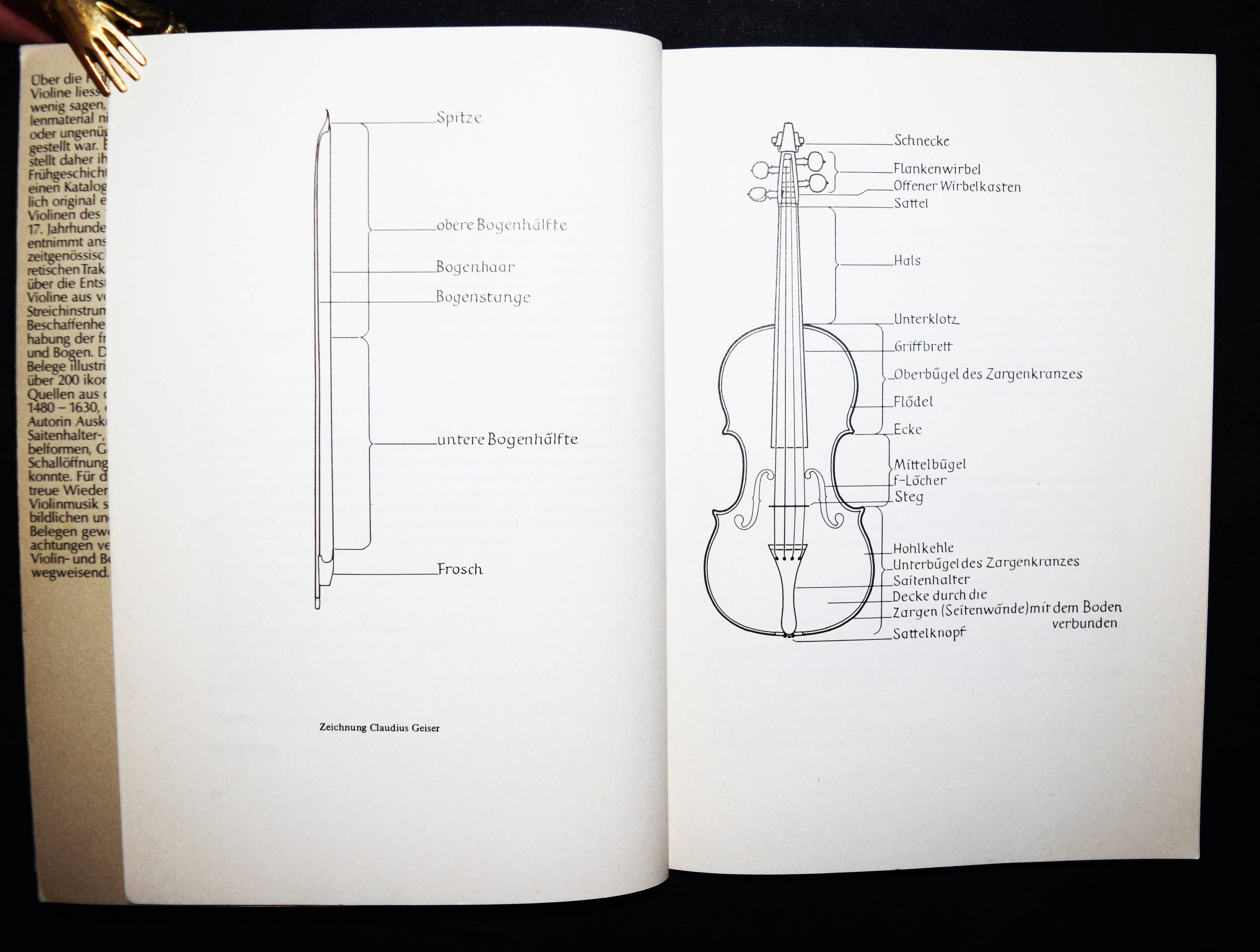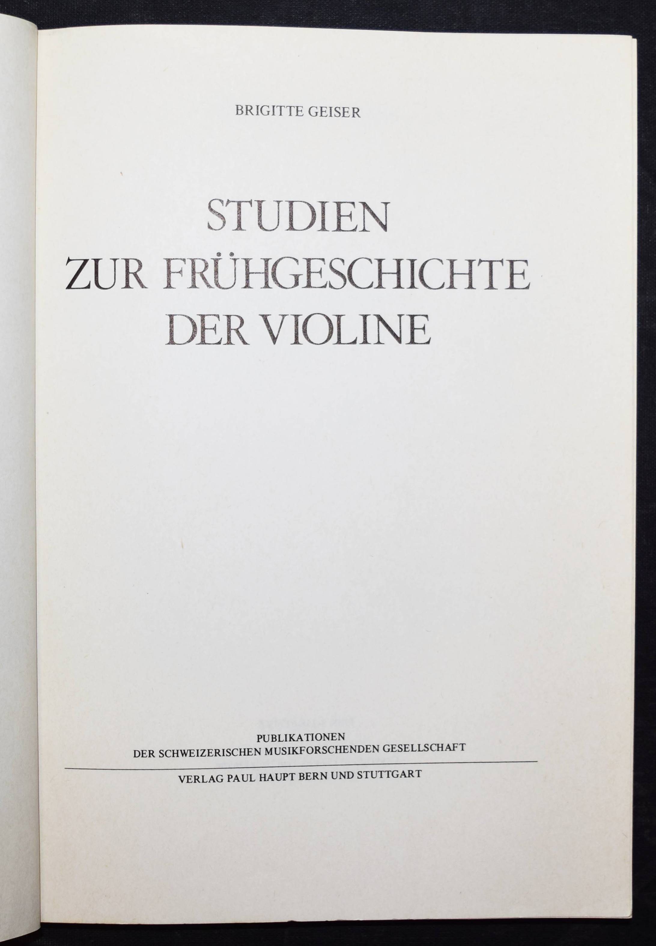 (Bachmann-)Geiser, Brigitte. Studien zur Frühgeschichte der Violine. Bern, Stuttgart, Haupt (1974). 8°. 137 S., [28] Bl. Abb. OKart. mit illustr. OU. (Publikationen der Schweizerischen Musikforschenden Gesellschaft, Serie 2, 25). Einzige Ausgabe, selten. – Mit eigenhändiger Widmung und Postkarte von B. Geiser für ihren Onkel, den niederl. Musikwissenschaftler John Henry van der Meer (1920-2008), der 1963-1983 Leiter der Sammlung historischer Musikinstrumente im Germanischen Nationalmuseum in Nürnberg war. – Gutes Exemplar.