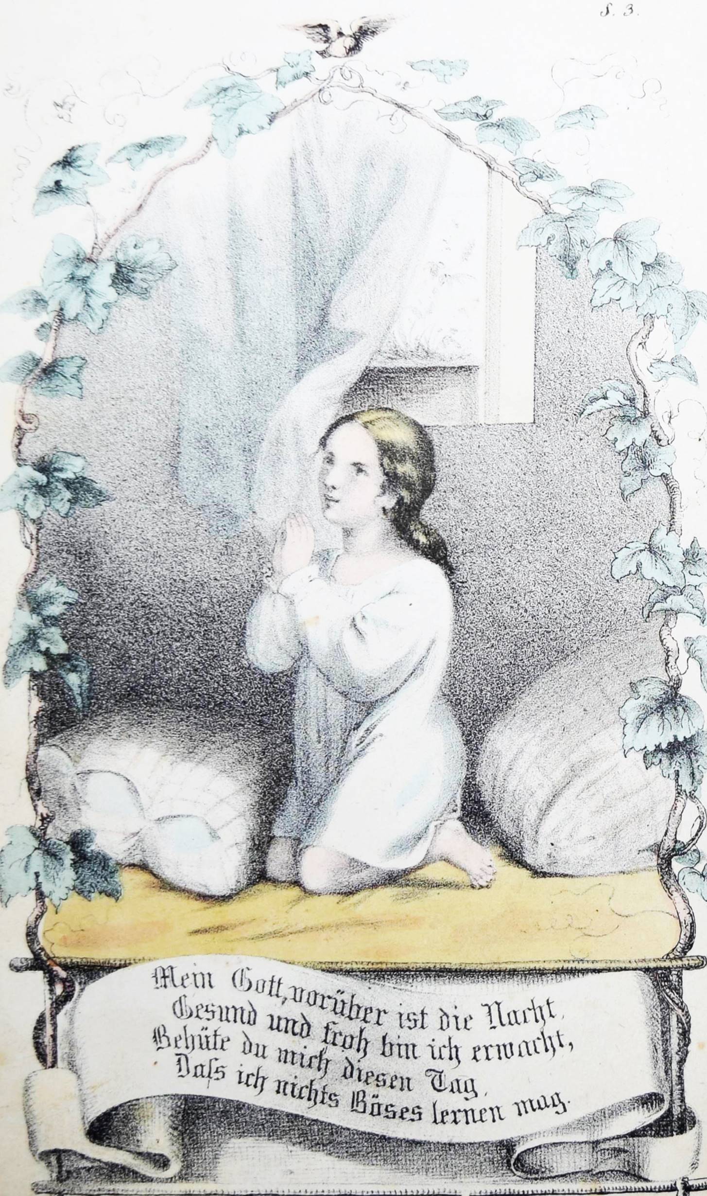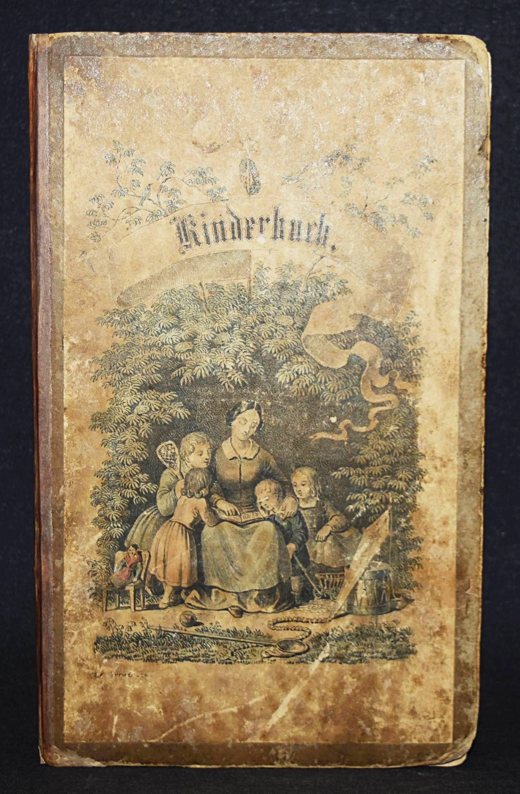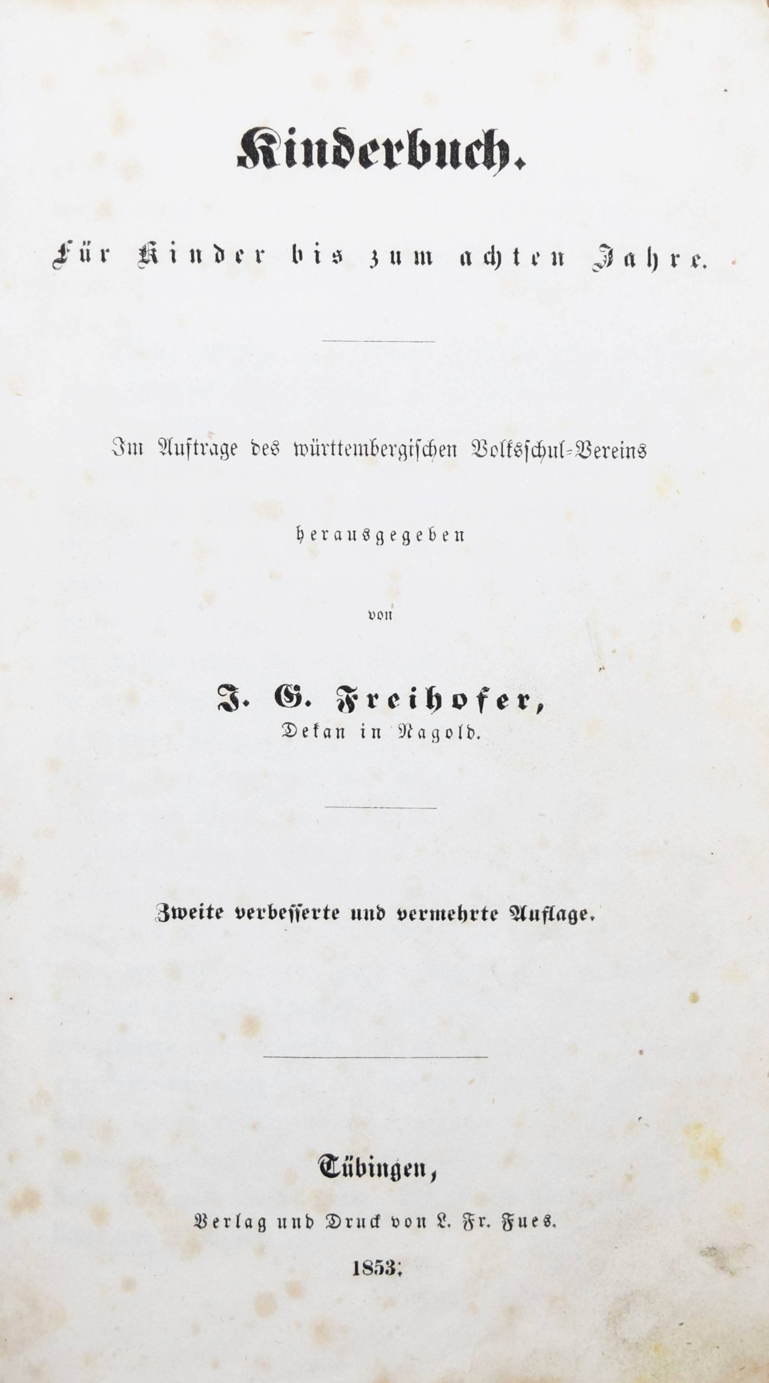Freihofer, J(ohann) G(eorg). Kinderbuch. Für Kinder bis zum achten Jahre. Im Auftrage des württembergischen Volksschul-Vereins herausgegeben. 2. verb. u. verm. Aufl. Tübingen, Fues 1853. 8°. XVIII, 172, 8 S. (Musikanhang), 1 Bl. mit 6 handkol. lithogr. Tafeln v. A(ugust) Corrodi. Pbd. d. Zt. mit mont. handkol. Deckelbild. Klotz 1617/1. Seebaß I, 670. Wegehaupt II, 920. Vgl. Brunken-Hurrelmann-Pech 231 u. Sp. 994 ff. (ausführl.). Hauswedell 432. LKJ IV, 201 f. (EA v. 1845). – Oft aufgelegte Anthologie, die vielen zeitgenössischen Herausgebern und Pädagogen als Anregung und Vorbild diente. Das „Kinderbuch“ richtete sich besonders an Kinder bis zum achten Lebensjahr und enthält Gedichte, Lieder, Gebete und biblische Geschichten, Wiegenlieder, Fabeln, Märchen, Denksprüche, Rätsel und Spiele. Die Beiträge sind nach jahreszeitlichem Gebrauch geordnet. – Vorliegende Auflage ist mit schönen kolorierten Federlithographien des Schweizer Künstlers Wilhelm August Corrodi (1826-1885) ausgestattet; spätere Ausgaben sind von Friedrich Lossow illustriert. – Rücken unauffällig restauriert, Deckelbild berieben u. stärker braunfleckig, Text u. Tafelränder teils stärker stockfl.