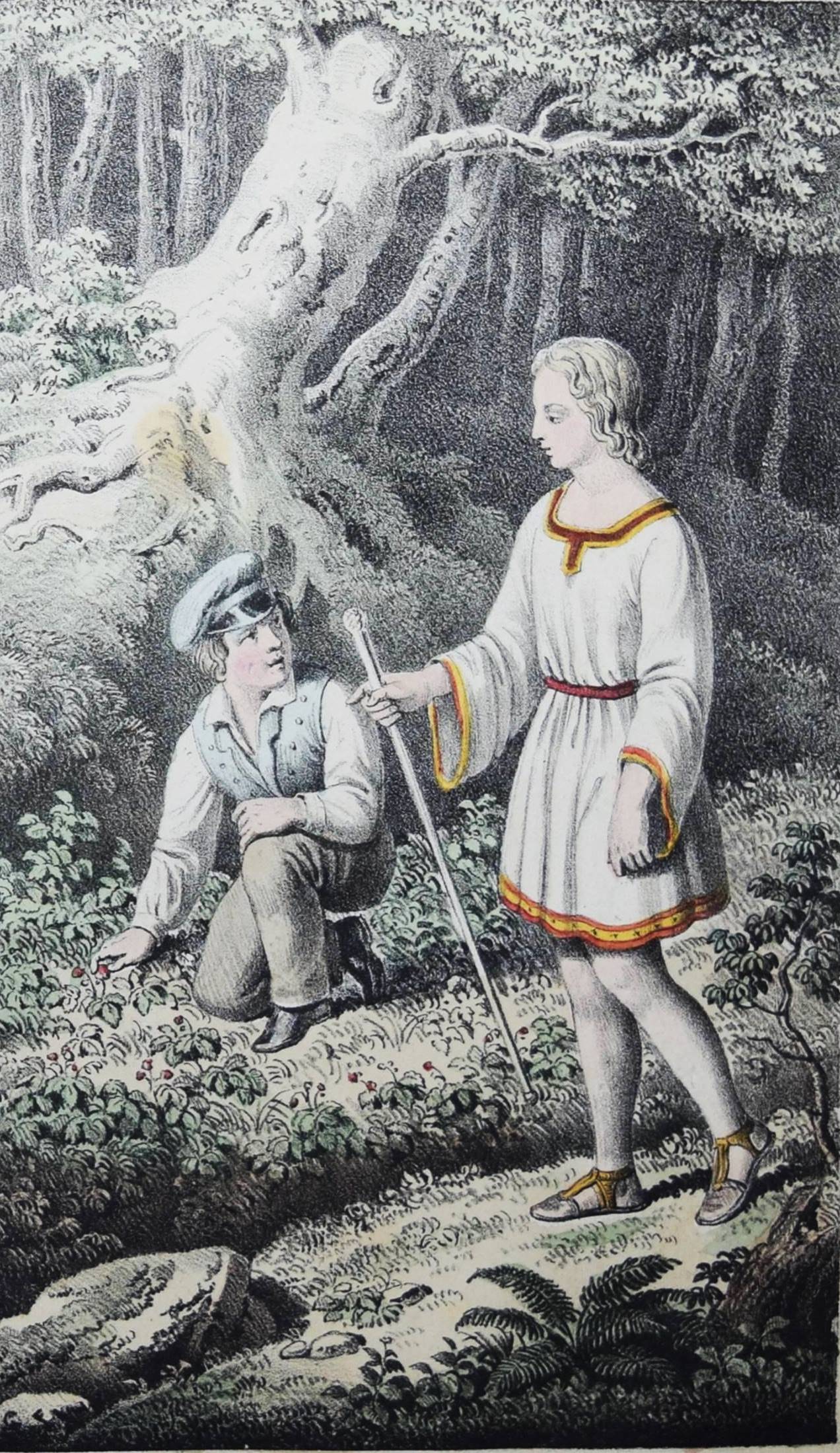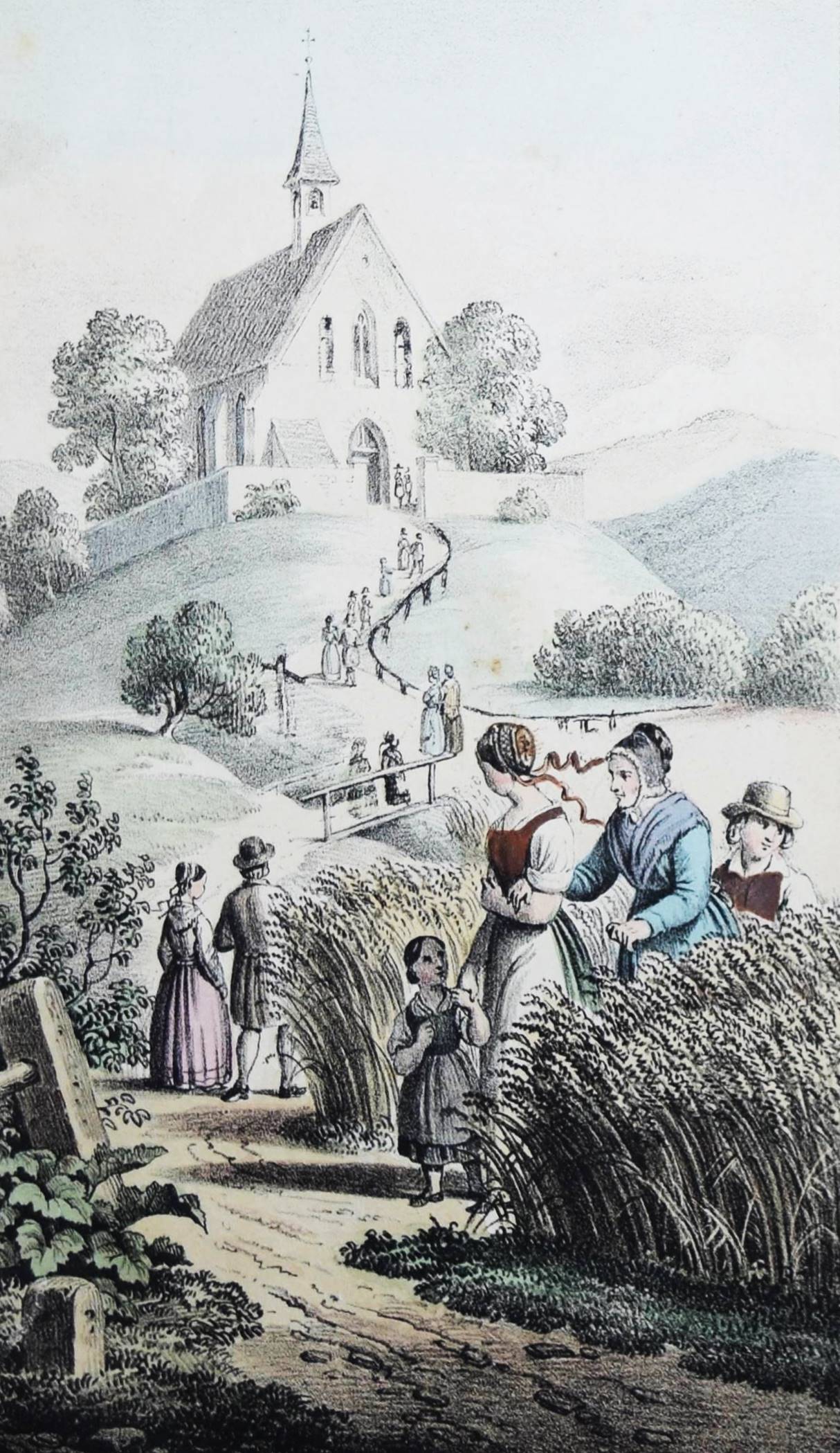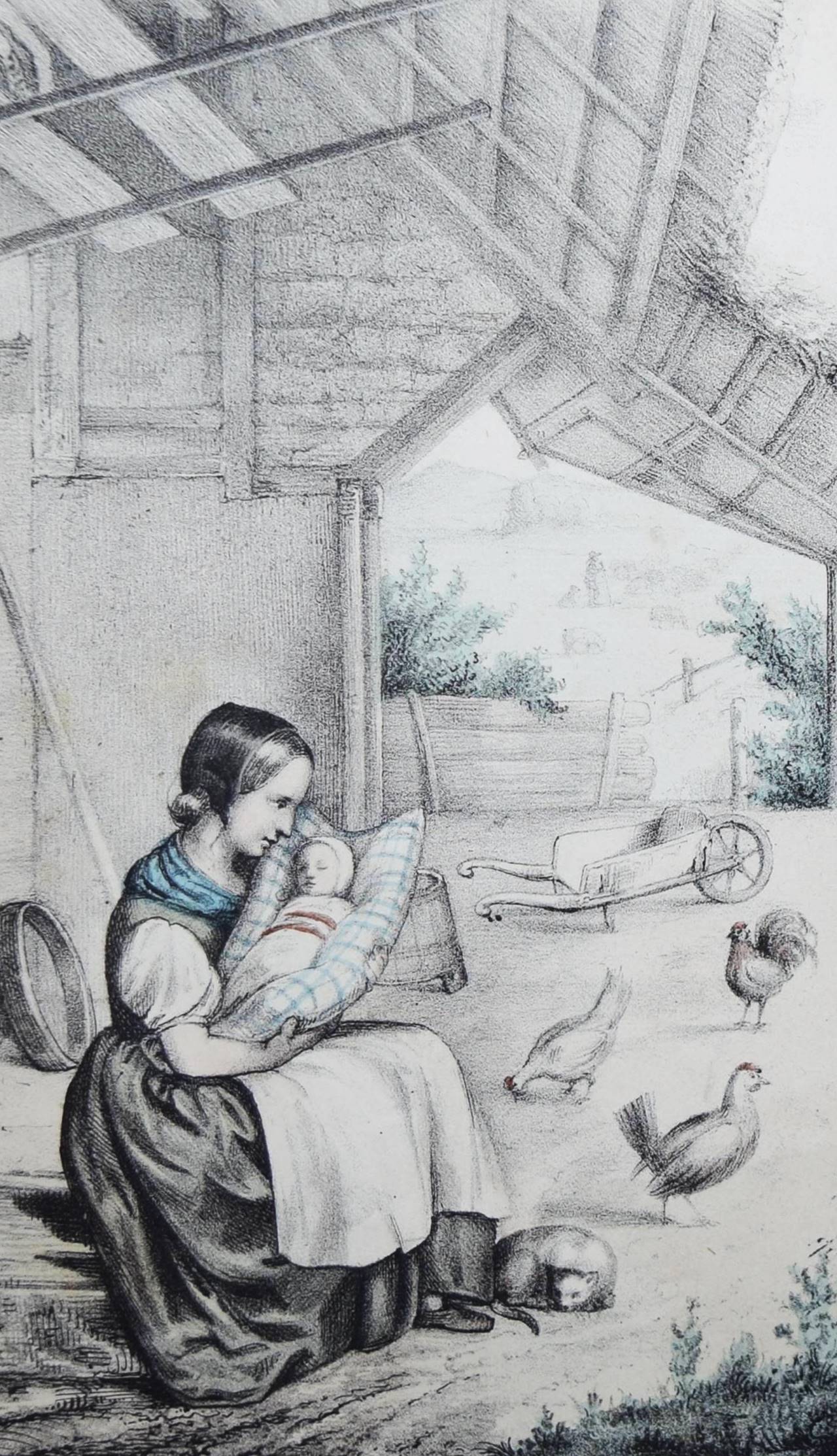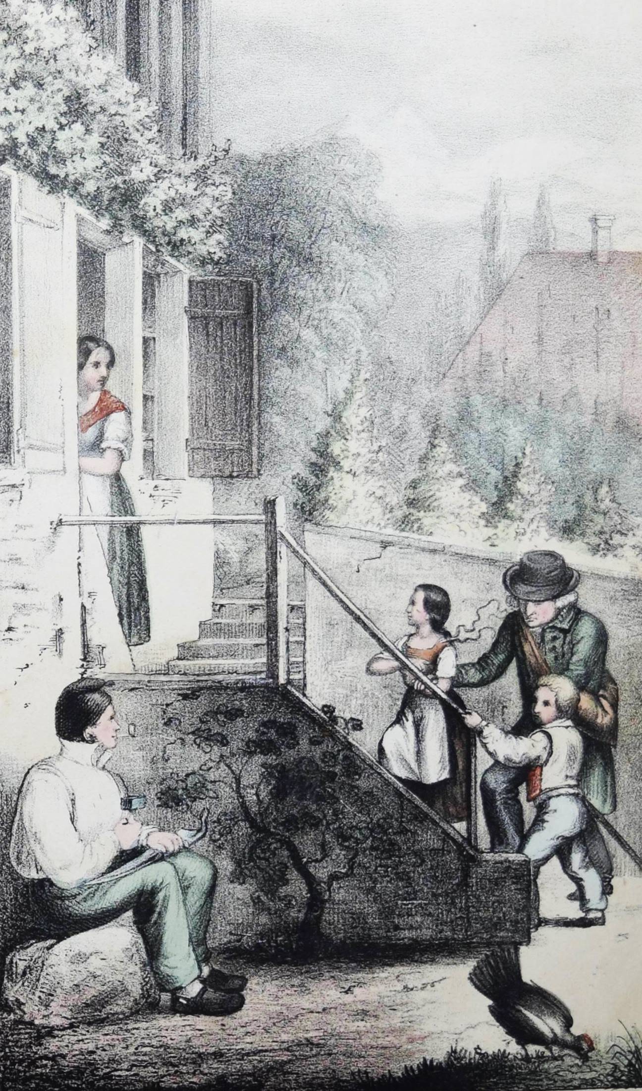 Freihofer, J(ohann) G(eorg). Kinderbuch. Für Kinder bis zum achten Jahre. Im Auftrage des württembergischen Volksschul-Vereins herausgegeben. 2. verb. u. verm. Aufl. Tübingen, Fues 1853. 8°. XVIII, 172, 8 S. (Musikanhang), 1 Bl. mit 6 handkol. lithogr. Tafeln v. A(ugust) Corrodi. Pbd. d. Zt. mit mont. handkol. Deckelbild. Klotz 1617/1. Seebaß I, 670. Wegehaupt II, 920. Vgl. Brunken-Hurrelmann-Pech 231 u. Sp. 994 ff. (ausführl.). Hauswedell 432. LKJ IV, 201 f. (EA v. 1845). – Oft aufgelegte Anthologie, die vielen zeitgenössischen Herausgebern und Pädagogen als Anregung und Vorbild diente. Das „Kinderbuch“ richtete sich besonders an Kinder bis zum achten Lebensjahr und enthält Gedichte, Lieder, Gebete und biblische Geschichten, Wiegenlieder, Fabeln, Märchen, Denksprüche, Rätsel und Spiele. Die Beiträge sind nach jahreszeitlichem Gebrauch geordnet. – Vorliegende Auflage ist mit schönen kolorierten Federlithographien des Schweizer Künstlers Wilhelm August Corrodi (1826-1885) ausgestattet; spätere Ausgaben sind von Friedrich Lossow illustriert. – Rücken unauffällig restauriert, Deckelbild berieben u. stärker braunfleckig, Text u. Tafelränder teils stärker stockfl.
