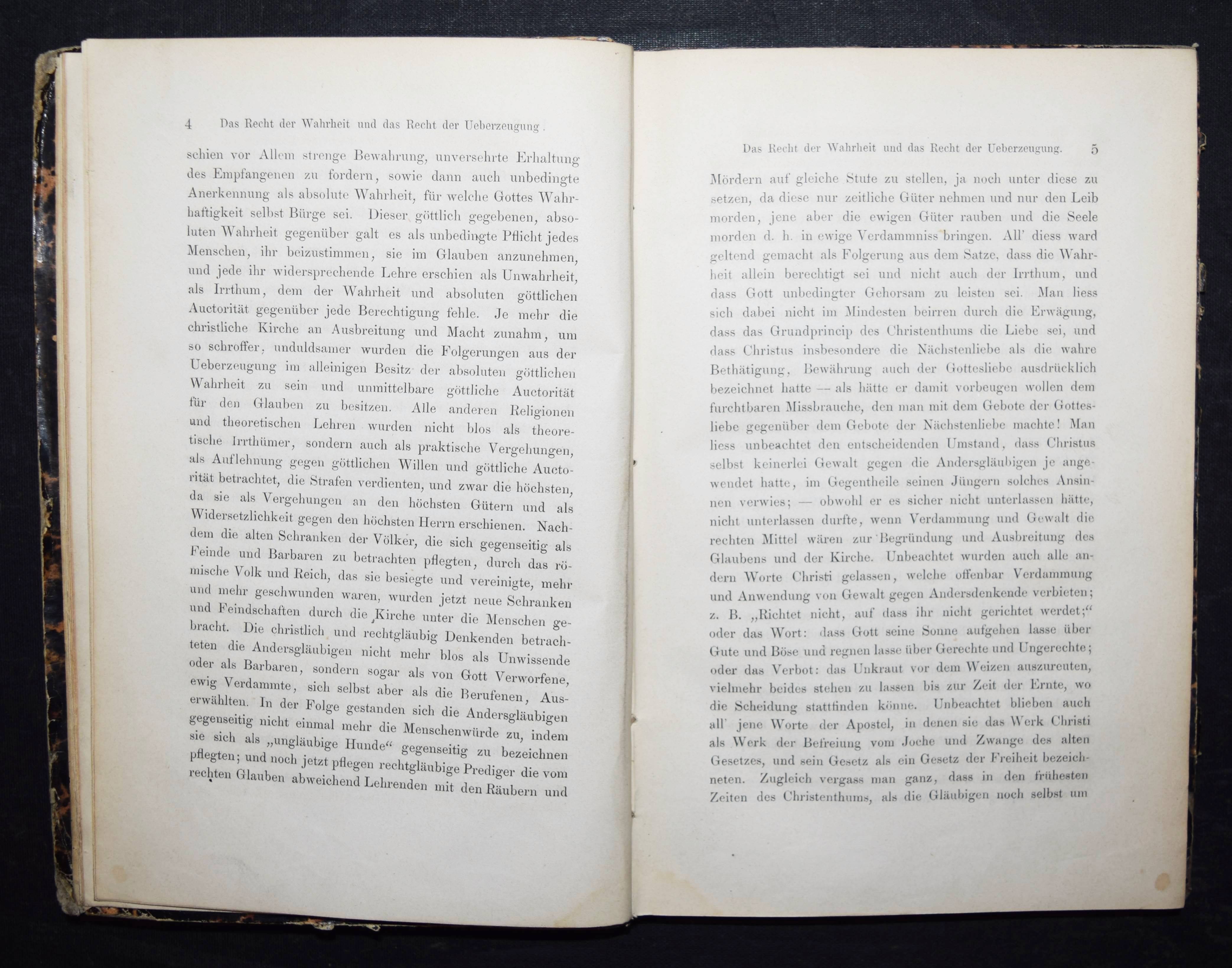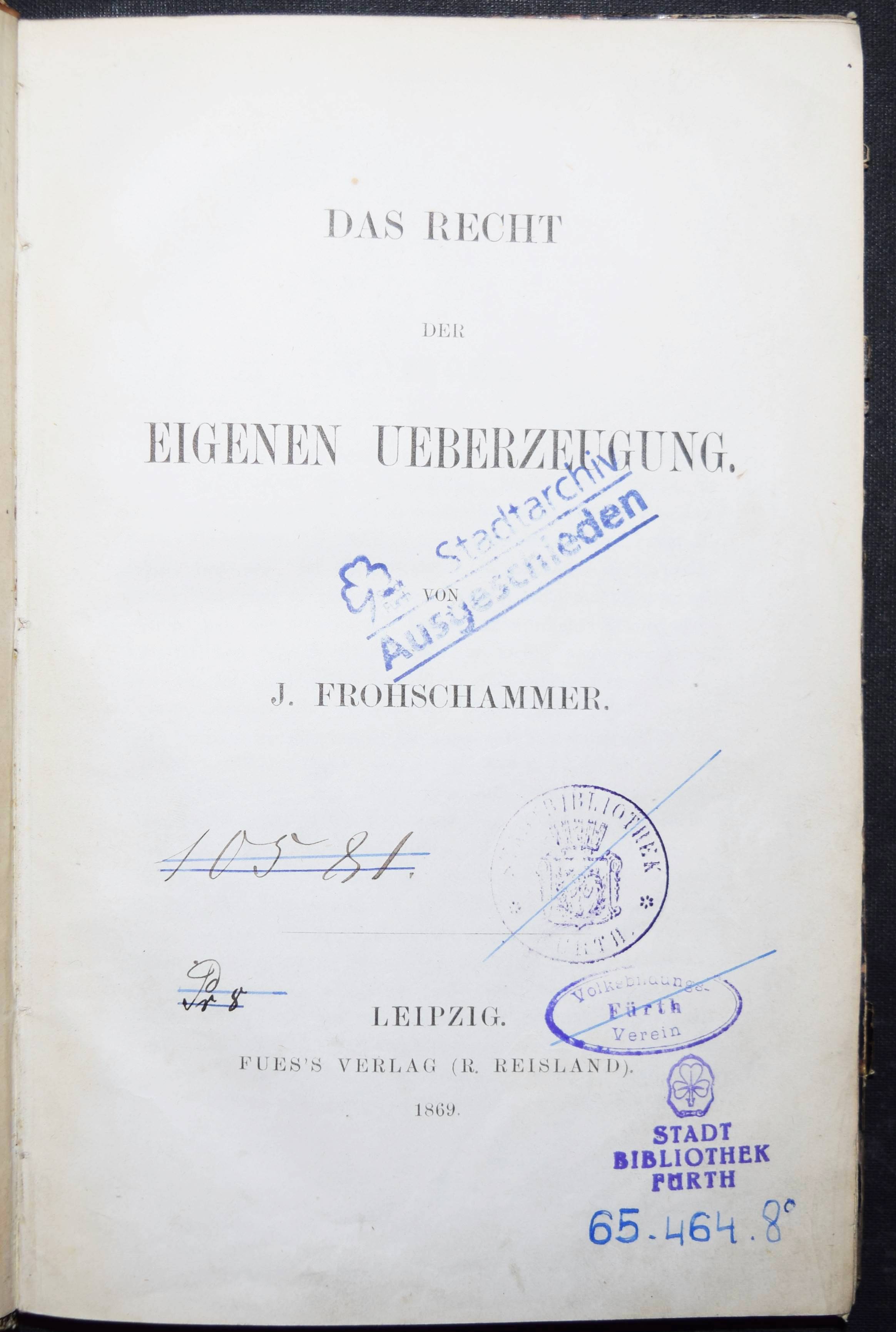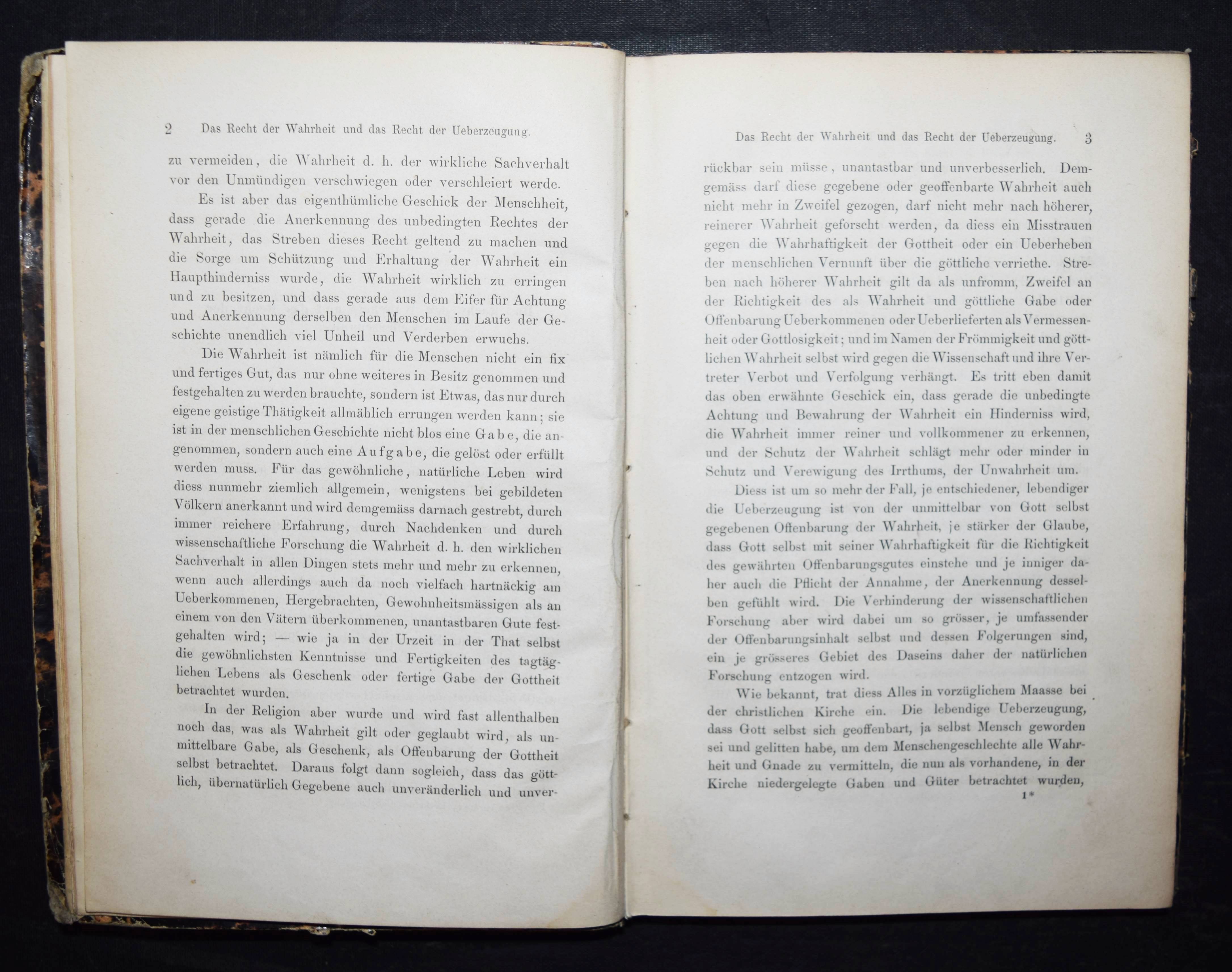 Frohschammer, Jakob. Das Recht der eigenen Ueberzeugung. Leipzig, Fues 1869. Gr.-8°. XV, 238 S. Hln. d. Zt. Ziegenfuss I, 369. – Erste Ausgabe. – J. Frohschammer (1821-1893) „tritt kämpferisch für die Selbständigkeit der Philosophie gegenüber der Theologie ein. Philosophie soll nicht bloß Erkenntnislehre sein. Sie ist Wissenschaft von der idealen Wahrheit und ist Erklärung der Welt“ (W. Ziegenfuss). – Einband berieben, Kanten bestoßen, St. a. T., sonst gutes Exemplar.