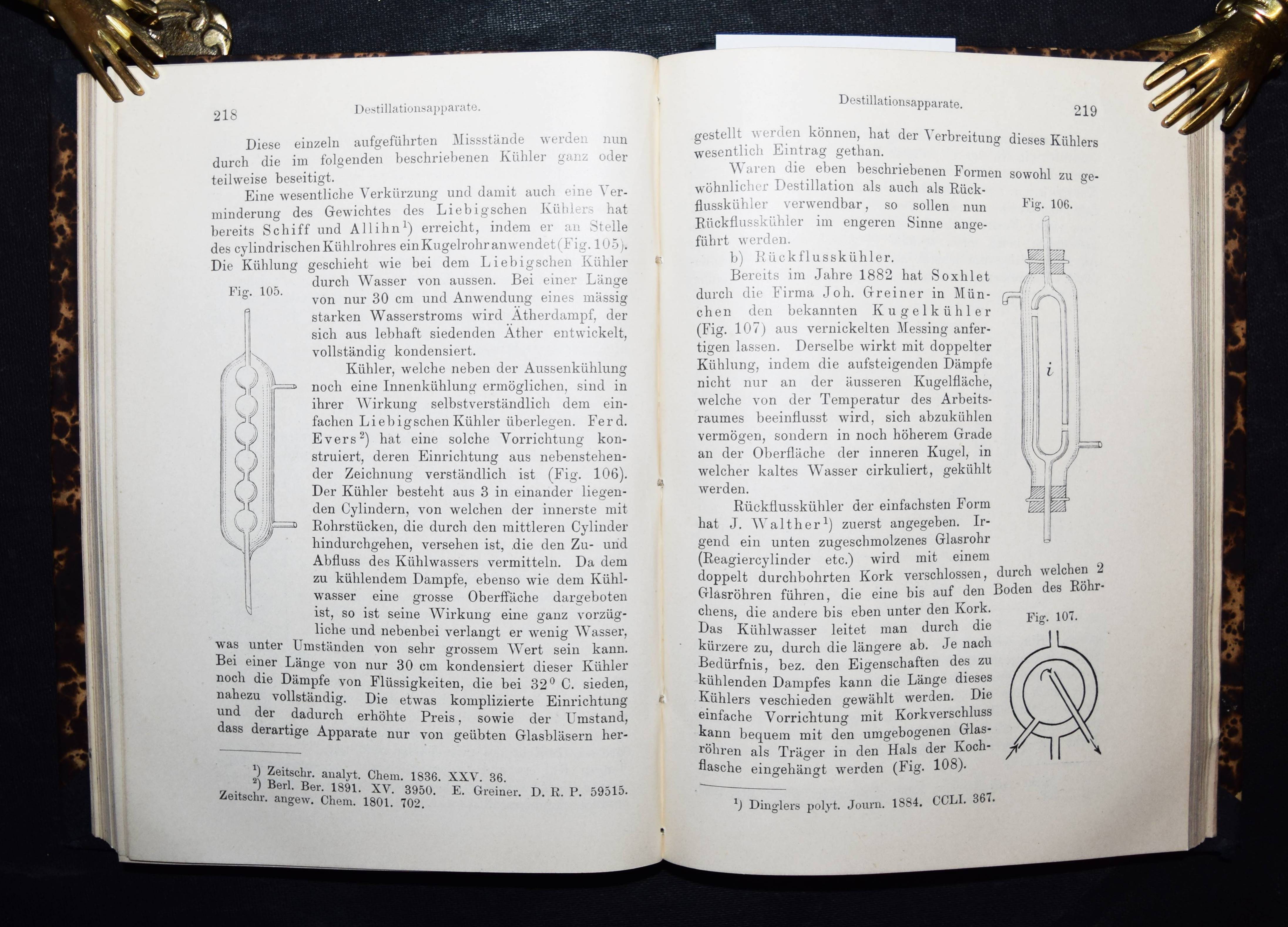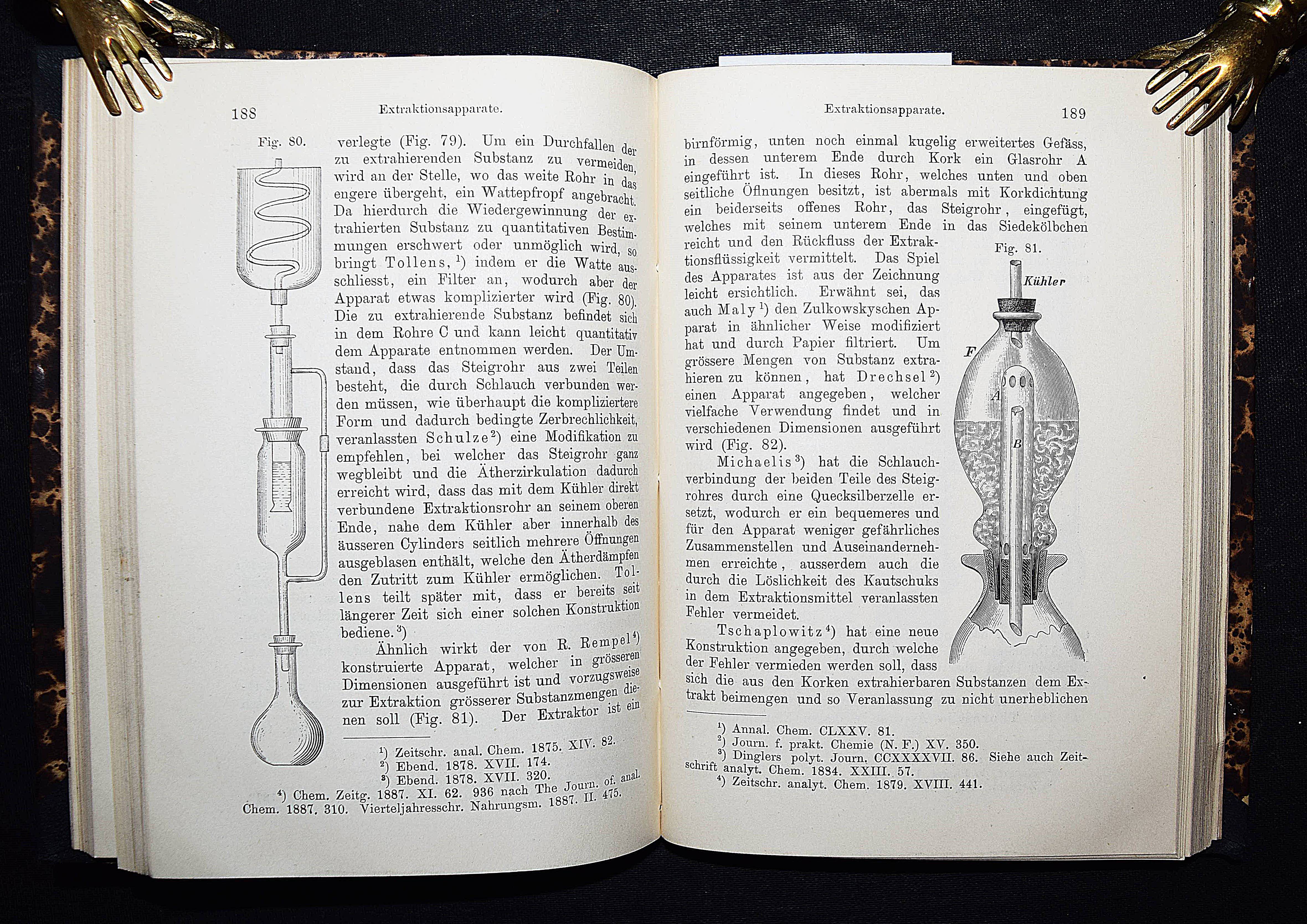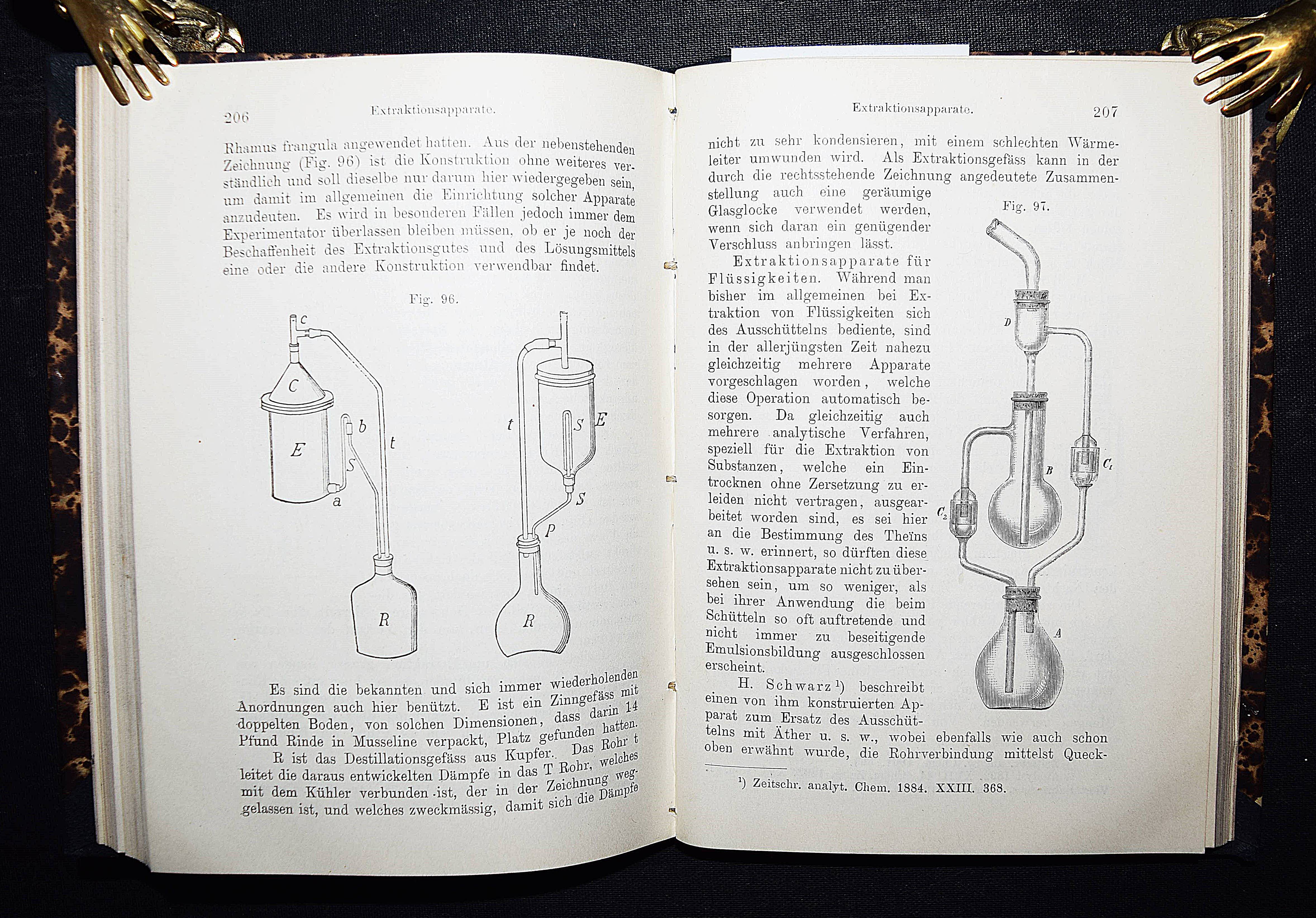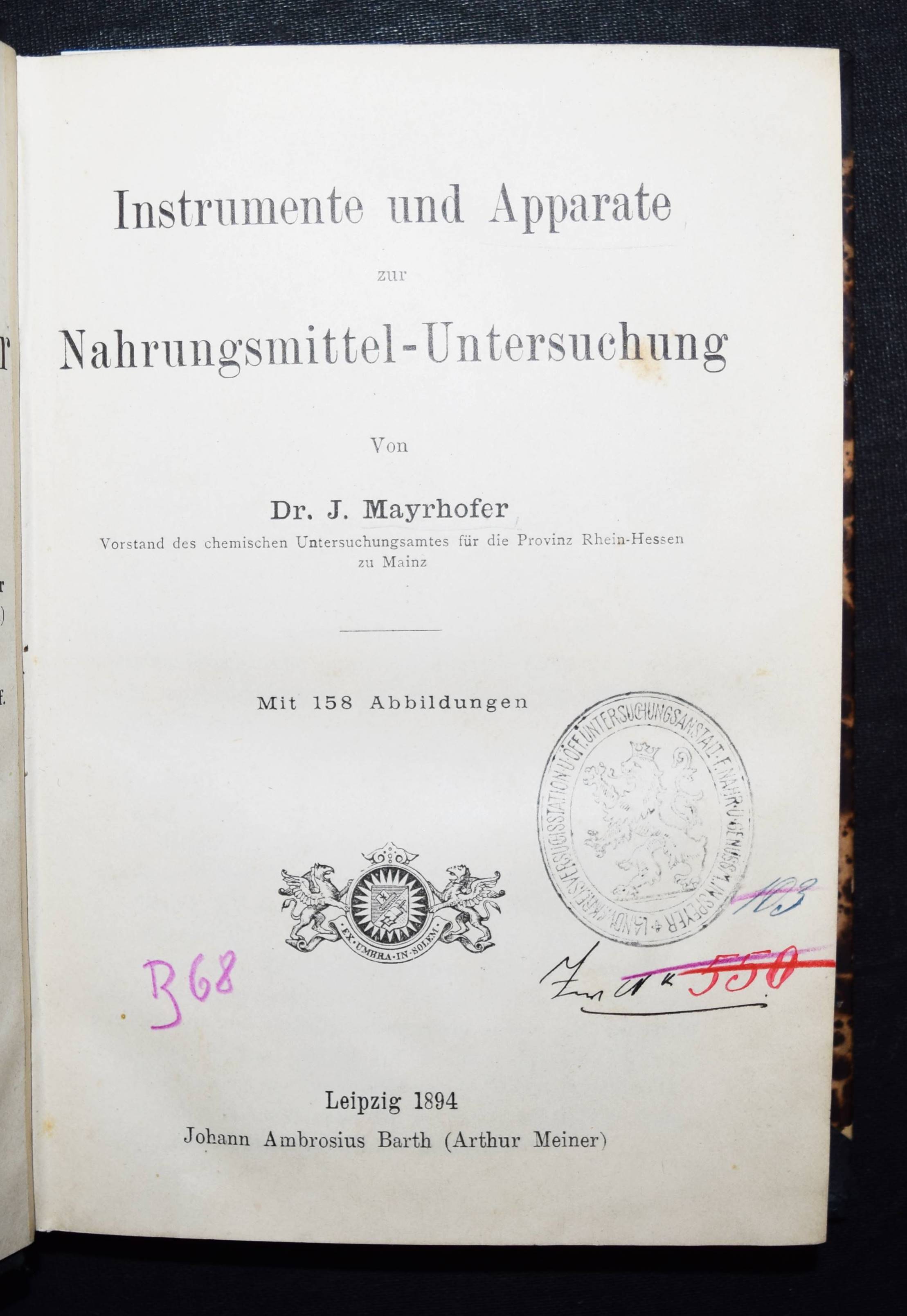 Mayrhofer, J(osef). Instrumente und Apparate zur Nahrungsmittel-Untersuchung. Leipzig, Barth 1894. 8°. XI, 324 S., 4 Bl. mit 158 Holzschnitt-Abb. Hln. d. Zt. mit goldgepr. Rückentitel u. Rückenverg. (Bibliothek für Nahrungsmittel-Chemiker, Band 3). OBL VI, 14. – Erste und einzige Ausgabe. – Der österr. Chemiker J. Mayrhofer (1848-1930) war „von 1882–89 an der Staatlichen Untersuchungsanstalt für Nahrungs- und Genußmittel in Erlangen und 1890–1921 als Leiter des Chem. Untersuchungsamtes für die Provinz Rheinhessen in Mainz tätig. M.s Arbeiten betreffen vorwiegend das Gebiet der Weinforschung“ (W. Oberhummer). – St.a.T., gutes Exemplar.