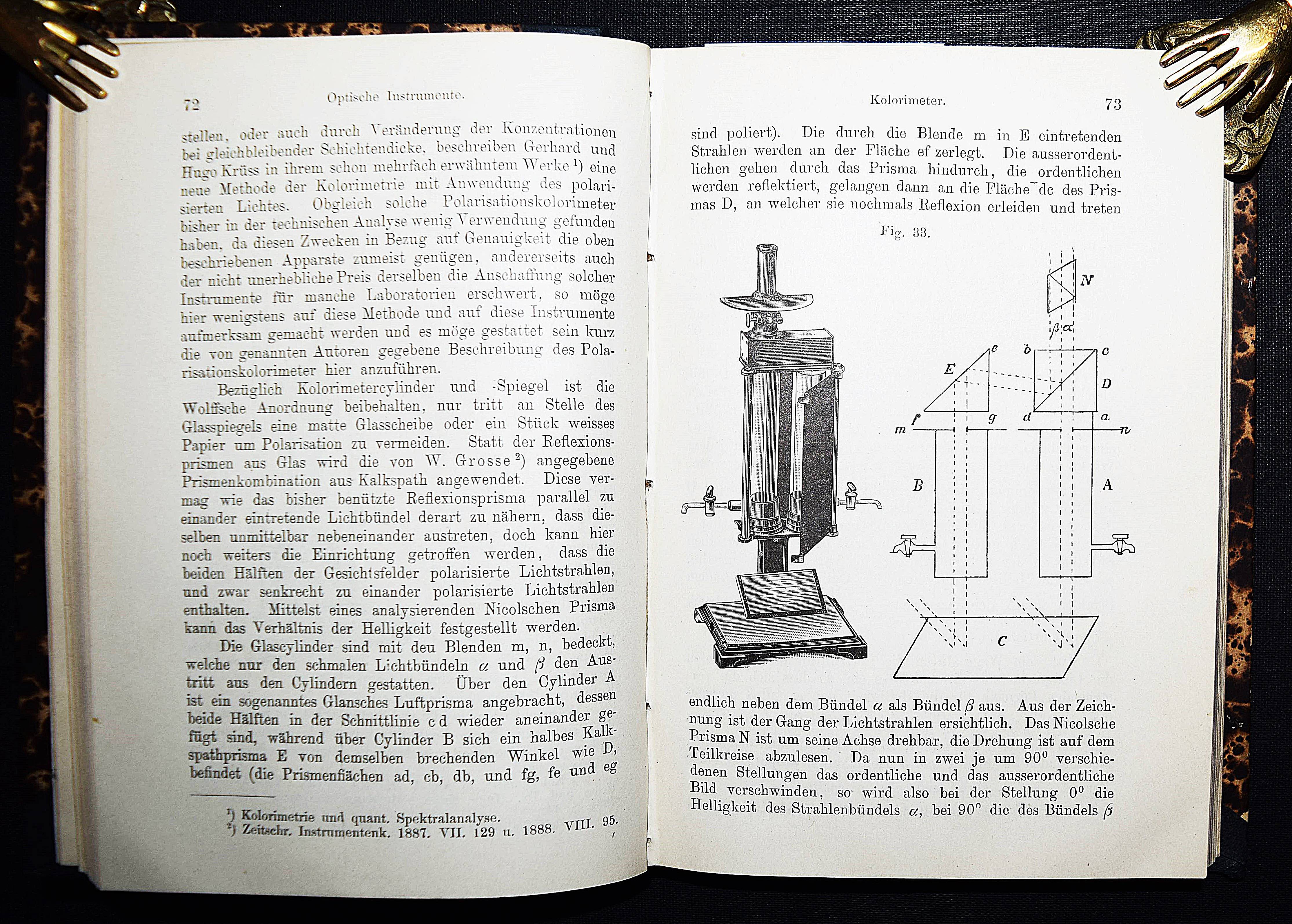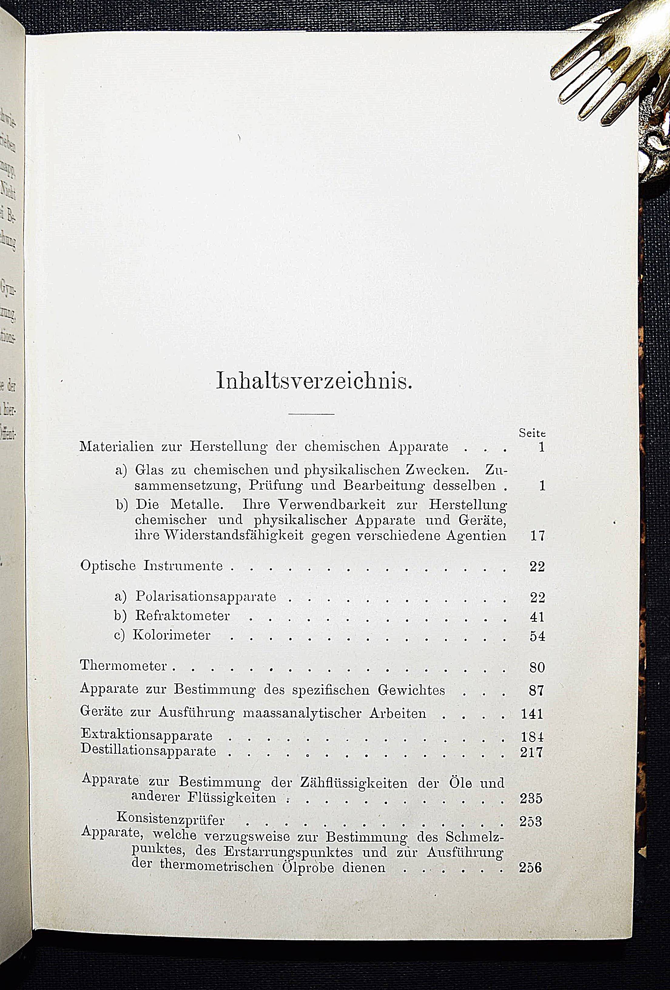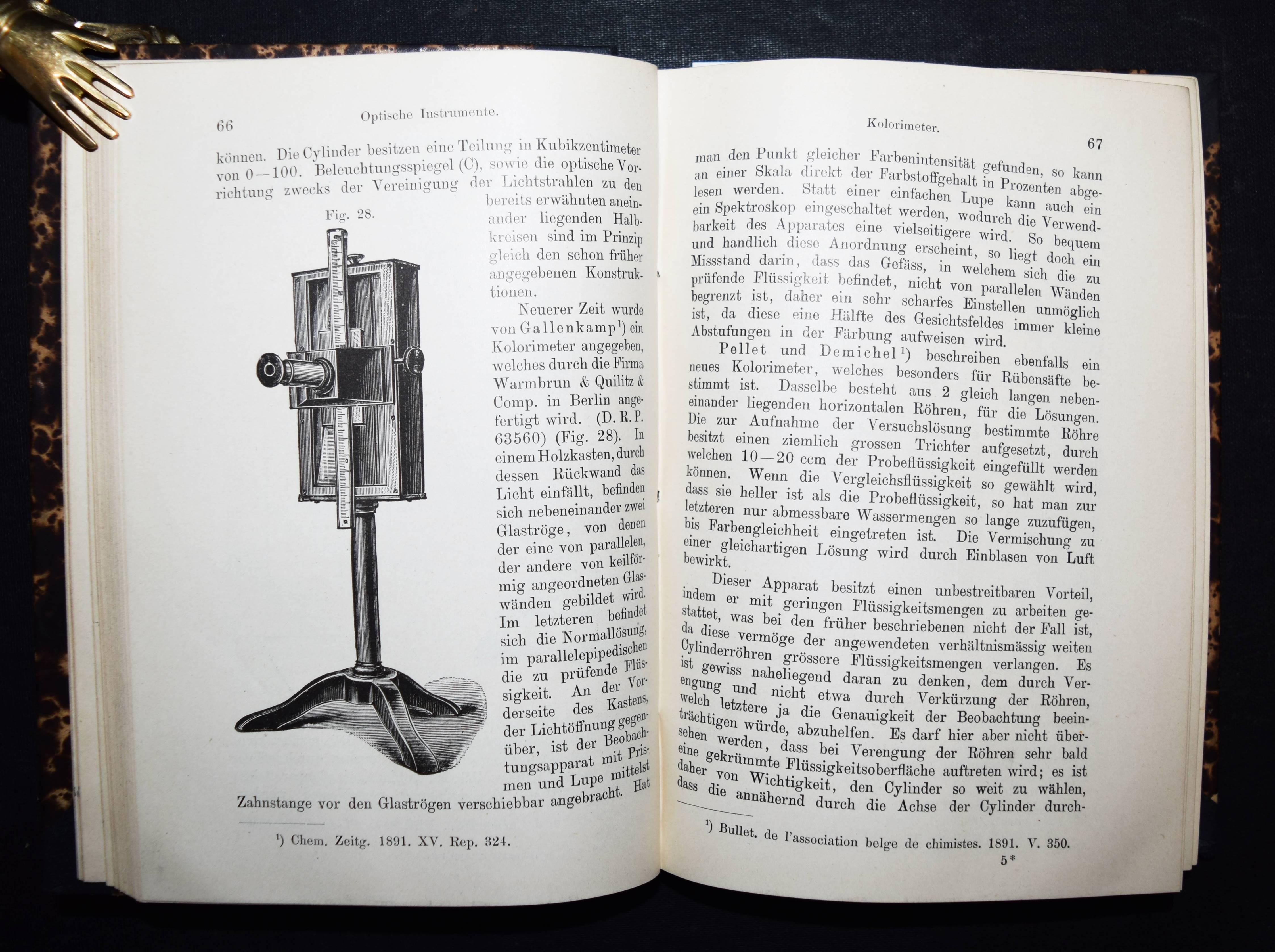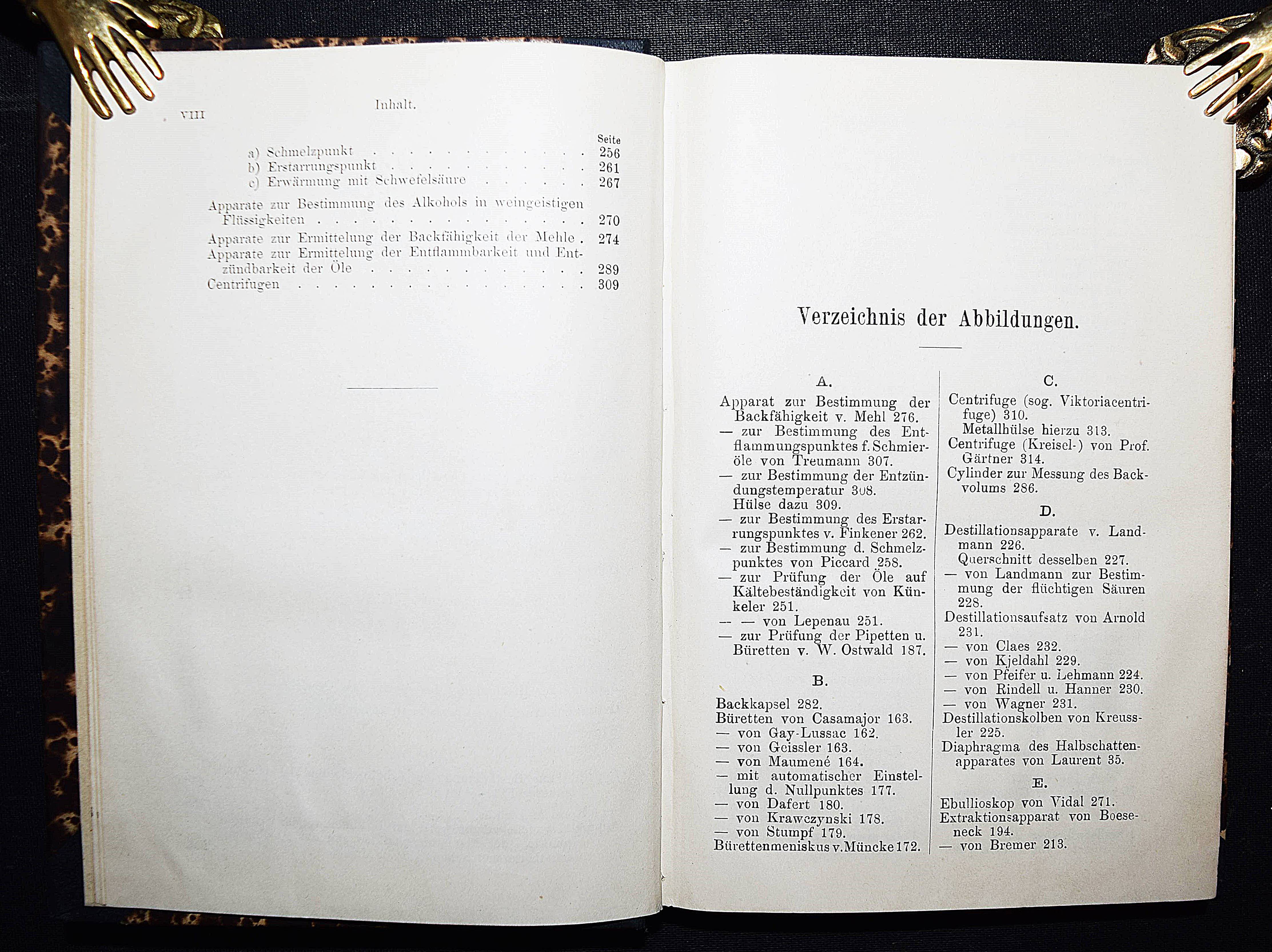 Mayrhofer, J(osef). Instrumente und Apparate zur Nahrungsmittel-Untersuchung. Leipzig, Barth 1894. 8°. XI, 324 S., 4 Bl. mit 158 Holzschnitt-Abb. Hln. d. Zt. mit goldgepr. Rückentitel u. Rückenverg. (Bibliothek für Nahrungsmittel-Chemiker, Band 3). OBL VI, 14. – Erste und einzige Ausgabe. – Der österr. Chemiker J. Mayrhofer (1848-1930) war „von 1882–89 an der Staatlichen Untersuchungsanstalt für Nahrungs- und Genußmittel in Erlangen und 1890–1921 als Leiter des Chem. Untersuchungsamtes für die Provinz Rheinhessen in Mainz tätig. M.s Arbeiten betreffen vorwiegend das Gebiet der Weinforschung“ (W. Oberhummer). – St.a.T., gutes Exemplar.