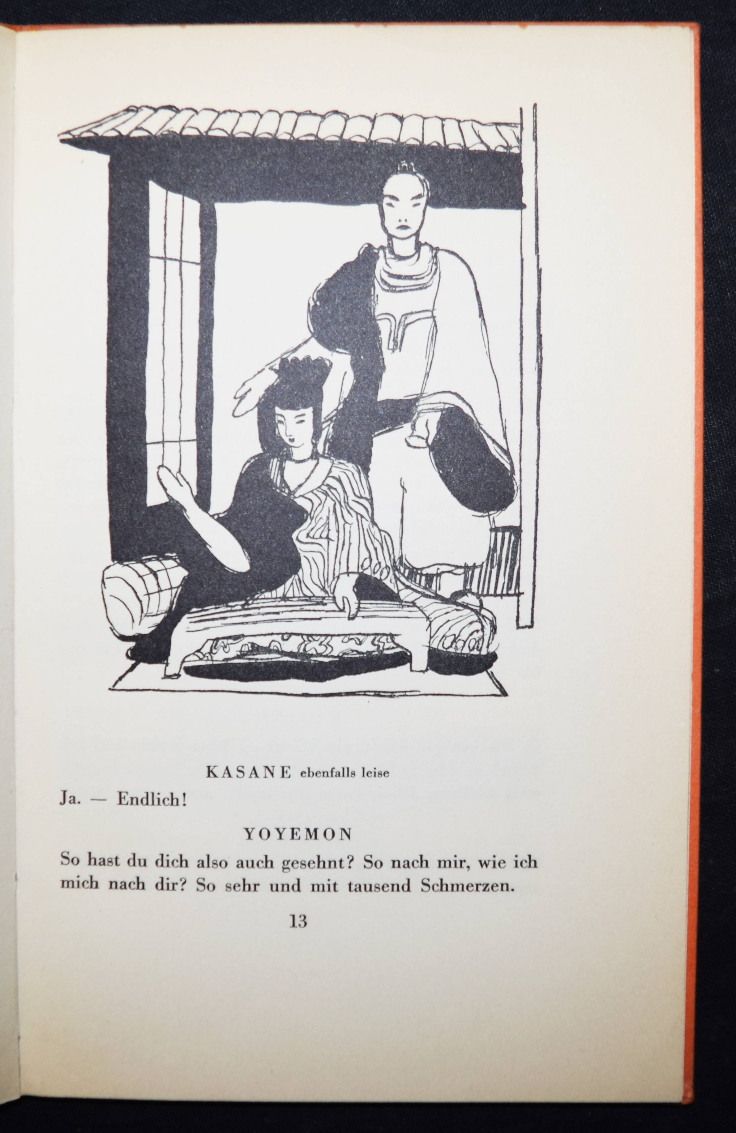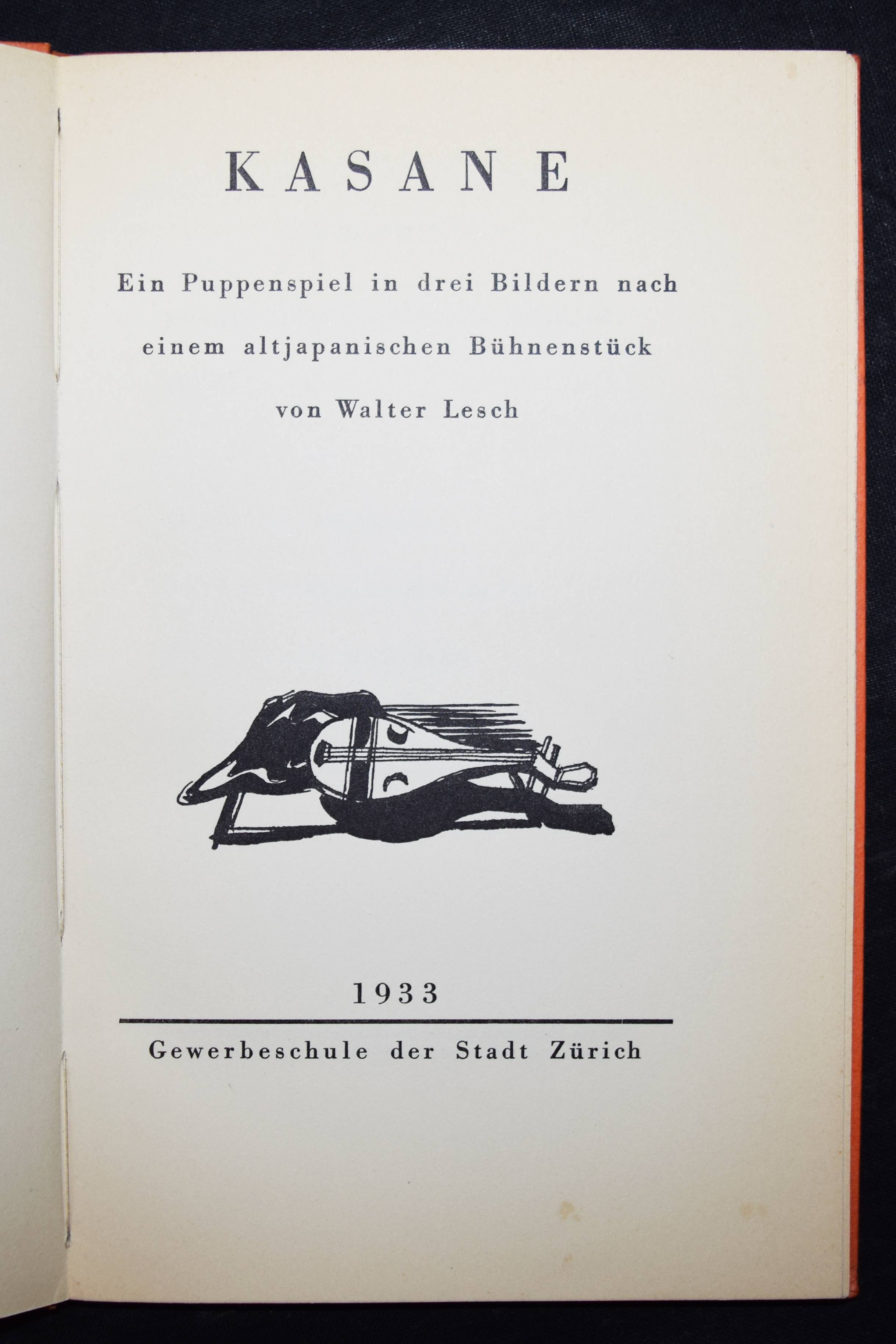 | Lesch, Walter. Kasane. Ein Puppenspiel in drei Bildern nach einem altjapanischen Bühnenstück. Zürich, Gewerbeschule der Stadt Zürich 1933. 8°. 38 S., 1 Bl. mit 4 Illustrationen. OPbd. (Achtes Buch der Gewerbeschule der Stadt Zürich). Eines von 150 num. Exemplaren. – Deckelränder etwas aufgehellt u. geringf. fleckig.
