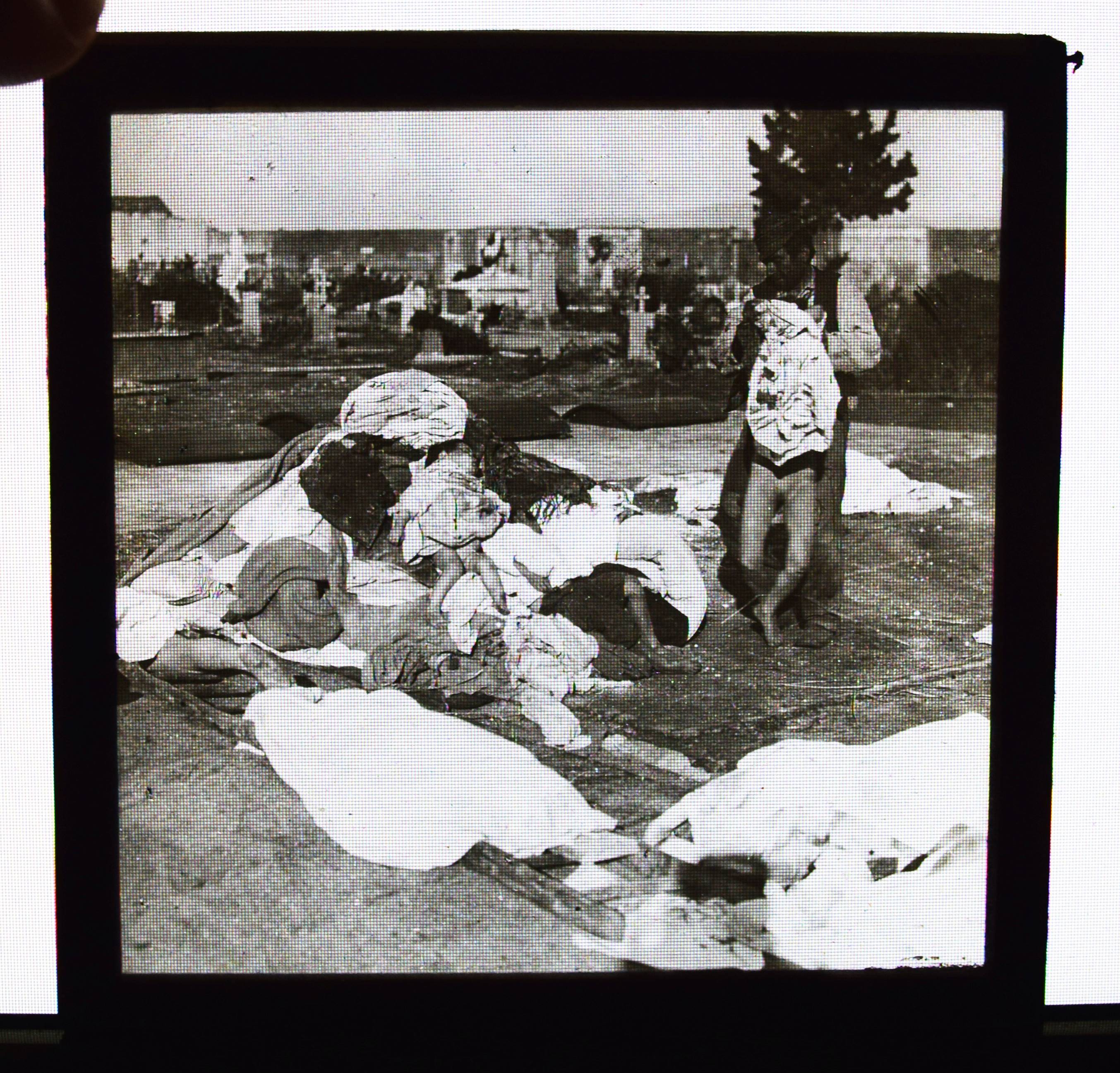 Erdbeben von Messina 1908. 3 Glas-Dias. Messina 1908. Jeweils 8,2 x 8,2 cm. „Das Erdbeben von Messina 1908 in Italien war die nach Opfern schwerste Naturkatastrophe Europas im 20. Jahrhundert… Ein den Erdstößen folgender Tsunami richtete weitere große Schäden an und forderte weitere Opfer. Die Schätzungen der Opferzahlen gehen auseinander: In Messina und Reggio Calabria verloren demnach zwischen 72.000 und 110.000 Einwohner ihr Leben“ (Wikipedia). – Die Glas-Dias sind im oberen Rand handschr. bezeichnet: „Messina: Erdbeben 1908“, „Messina: Erdbeben 1908, Leichensuche“ und „Messina: Erdbeben 1908, Leichenhäufen“.