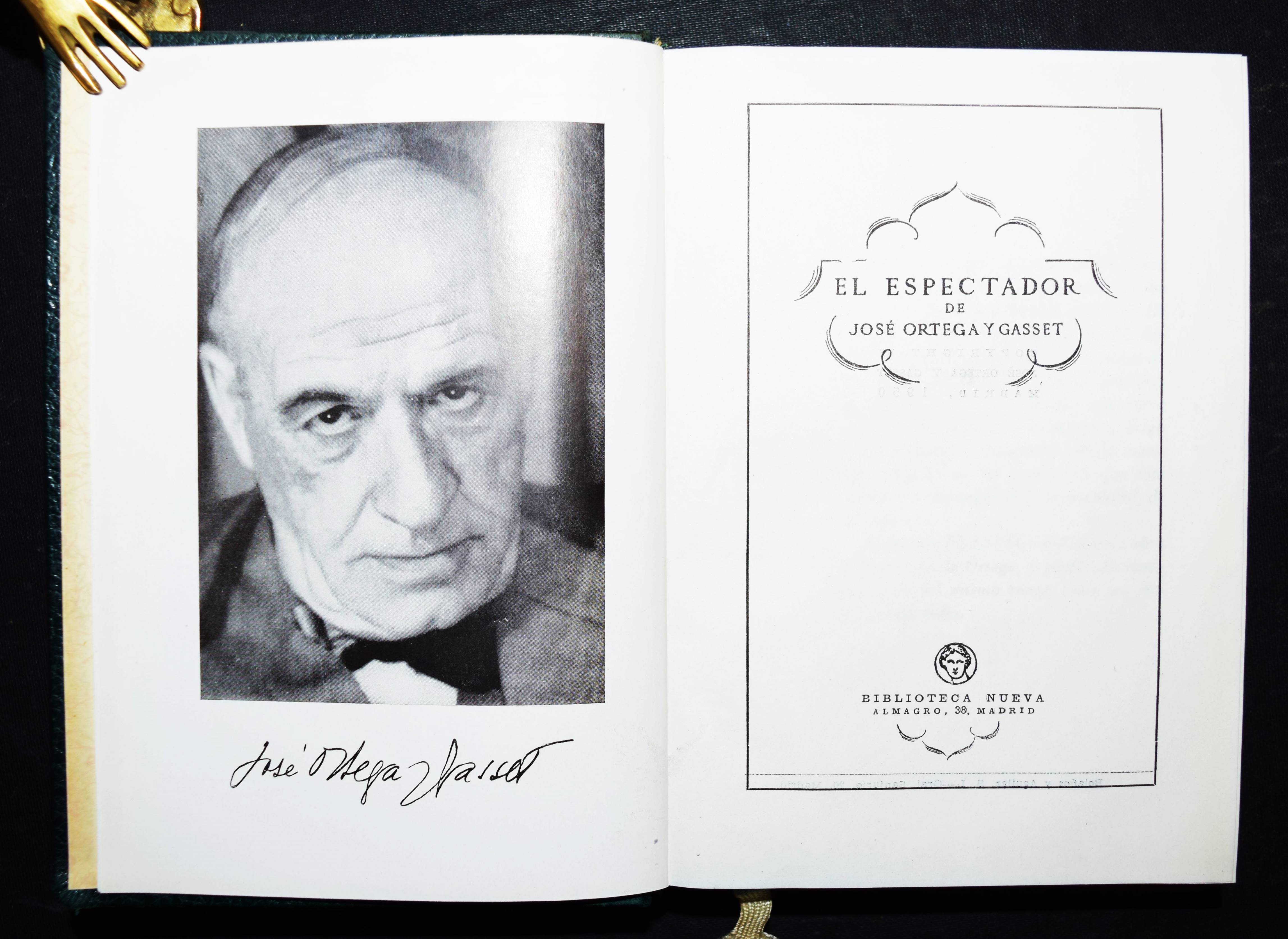 Ortega y Gasset, José. El espectador. (I-VIII, 1916-1934). Madrid, Bibliotheca Nueva (1950). 8°. 1045 S., 1 Bl. mit 1 Portrait. Dunkelgrüner OLdr. mit goldgepr. Rückentitel, reicher Rückenverg., goldgepr. Deckelvignette u. Kopfgoldschnitt. Erste Gesamtausgabe der Essay-Sammlung des bedeutenden spanischen Philosophen J. Ortega y Gasset (1883-1934). – Das Werk erschien 1934 auch mit dem Titel „Buch des Betrachters“ in der Übersetzung von Helene Weyl in Stuttgart. – Ortega y Gasset gilt neben Miguel de Unamuno als der bedeutendste spanische Denker des zwanzigsten Jahrhunderts und wurde besonders durch sein soziologisches Werk „La rebelión de las masas“ (1929, dt. „Der Aufstand der Massen“, 1931) bekannt. – Sehr gutes Exemplar der schönen Ganzlederausgabe auf Dünndruck-Papier.