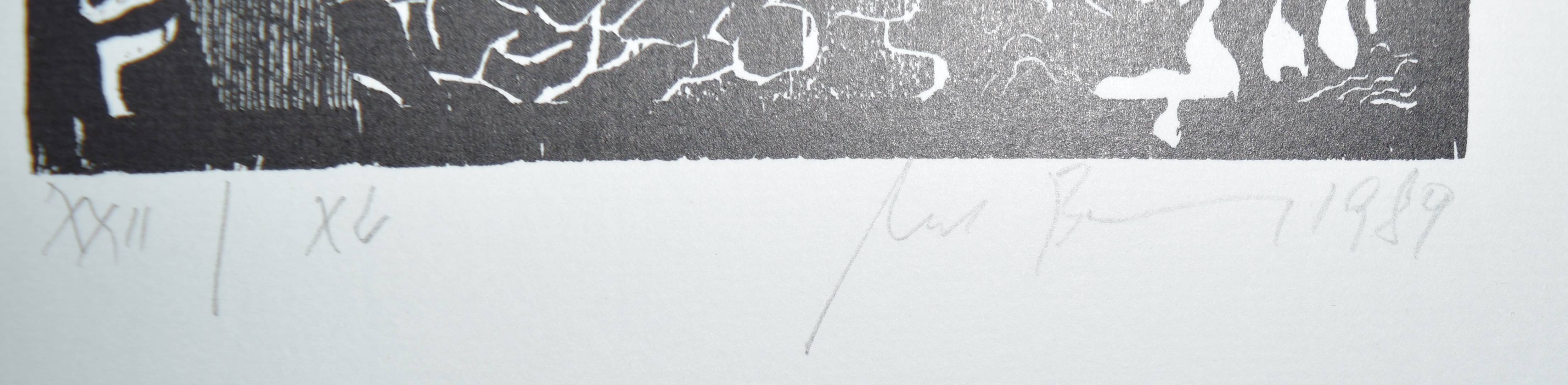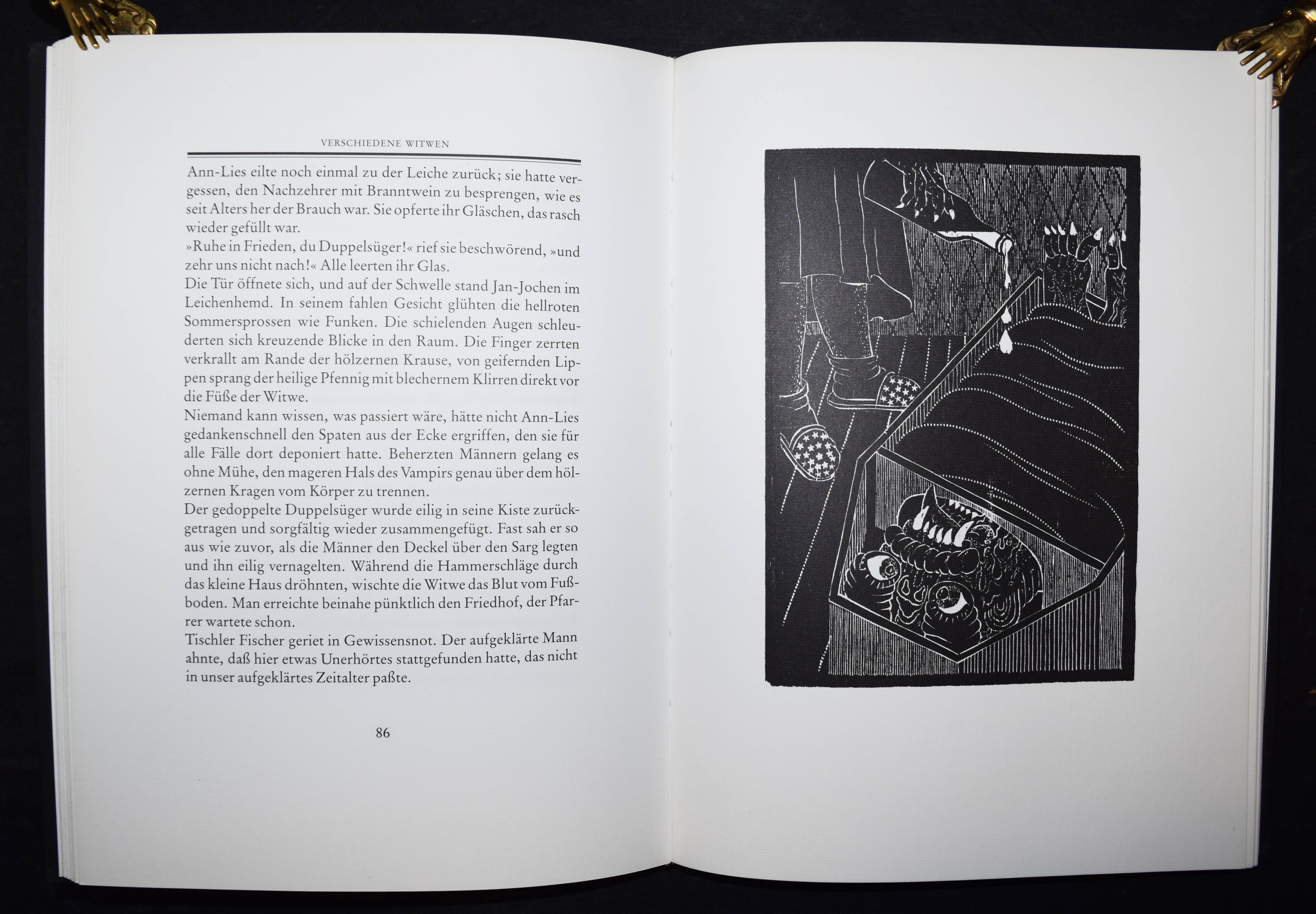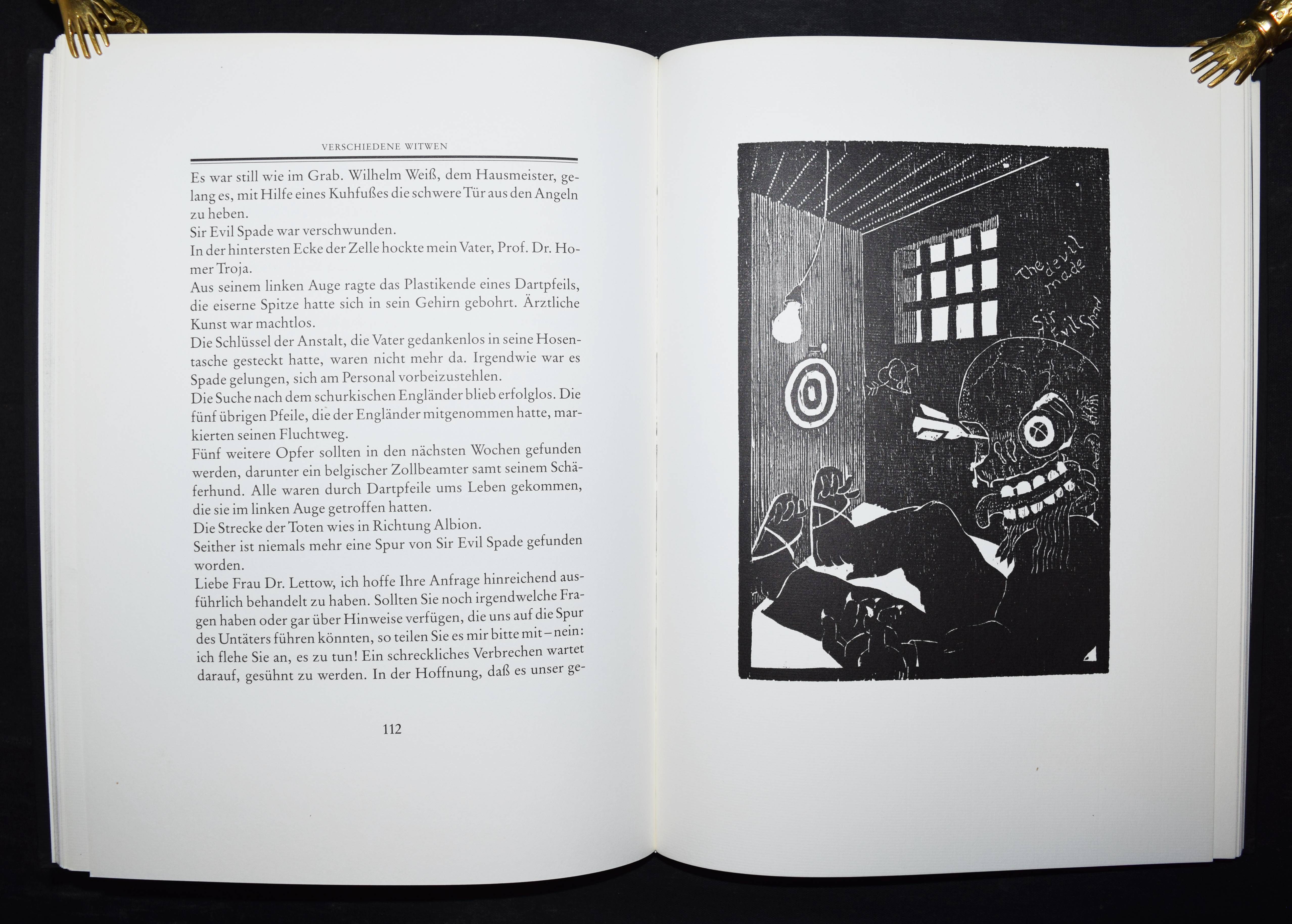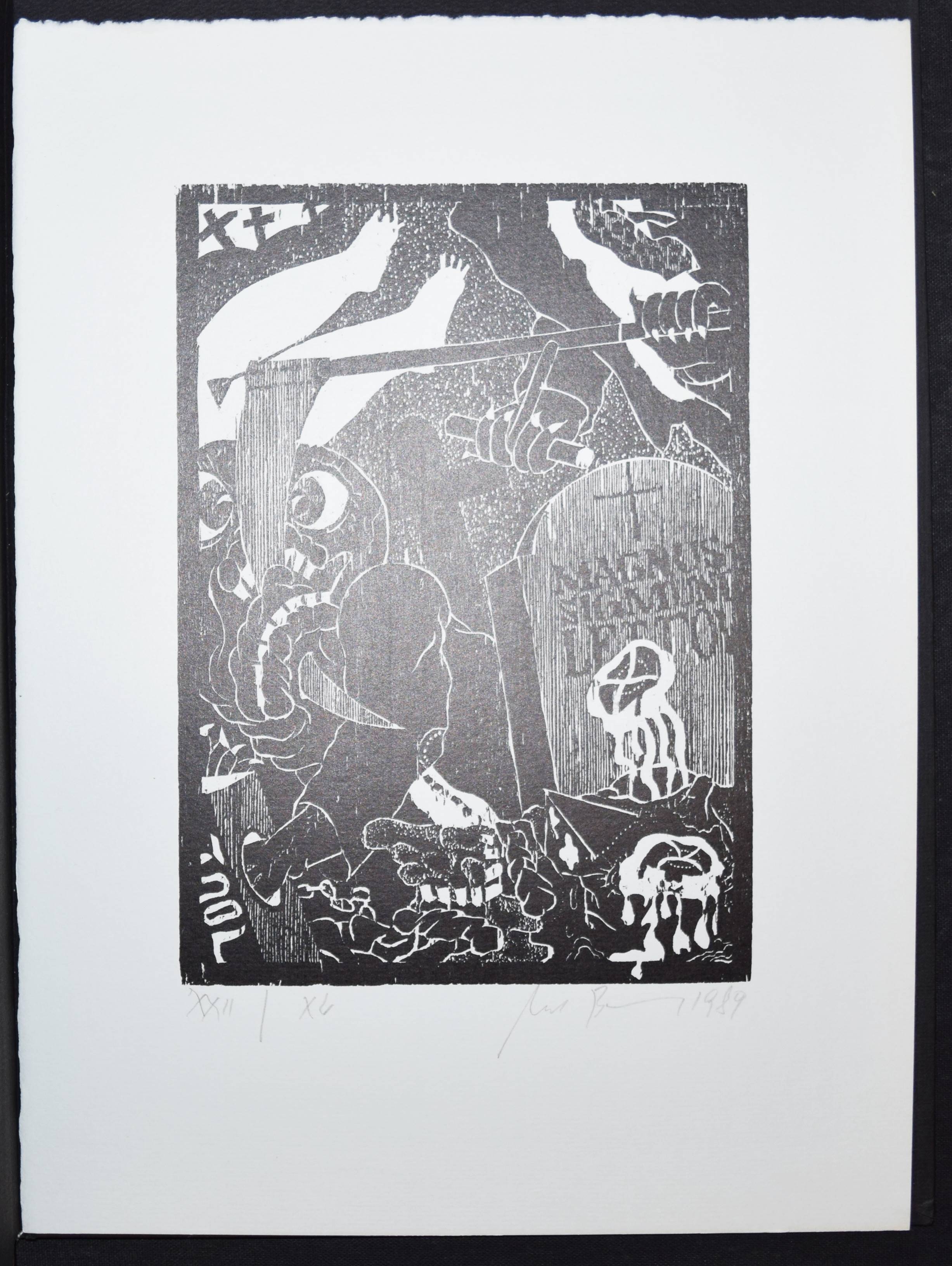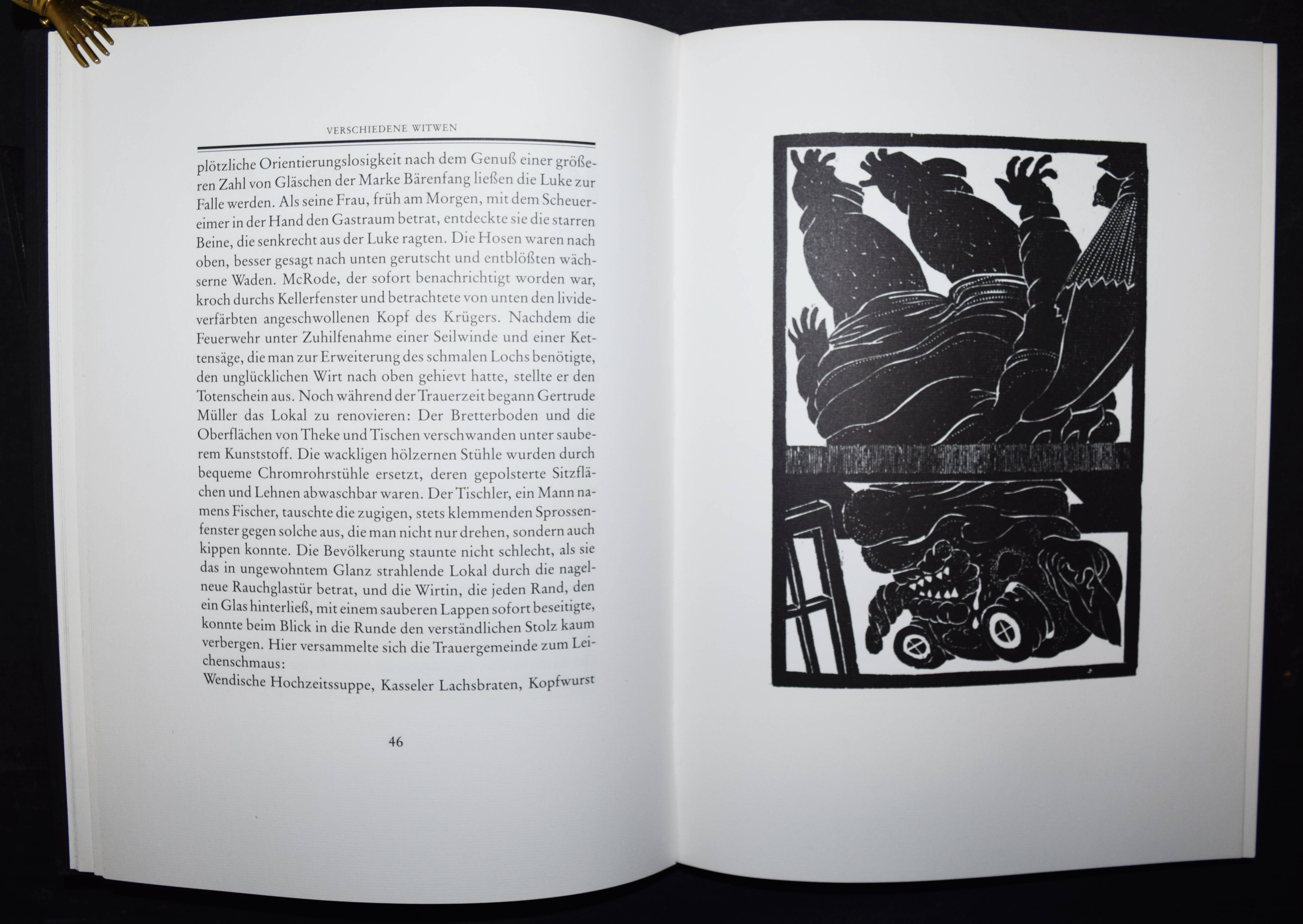 Bremer, Uwe. Verschiedene Witwen. Roman in 7 Kapiteln mit 12 Holzschnitten. Gifkendorf, Merlin-Verlag 1989. 4°. 182 S. mit 12 Orig.-Holzschnitten u. 1 sign. u. num. Orig.-Holzschnitt lose beil. OPbd. mit blindgepr. Rücken- u. Deckeltitel. Spindler 7.26. – Eines von 110 num. Exemplaren (GA 150 Ex.). – Im Druckvermerk von U. Bremer signiert. – Uwe Bremer (geb. 1940), Vertreter des phantastischen Realismus, gibt seit 1964 zusammen mit Günter Bruno Fuchs (1969 ausgeschieden), Johannes Vennekamp, Albert Schindehütte und Arno Waldschmidt die Rixdorfer Drucke heraus. – Gutes Exemplar.