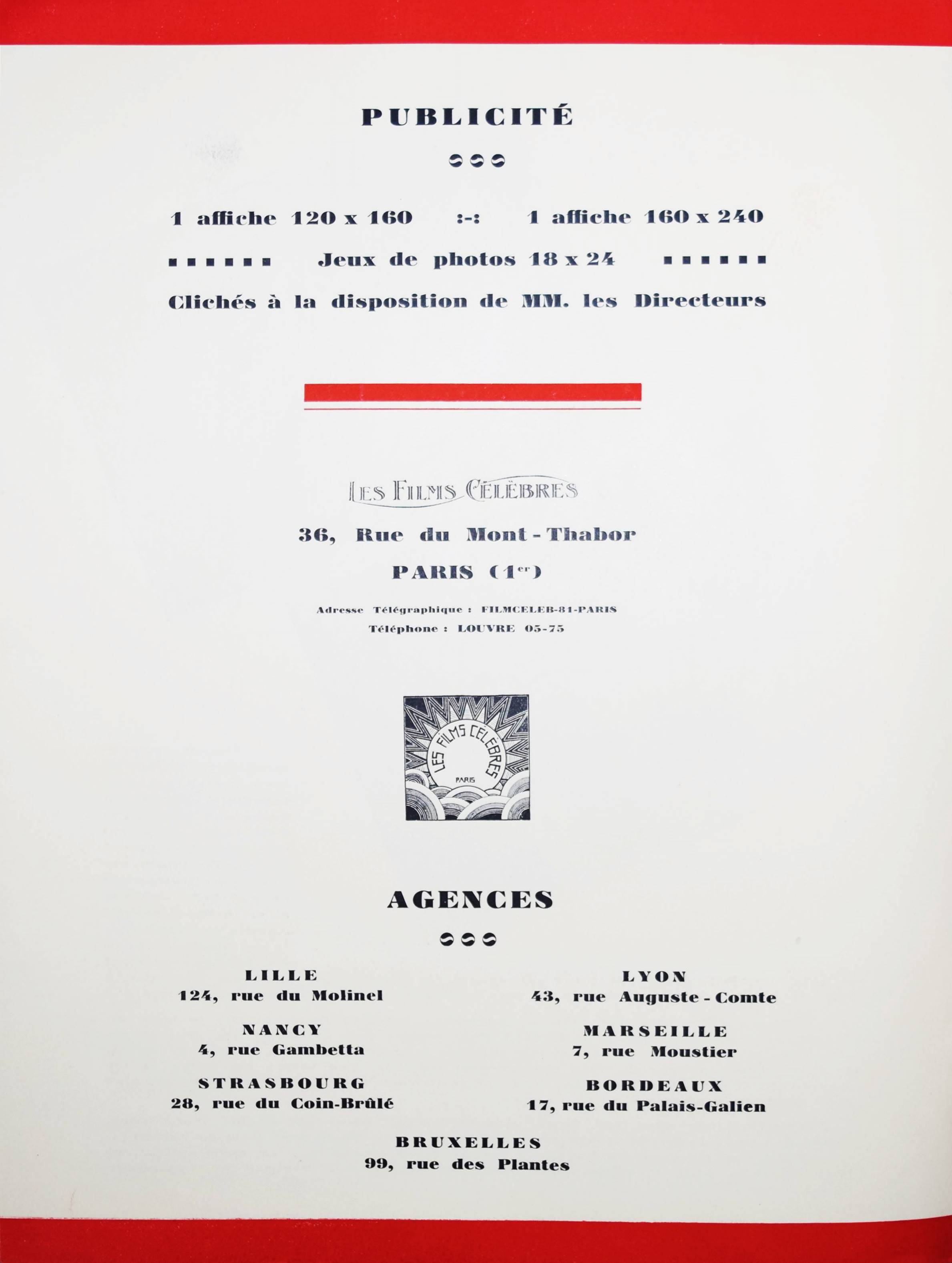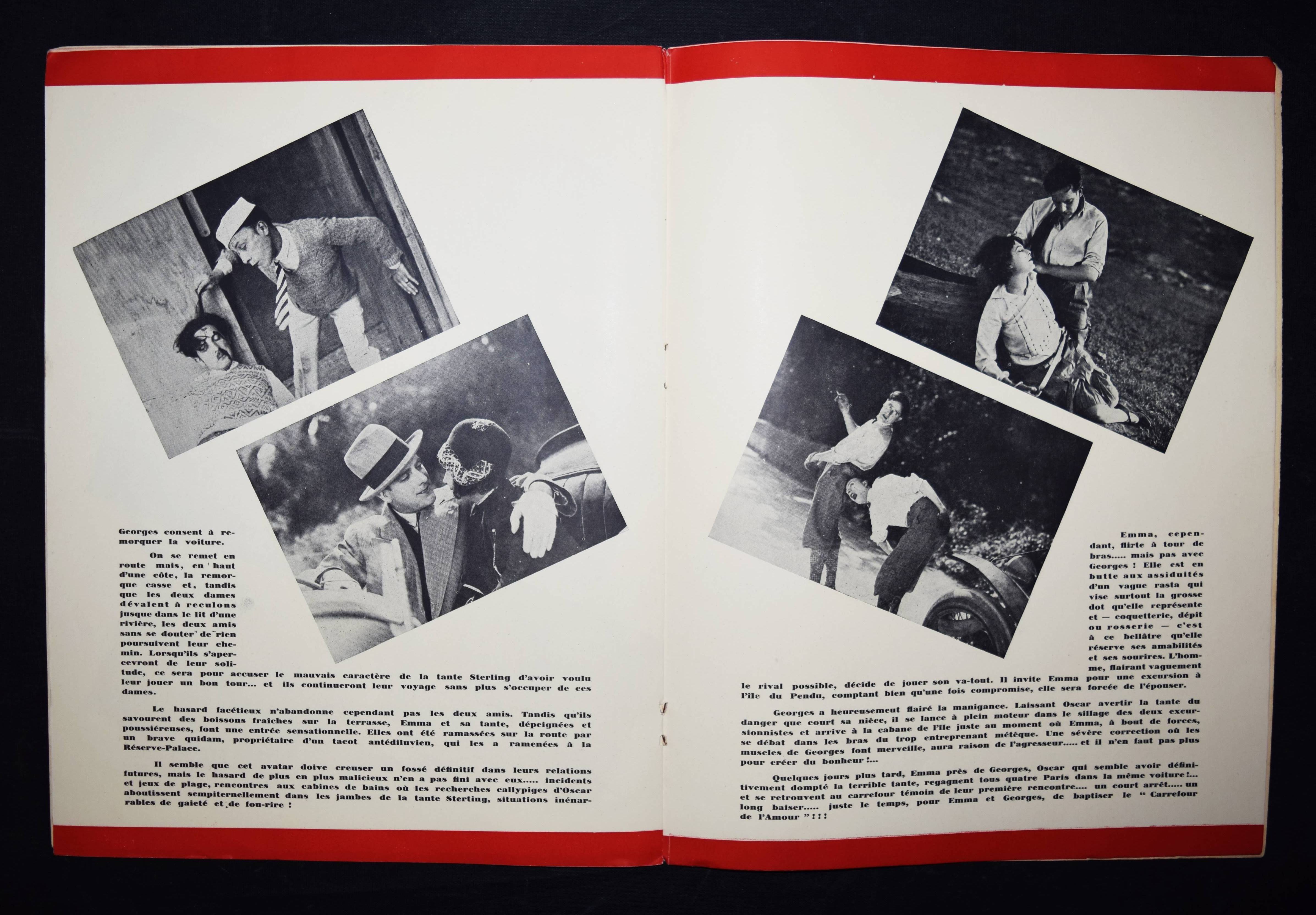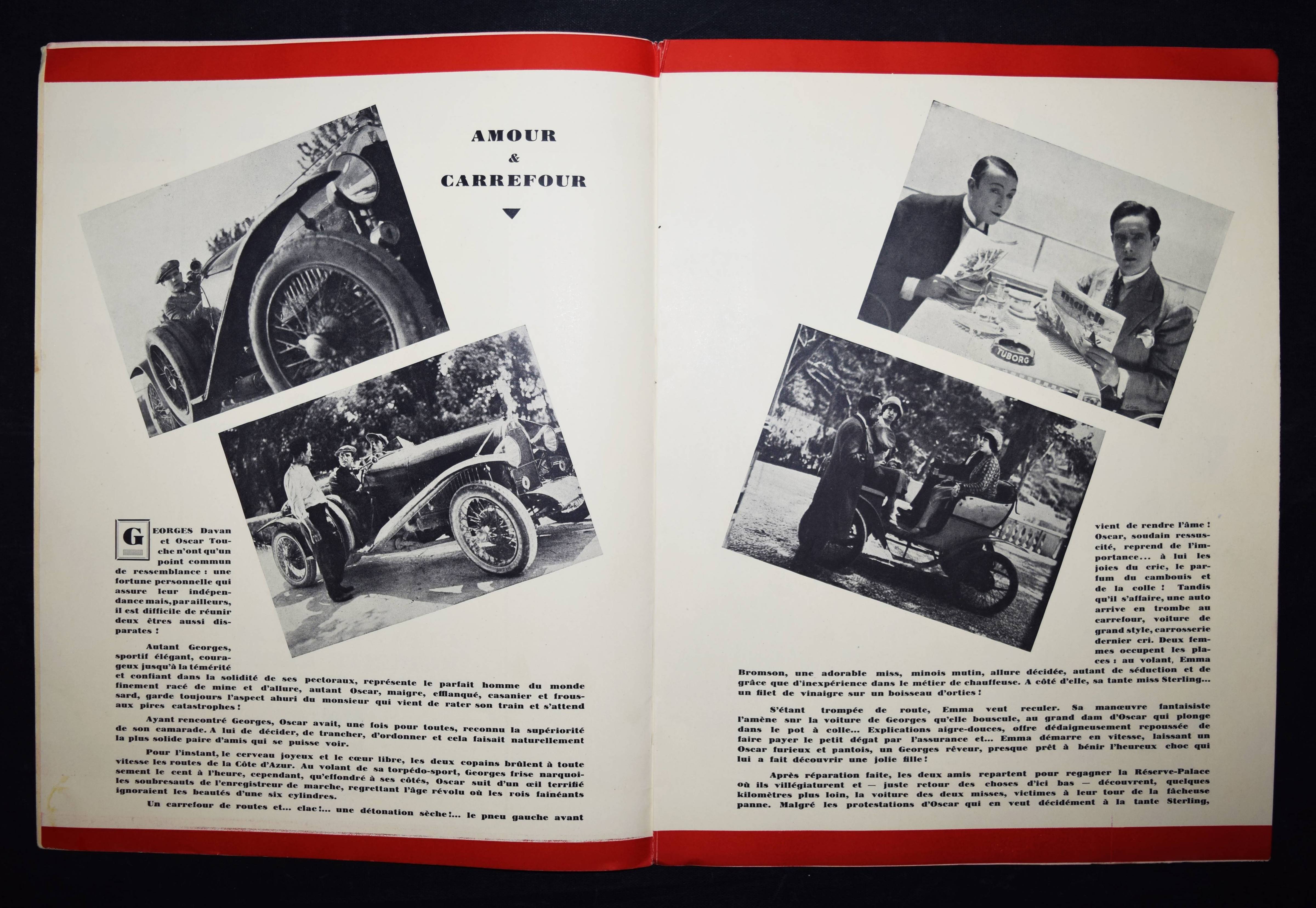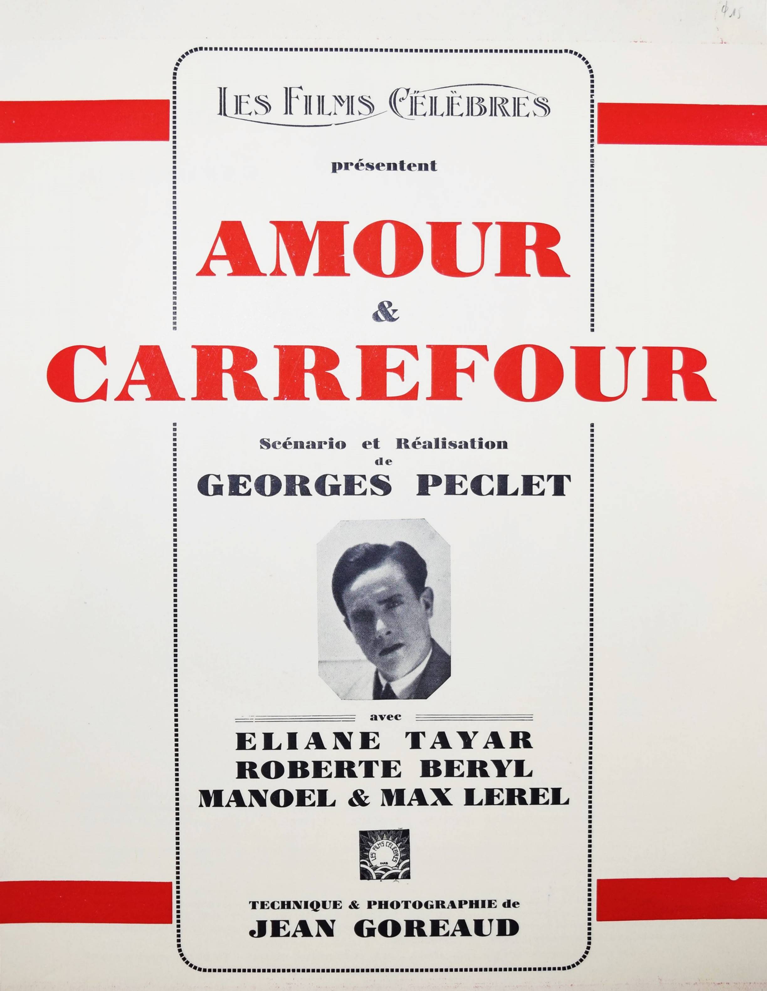 Peclet, Georges. Amour & Carrefour. Scénario et réalisation. Avec Eliane Tayar, Roberte Beryl, Manoel & Max Lerel. Technique & photographie de Jean(-Paul) Goreaud. Paris, Marcel Picard für Les Films Célébres s. d. (1929). 4°. [4] Bl. mit 21 Abb. Illustr. OKart. Sehr seltenes Film-Programm mit 20 Film-Szenen. – Der dekorative Art Déco-Umschlag zeigt ein Automobil mit einer Amorfigur auf dem Kühlergrill. – Der franz. Schauspieler Georges Péclet (eig. Prosper Désiré Péclet, 1897-1974) wirkte zwischen 1919 und 1957 in 95 Filmen mit, seit 1928 arbeitete er auch als Regisseur. – Umschlag u. Blattränder etwas angestaubt, Rückendeckel etwas fleckig, gutes Exemplar.
