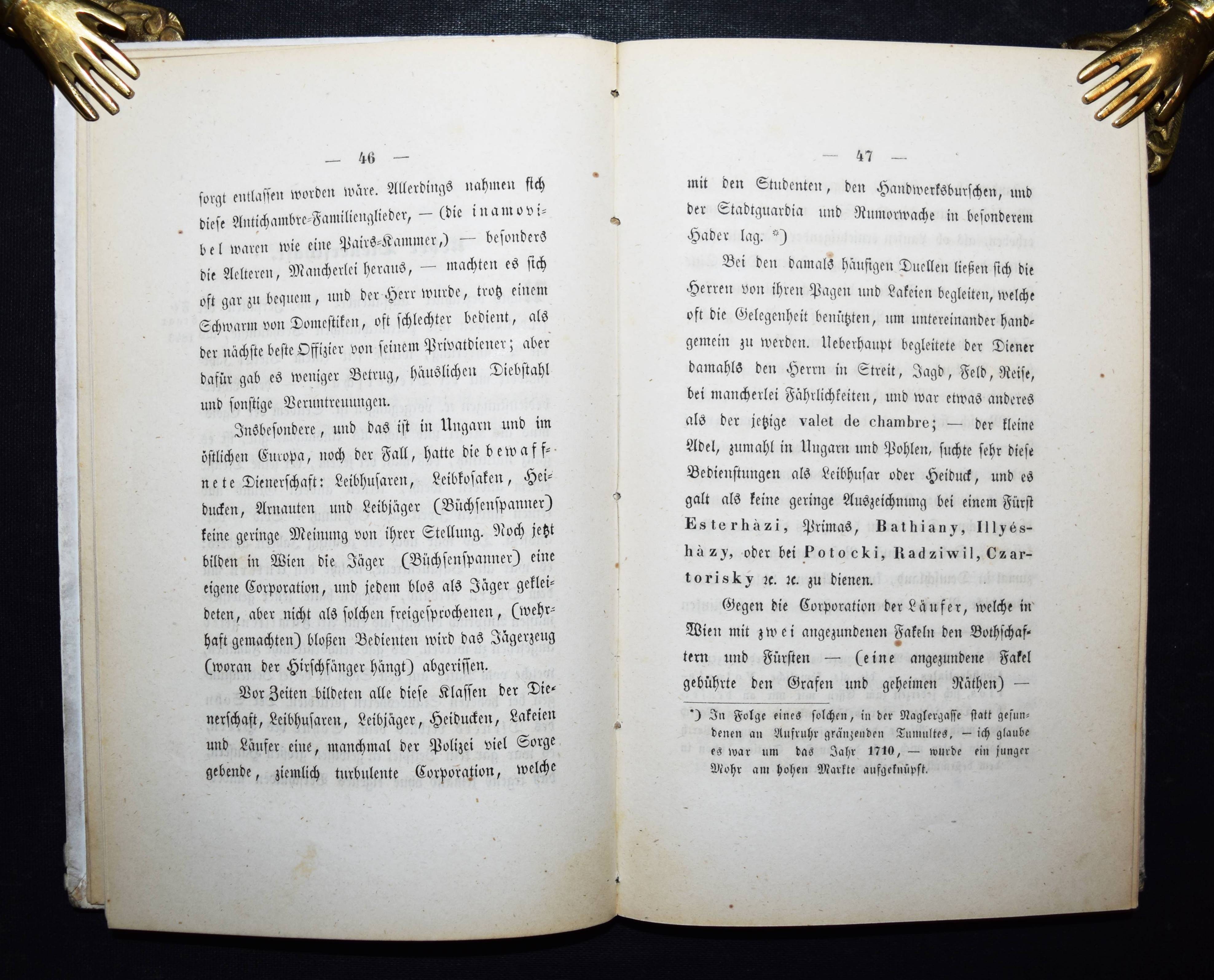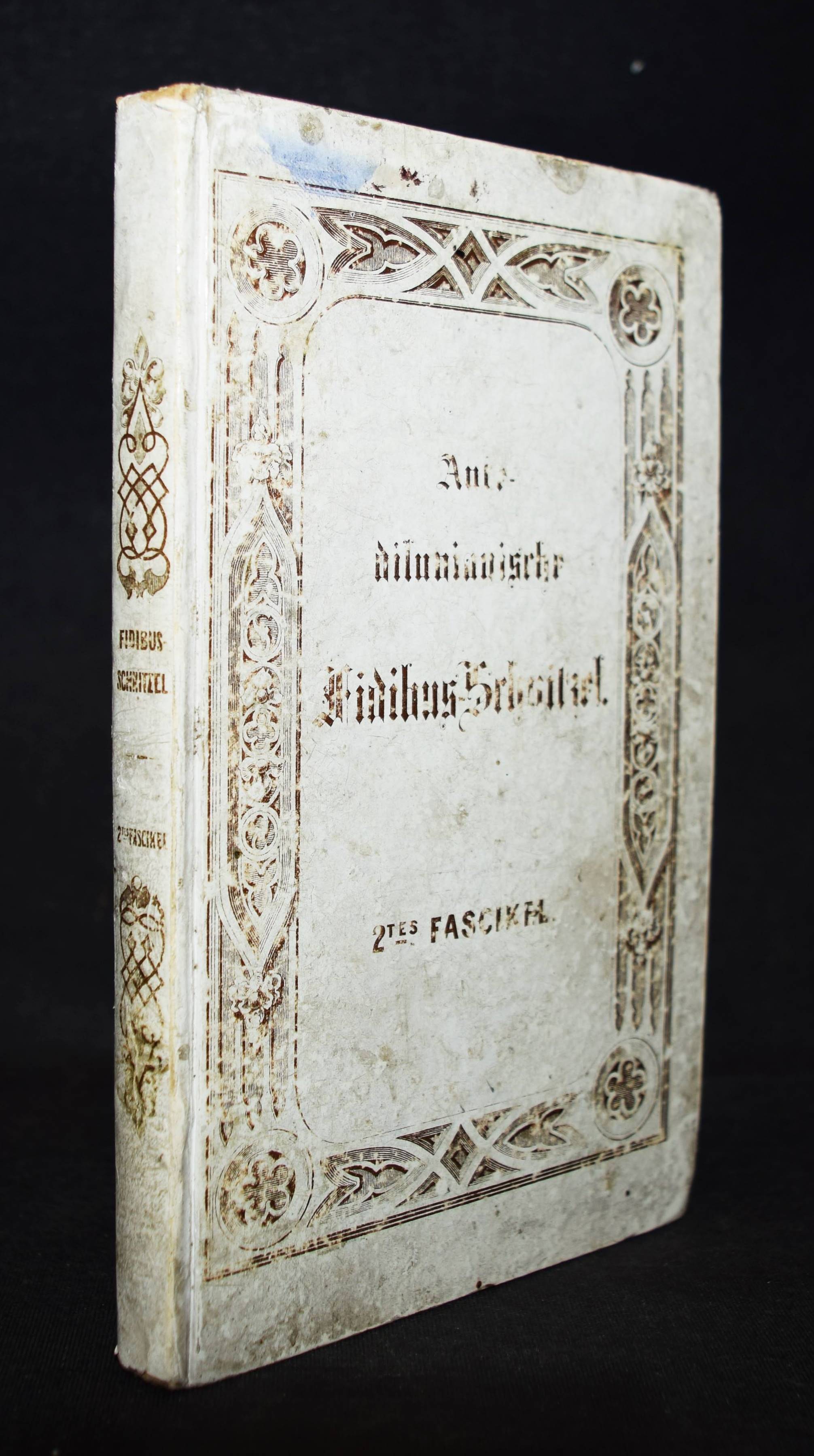 (Schwarzenberg, Friedrich v.). Ante-diluvianische Fidibus-Schnitzel von 1842 bis 1847. 2tes Fascikel (von 6). Als Manuskript für Freunde. Wien, Selbstverlag (1850). 8°. Illustr. lithogr. Titel, 211 S. OPbd. mit goldgepr. Rücken- u. Deckeltitel u. Rücken- u. Deckelverg. ADB XXXIII, 294 f. Giebisch/G. 380. Holzmann/Bohatta II, 3322. Slg. Mayer 6849 (″Von bekannter Seltenheit“). Rabenlechner I, 130. Wurzbach XXXIII, 66. – „(A)usgegeben in … weißglänzenden Originalkartons, die innerhalb einer rechteckigen gotischen Goldumrahmung vorne den Titel, rückwärts die Zeile ‚von 1842 bis 1847‘ lesen lassen. Innentitel zeigt eine Vignette, einen in einer Laube sitzenden Militär darstellend, ihm gegenüber ein Mann in Zivil… fast alle wurden nur als Geschenke des Verfassers an liebe Freunde abgegeben, so daß sie sich daher im Antiquariat nur selten finden“ (Rabenlechner). – „Es sind dies nebeneinander gestellte Aphorismen, militärische und politische Aufsätze, kurze Tagebuchbruchstücke, „Lesefrüchte“, Bemerkungen und Besprechungen neuer litterarischer Erscheinungen, novellistische und erzählende Stücke u. dergl. in bunter Reihe. Aus diesen Bänden lernen wir des Fürsten Welt- und Lebensanschauung genau kennen, sie zeigen die ganze Fülle seines Geistes, seinen im besten Sinne des Wortes adeligen Sinn, seine Ansichten über Fragen auf dem Gebiete der Politik und des socialen Lebens, über Mißstände und Reformen in den verschiedensten Richtungen, endlich seinen warmen Patriotismus und seine ganze tapfere Soldatennatur, welche sich nie verläugnet und in vielen treffenden Bemerkungen Ausdruck erhält… Fasc. 2 der Reihe dieser reichhaltigen Sammlung allerdings überhaupt vorwiegend aphoristischen Inhaltes“ (A. Schlossar in ADB). – Einband etwas berieben, Rückendeckel im oberen Drittel tintenfleckig, gutes sauberes Exemplar.