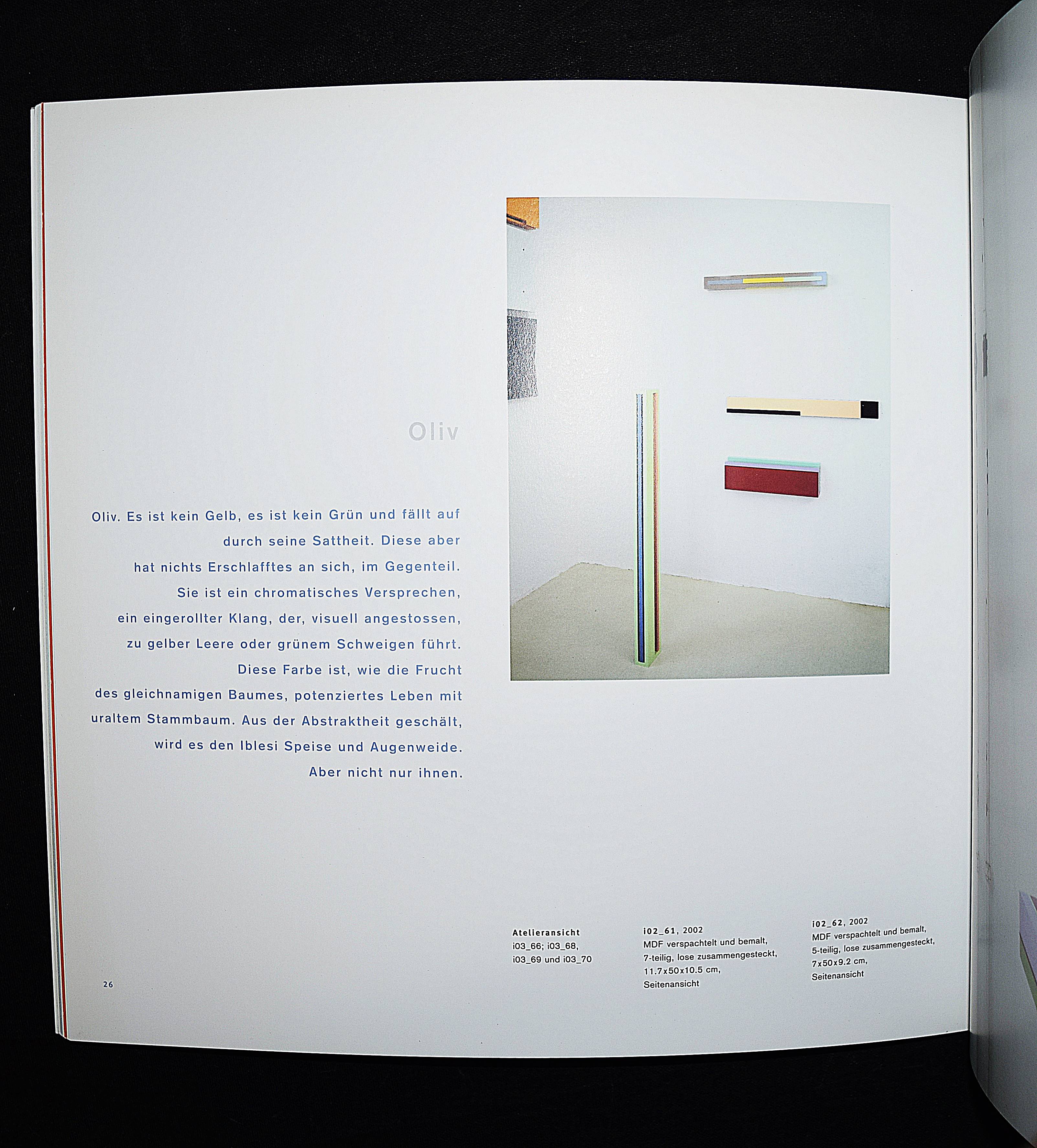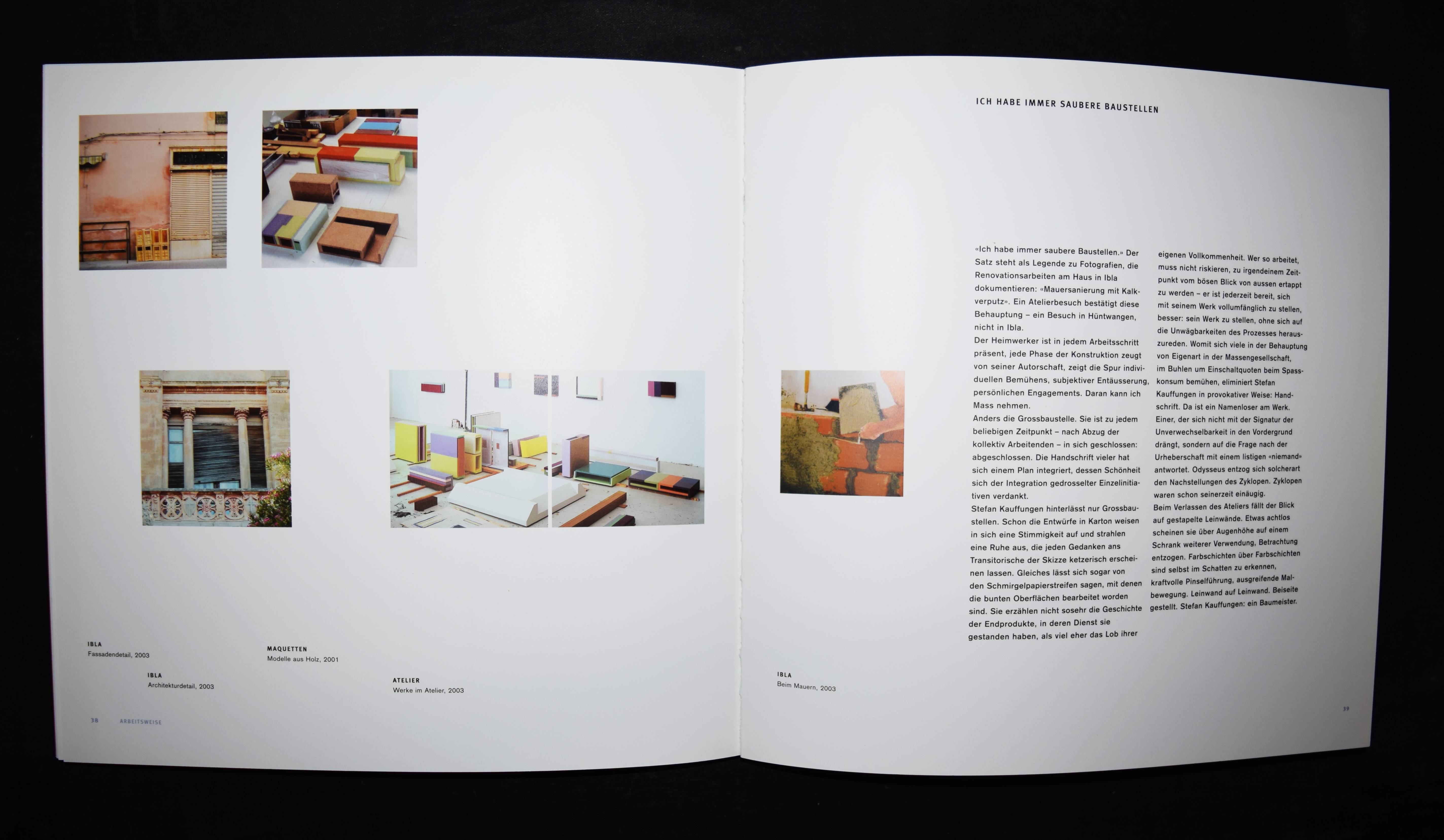 Kauffungen, Stefan IBLA. Farbräume, Schichten, Sizilien. Zürich, Edition Howeg 2004. 4°. 45 S. mit teils ganzs. farb. Abb. Farbiger OPbd. Mit eigenh. Widmung von S. Kauffungen auf dem Titelblatt. – Der Züricher Künstler S. Kauffungen (1953-2020) war bis 2018 Dozent an der Zürcher Hochschule der Künste ZHdK und an der Schule für Gestaltung Zürich SfGZ. – „Die Arbeiten bestehen aus mehrteiligen, lose gefügten Platten- und Profilelementen oder sind als mehrteilige kompakte «Farbblöcke» konzipiert. Die mehrschichtigen, mit Hohlräumen durchsetzten Arbeiten können bei einem ersten flüchtigen Blick als kaschierte «Konstruktionen» bezeichnet werden“ (S. Kauffungen). – Tadellos.