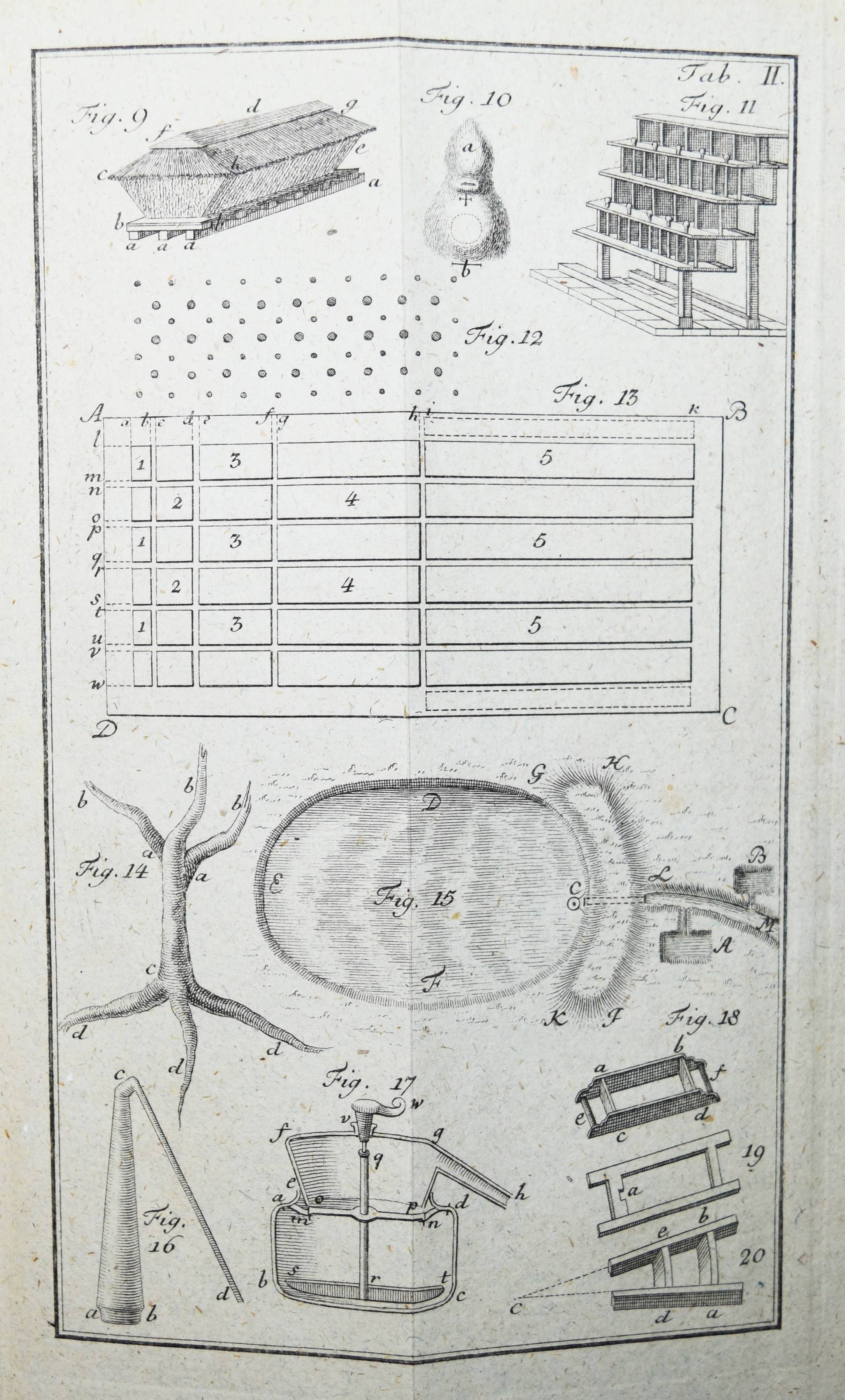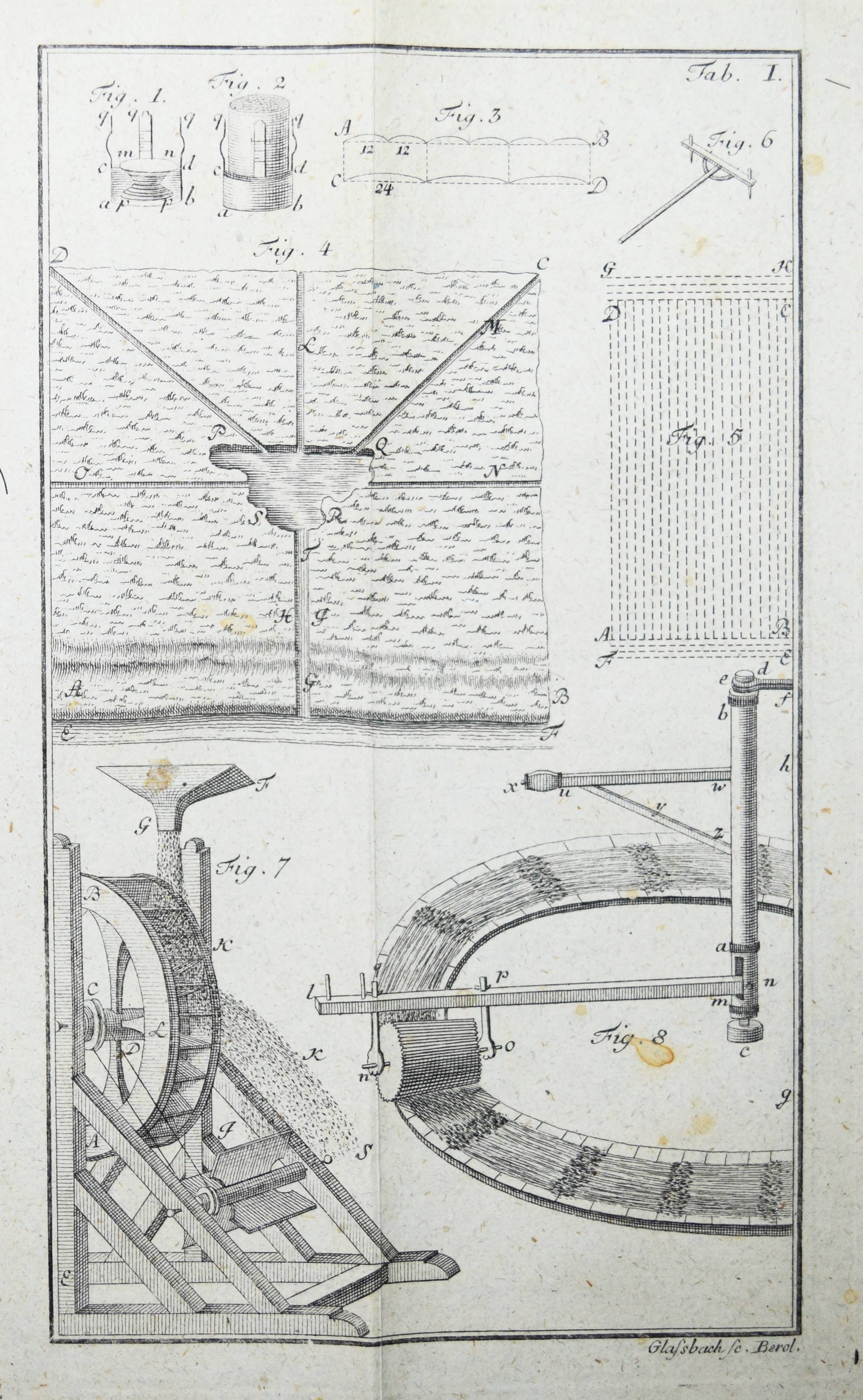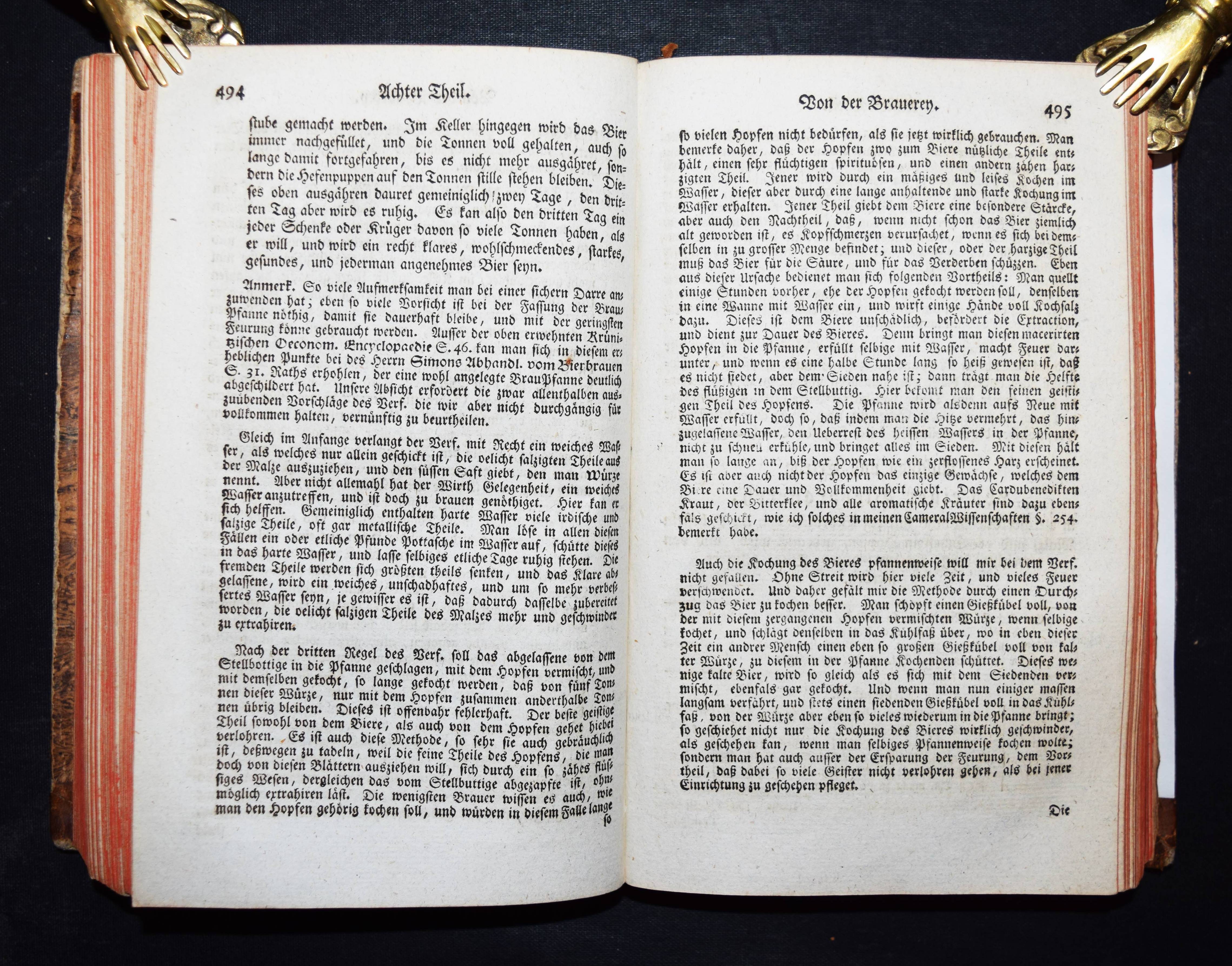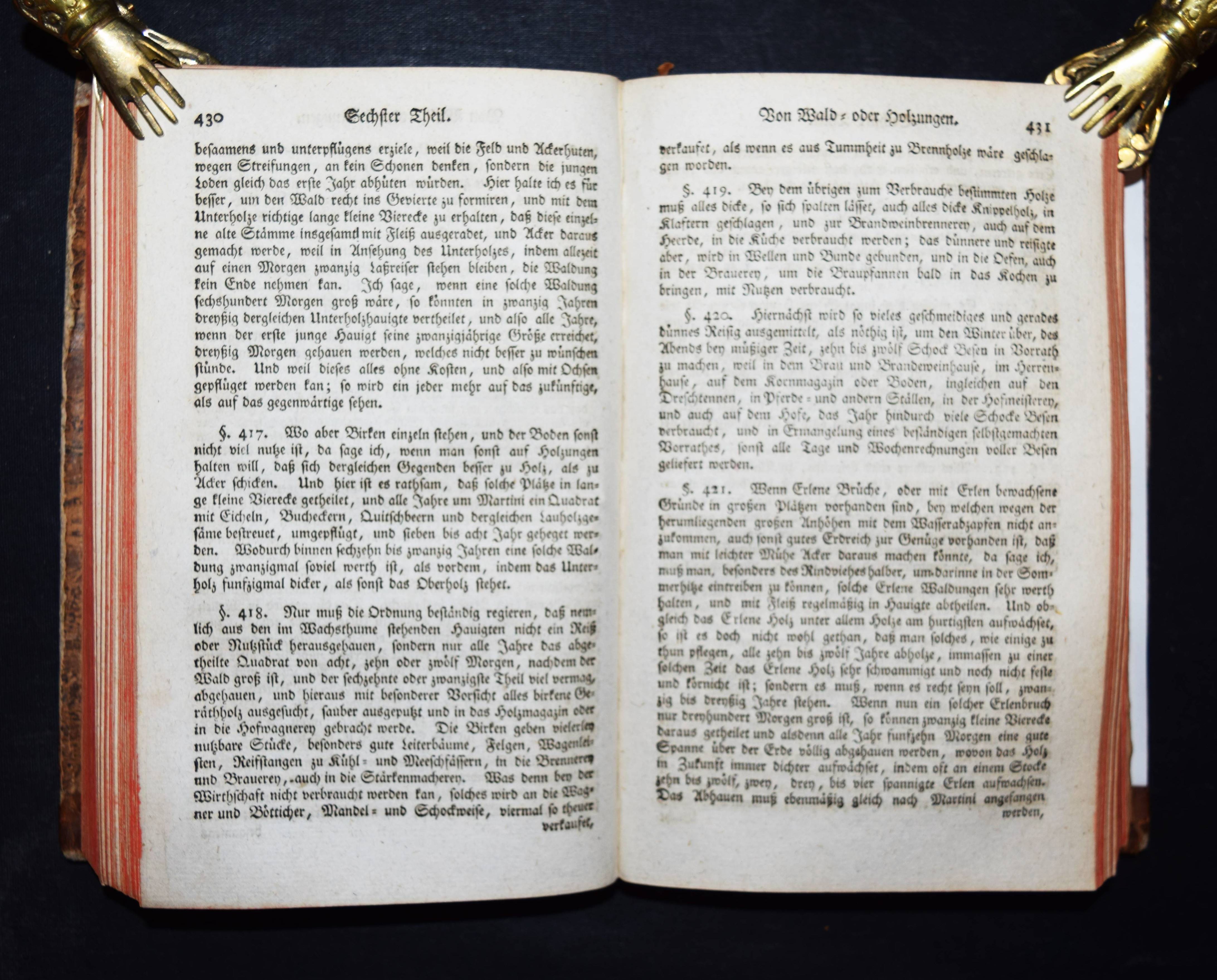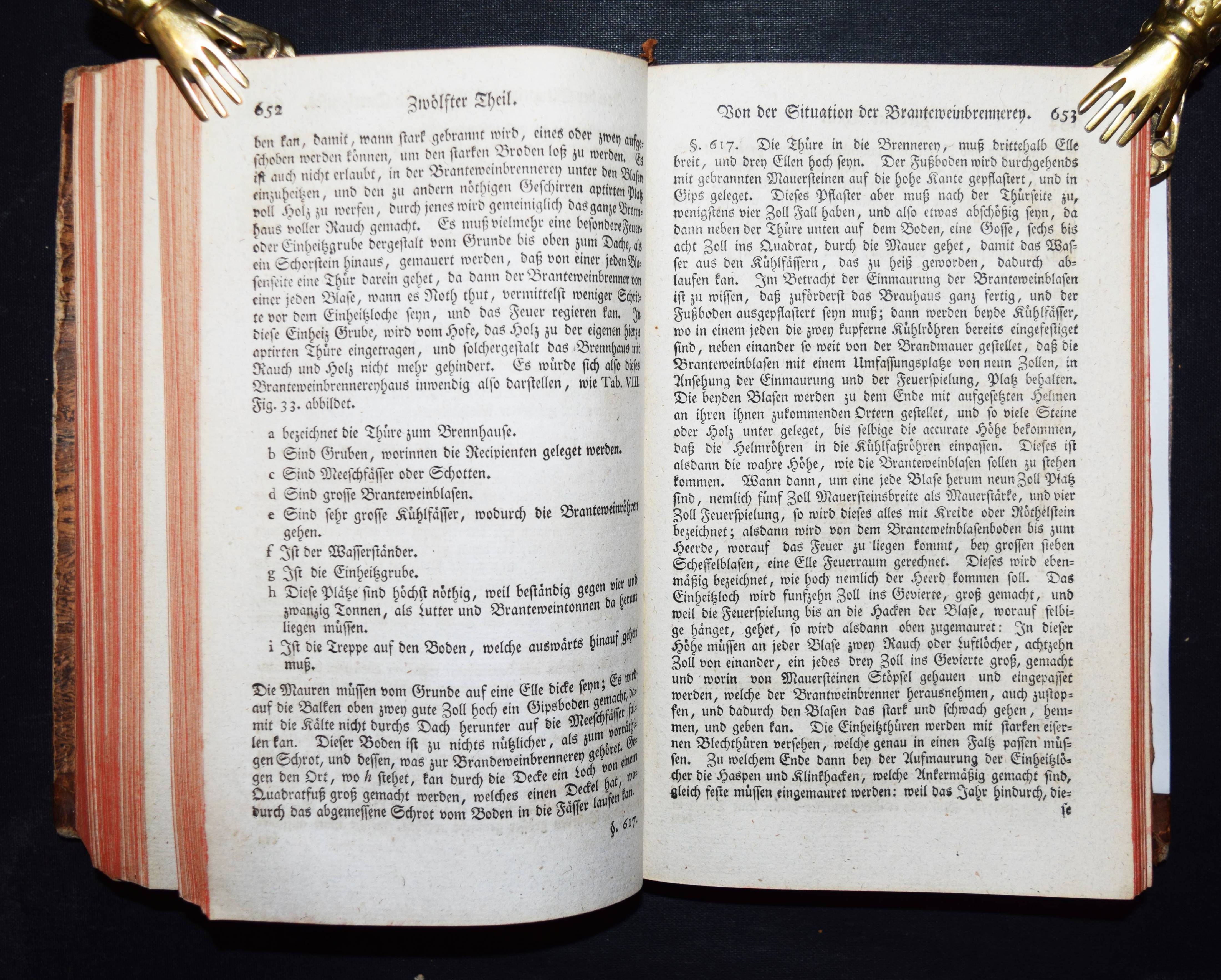 Eckart, Johann Gottlieb v. Experimental-Oekonomie über das animalische, vegetabilische, und mineralische Reich, oder vollständige Haushaltungs- und Landwirthschafts-Kunst. Verändert, mit Anmerkungen und mit Kupfern begleitet von Laurenz Johann Daniel Suckow. Leipzig, Hinrichs 1810. Gr.-8°. XLIV, 882 S., [19] Bl. mit gestoch. Frontispiz u. 9 gefalt. Kupfertafeln. Hldr. d. Zt. mit schwarzgepr. Rückenschild über 5 Bünden. NDB IV, 302. Vgl. Güntz II, 209. – Letzte Ausgabe des zuerst 1754 in Jena erschienenen Hauptwerks des preuss. Kriegs- und Domänenrats J. G. Eckart (um 1700-nach 1763). – Mit interessanten vorwiegend landwirtschaftlichen Artikeln; außerdem über die Einrichtung eines Brauhauses, Brandwein brennen, Ziegel-, Gips- und Kalkbrennen, Dachdeckerei, „Vom Negociieren in ökonomischen Dingen“, „Vom fürstlichen Hofamte“, „Wohnungen der Arbeitsleute“, „Von eines Cavalliers Wohnhause“, Gesetzgebung u.v.m. – „Durch eine Reihe von Betriebsverbesserungen erreichte E. eine Rationalisierung (der) staatlichen Wirtschaftsbetriebe, doch wandte er sehr bald rein fiskalische Methoden an, erhöhte willkürlich die Abgaben der Brauereipächter und erzwang als königlicher Kommissar auch auf anderen Gebieten der Finanzverwaltung eine merkliche Steigerung der Steuereinkünfte. Hochfahrend und unliebenswürdig, geriet er dabei in scharfen Gegensatz zum Generaldirektorium sowie zu den Kammerbehörden, doch nahm Friedrich Wilhelm den Emporkömmling, dessen finanzielle Erfolge ihn beeindruckten, gegen alle Angriffe in Schutz, verlieh ihm 1738 zugleich mit dem Orden de la générosité den Adel und schenkte ihm in Berlin ein völlig eingerichtetes Palais. Friedrich der Große dagegen entsetzte E. unmittelbar nach Übernahme der Regierung aller Ämter und Ehren. Im Oktober 1740 verwies er den allgemein verhaßten „Plusmacher“ des Landes, ohne daß diesem eigentliche Rechtswidrigkeiten nachzuweisen waren. … E. gilt „als die Personifikation einer bis auf die Spitze getriebenen Fiskalität“, jedoch war er durch erstaunliche Arbeitskraft und scharfe Beobachtungsgabe ausgezeichnet“ (J. Jacoby in NDB). – Kapital u. Fuß mit kl. Fehlstellen, Deckel berieben, gutes meist sauberes Exemplar.