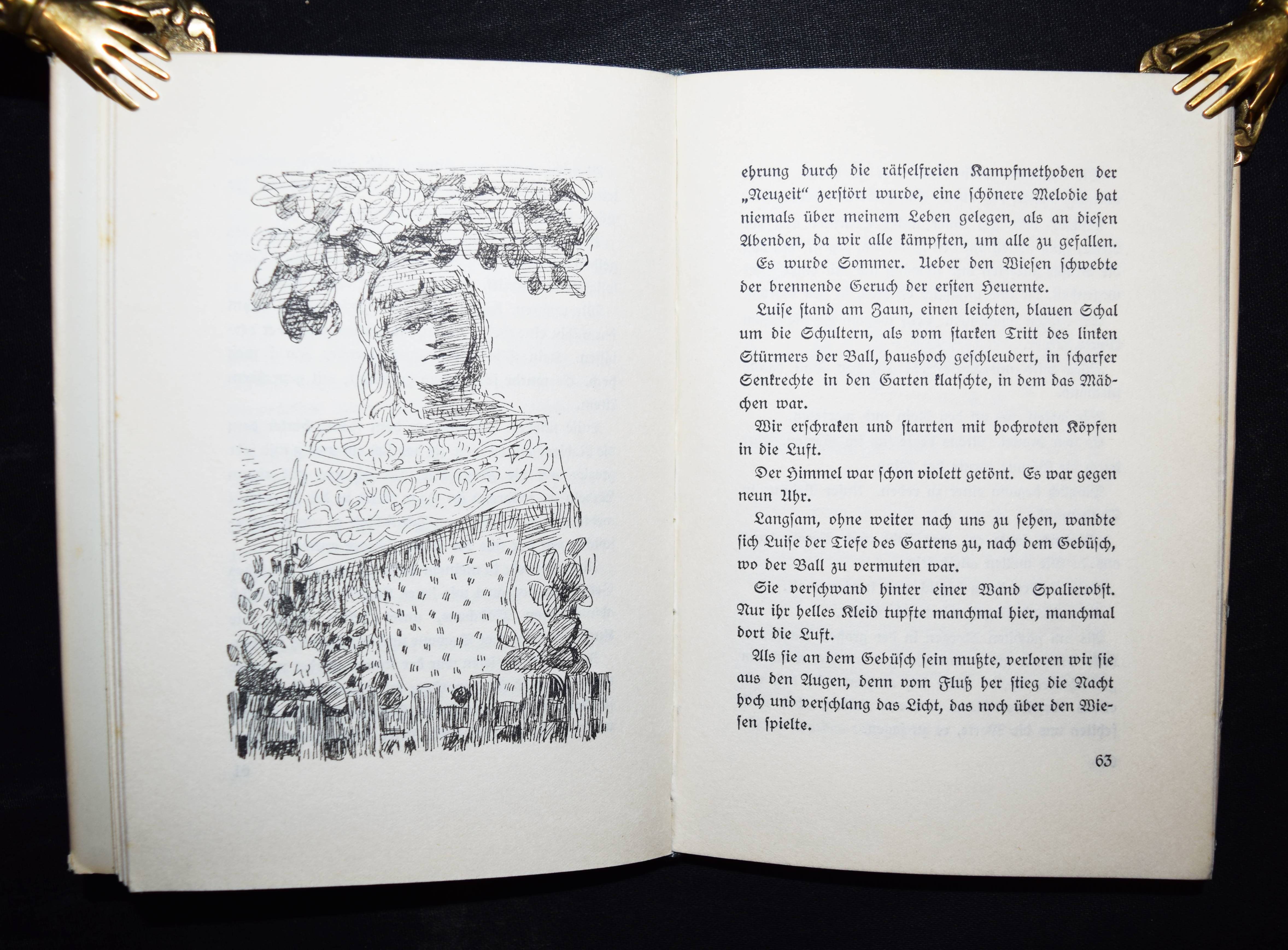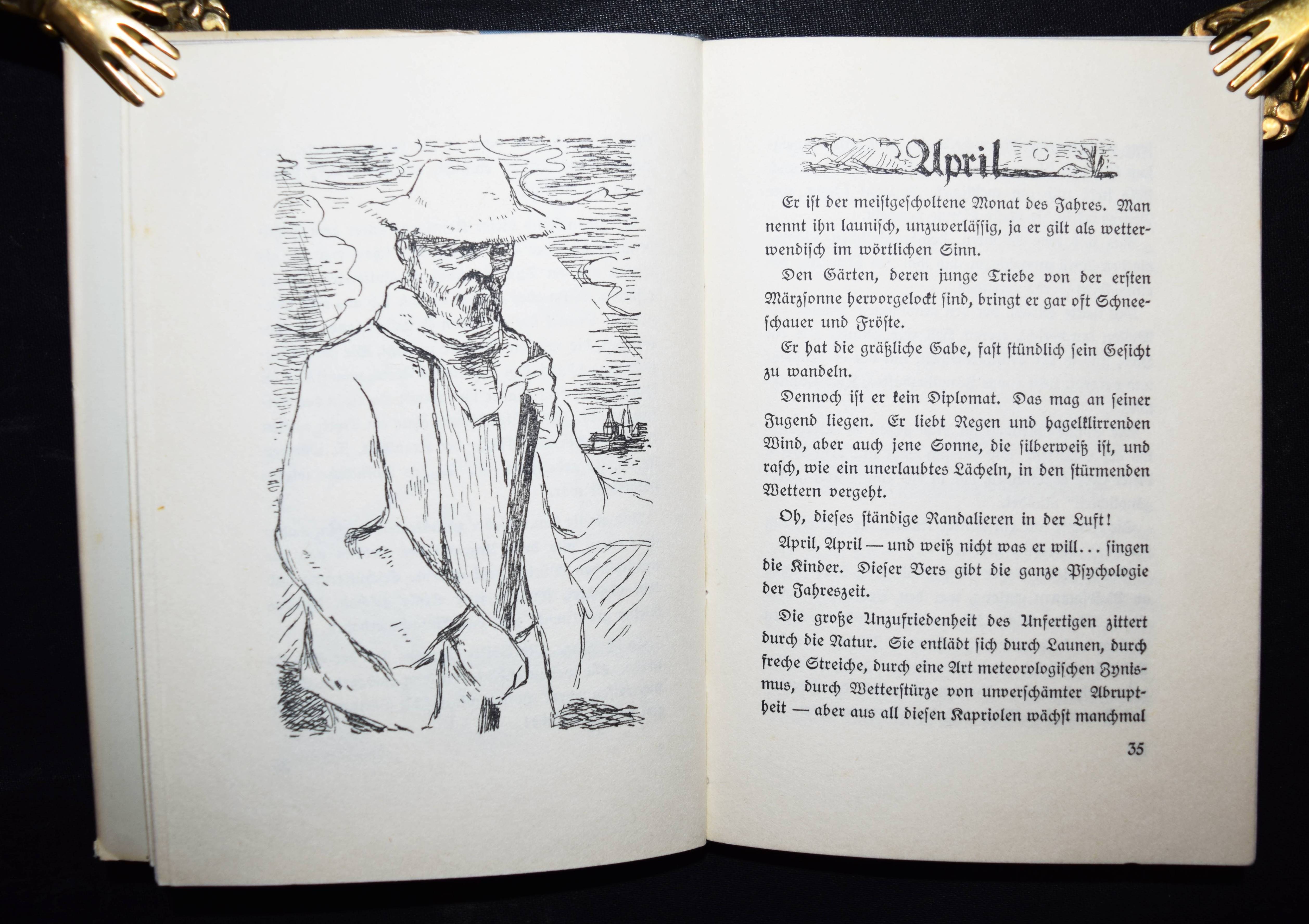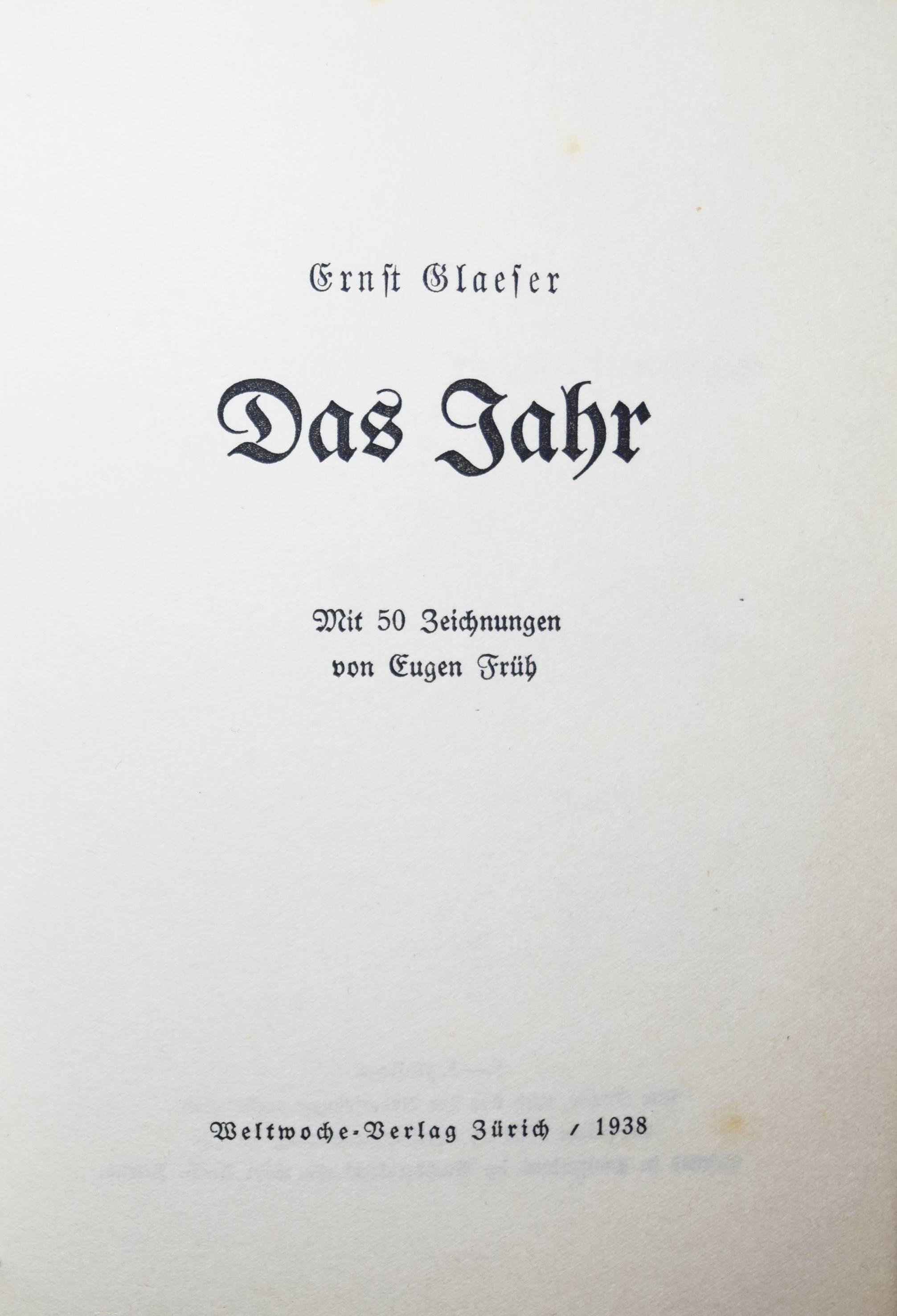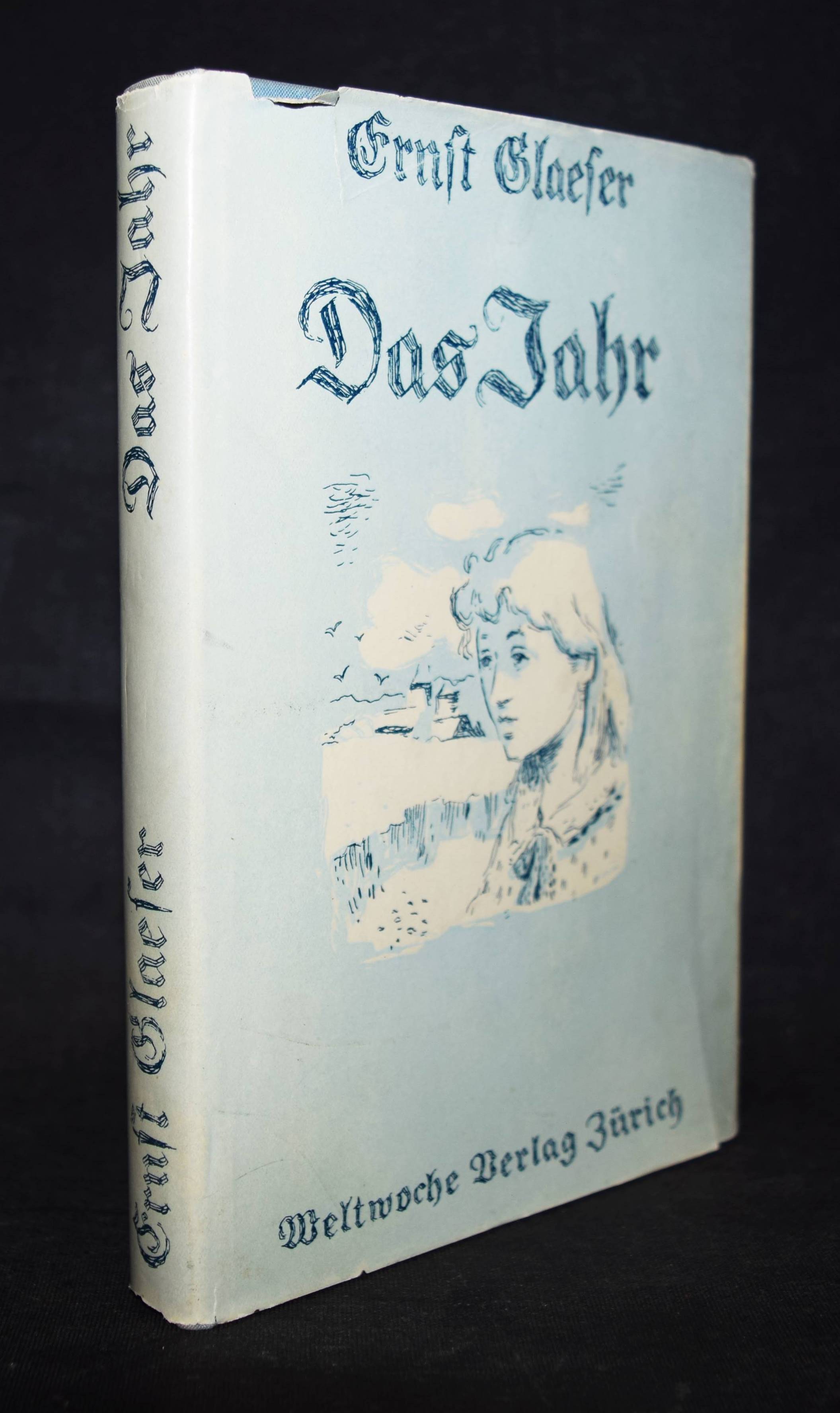 Glaeser, Ernst. Das Jahr. Mit 50 Zeichnungen von Eugen Früh. Zürich, Weltwoche-Verlag 1938. 8°. 139 S. OLn. mit illustr. OU. Sternfeld/Tiedemann 168. W.-G.² 11. – Erste Ausgabe. – Von E. Glaeser auf dem Vorsatz signiert. – E. Glaser (1902-1963) emigrierte 1933 in die Schweiz, wo er im Tessin und in Zürich lebte. 1938 votierte er für den Anschluss Österreichs und 1939 kehrte er ins nationalsozialistische Deutschland zurück. – Schutzumschlag am Rückendeckel mit kl. Fehlstelle und Randläsuren, sonst gut erhalten.
