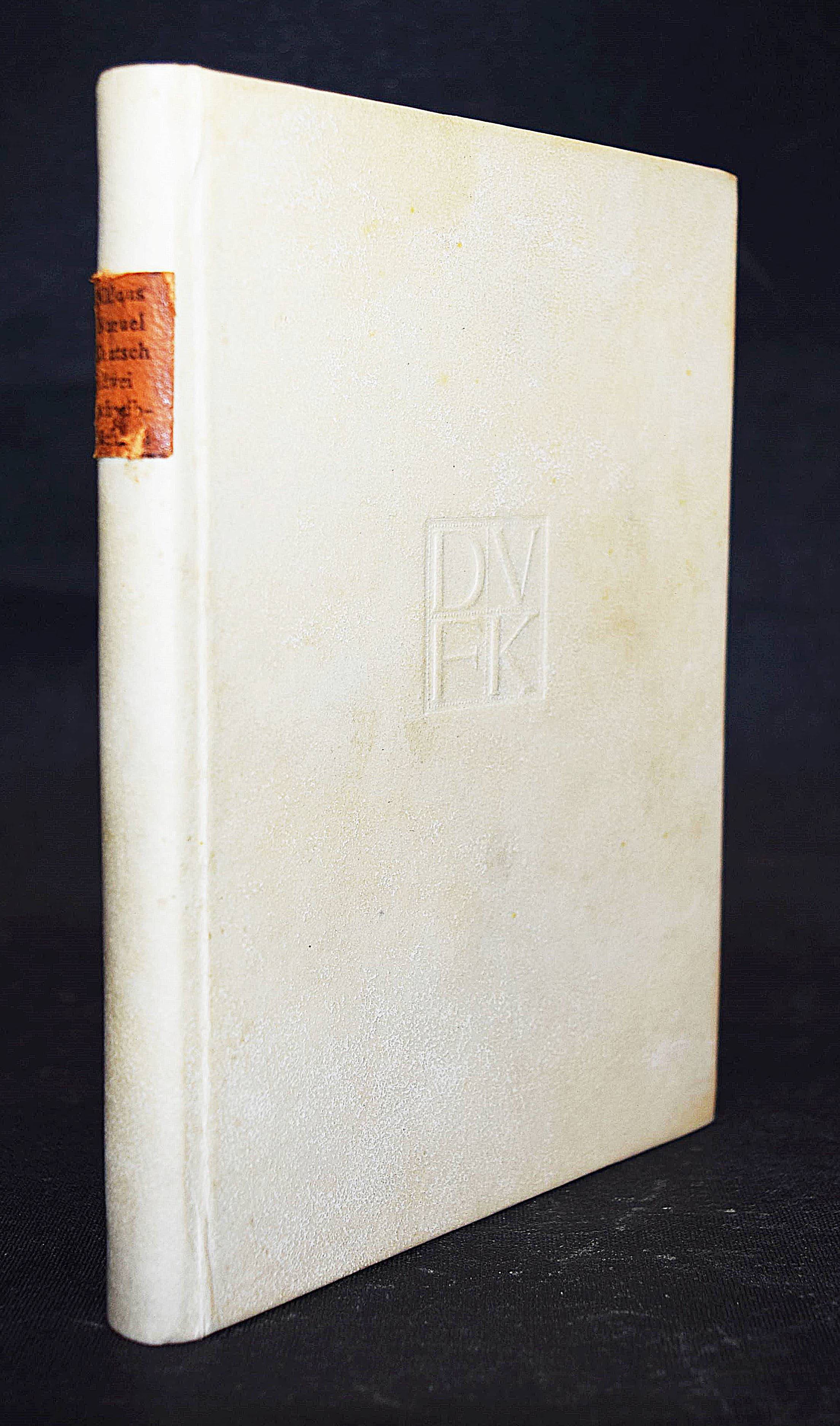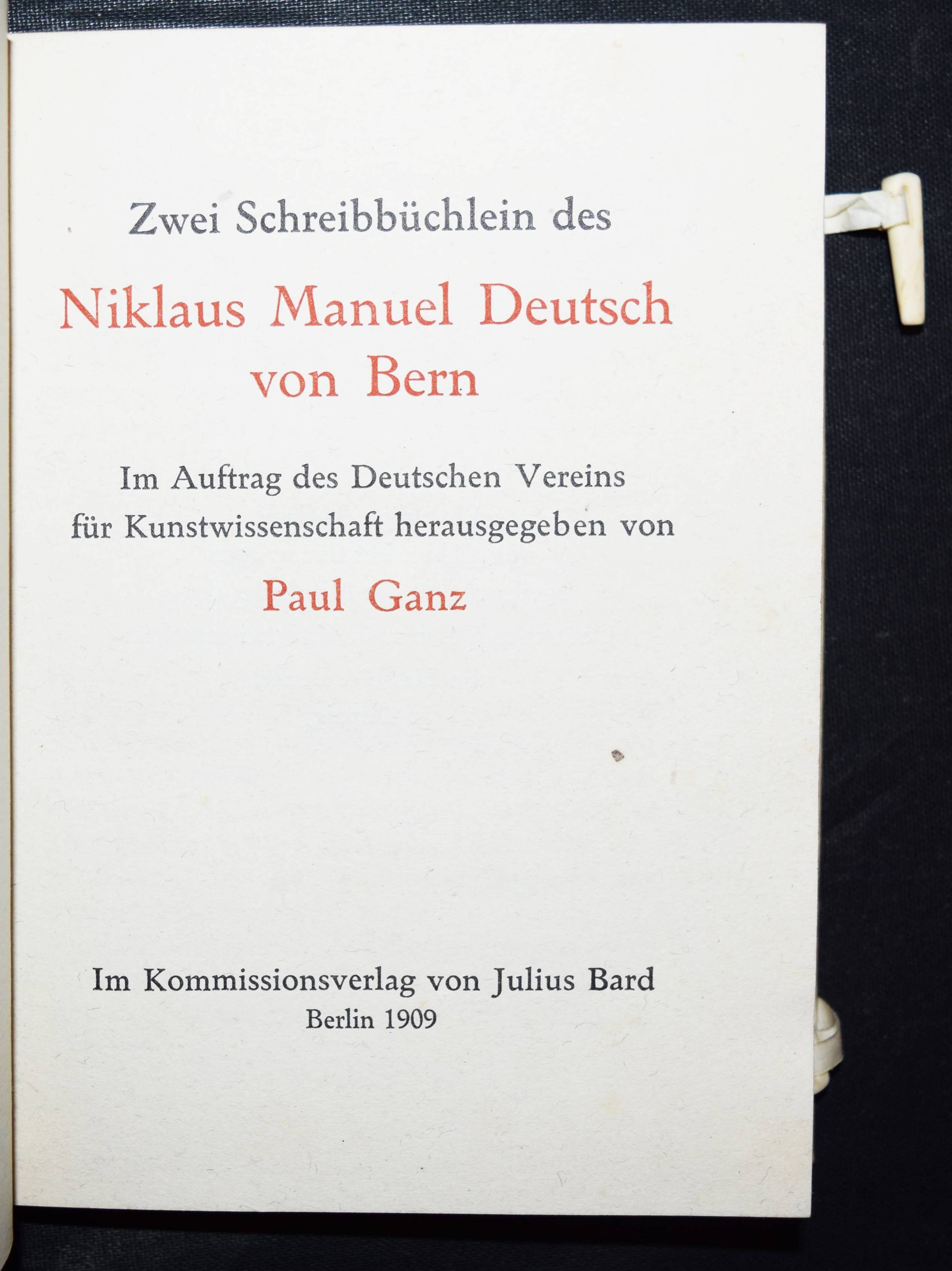 Ganz, Paul (Hrsg.). Zwei Schreibbüchlein des Niklaus Manuel Deutsch von Bern. Im Auftrag des Deutschen Vereins für Kunstwissenschaft herausgegeben. Berlin, Bard 1909. 8°. 56 S. u. 23 Tafeln in Lichtdruck. OPrgt. mit Rückenschild u. 2 Beinschließen in Orig.-Pappschuber. (Jahresgabe des Deutschen Vereines für Kunstwissenschaft 1909). Eines von 1100 Exemplaren. – Gutes Exemplar.